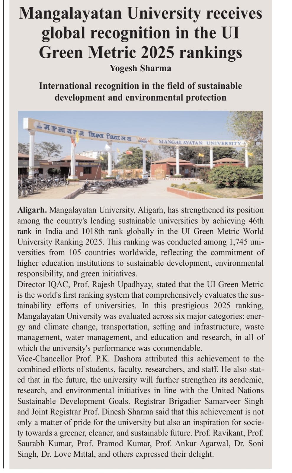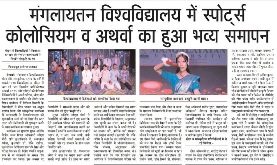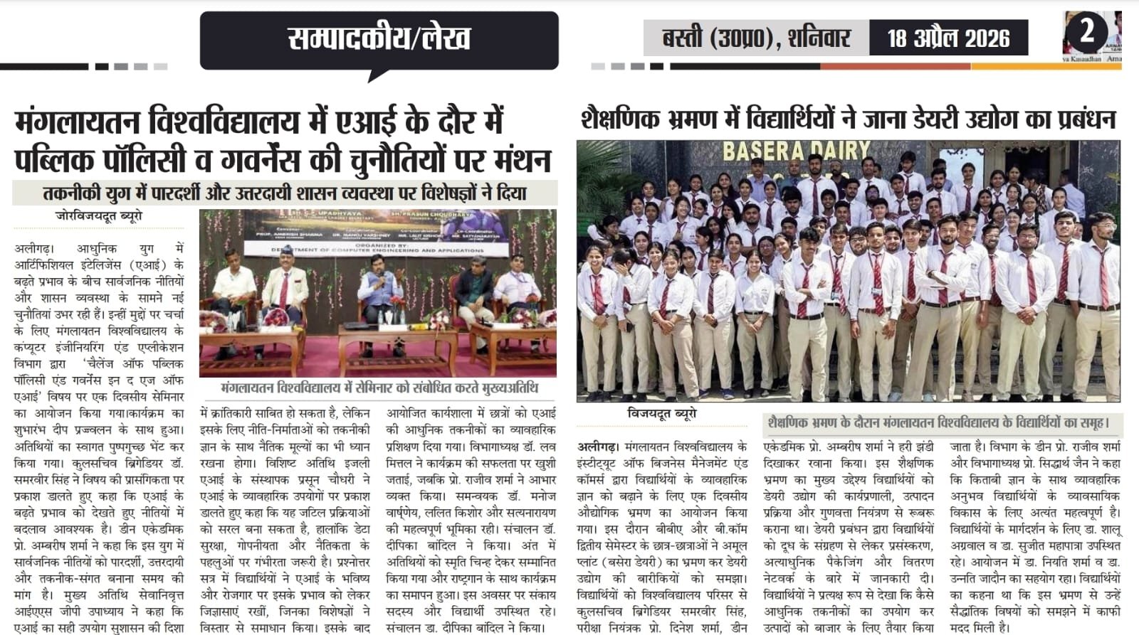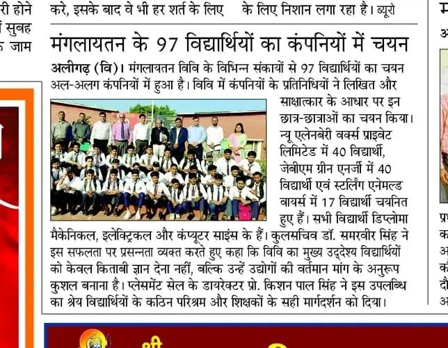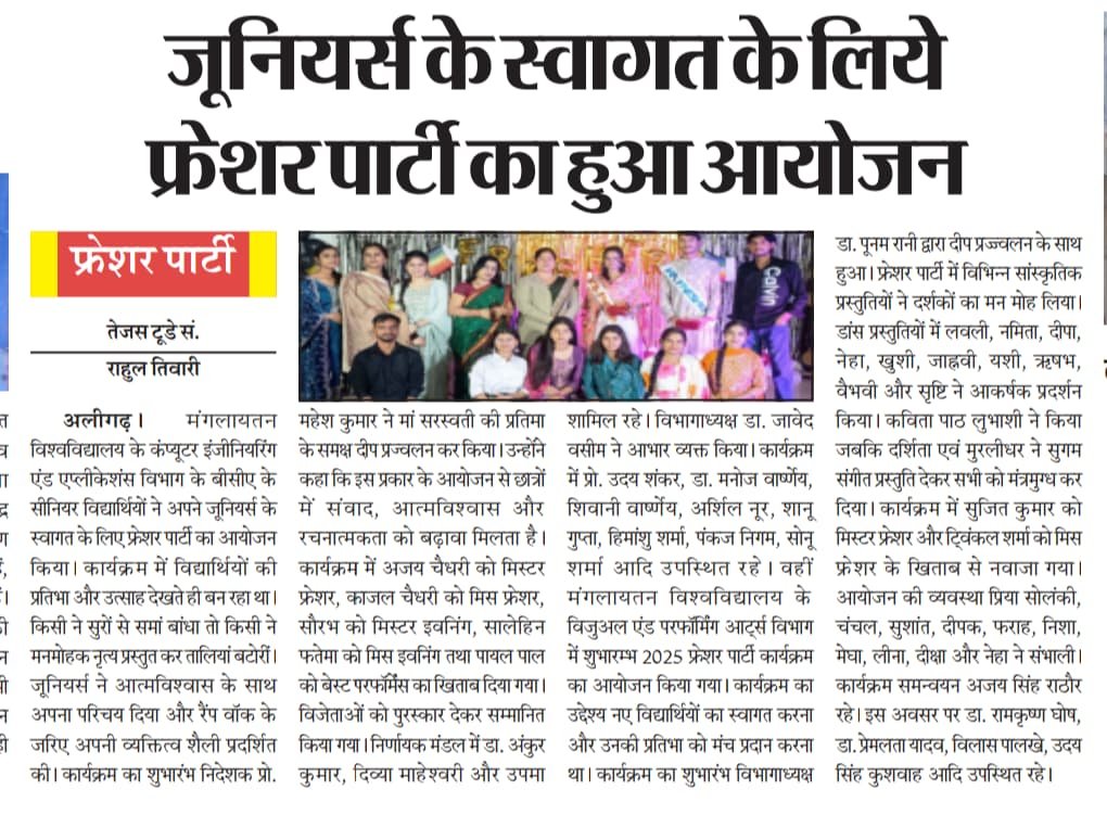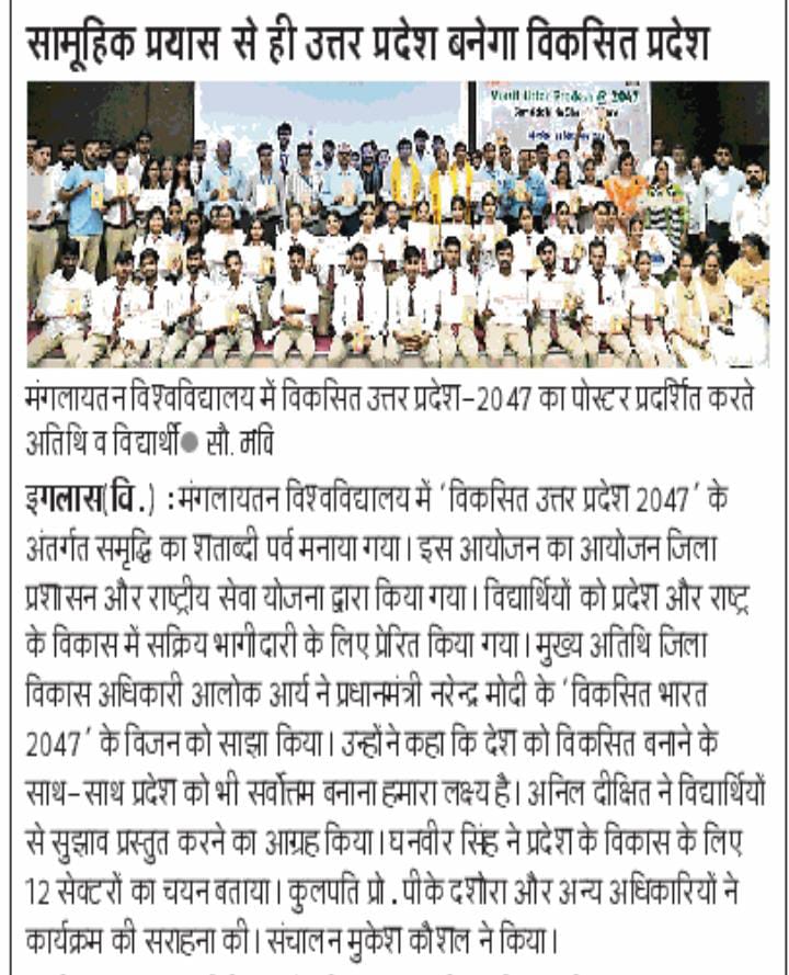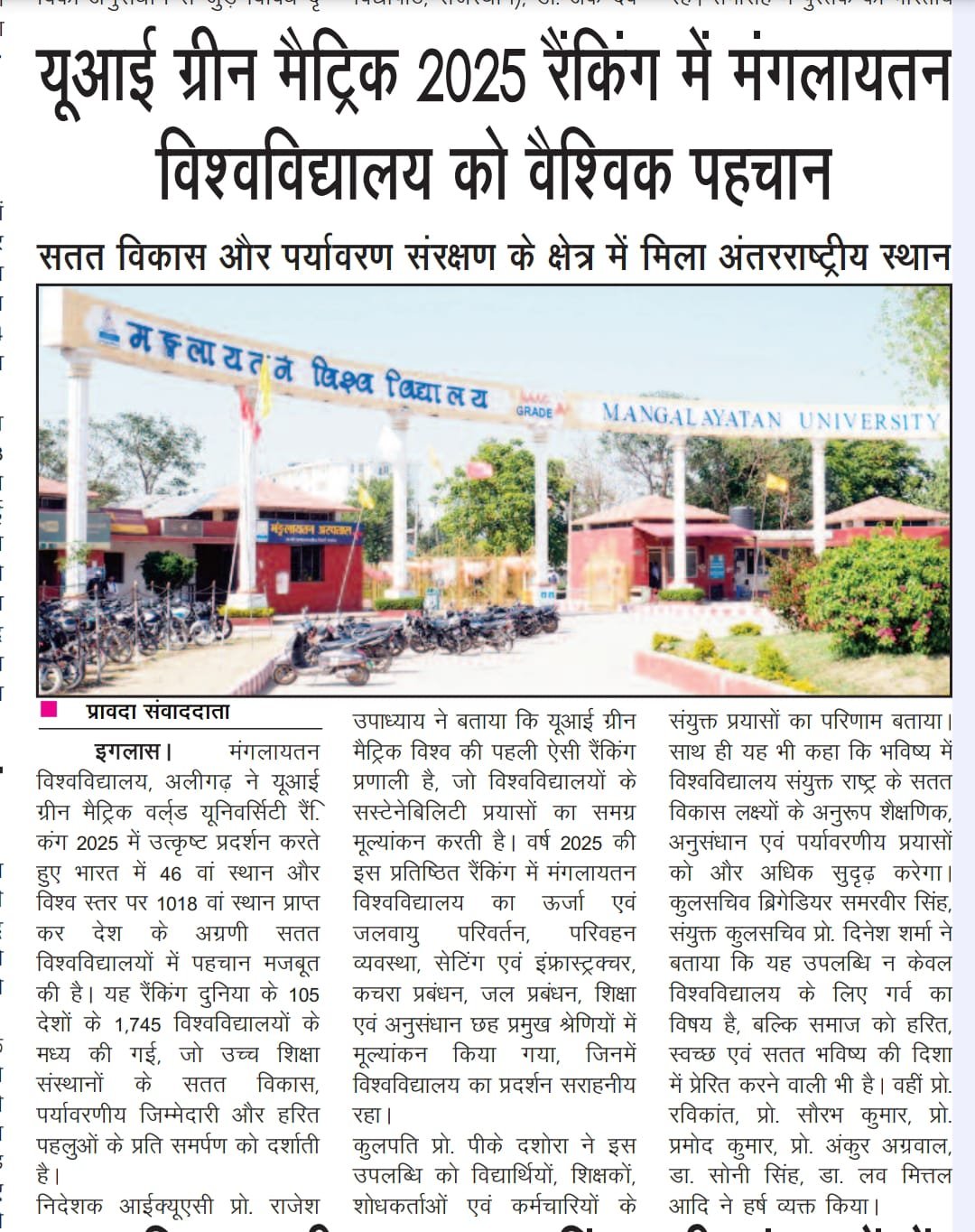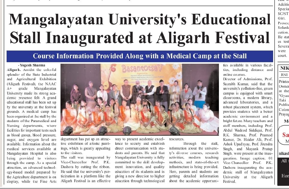 Mangalayatan University garnered significant attention in media with a feature highlighting departmental programs, community initiatives and activities. The article praised the university's commitment to academic excellence and its role in empowering academic units and their students through various skill development workshops and internships. Notably, the piece discussed the institution's efforts in promoting sustainable practices on campus, including eco-friendly initiatives that resonate with the university's mission to foster responsible citizens.This press clipping not only reflects the university's achievements but also its dedication to creating a vibrant learning environment, positioning Mangalayatan University as a cornerstone of educational development in the region. The coverage has sparked interest among prospective students and parents alike.
