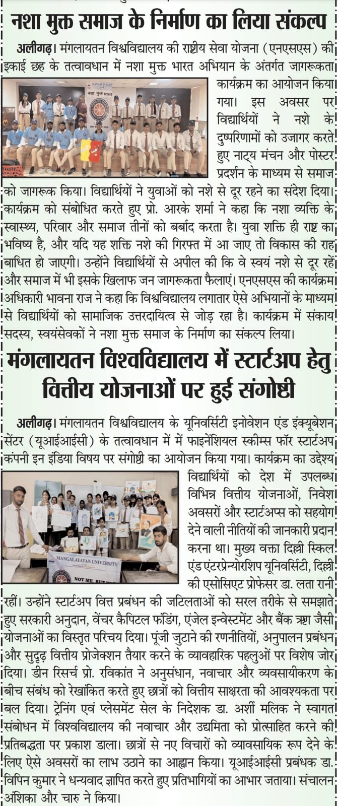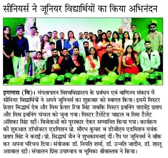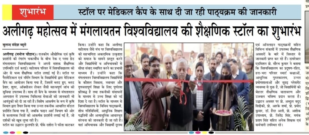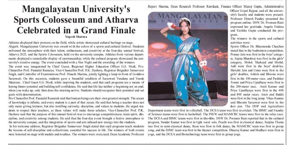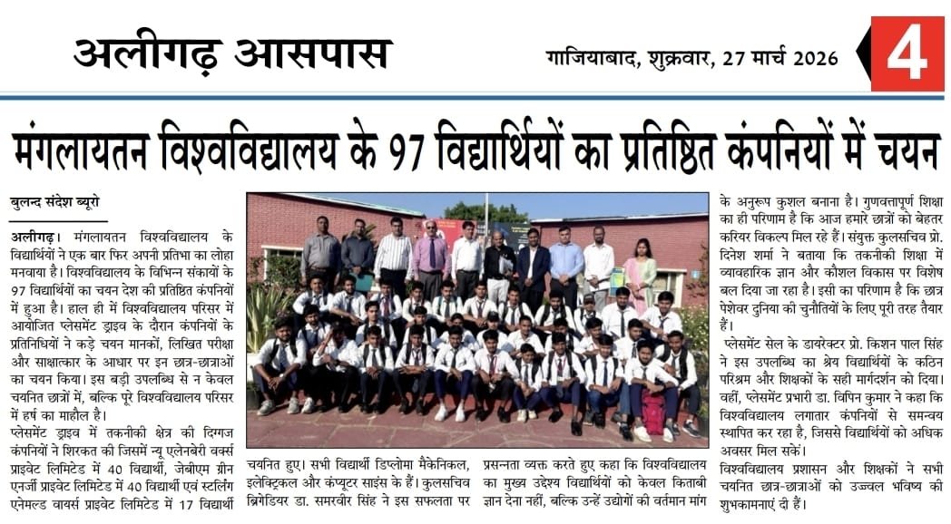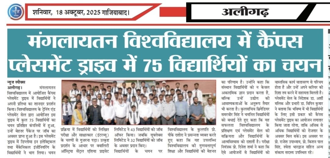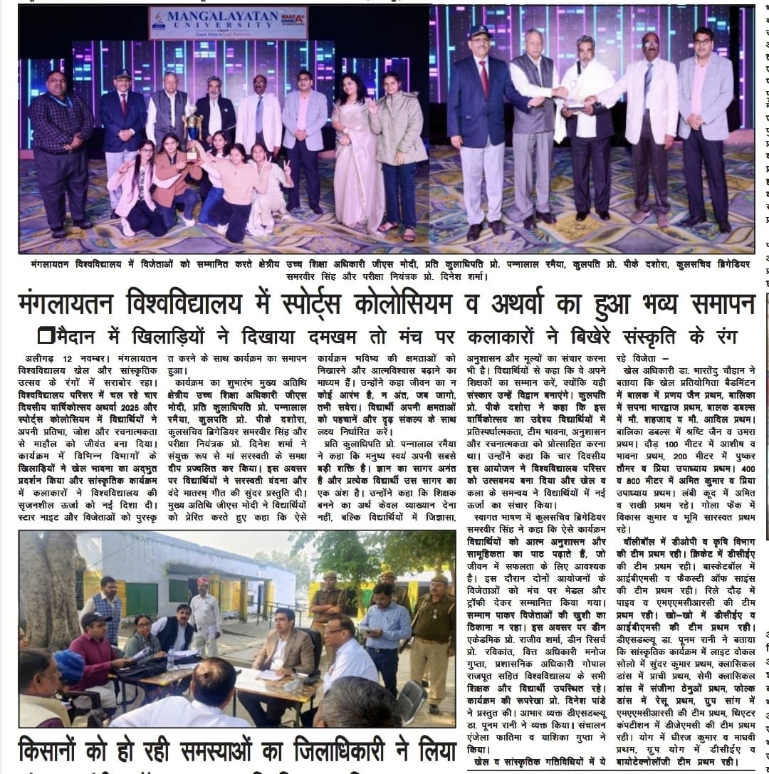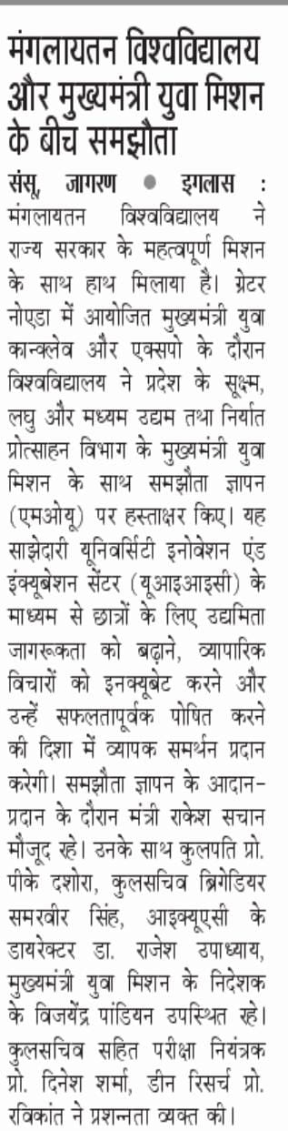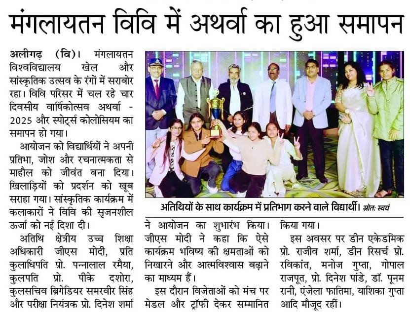 Mangalayatan University garnered significant attention in media with a feature highlighting departmental programs, community initiatives and activities. The article praised the university's commitment to academic excellence and its role in empowering academic units and their students through various skill development workshops and internships. Notably, the piece discussed the institution's efforts in promoting sustainable practices on campus, including eco-friendly initiatives that resonate with the university's mission to foster responsible citizens.This press clipping not only reflects the university's achievements but also its dedication to creating a vibrant learning environment, positioning Mangalayatan University as a cornerstone of educational development in the region. The coverage has sparked interest among prospective students and parents alike.