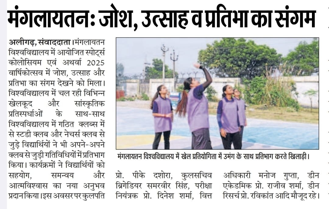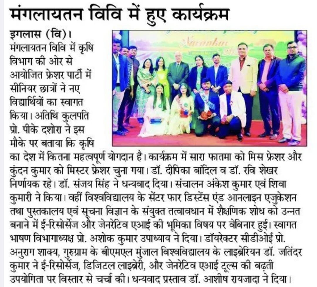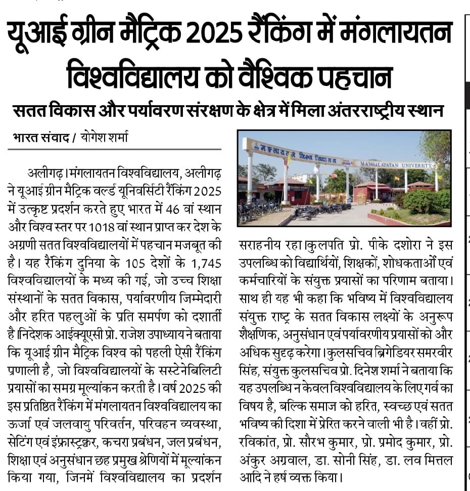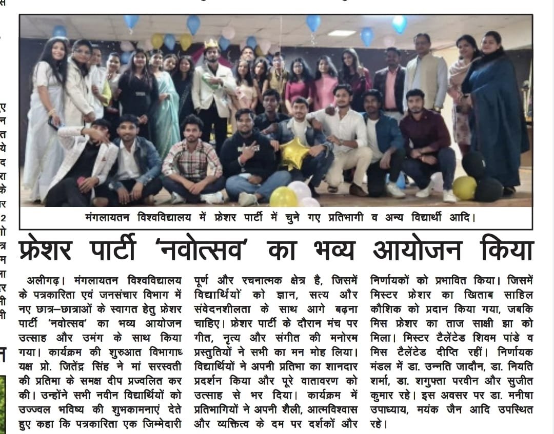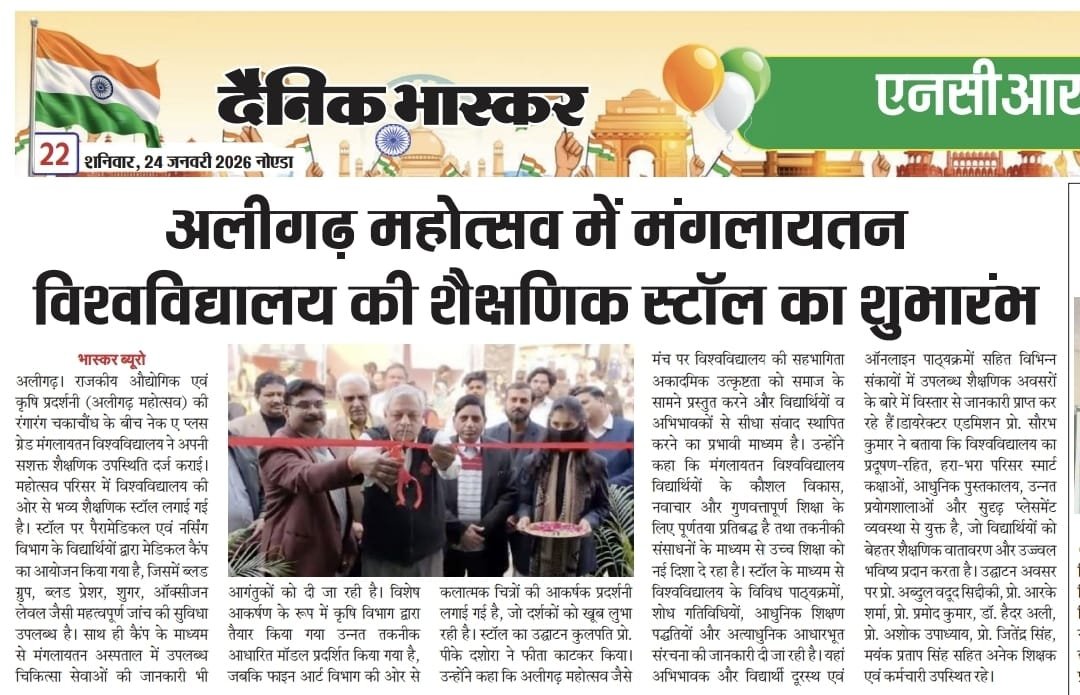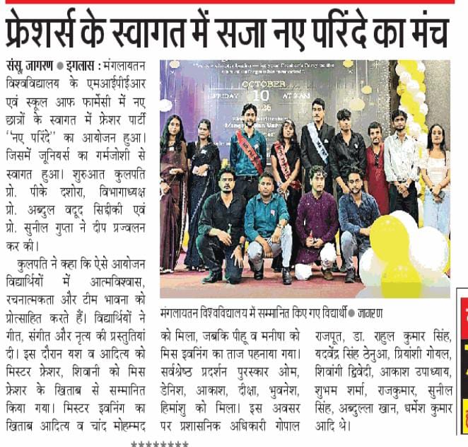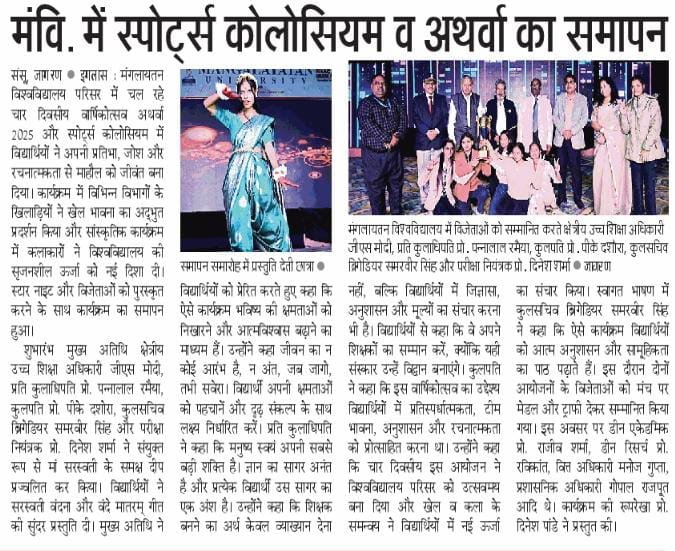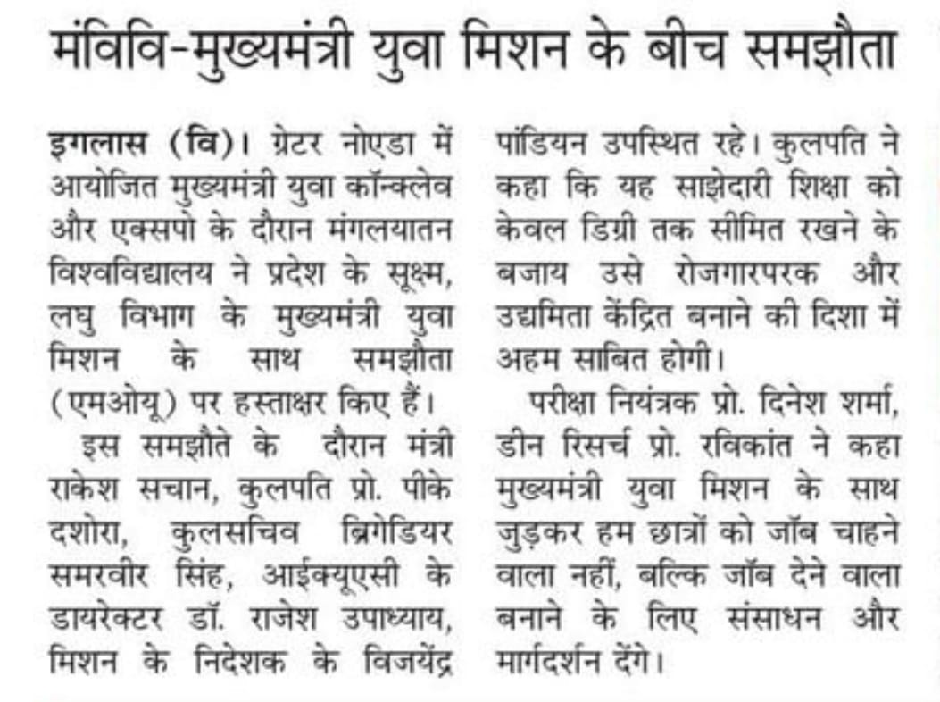 Mangalayatan University garnered significant attention in media with a feature highlighting departmental programs, community initiatives and activities. The article praised the university's commitment to academic excellence and its role in empowering academic units and their students through various skill development workshops and internships. Notably, the piece discussed the institution's efforts in promoting sustainable practices on campus, including eco-friendly initiatives that resonate with the university's mission to foster responsible citizens.This press clipping not only reflects the university's achievements but also its dedication to creating a vibrant learning environment, positioning Mangalayatan University as a cornerstone of educational development in the region. The coverage has sparked interest among prospective students and parents alike.