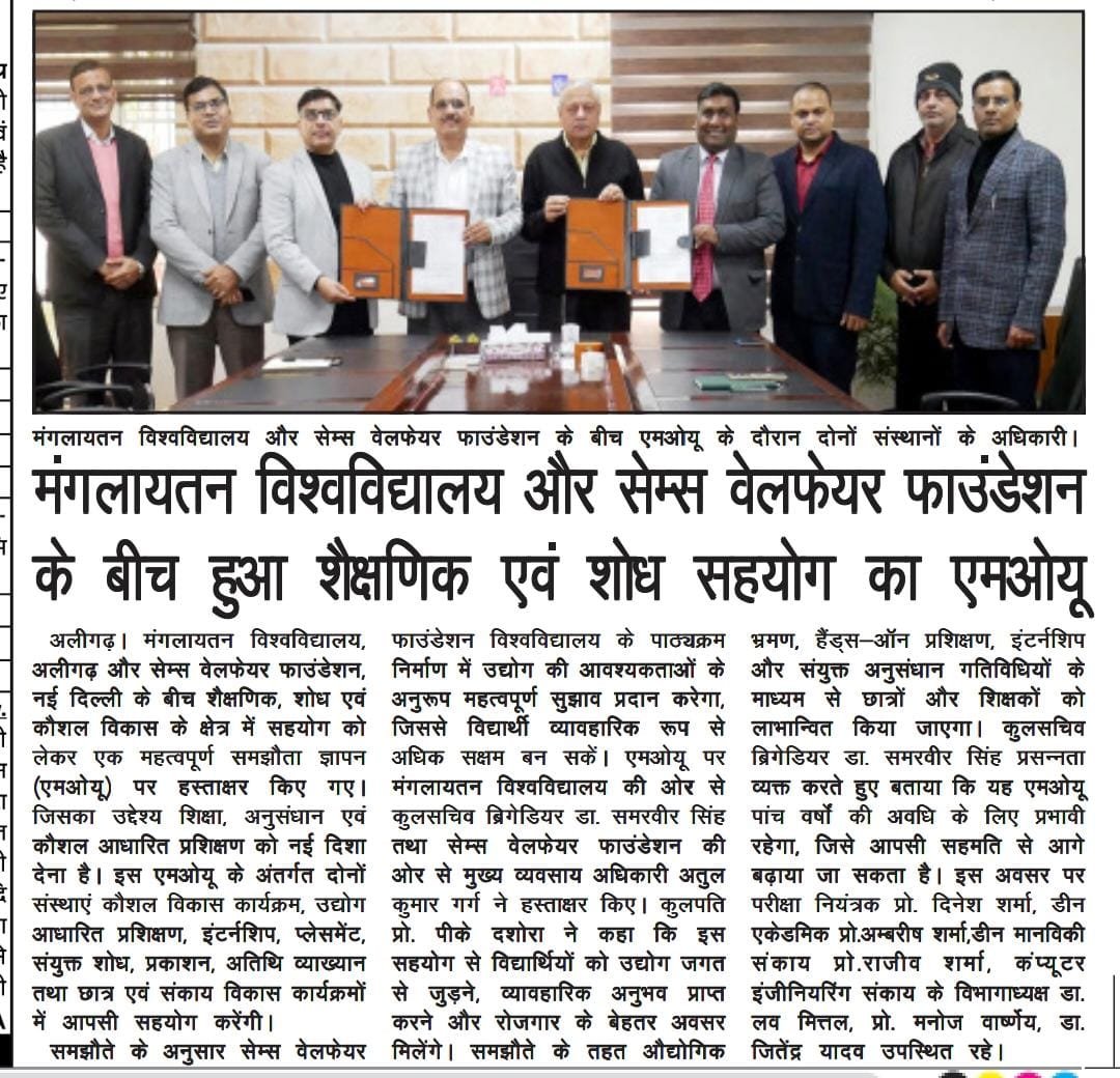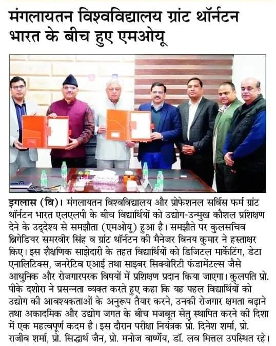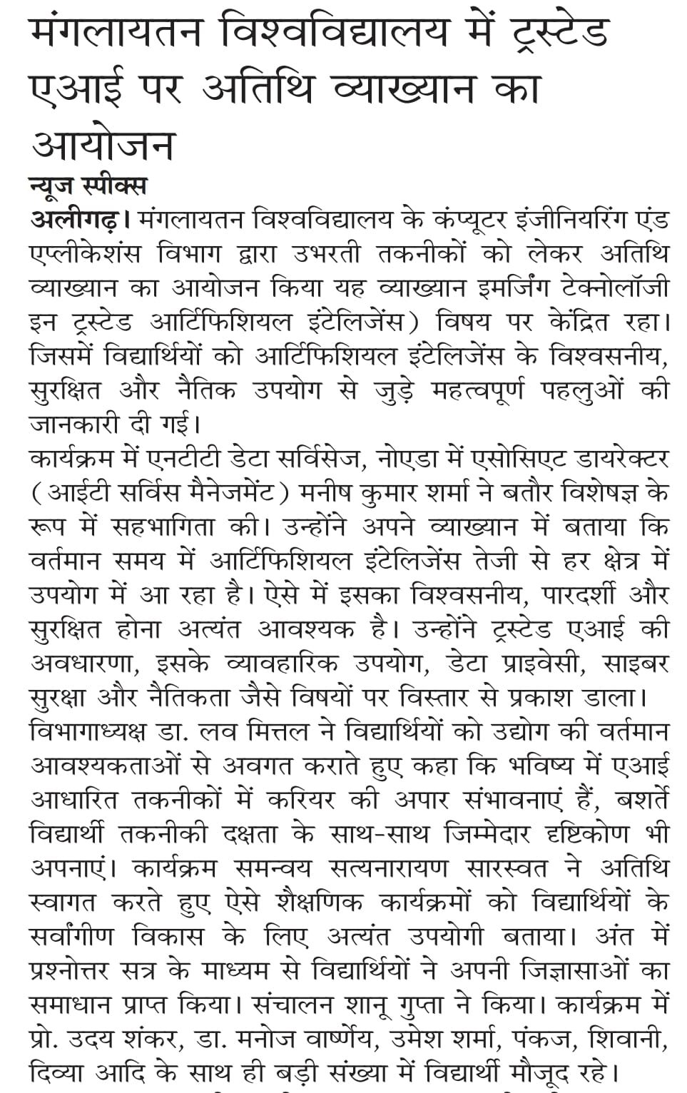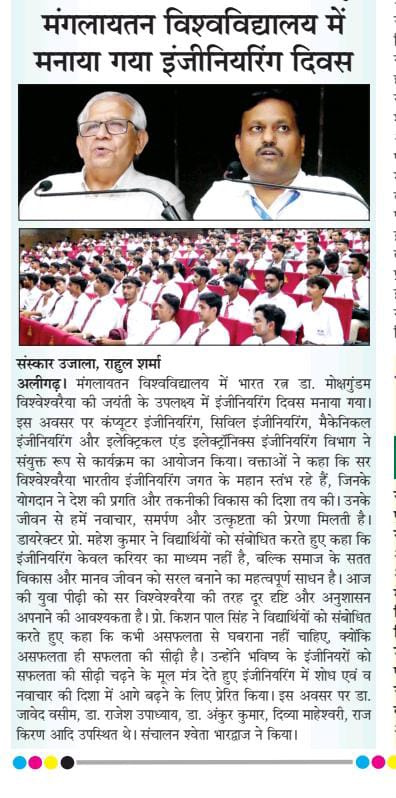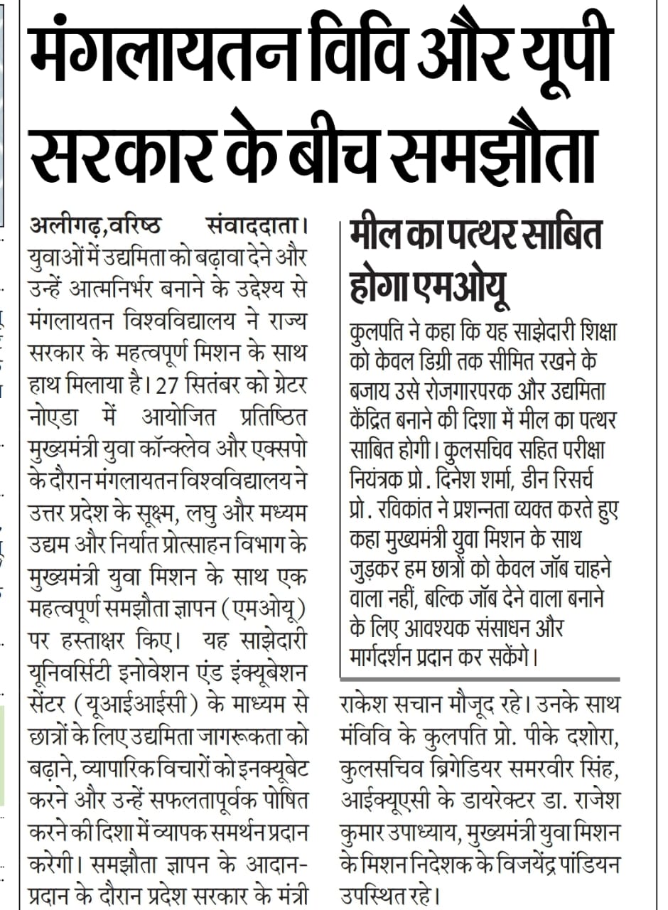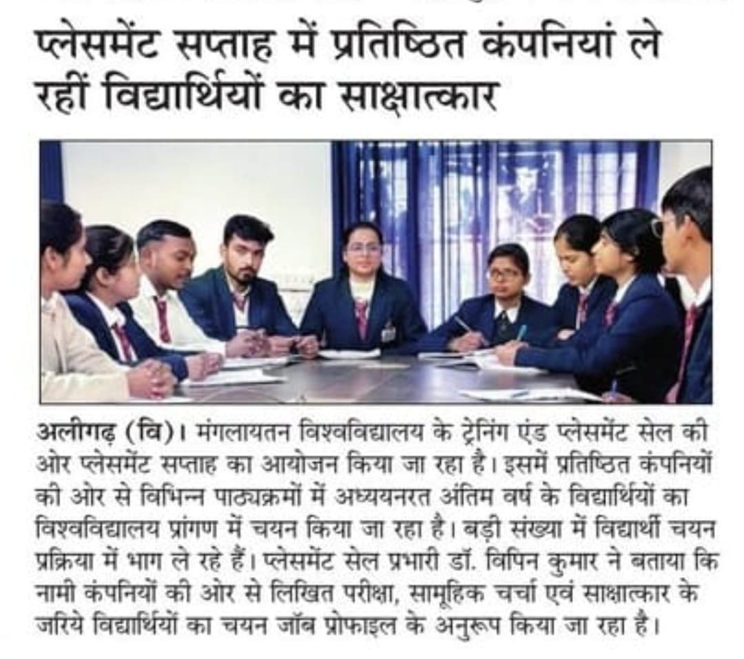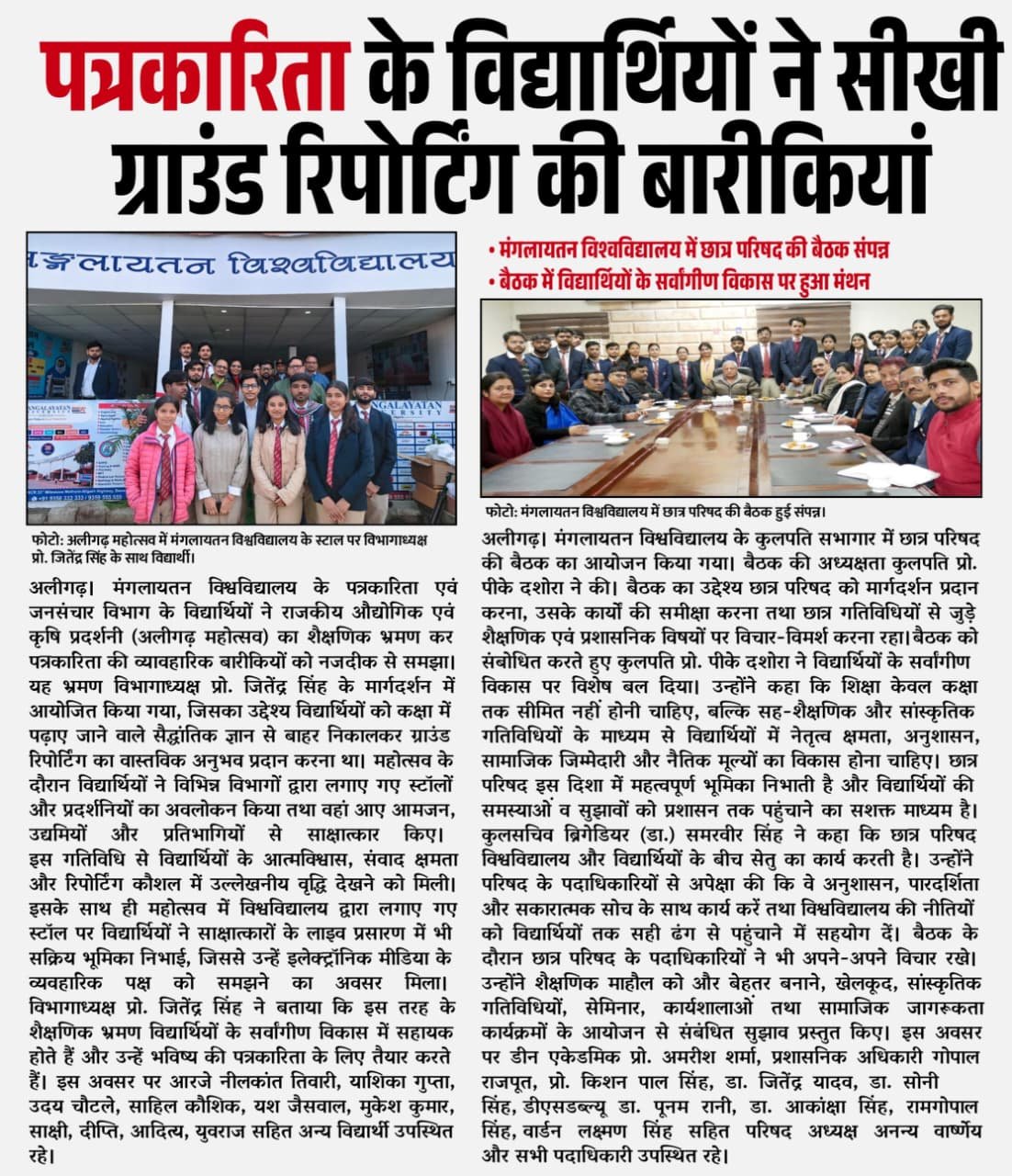 Mangalayatan University garnered significant attention in media with a feature highlighting departmental programs, community initiatives and activities. The article praised the university's commitment to academic excellence and its role in empowering academic units and their students through various skill development workshops and internships. Notably, the piece discussed the institution's efforts in promoting sustainable practices on campus, including eco-friendly initiatives that resonate with the university's mission to foster responsible citizens.This press clipping not only reflects the university's achievements but also its dedication to creating a vibrant learning environment, positioning Mangalayatan University as a cornerstone of educational development in the region. The coverage has sparked interest among prospective students and parents alike.