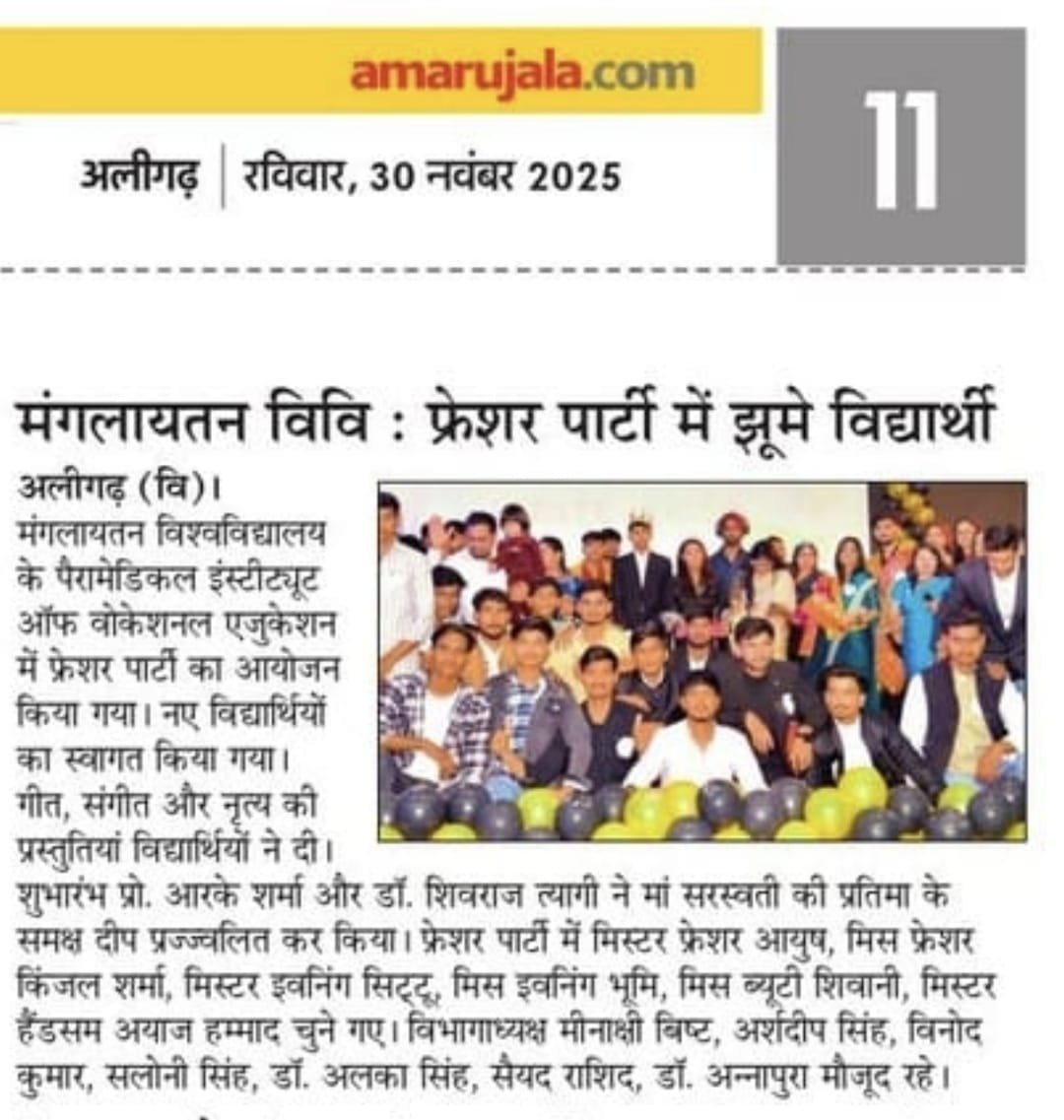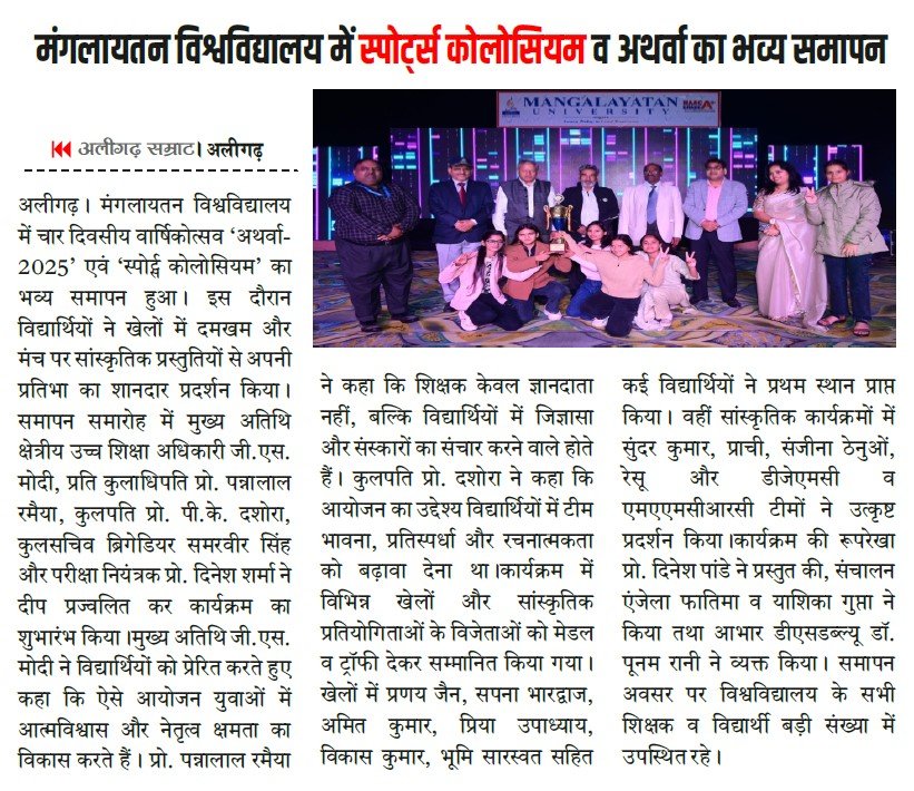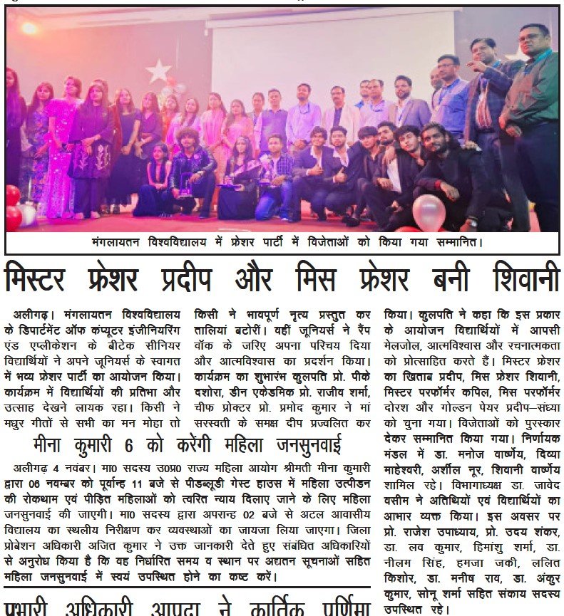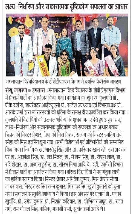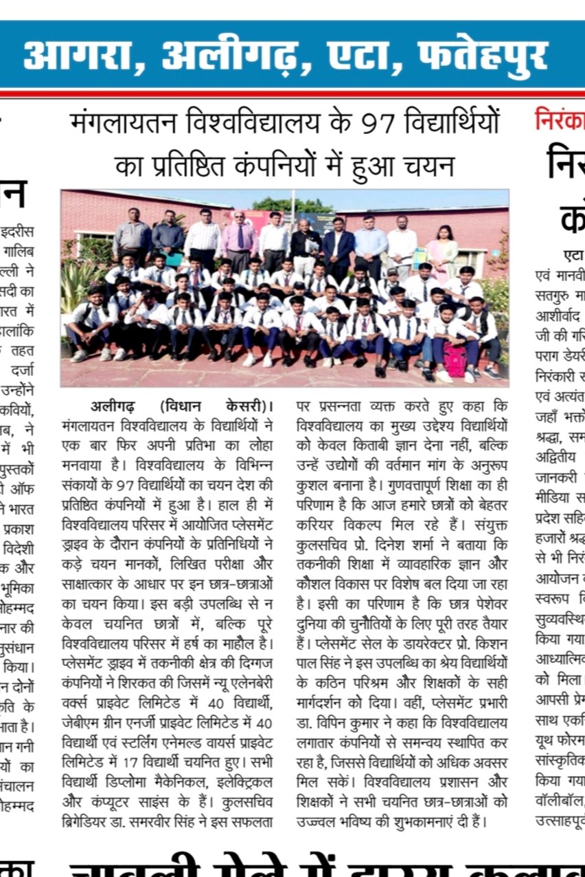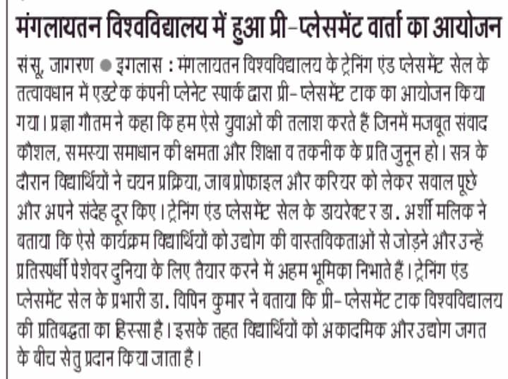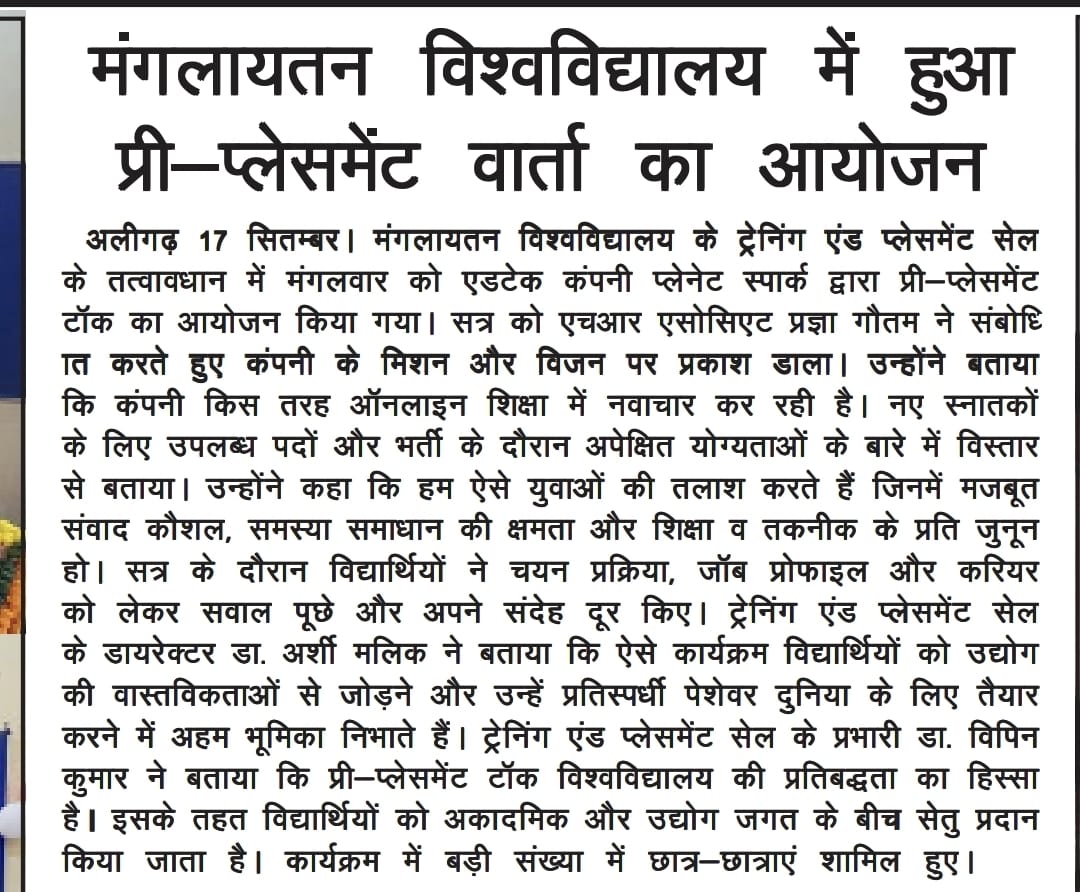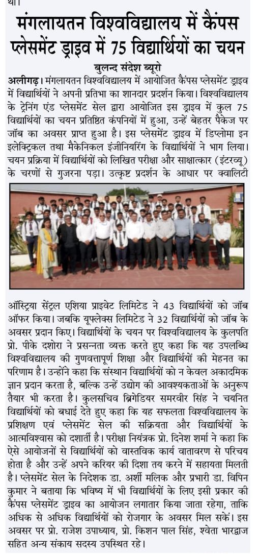 Mangalayatan University garnered significant attention in media with a feature highlighting departmental programs, community initiatives and activities. The article praised the university's commitment to academic excellence and its role in empowering academic units and their students through various skill development workshops and internships. Notably, the piece discussed the institution's efforts in promoting sustainable practices on campus, including eco-friendly initiatives that resonate with the university's mission to foster responsible citizens.This press clipping not only reflects the university's achievements but also its dedication to creating a vibrant learning environment, positioning Mangalayatan University as a cornerstone of educational development in the region. The coverage has sparked interest among prospective students and parents alike.