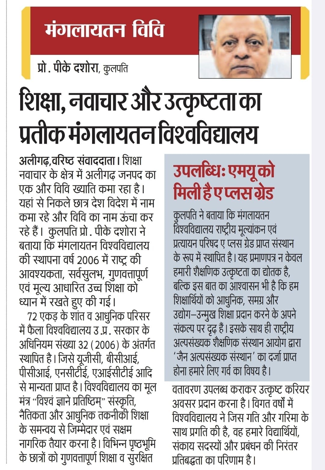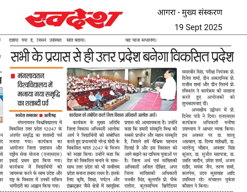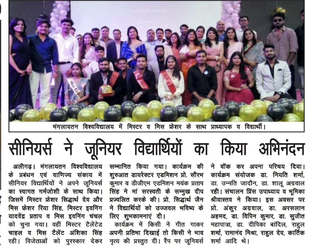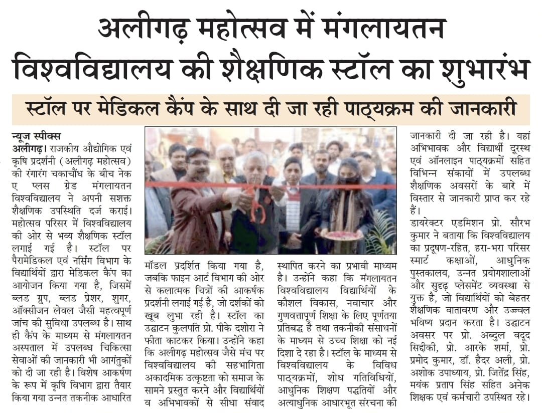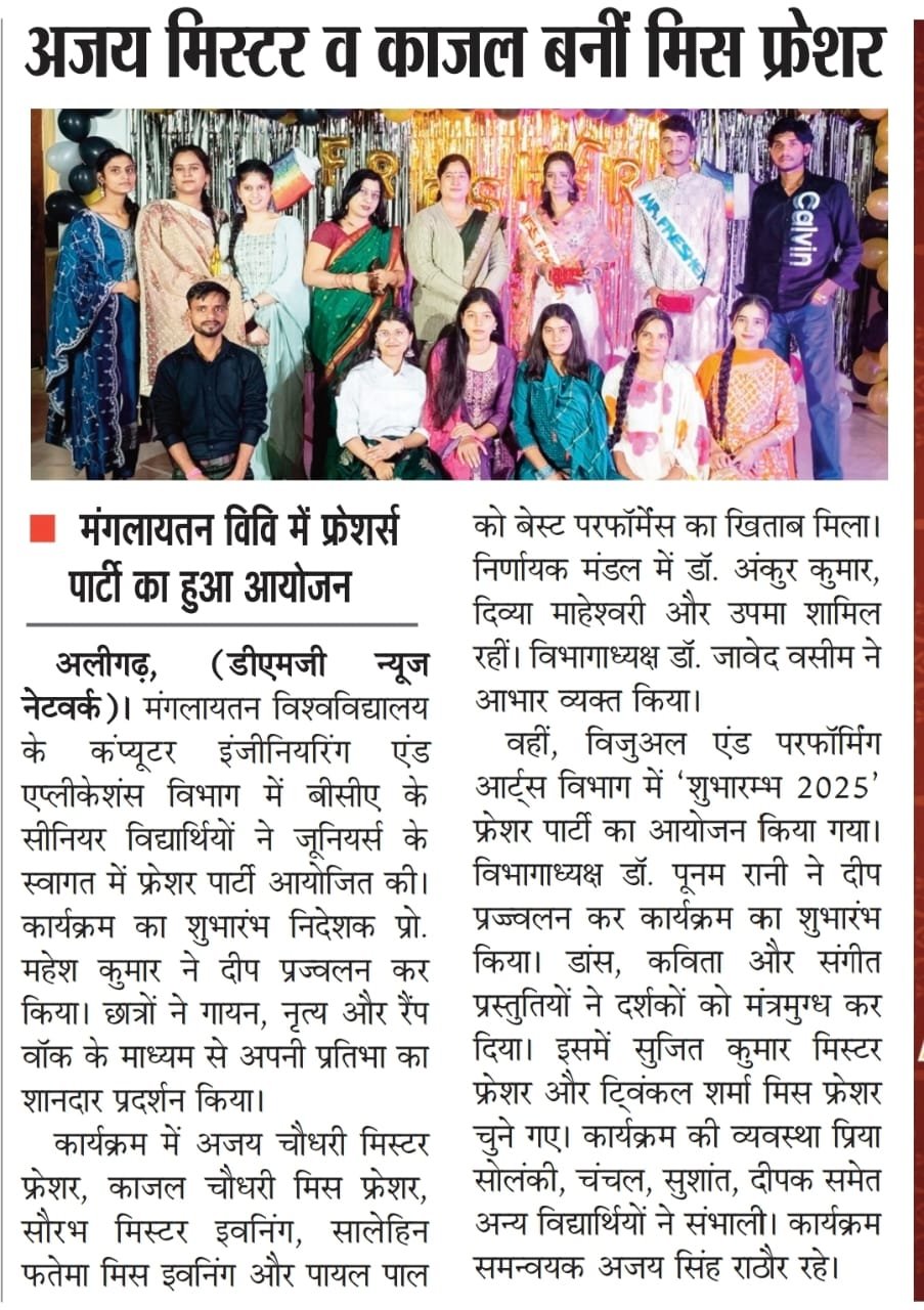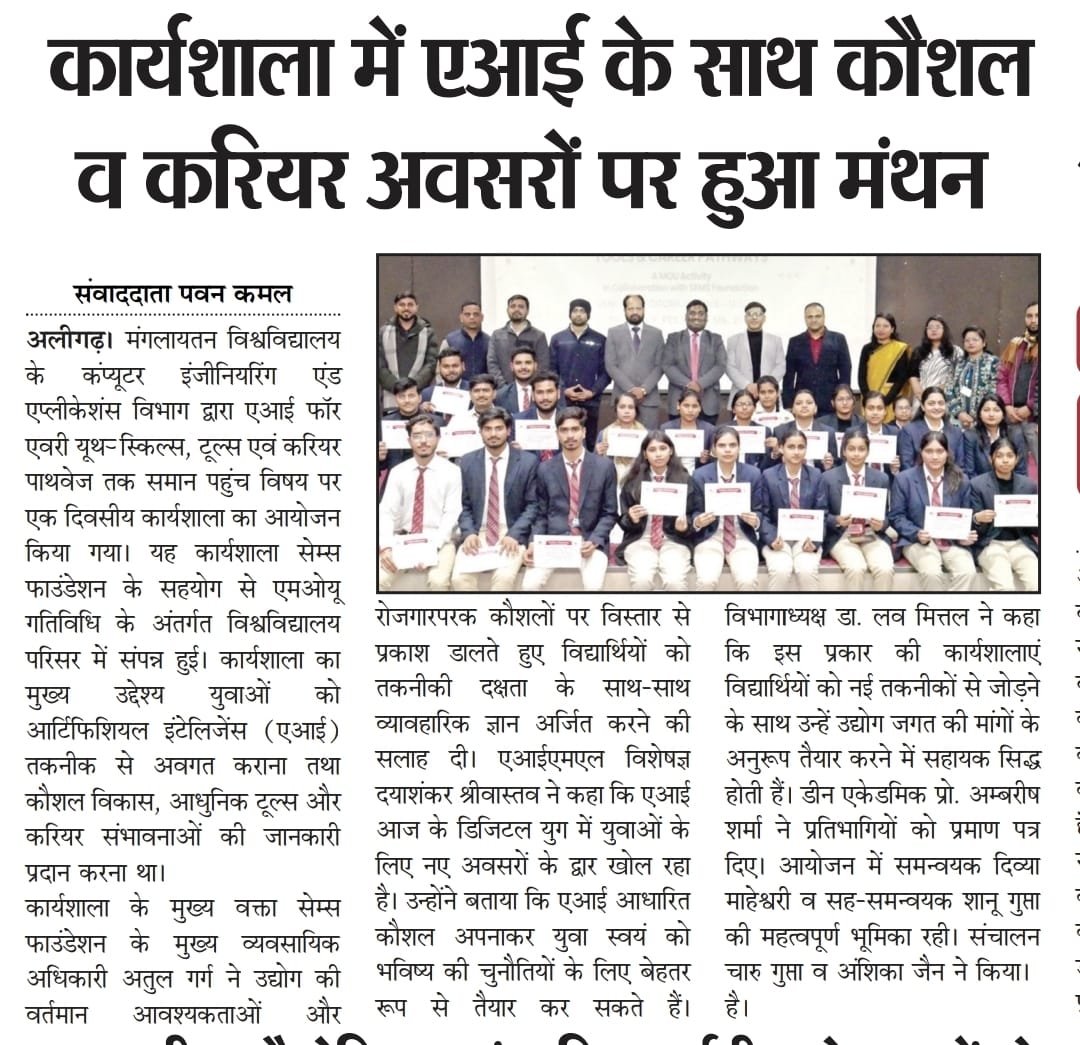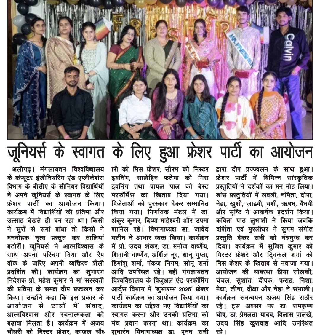 Mangalayatan University garnered significant attention in media with a feature highlighting departmental programs, community initiatives and activities. The article praised the university's commitment to academic excellence and its role in empowering academic units and their students through various skill development workshops and internships. Notably, the piece discussed the institution's efforts in promoting sustainable practices on campus, including eco-friendly initiatives that resonate with the university's mission to foster responsible citizens.This press clipping not only reflects the university's achievements but also its dedication to creating a vibrant learning environment, positioning Mangalayatan University as a cornerstone of educational development in the region. The coverage has sparked interest among prospective students and parents alike.