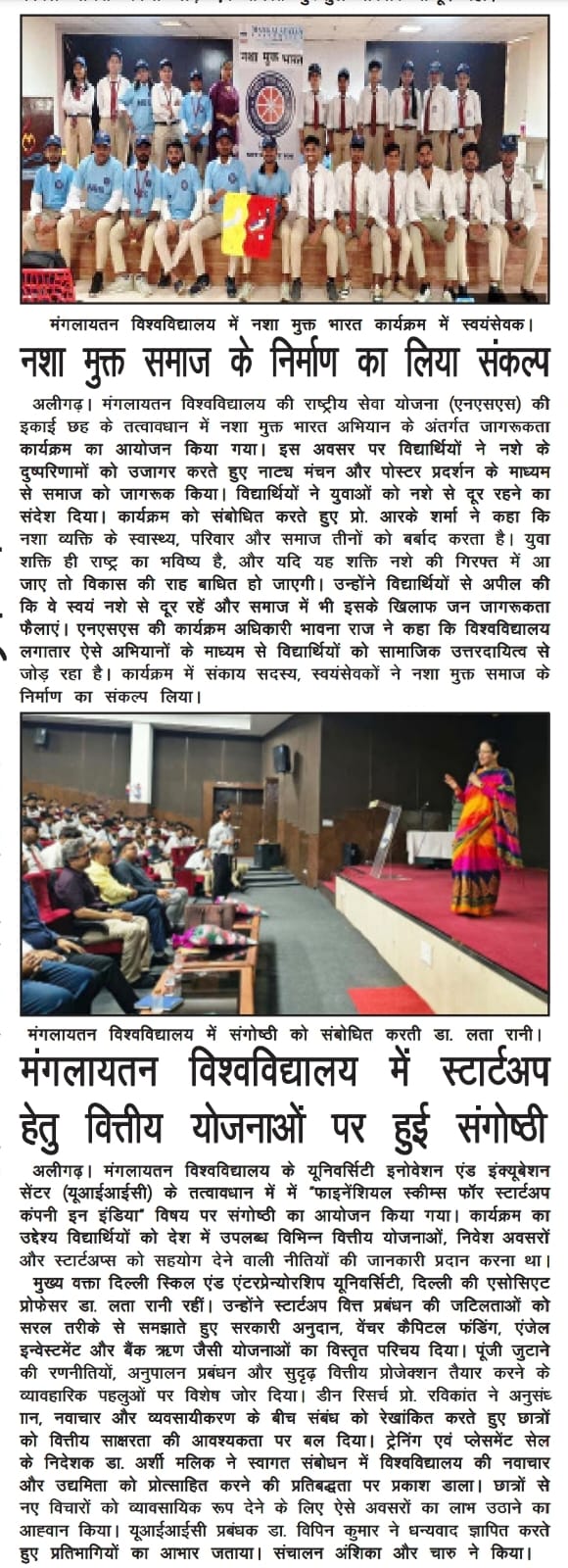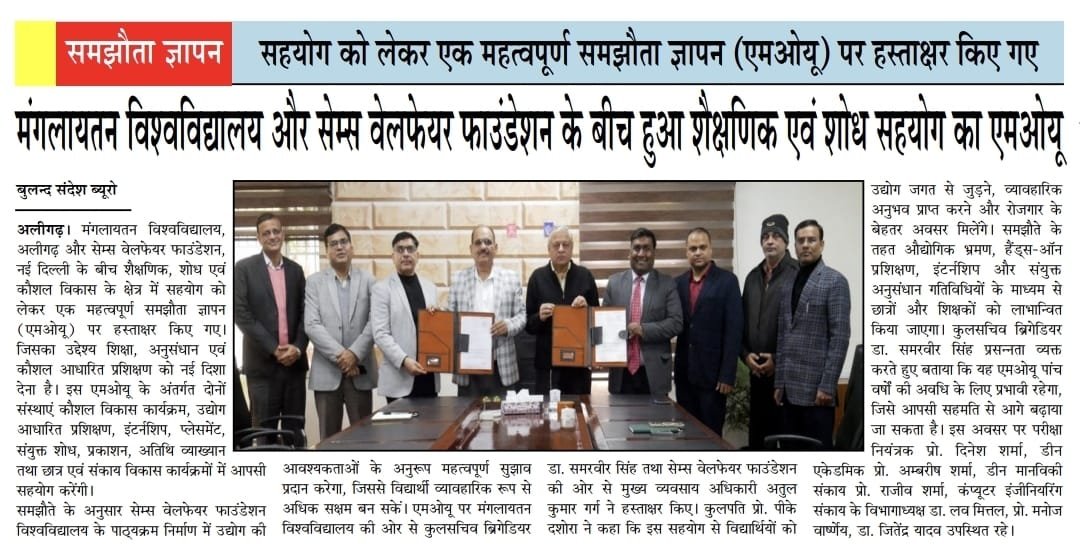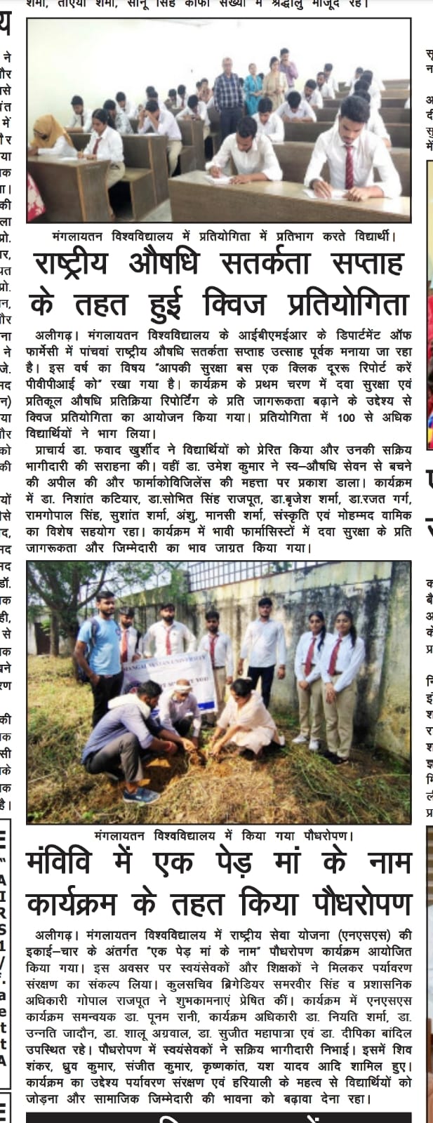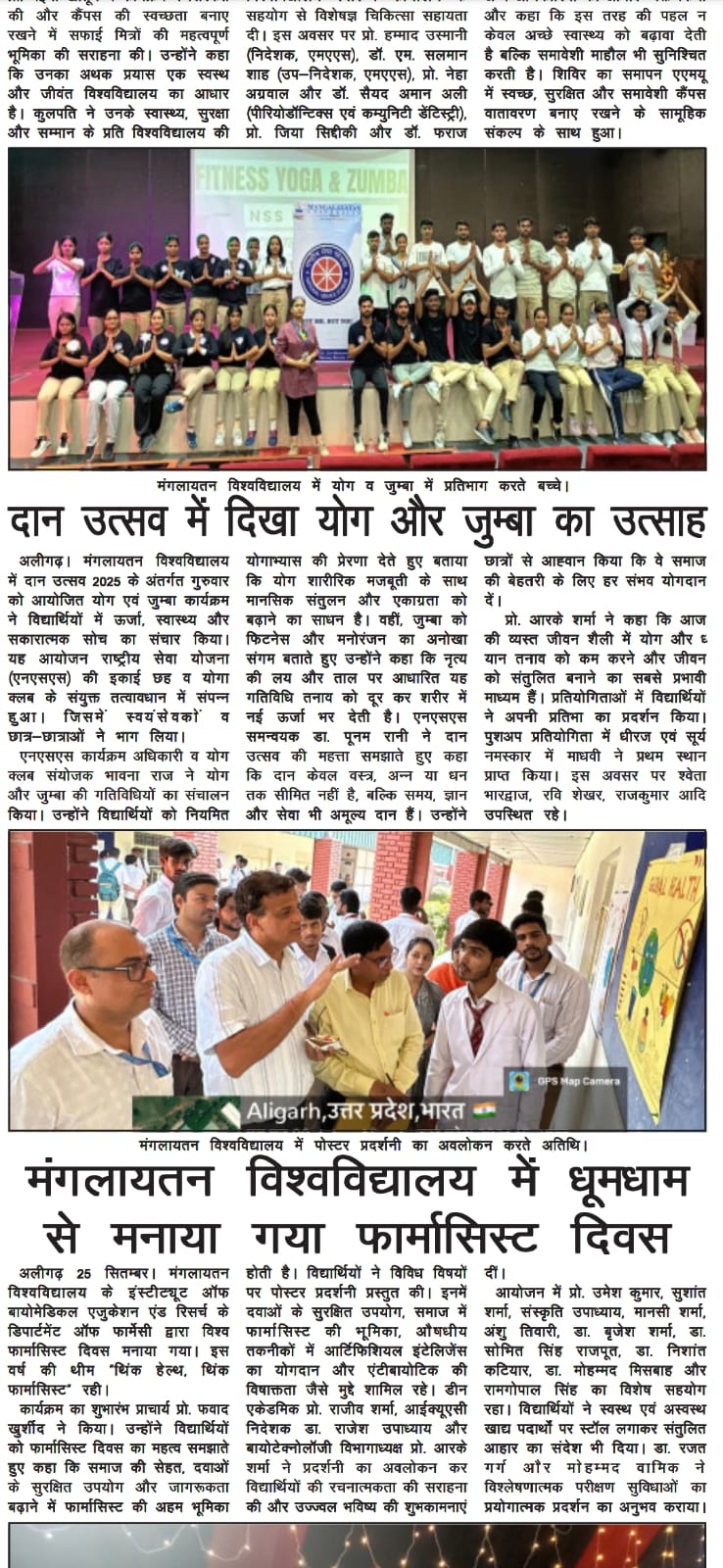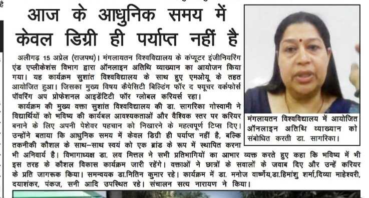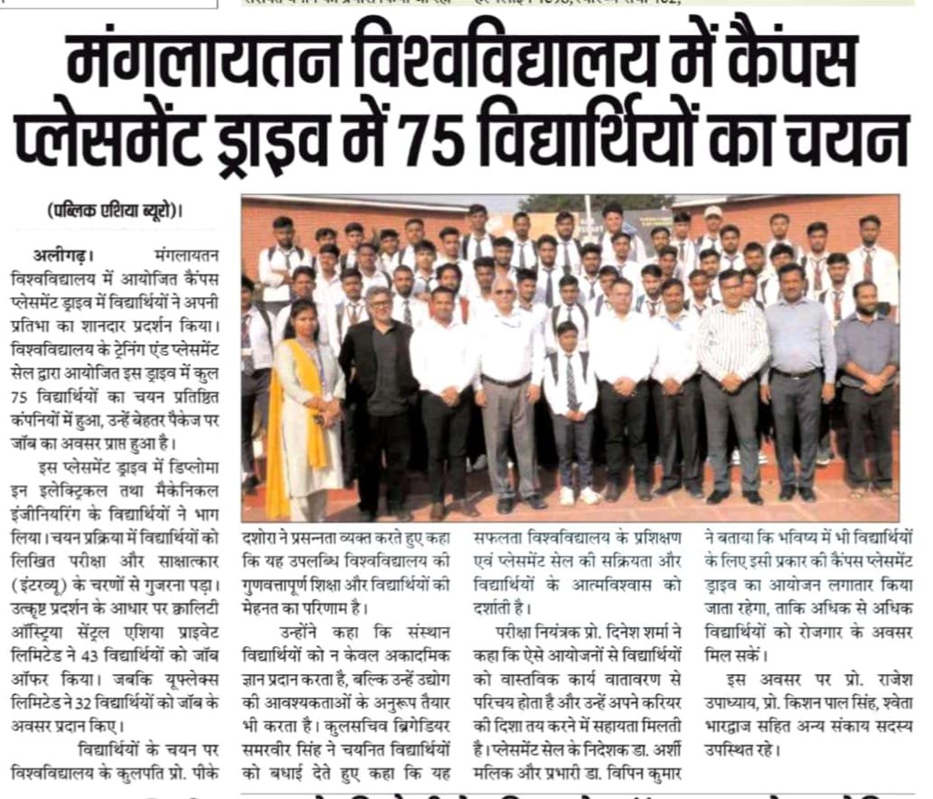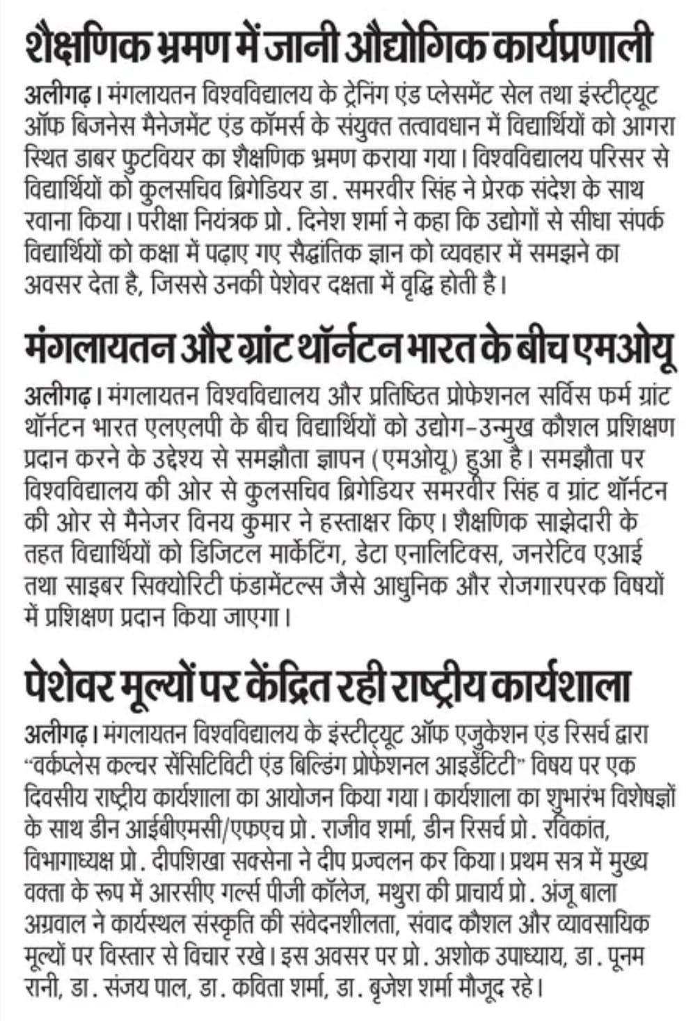 Mangalayatan University garnered significant attention in media with a feature highlighting departmental programs, community initiatives and activities. The article praised the university's commitment to academic excellence and its role in empowering academic units and their students through various skill development workshops and internships. Notably, the piece discussed the institution's efforts in promoting sustainable practices on campus, including eco-friendly initiatives that resonate with the university's mission to foster responsible citizens.This press clipping not only reflects the university's achievements but also its dedication to creating a vibrant learning environment, positioning Mangalayatan University as a cornerstone of educational development in the region. The coverage has sparked interest among prospective students and parents alike.