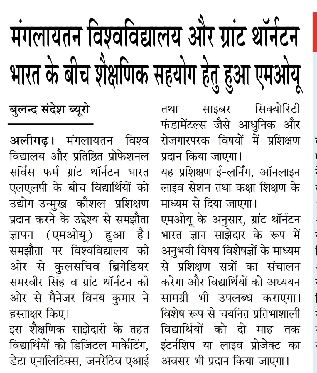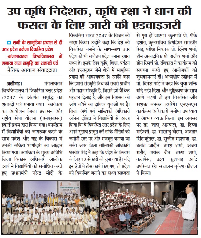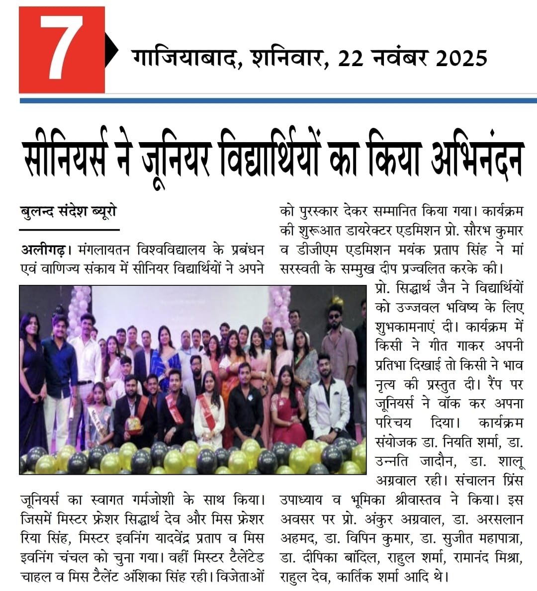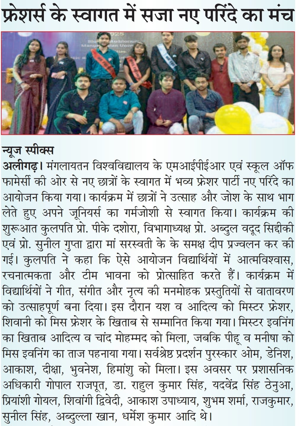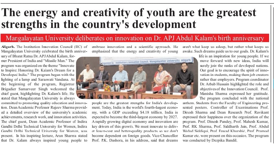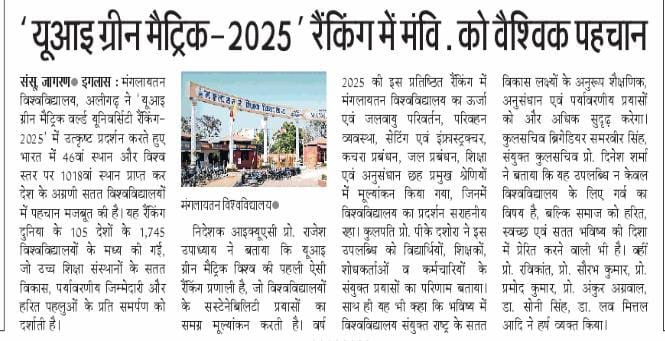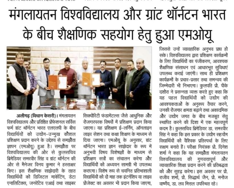 Mangalayatan University garnered significant attention in media with a feature highlighting departmental programs, community initiatives and activities. The article praised the university's commitment to academic excellence and its role in empowering academic units and their students through various skill development workshops and internships. Notably, the piece discussed the institution's efforts in promoting sustainable practices on campus, including eco-friendly initiatives that resonate with the university's mission to foster responsible citizens.This press clipping not only reflects the university's achievements but also its dedication to creating a vibrant learning environment, positioning Mangalayatan University as a cornerstone of educational development in the region. The coverage has sparked interest among prospective students and parents alike.
