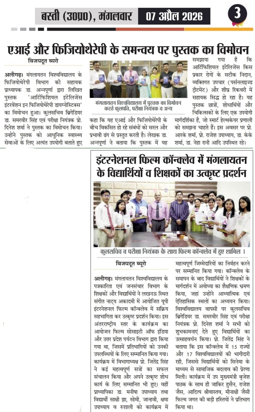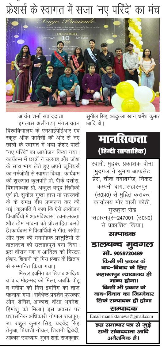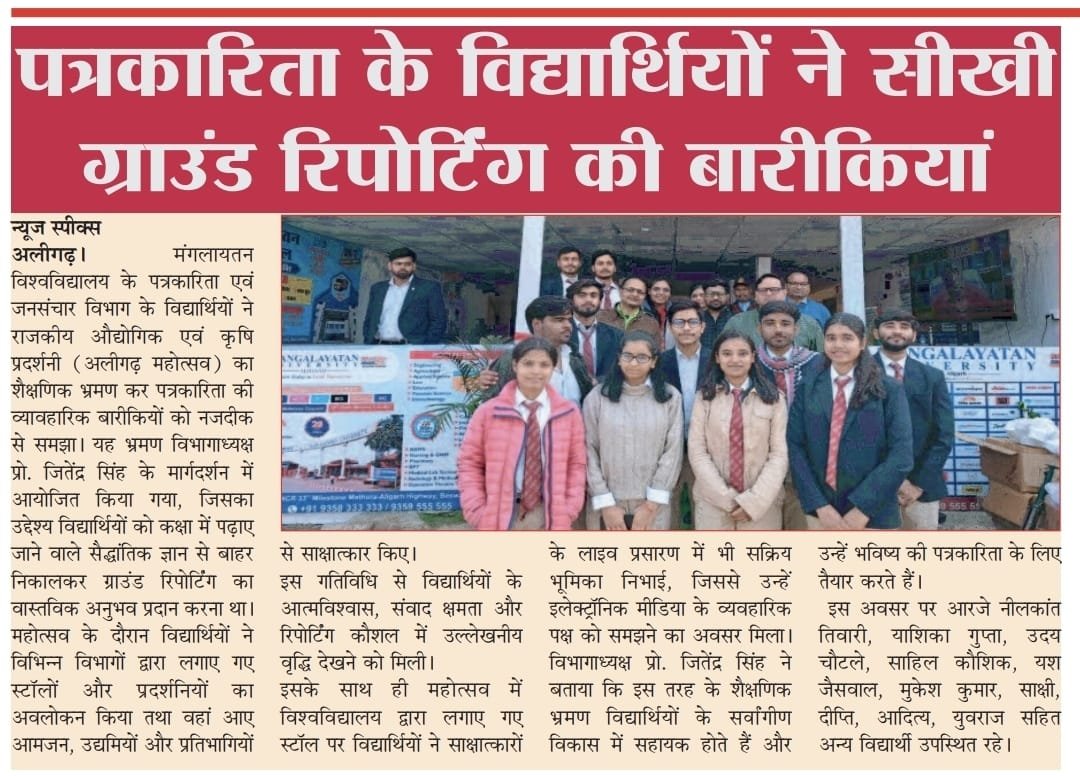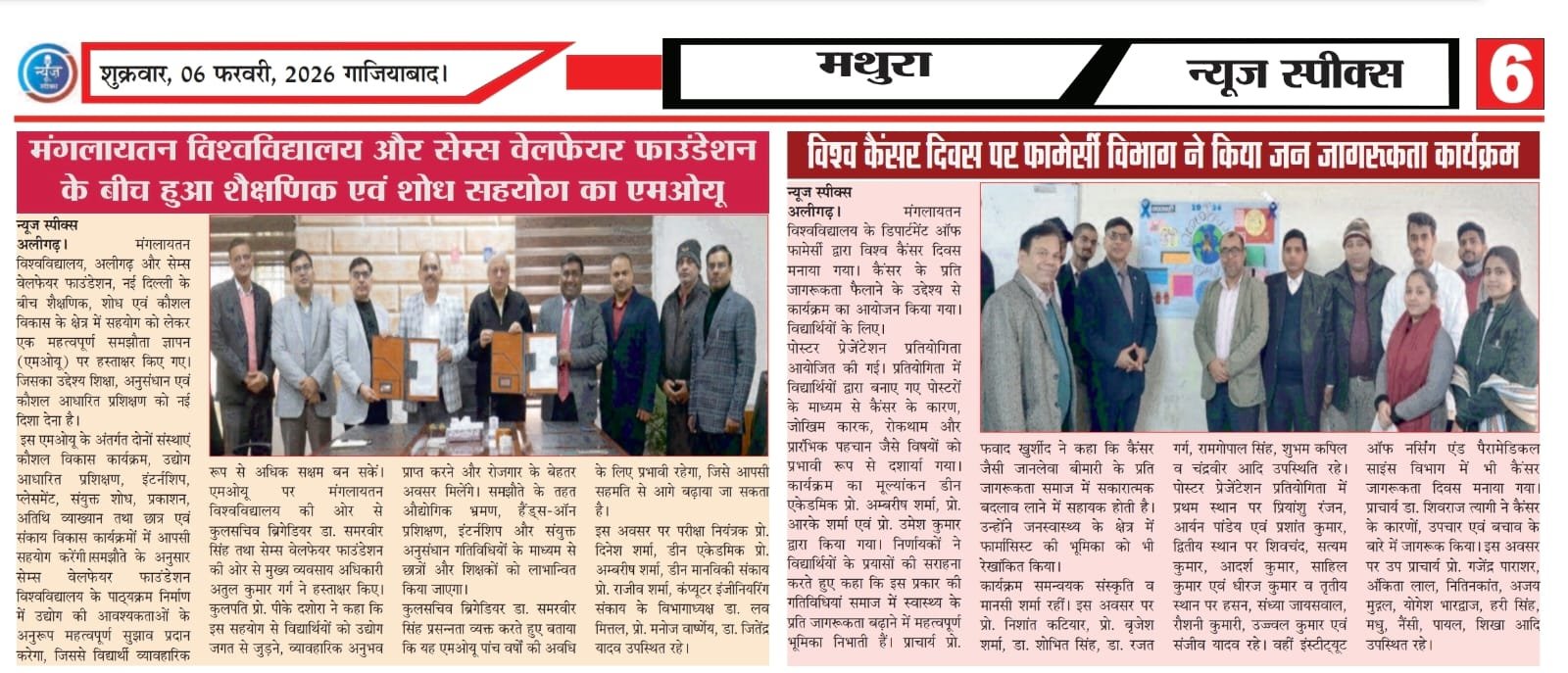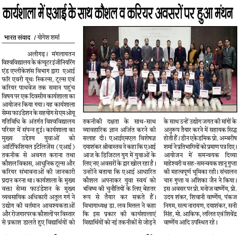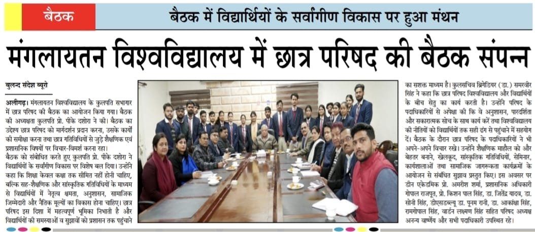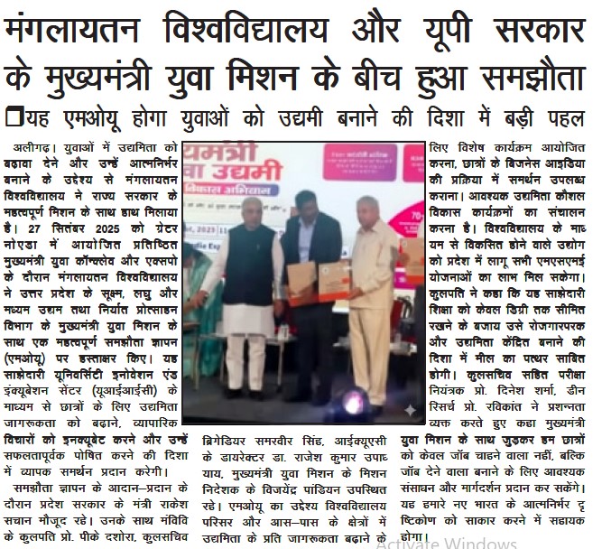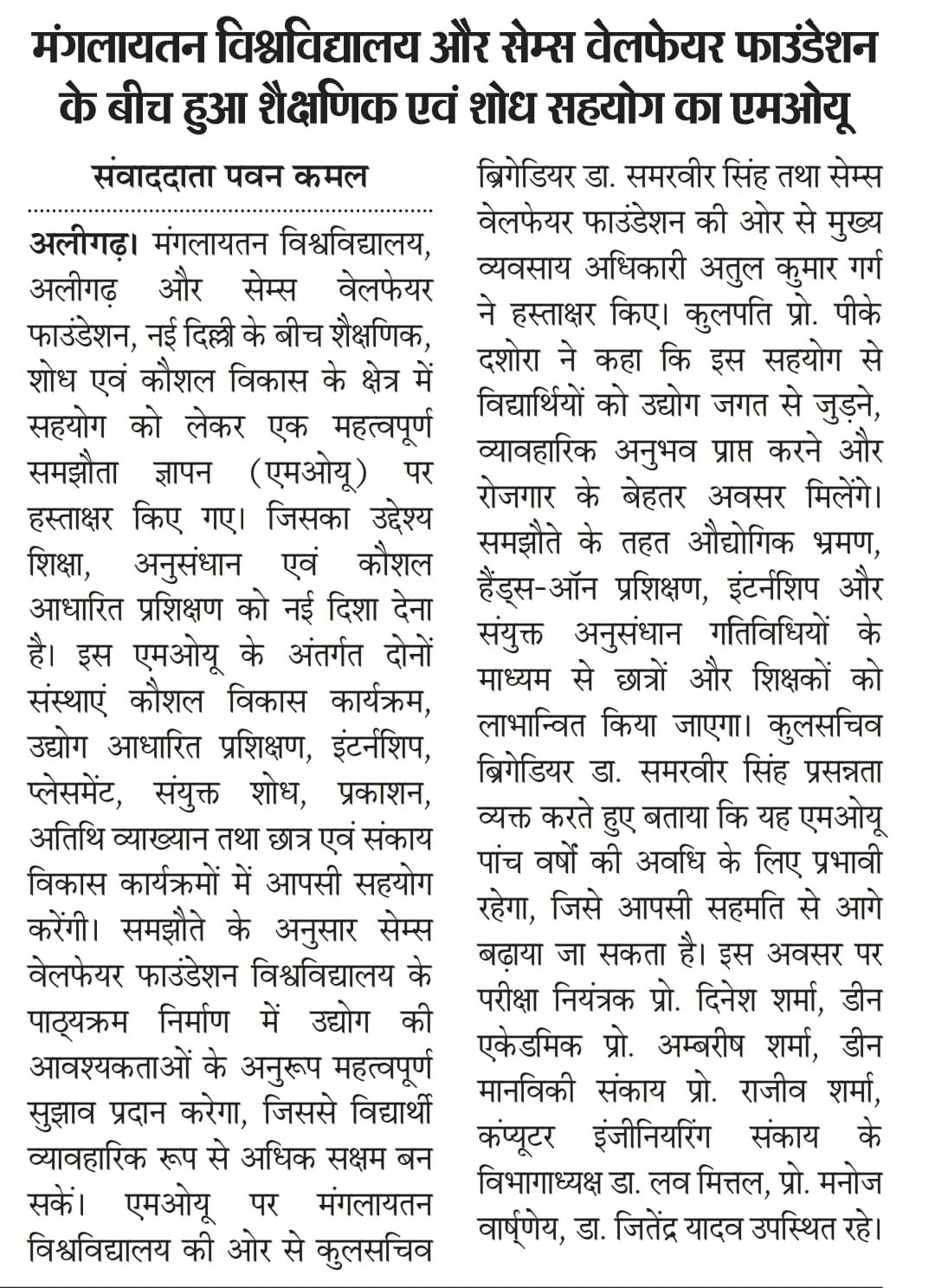 Mangalayatan University garnered significant attention in media with a feature highlighting departmental programs, community initiatives and activities. The article praised the university's commitment to academic excellence and its role in empowering academic units and their students through various skill development workshops and internships. Notably, the piece discussed the institution's efforts in promoting sustainable practices on campus, including eco-friendly initiatives that resonate with the university's mission to foster responsible citizens.This press clipping not only reflects the university's achievements but also its dedication to creating a vibrant learning environment, positioning Mangalayatan University as a cornerstone of educational development in the region. The coverage has sparked interest among prospective students and parents alike.