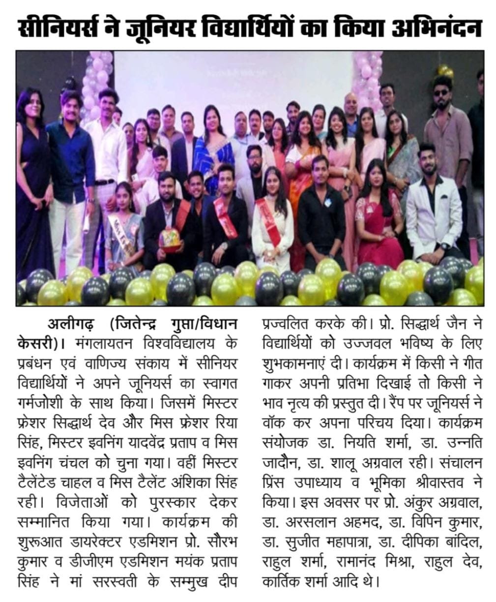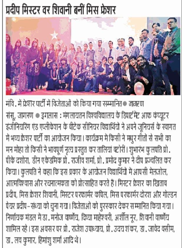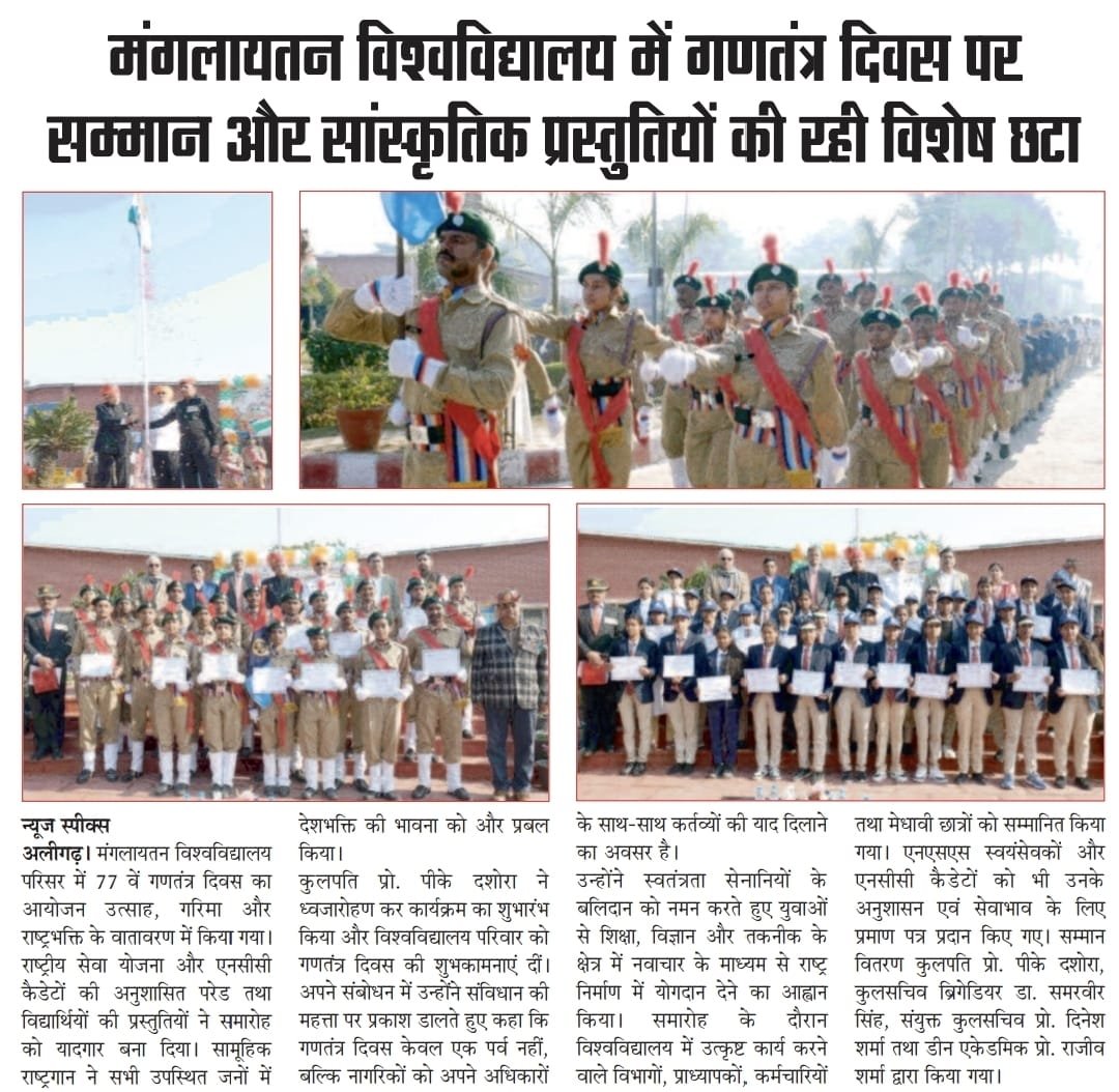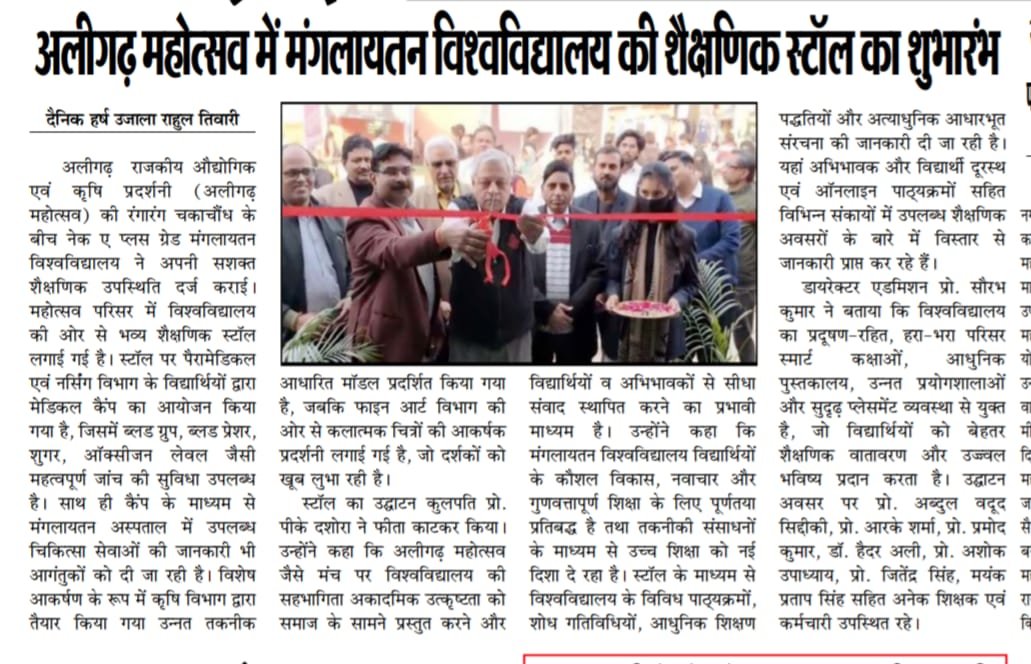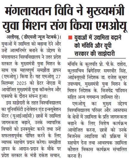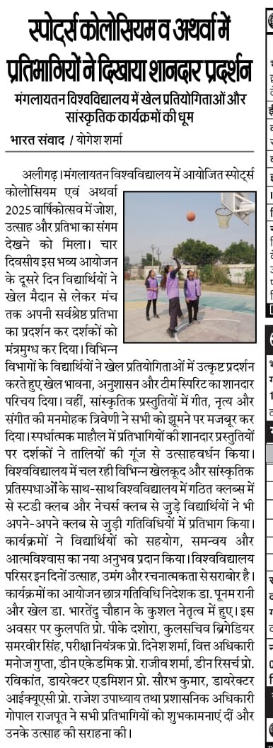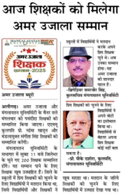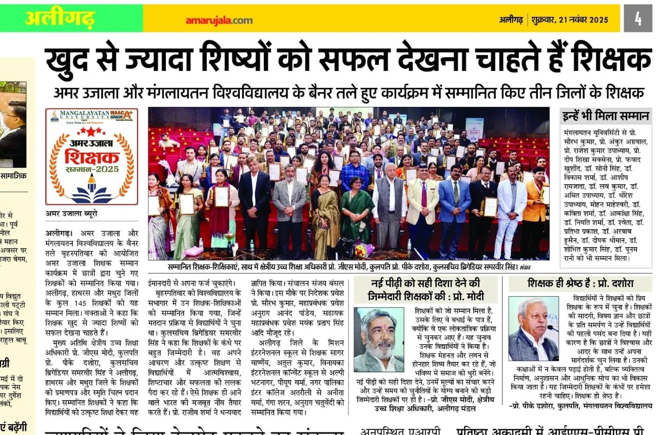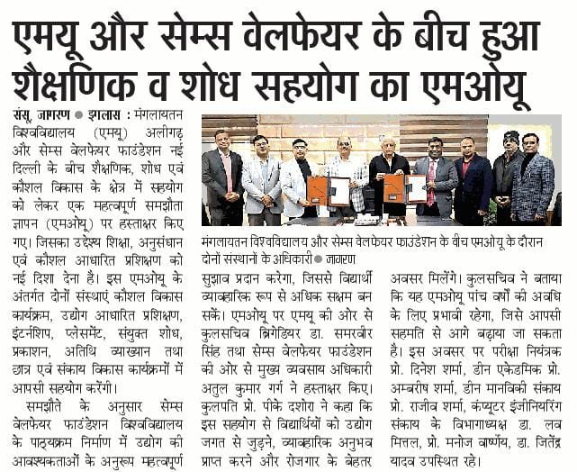 Mangalayatan University garnered significant attention in media with a feature highlighting departmental programs, community initiatives and activities. The article praised the university's commitment to academic excellence and its role in empowering academic units and their students through various skill development workshops and internships. Notably, the piece discussed the institution's efforts in promoting sustainable practices on campus, including eco-friendly initiatives that resonate with the university's mission to foster responsible citizens.This press clipping not only reflects the university's achievements but also its dedication to creating a vibrant learning environment, positioning Mangalayatan University as a cornerstone of educational development in the region. The coverage has sparked interest among prospective students and parents alike.