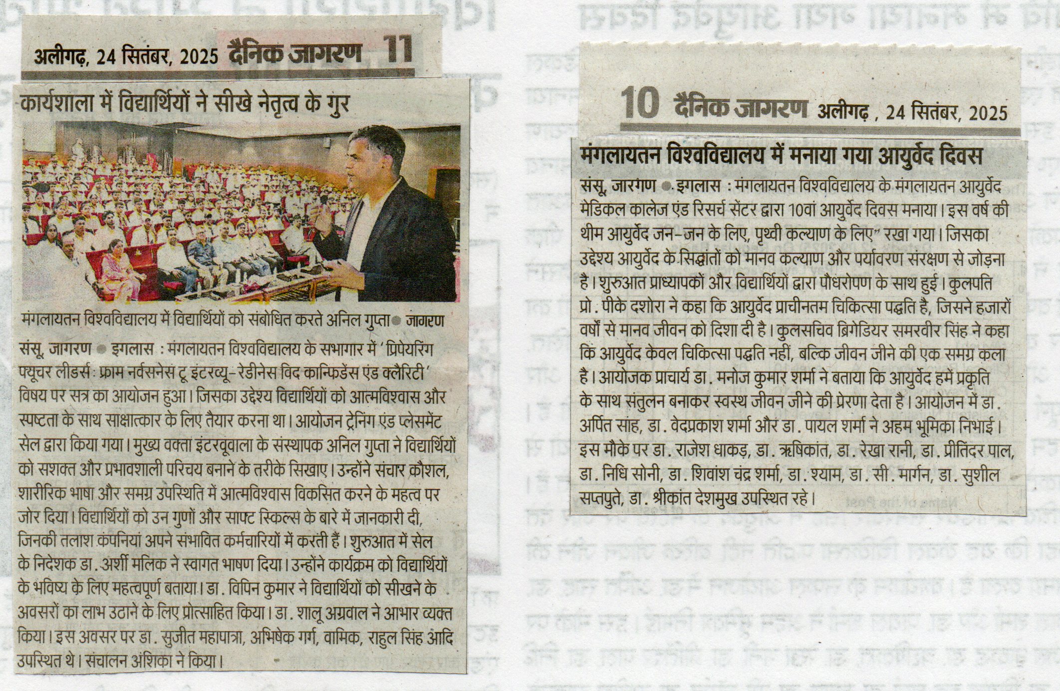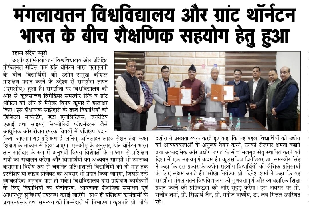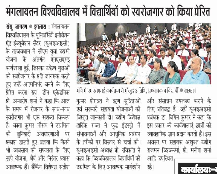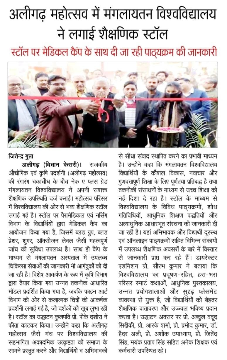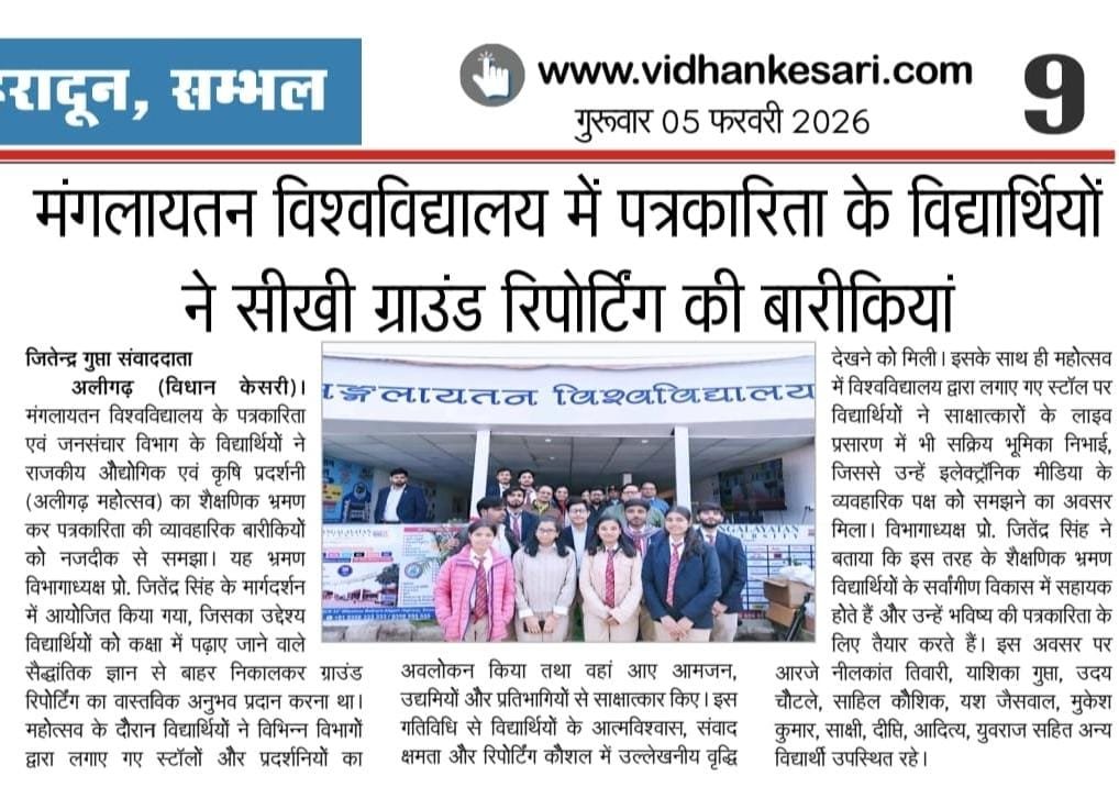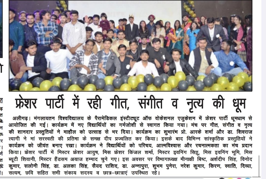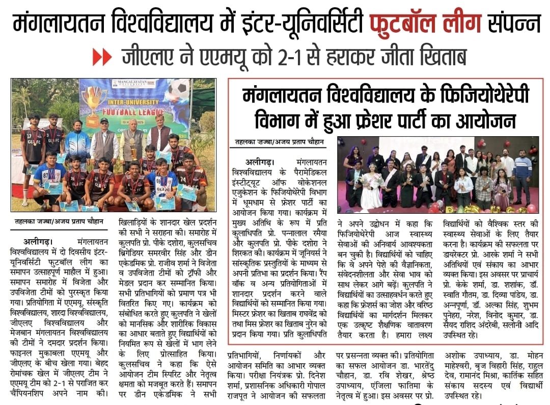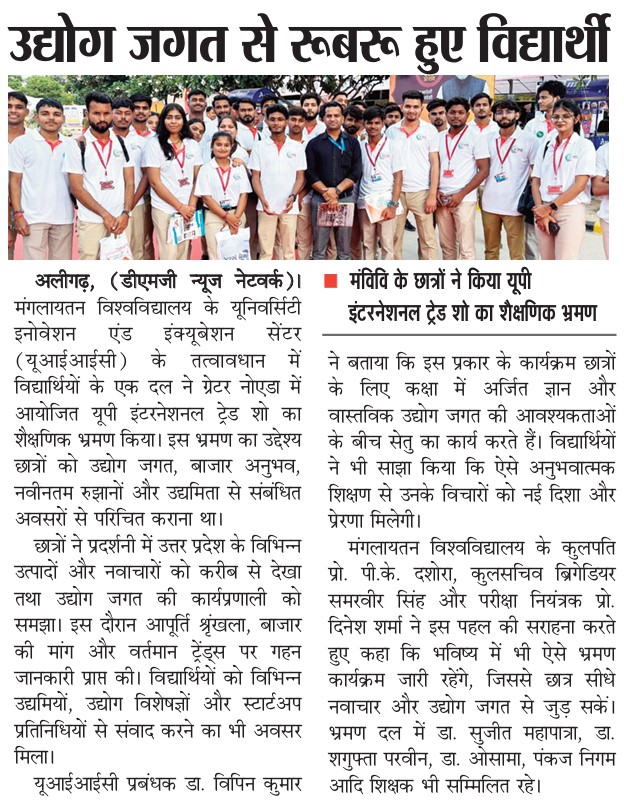 Mangalayatan University garnered significant attention in media with a feature highlighting departmental programs, community initiatives and activities. The article praised the university's commitment to academic excellence and its role in empowering academic units and their students through various skill development workshops and internships. Notably, the piece discussed the institution's efforts in promoting sustainable practices on campus, including eco-friendly initiatives that resonate with the university's mission to foster responsible citizens.This press clipping not only reflects the university's achievements but also its dedication to creating a vibrant learning environment, positioning Mangalayatan University as a cornerstone of educational development in the region. The coverage has sparked interest among prospective students and parents alike.