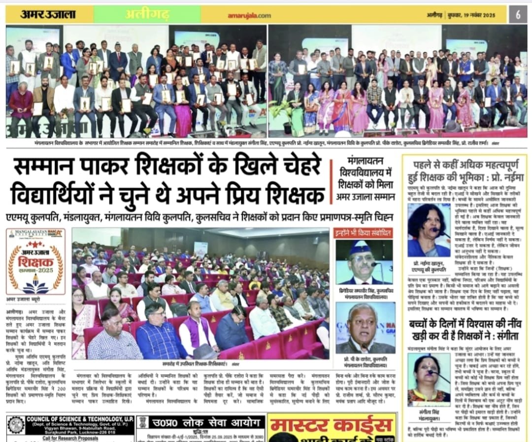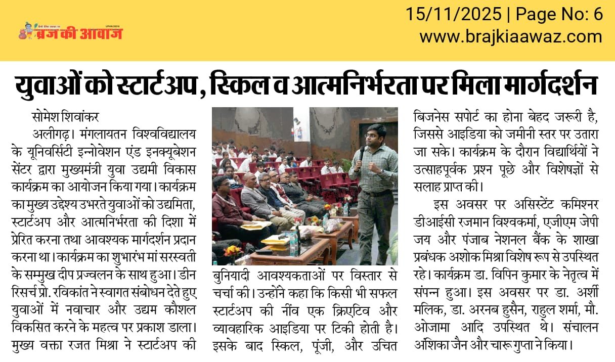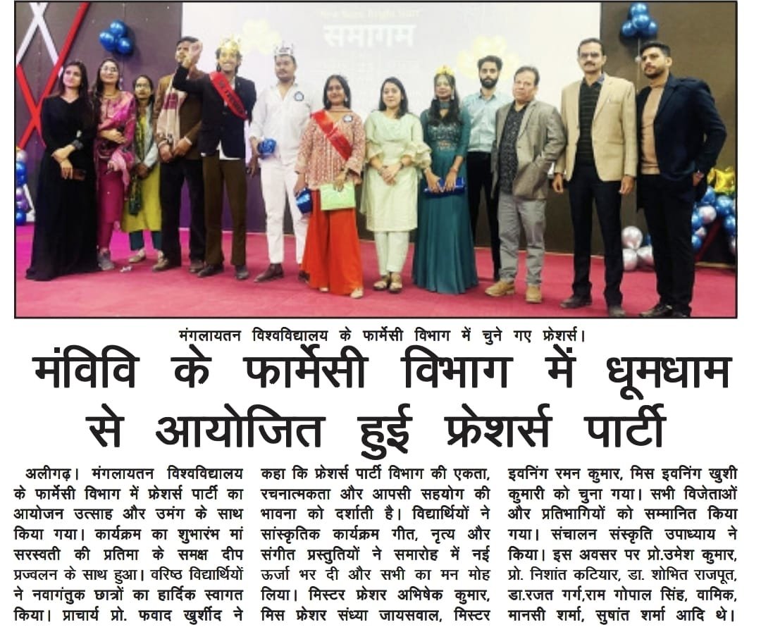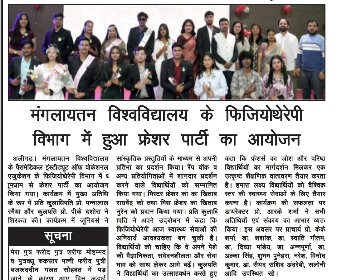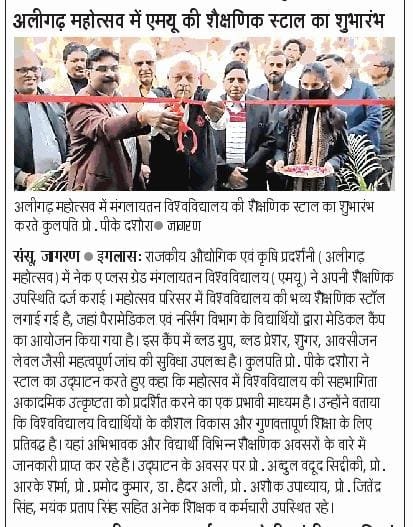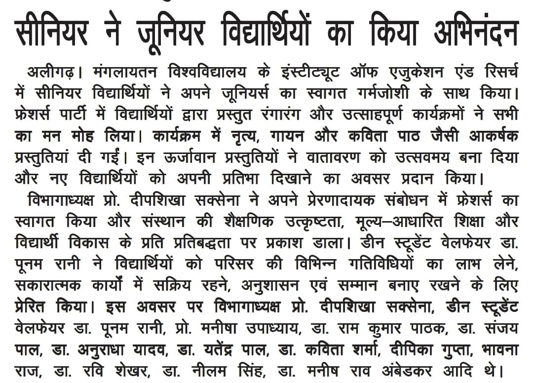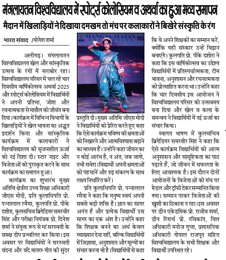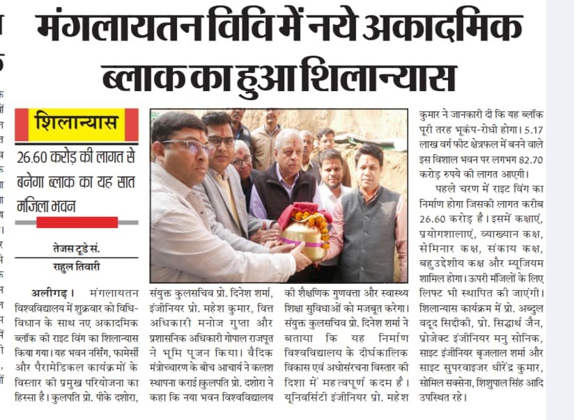Mangalayatan University garnered significant attention in media with a feature highlighting departmental programs, community initiatives and activities. The article praised the university's commitment to academic excellence and its role in empowering academic units and their students through various skill development workshops and internships. Notably, the piece discussed the institution's efforts in promoting sustainable practices on campus, including eco-friendly initiatives that resonate with the university's mission to foster responsible citizens.This press clipping not only reflects the university's achievements but also its dedication to creating a vibrant learning environment, positioning Mangalayatan University as a cornerstone of educational development in the region. The coverage has sparked interest among prospective students and parents alike.