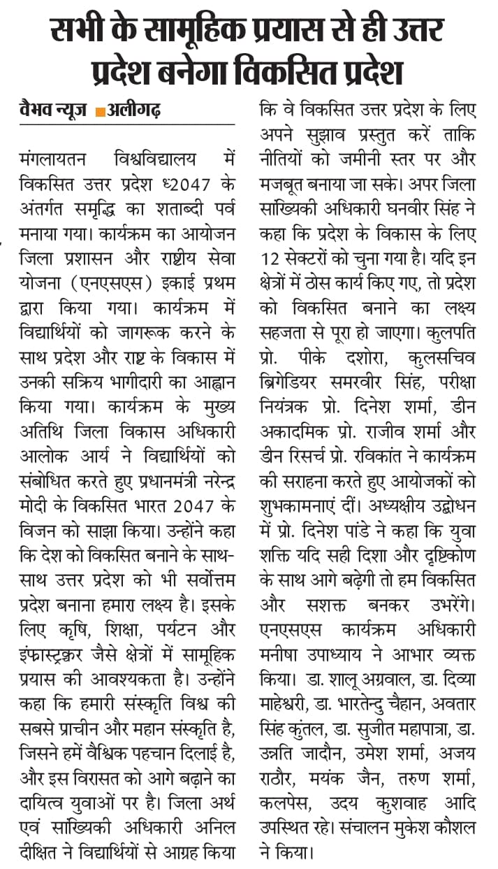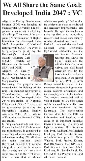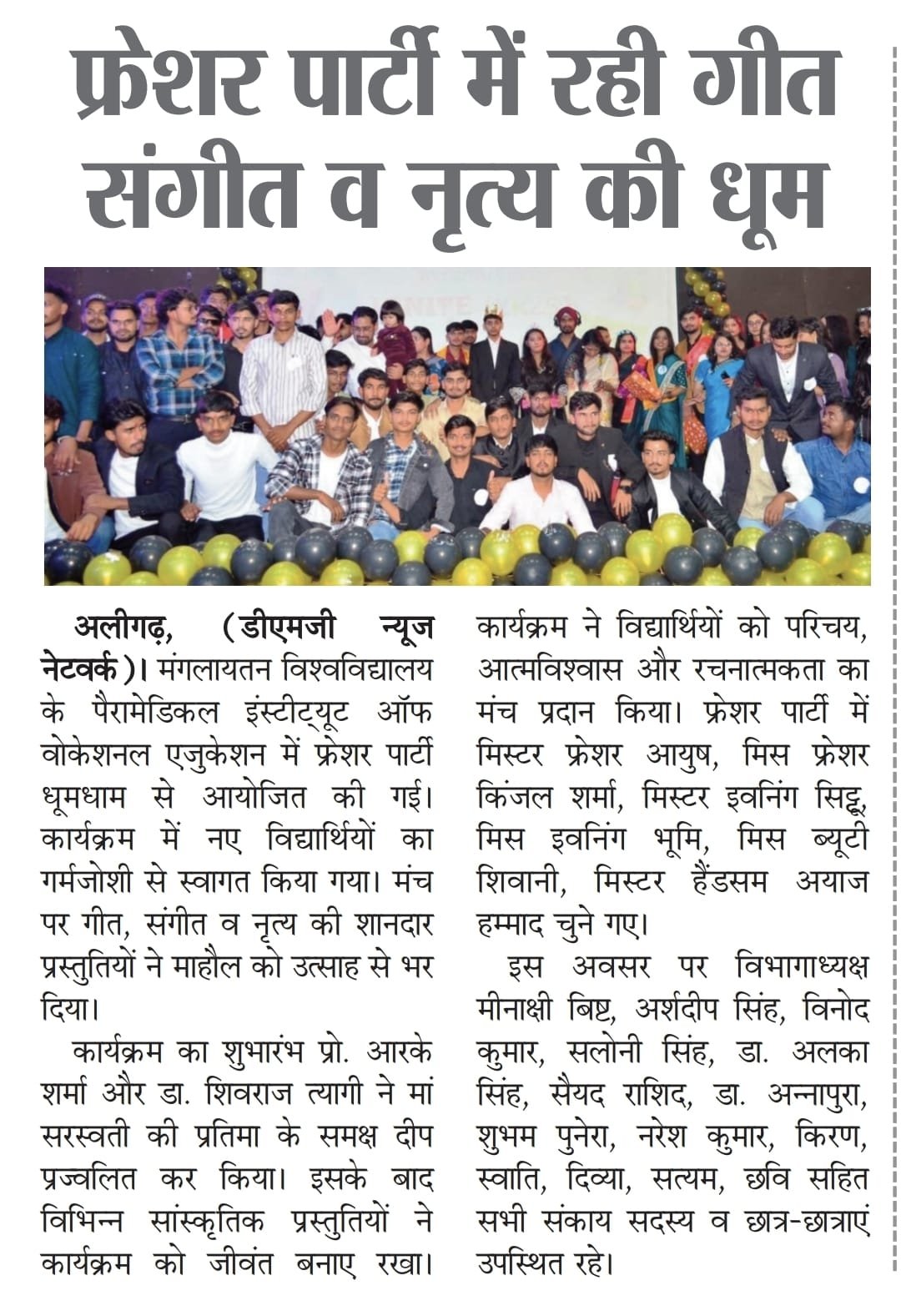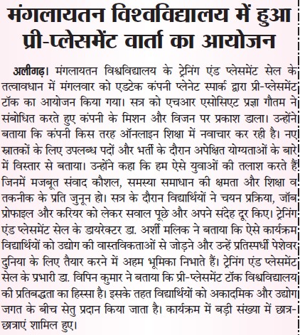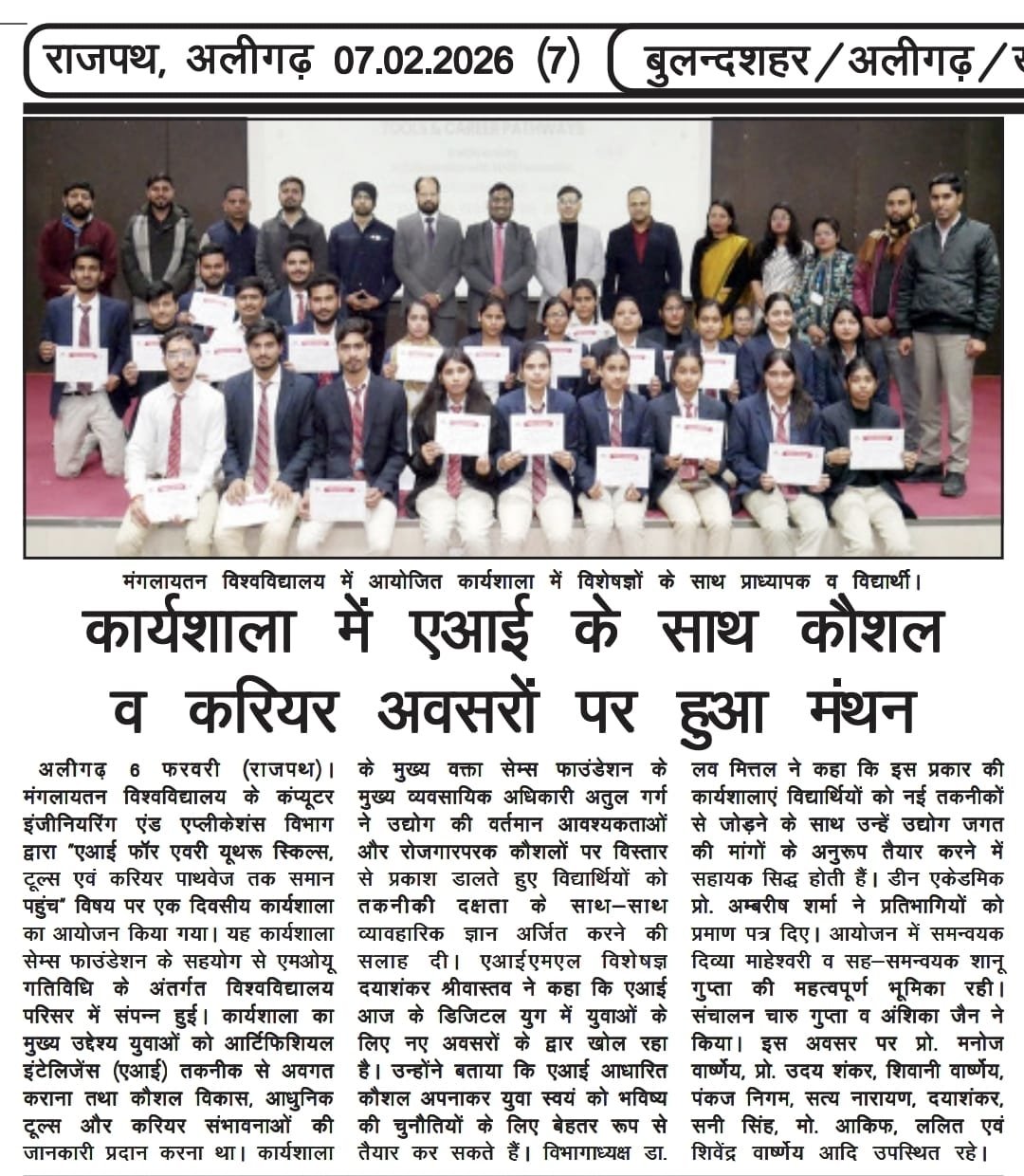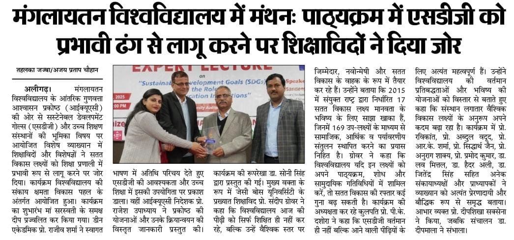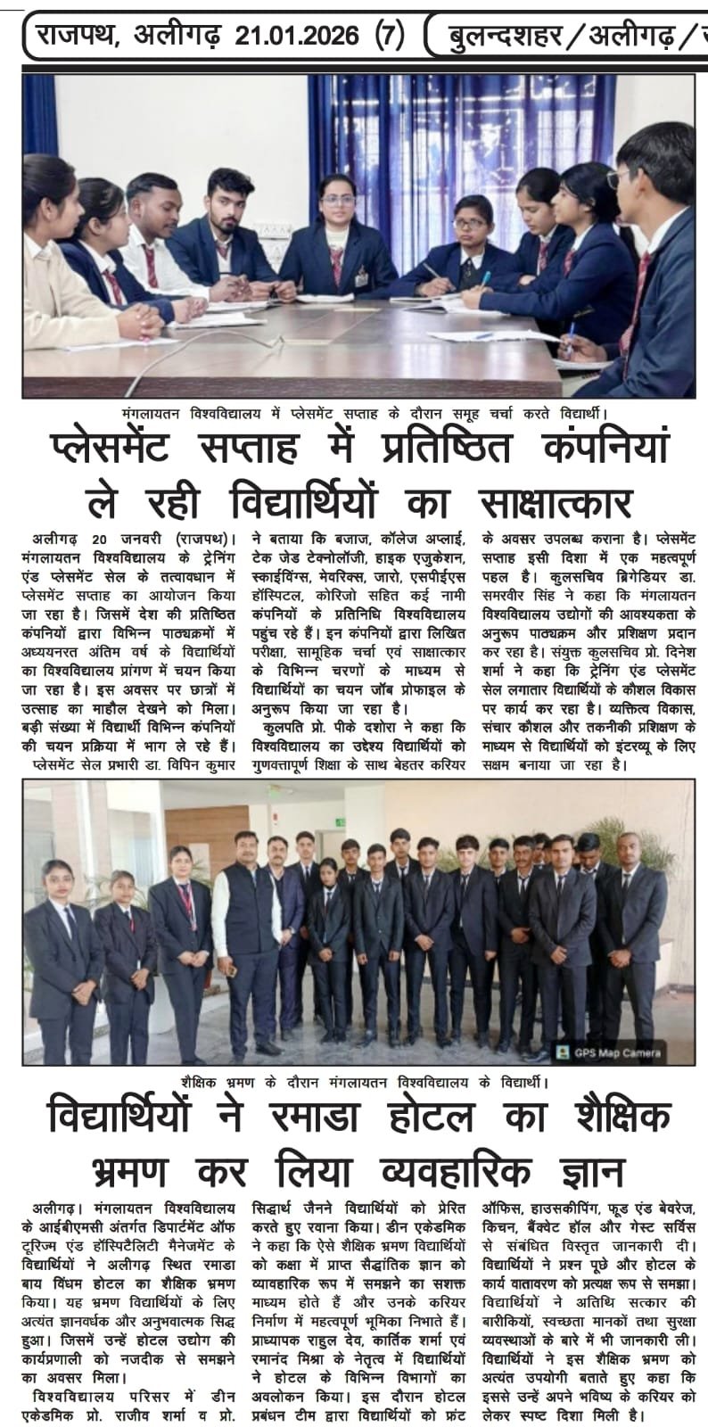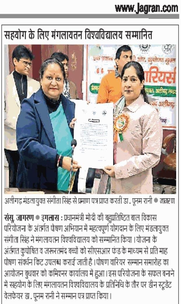 Mangalayatan University garnered significant attention in media with a feature highlighting departmental programs, community initiatives and activities. The article praised the university's commitment to academic excellence and its role in empowering academic units and their students through various skill development workshops and internships. Notably, the piece discussed the institution's efforts in promoting sustainable practices on campus, including eco-friendly initiatives that resonate with the university's mission to foster responsible citizens.This press clipping not only reflects the university's achievements but also its dedication to creating a vibrant learning environment, positioning Mangalayatan University as a cornerstone of educational development in the region. The coverage has sparked interest among prospective students and parents alike.