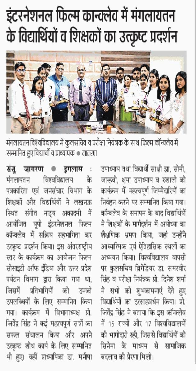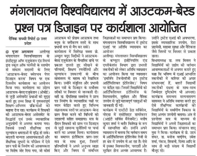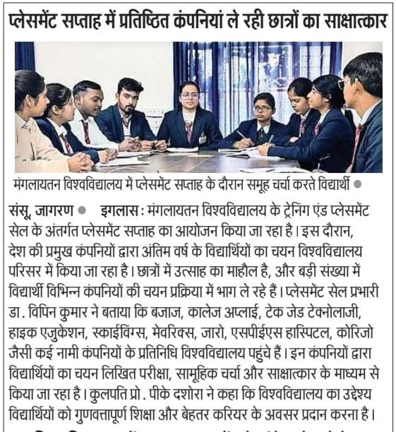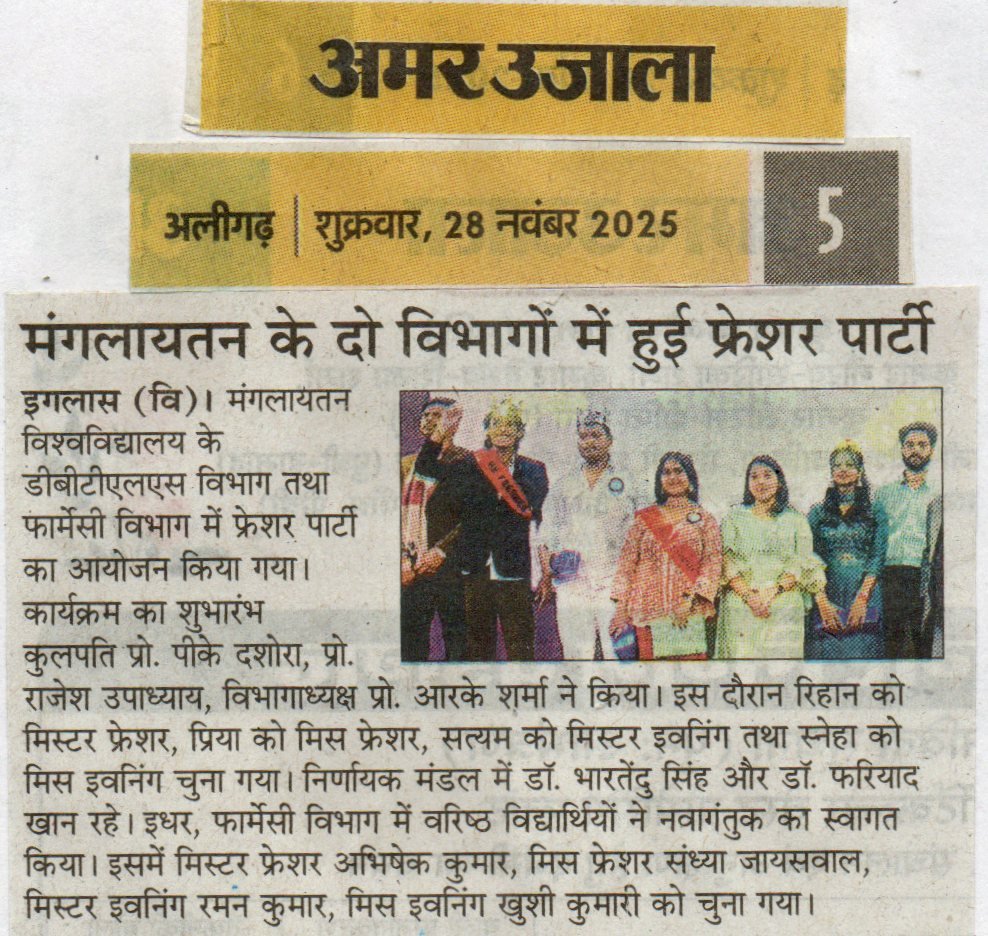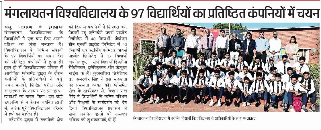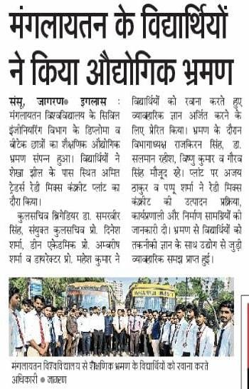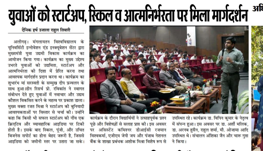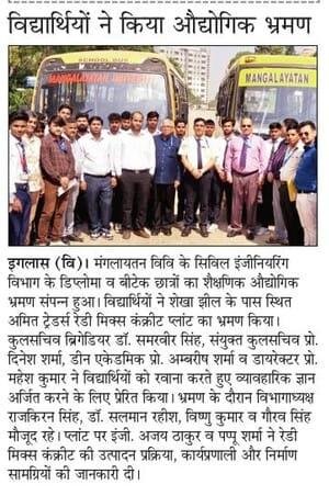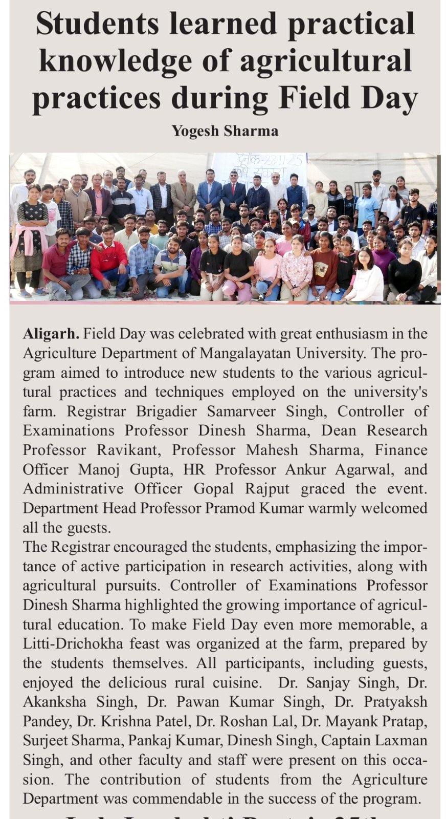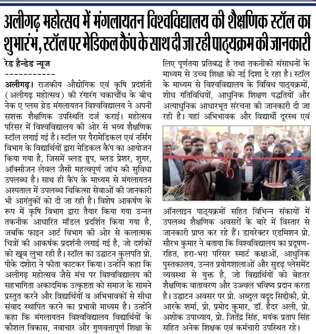 Mangalayatan University garnered significant attention in media with a feature highlighting departmental programs, community initiatives and activities. The article praised the university's commitment to academic excellence and its role in empowering academic units and their students through various skill development workshops and internships. Notably, the piece discussed the institution's efforts in promoting sustainable practices on campus, including eco-friendly initiatives that resonate with the university's mission to foster responsible citizens.This press clipping not only reflects the university's achievements but also its dedication to creating a vibrant learning environment, positioning Mangalayatan University as a cornerstone of educational development in the region. The coverage has sparked interest among prospective students and parents alike.