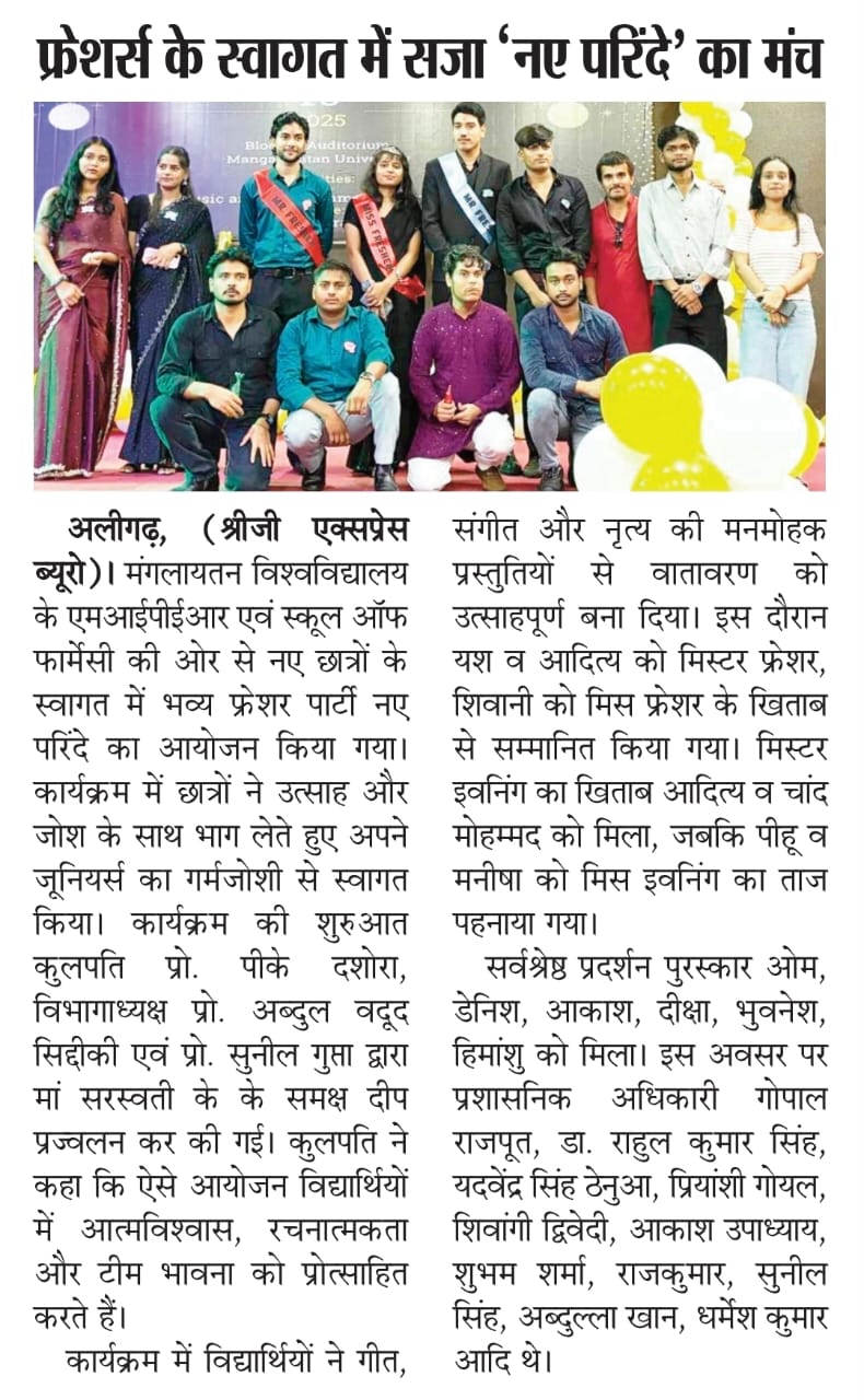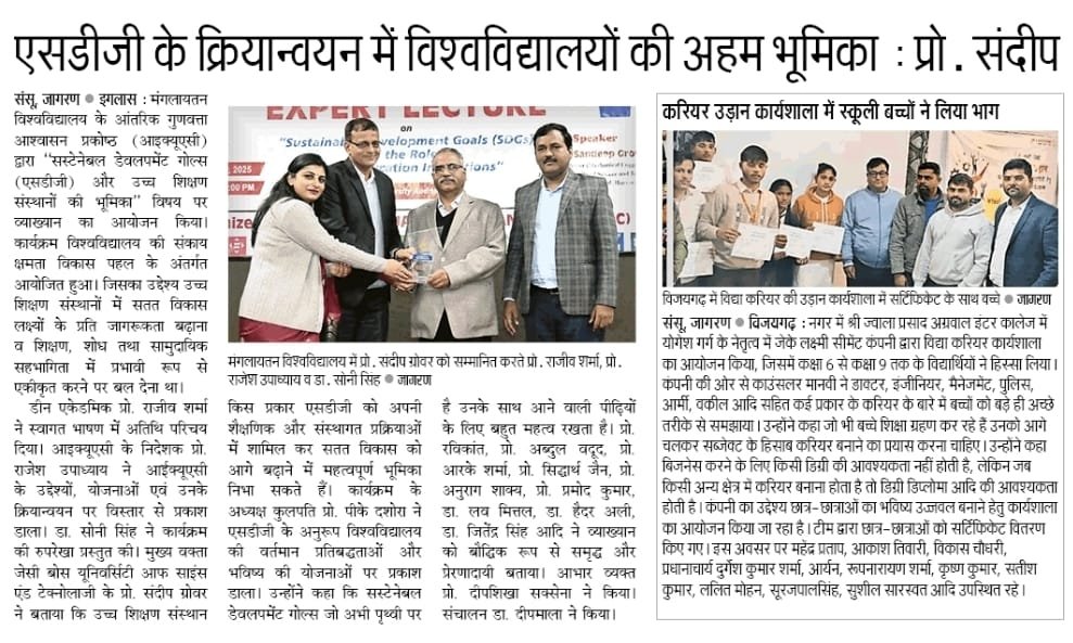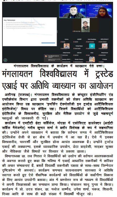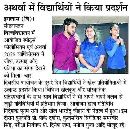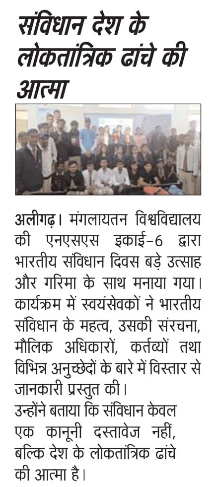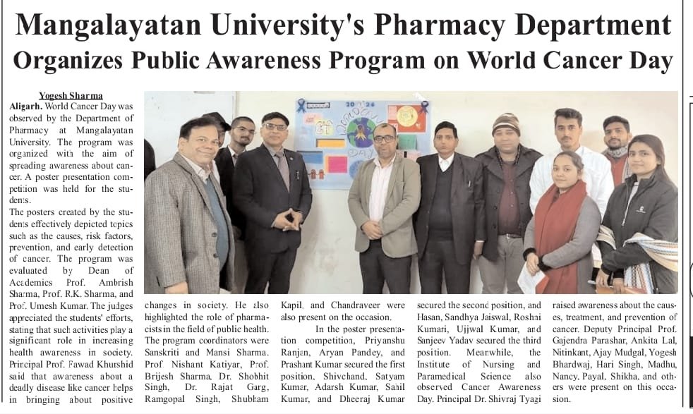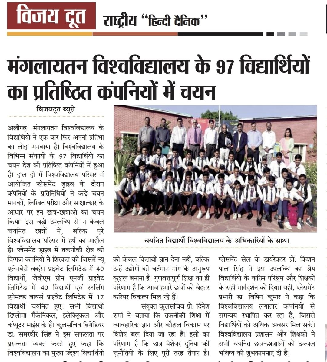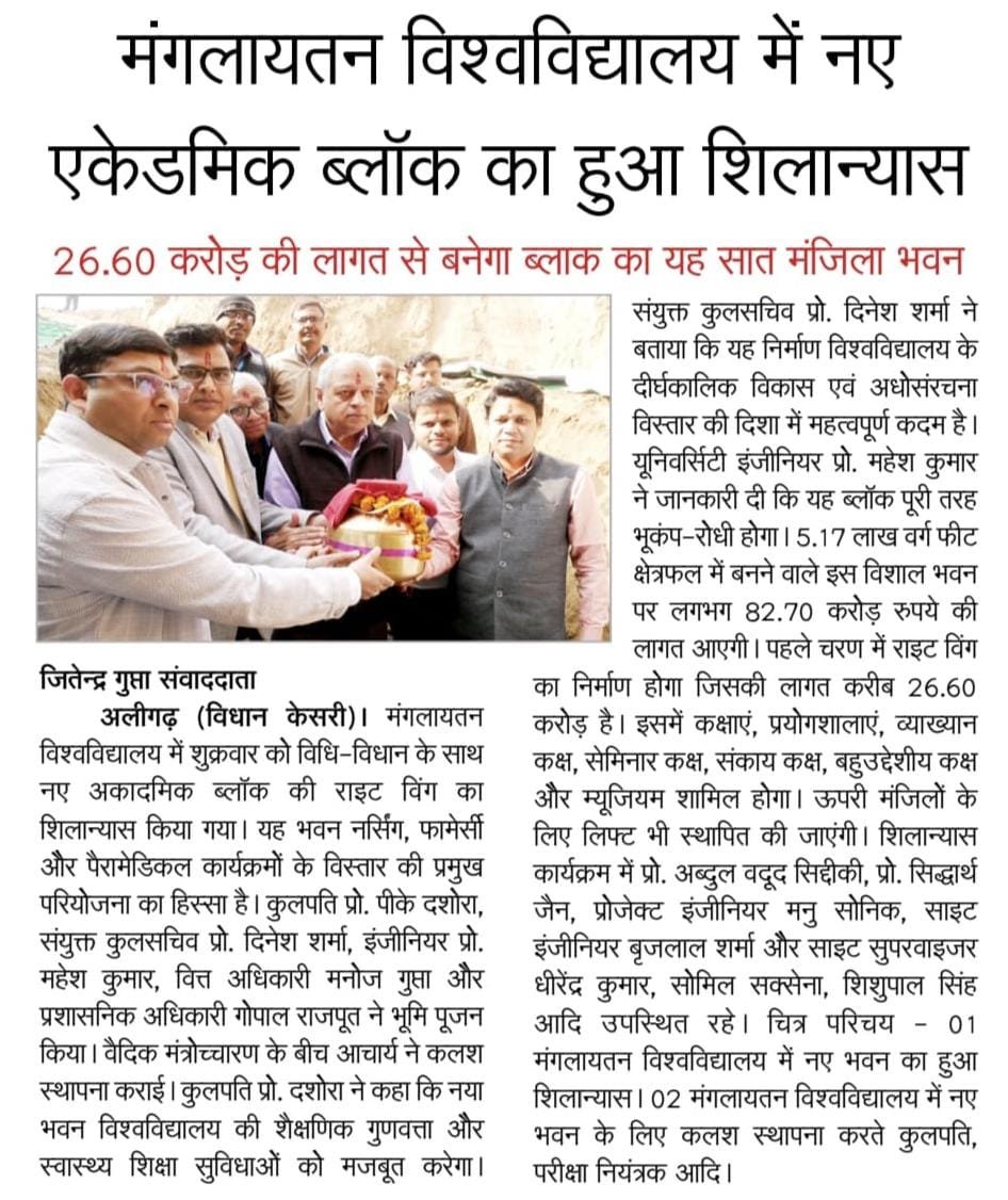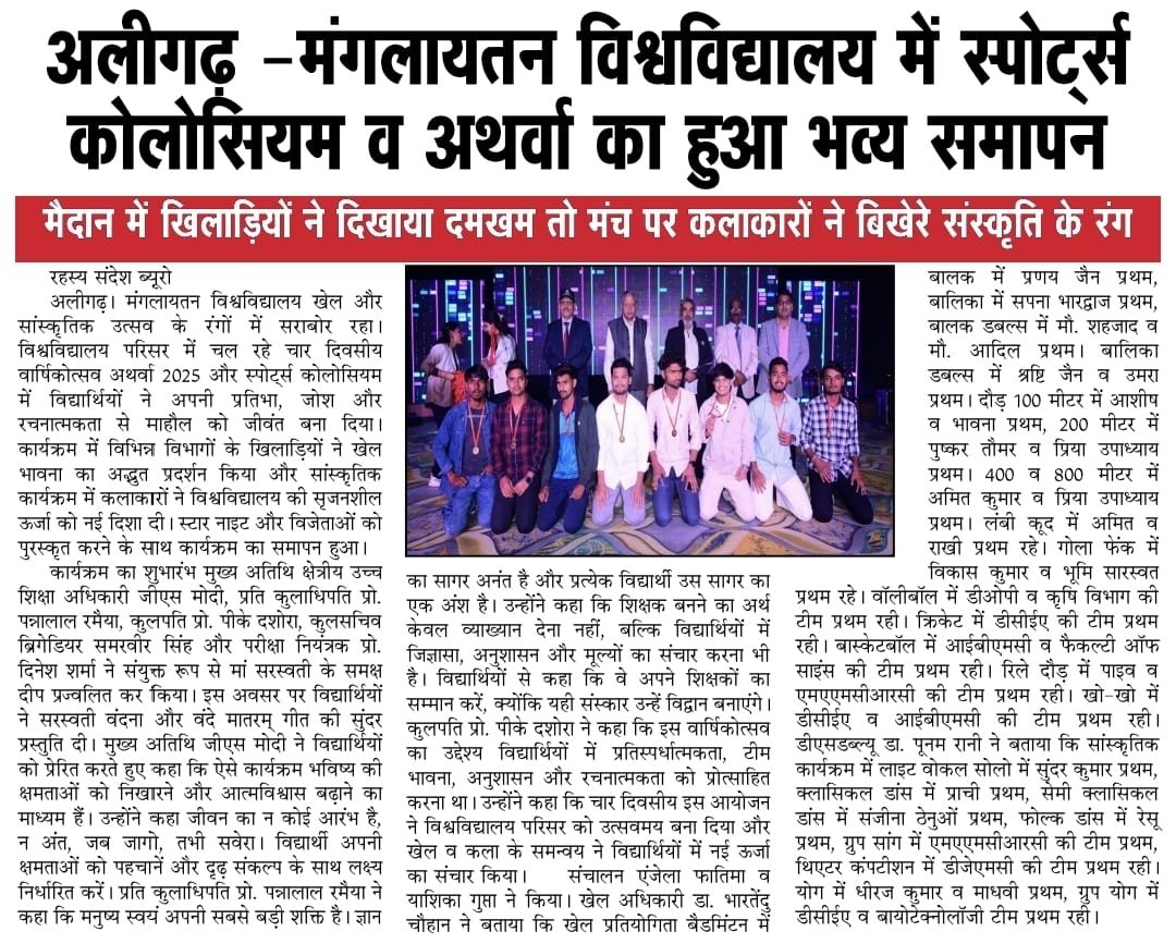 Mangalayatan University garnered significant attention in media with a feature highlighting departmental programs, community initiatives and activities. The article praised the university's commitment to academic excellence and its role in empowering academic units and their students through various skill development workshops and internships. Notably, the piece discussed the institution's efforts in promoting sustainable practices on campus, including eco-friendly initiatives that resonate with the university's mission to foster responsible citizens.This press clipping not only reflects the university's achievements but also its dedication to creating a vibrant learning environment, positioning Mangalayatan University as a cornerstone of educational development in the region. The coverage has sparked interest among prospective students and parents alike.