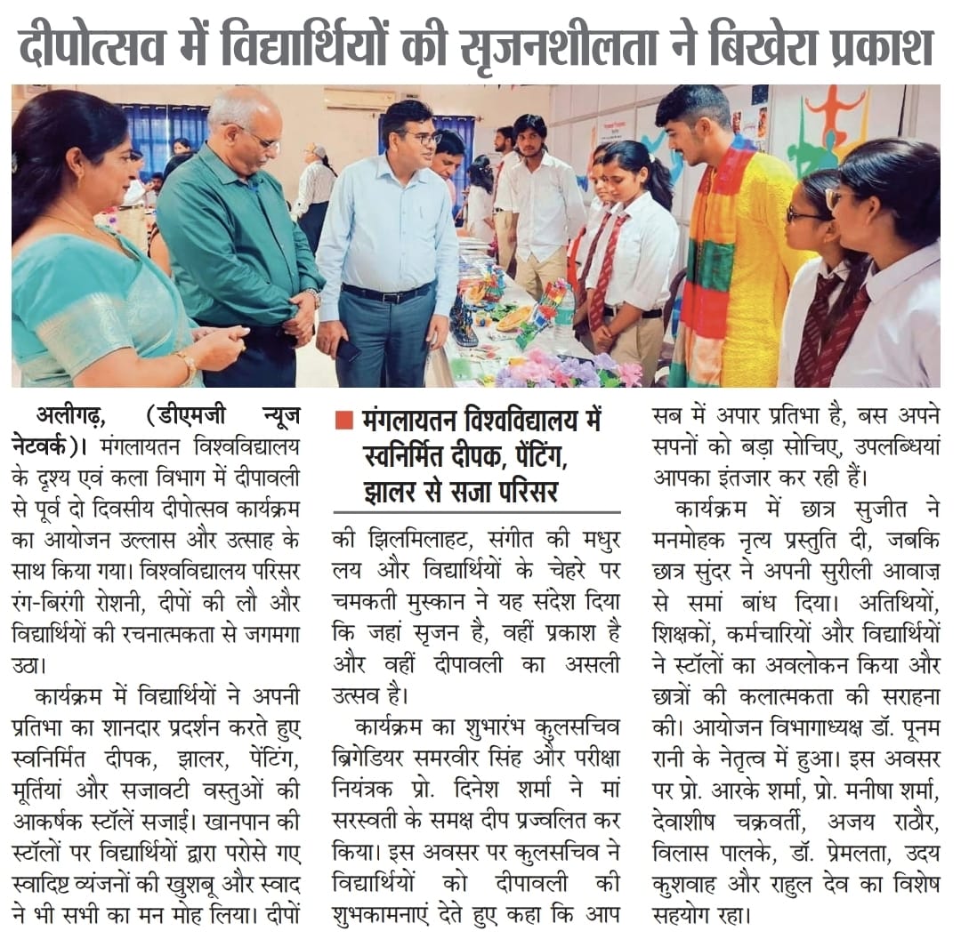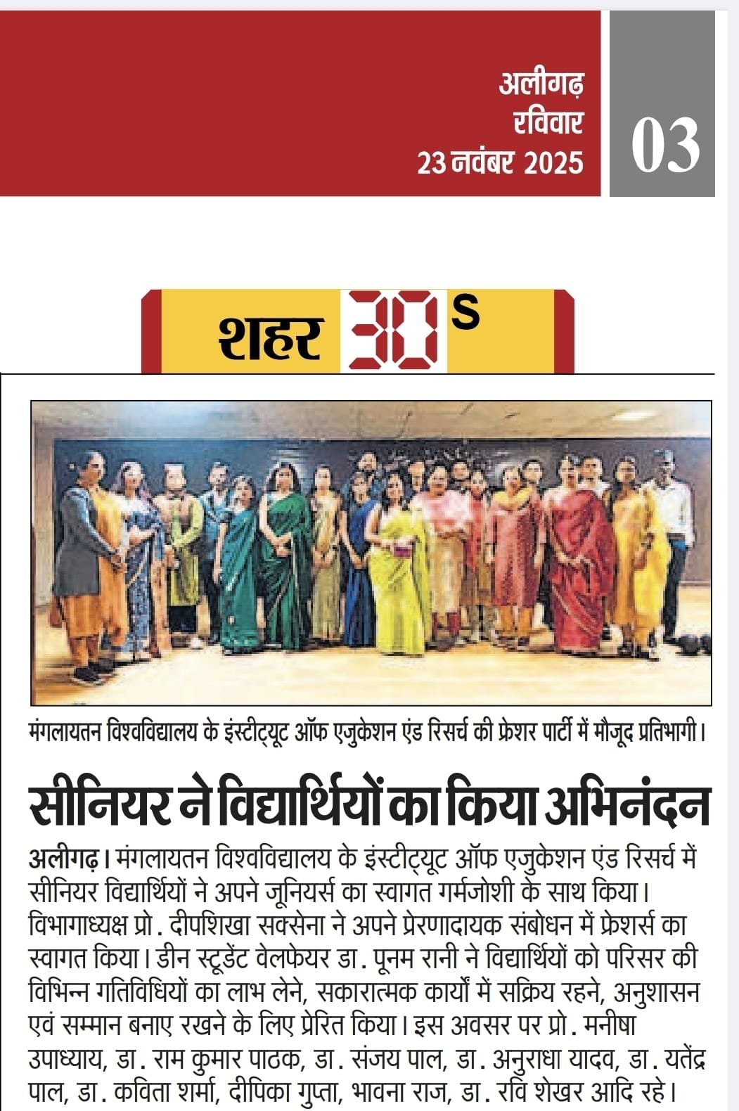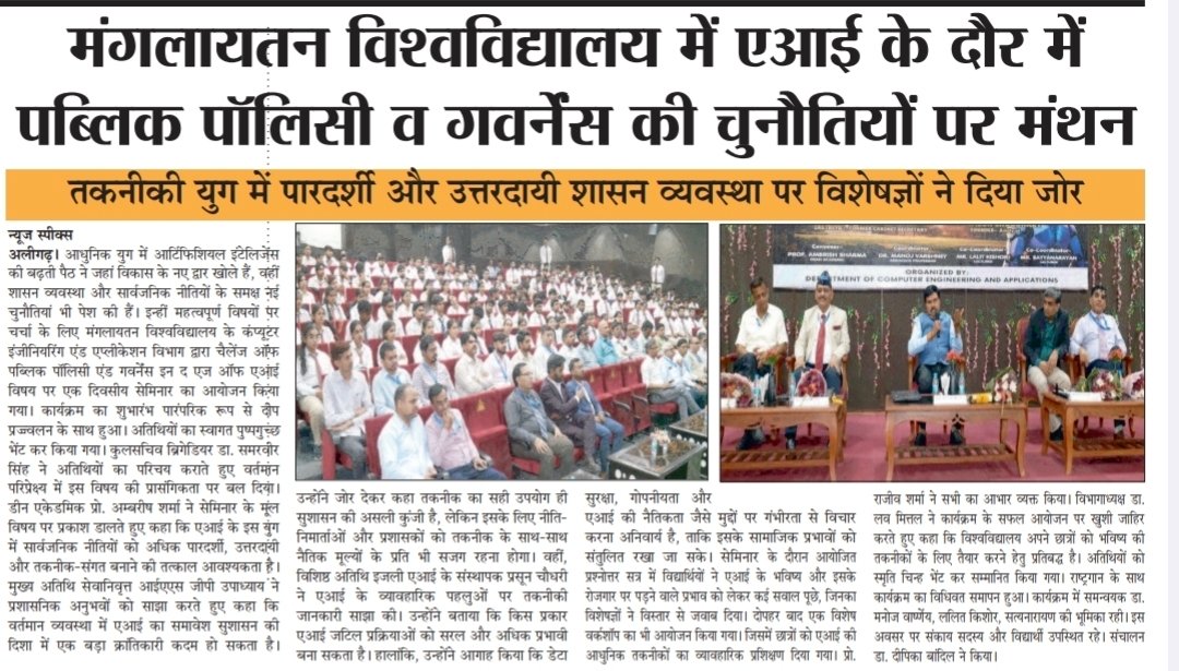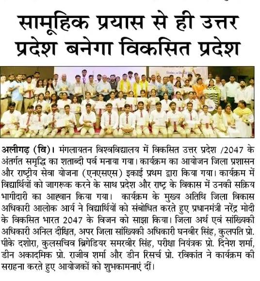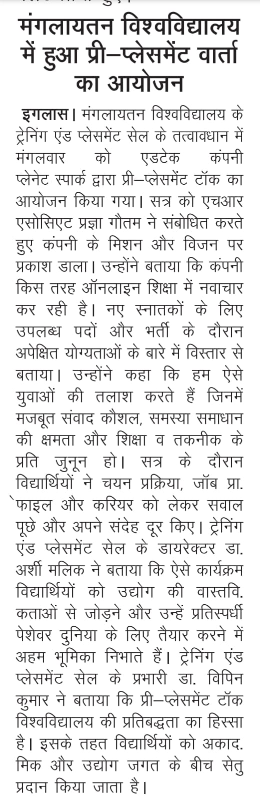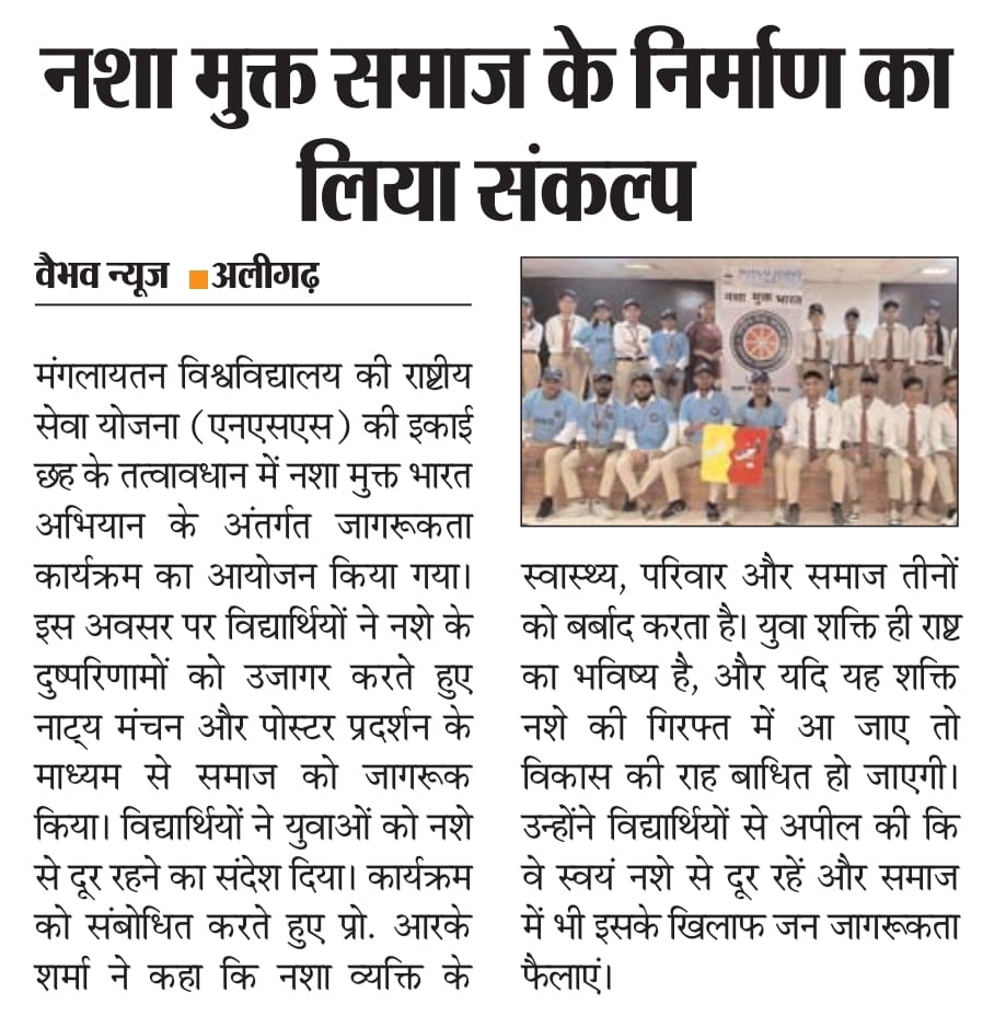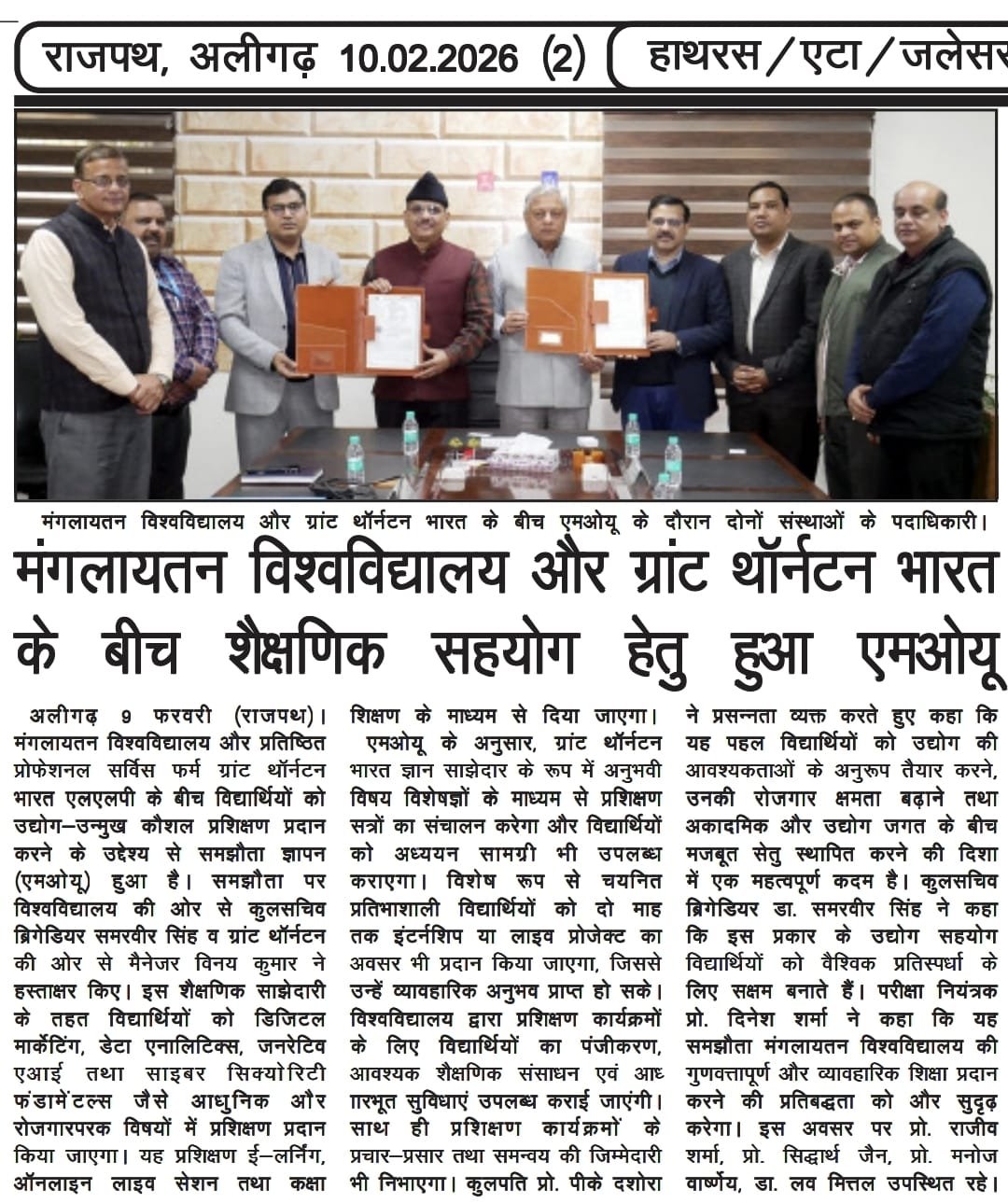 Mangalayatan University garnered significant attention in media with a feature highlighting departmental programs, community initiatives and activities. The article praised the university's commitment to academic excellence and its role in empowering academic units and their students through various skill development workshops and internships. Notably, the piece discussed the institution's efforts in promoting sustainable practices on campus, including eco-friendly initiatives that resonate with the university's mission to foster responsible citizens.This press clipping not only reflects the university's achievements but also its dedication to creating a vibrant learning environment, positioning Mangalayatan University as a cornerstone of educational development in the region. The coverage has sparked interest among prospective students and parents alike.