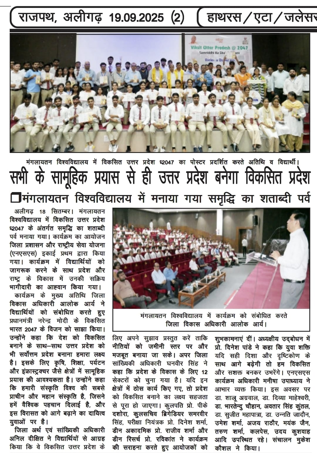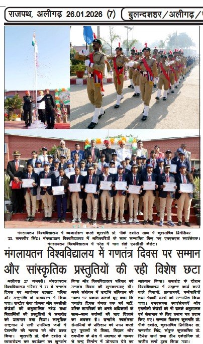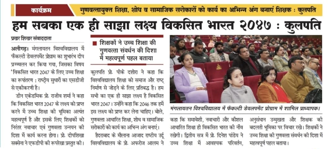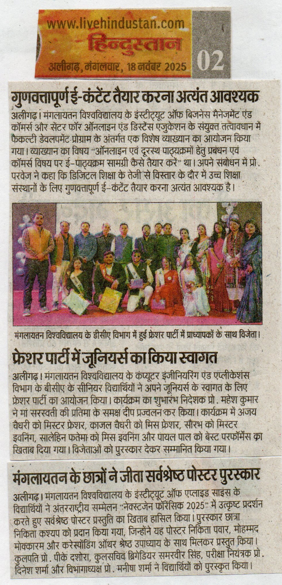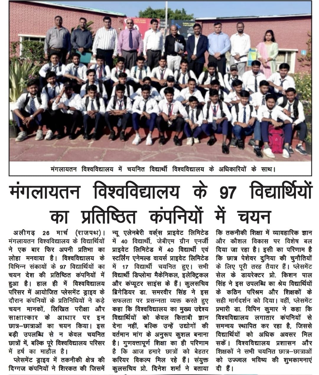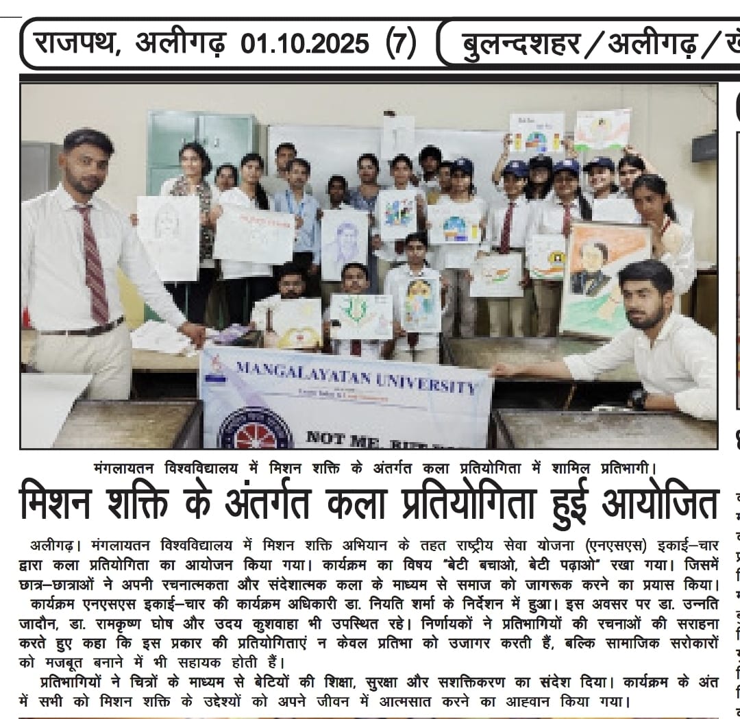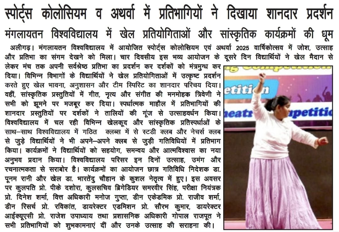 Mangalayatan University garnered significant attention in media with a feature highlighting departmental programs, community initiatives and activities. The article praised the university's commitment to academic excellence and its role in empowering academic units and their students through various skill development workshops and internships. Notably, the piece discussed the institution's efforts in promoting sustainable practices on campus, including eco-friendly initiatives that resonate with the university's mission to foster responsible citizens.This press clipping not only reflects the university's achievements but also its dedication to creating a vibrant learning environment, positioning Mangalayatan University as a cornerstone of educational development in the region. The coverage has sparked interest among prospective students and parents alike.