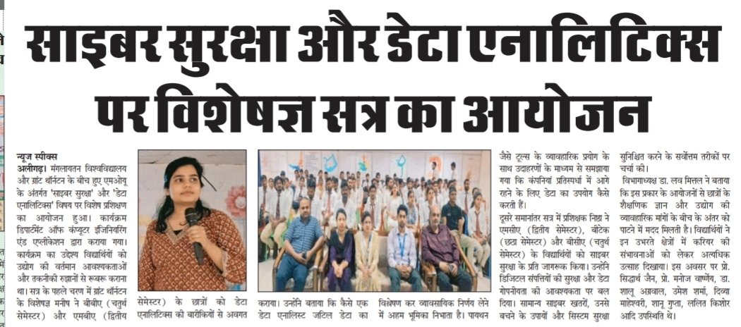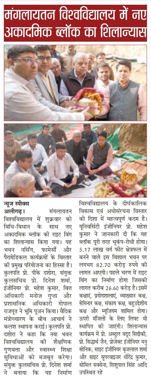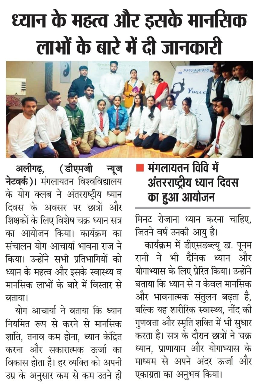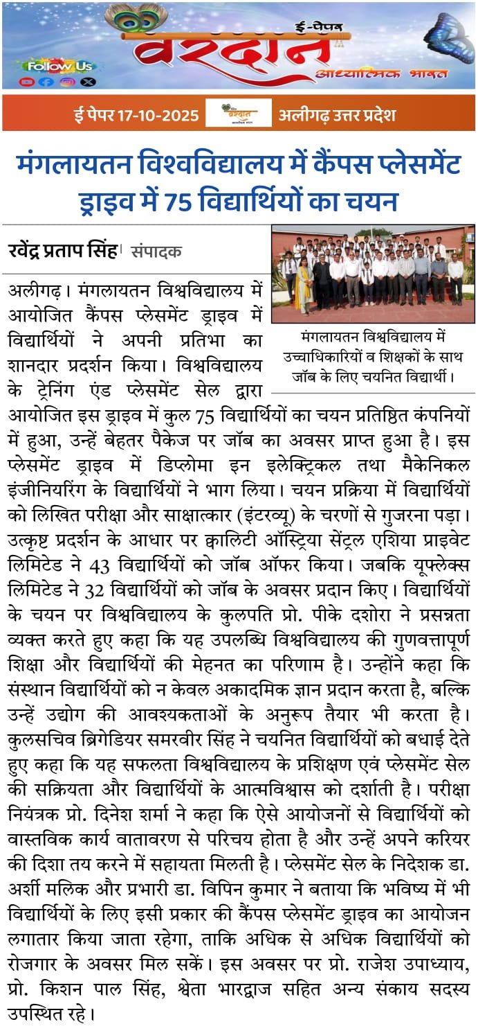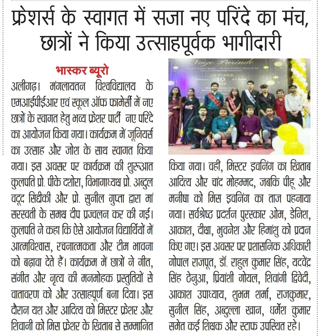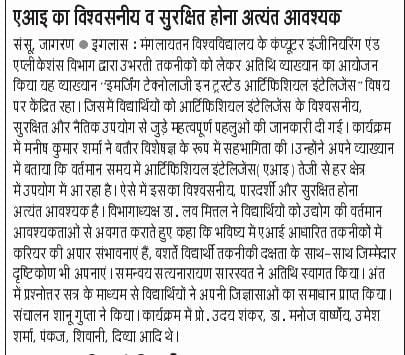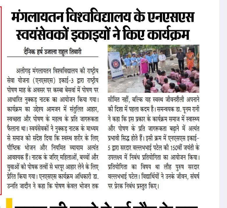 Mangalayatan University garnered significant attention in media with a feature highlighting departmental programs, community initiatives and activities. The article praised the university's commitment to academic excellence and its role in empowering academic units and their students through various skill development workshops and internships. Notably, the piece discussed the institution's efforts in promoting sustainable practices on campus, including eco-friendly initiatives that resonate with the university's mission to foster responsible citizens.This press clipping not only reflects the university's achievements but also its dedication to creating a vibrant learning environment, positioning Mangalayatan University as a cornerstone of educational development in the region. The coverage has sparked interest among prospective students and parents alike.