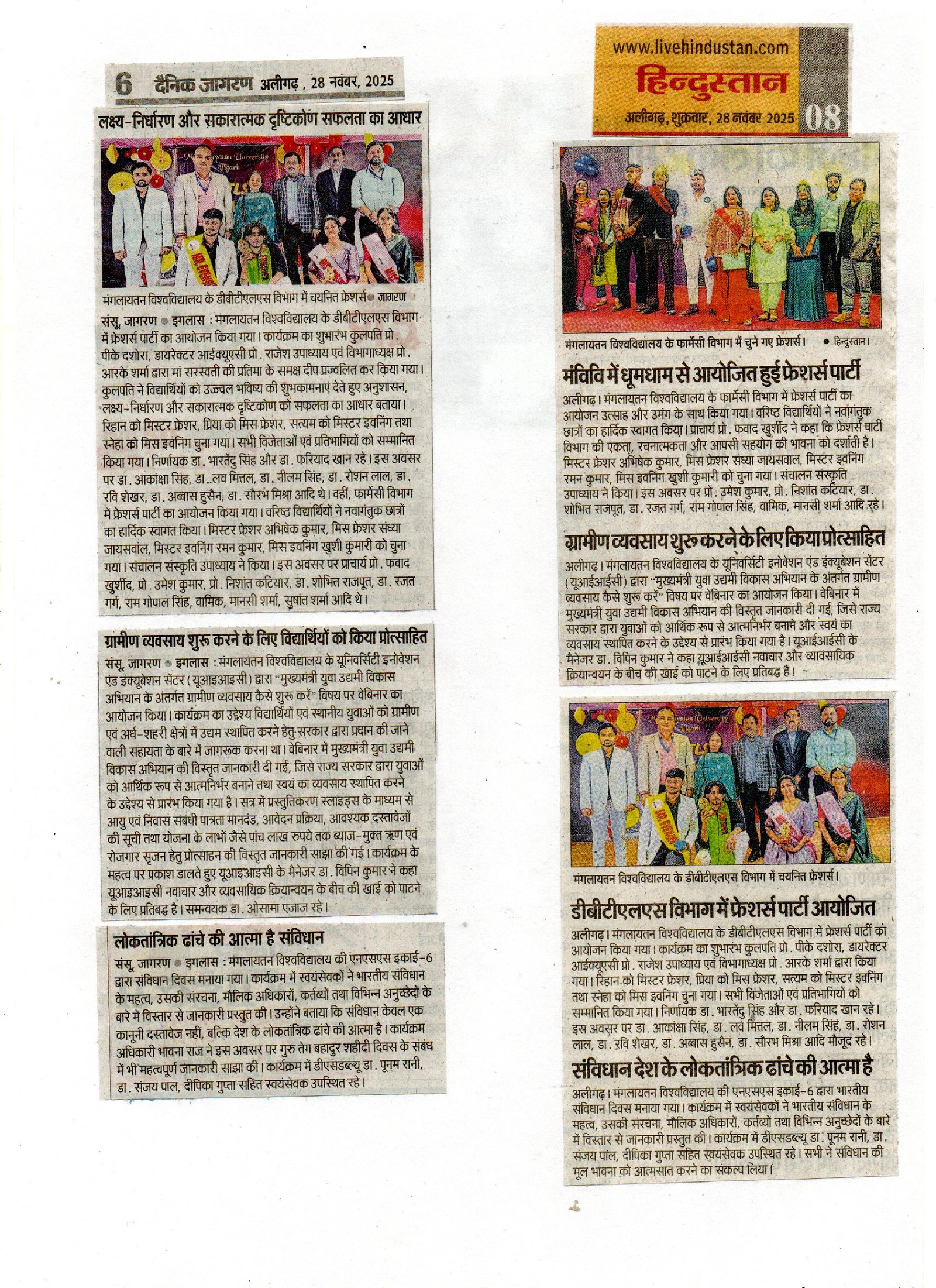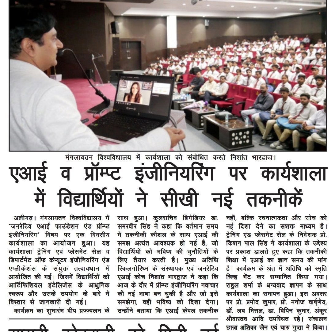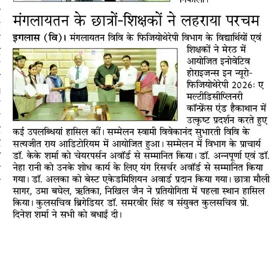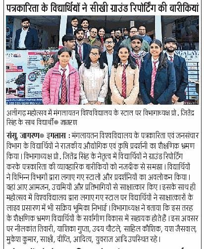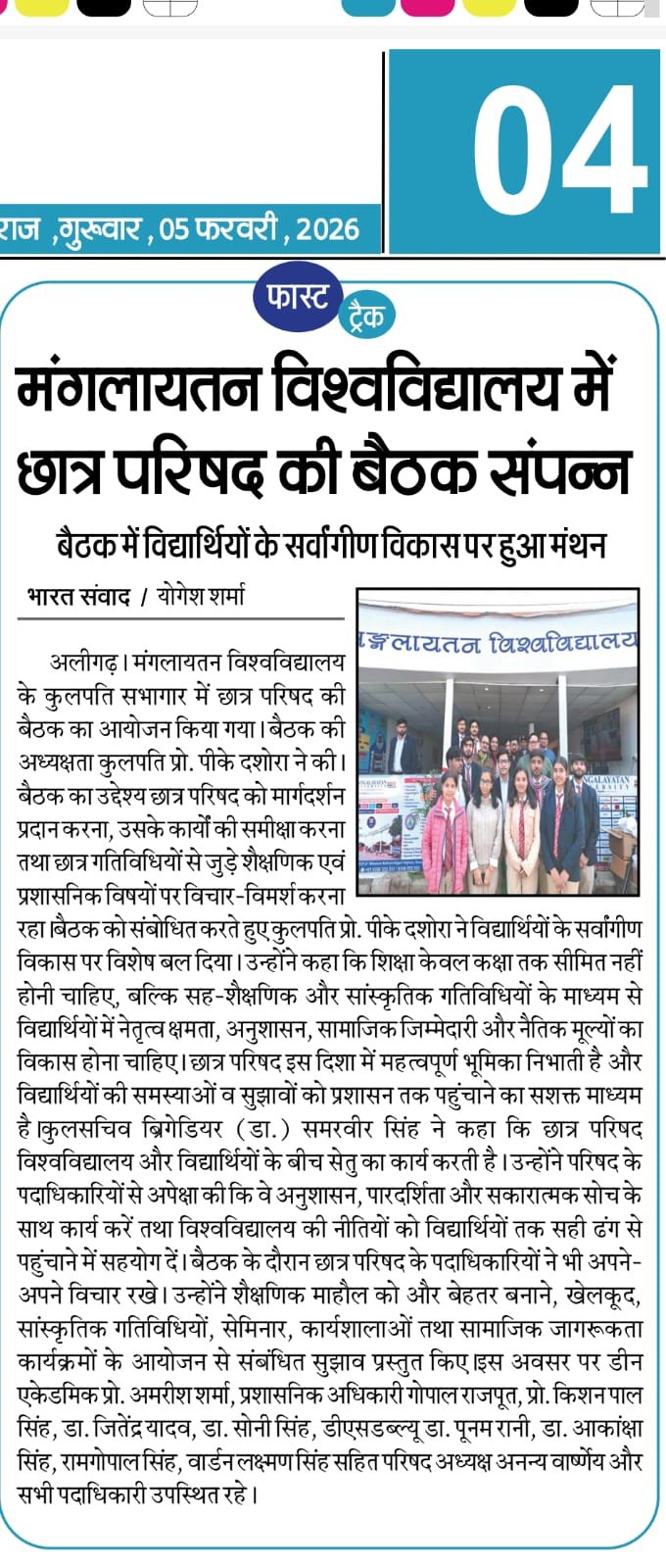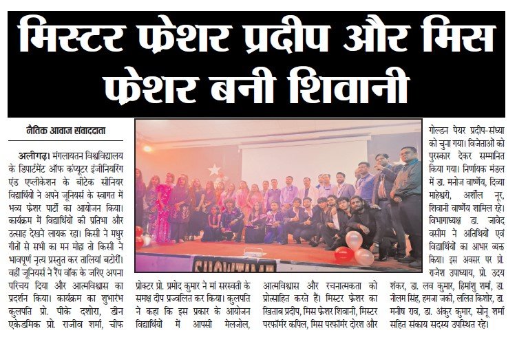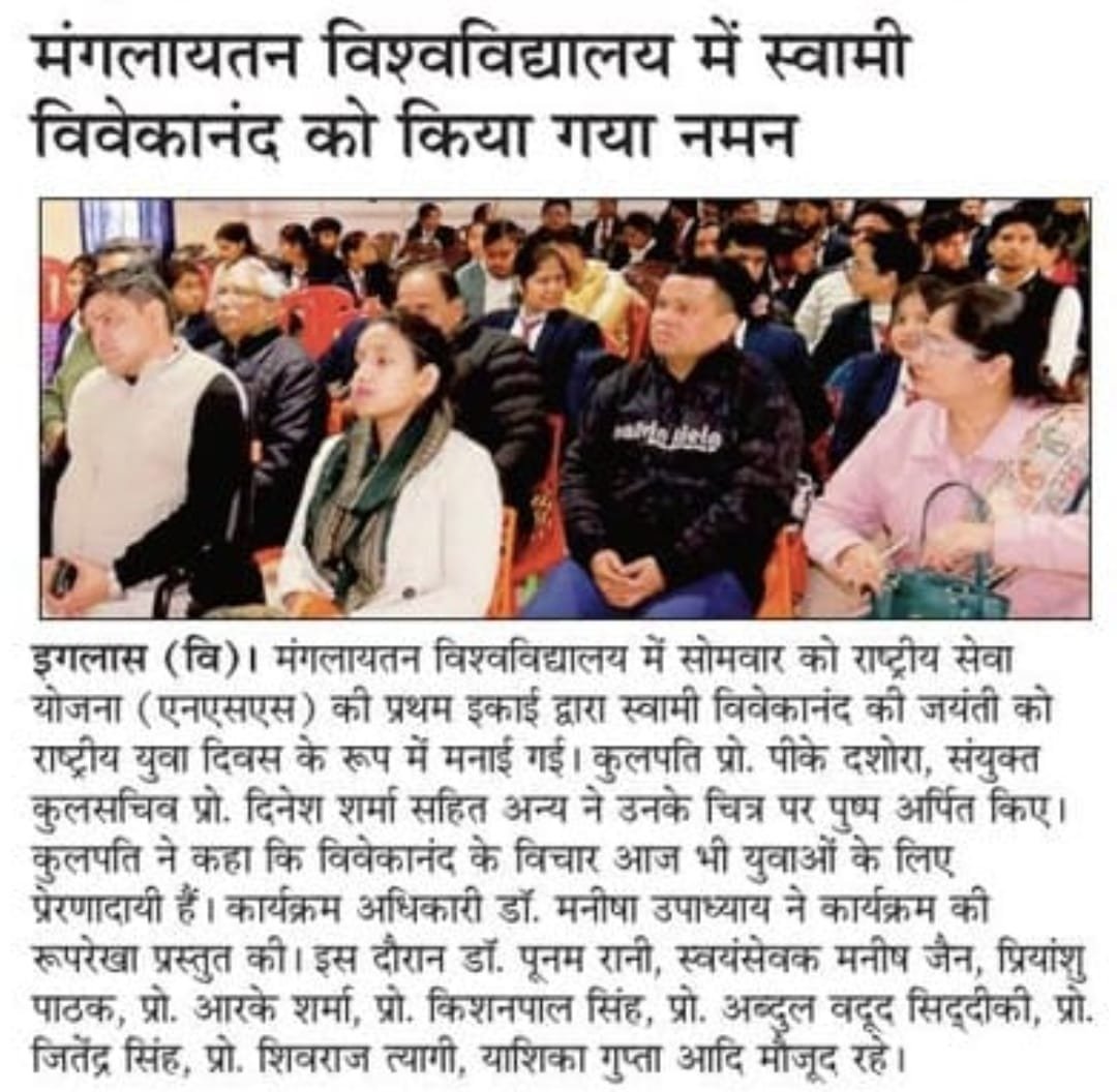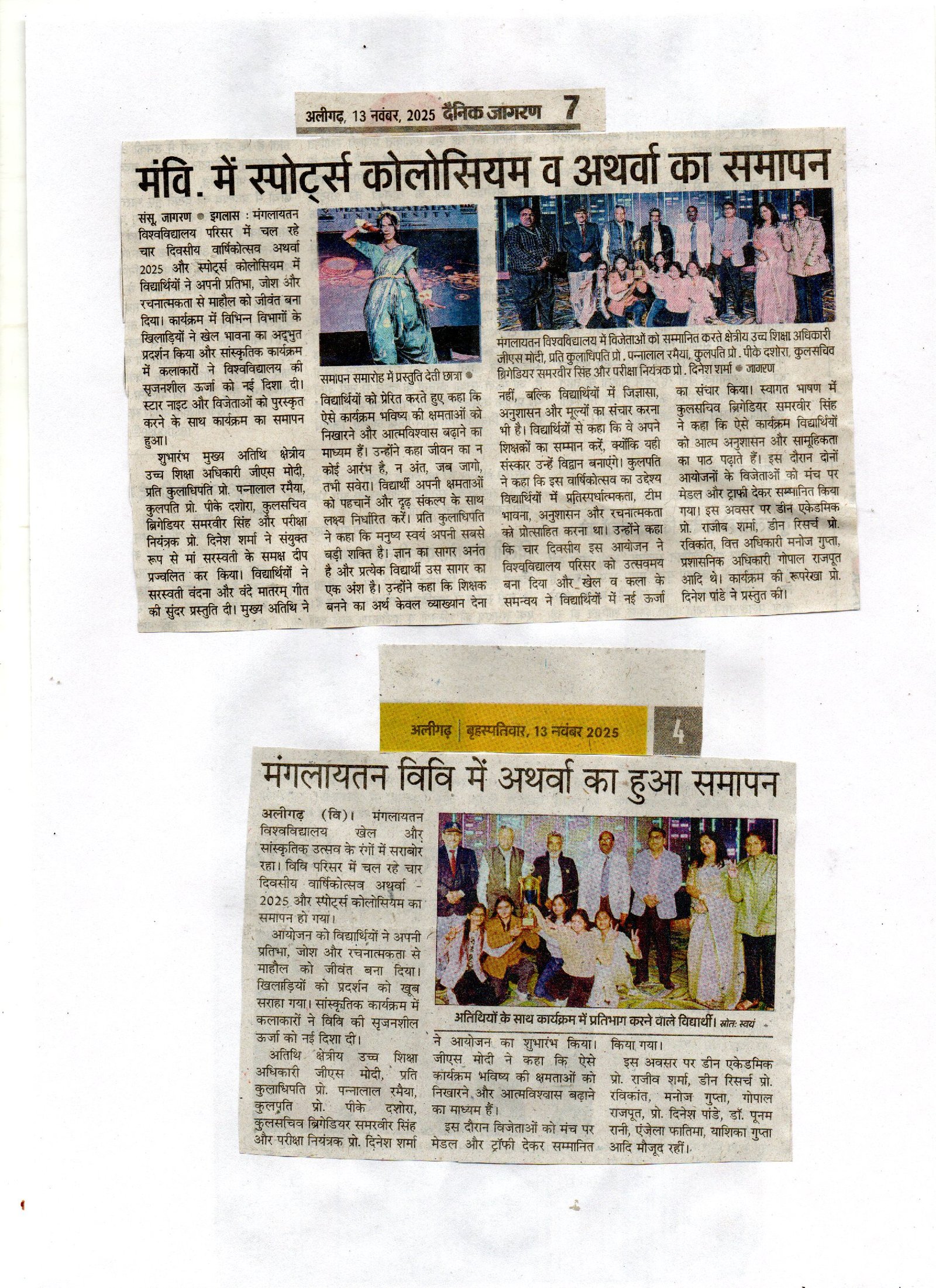 Mangalayatan University garnered significant attention in media with a feature highlighting departmental programs, community initiatives and activities. The article praised the university's commitment to academic excellence and its role in empowering academic units and their students through various skill development workshops and internships. Notably, the piece discussed the institution's efforts in promoting sustainable practices on campus, including eco-friendly initiatives that resonate with the university's mission to foster responsible citizens.This press clipping not only reflects the university's achievements but also its dedication to creating a vibrant learning environment, positioning Mangalayatan University as a cornerstone of educational development in the region. The coverage has sparked interest among prospective students and parents alike.