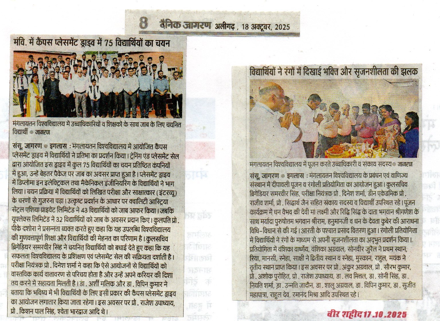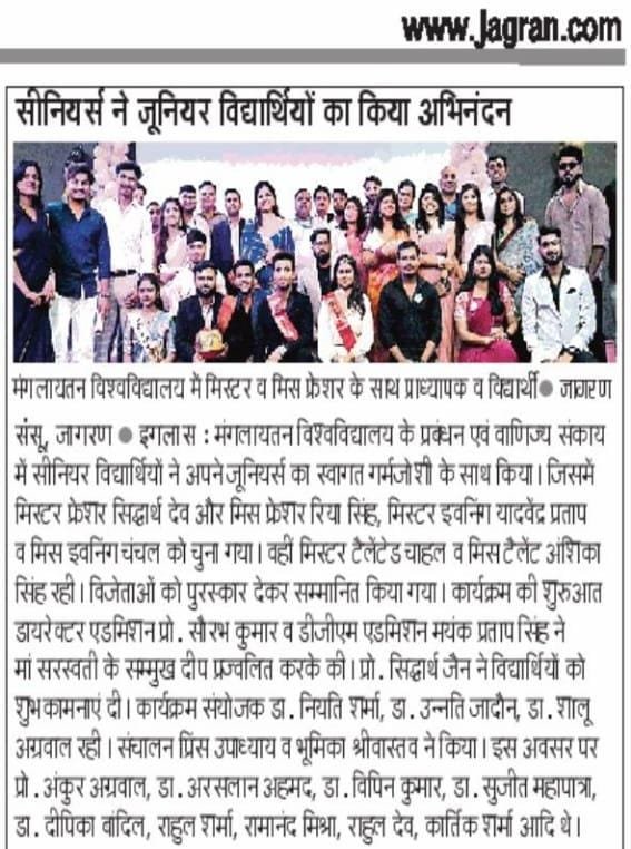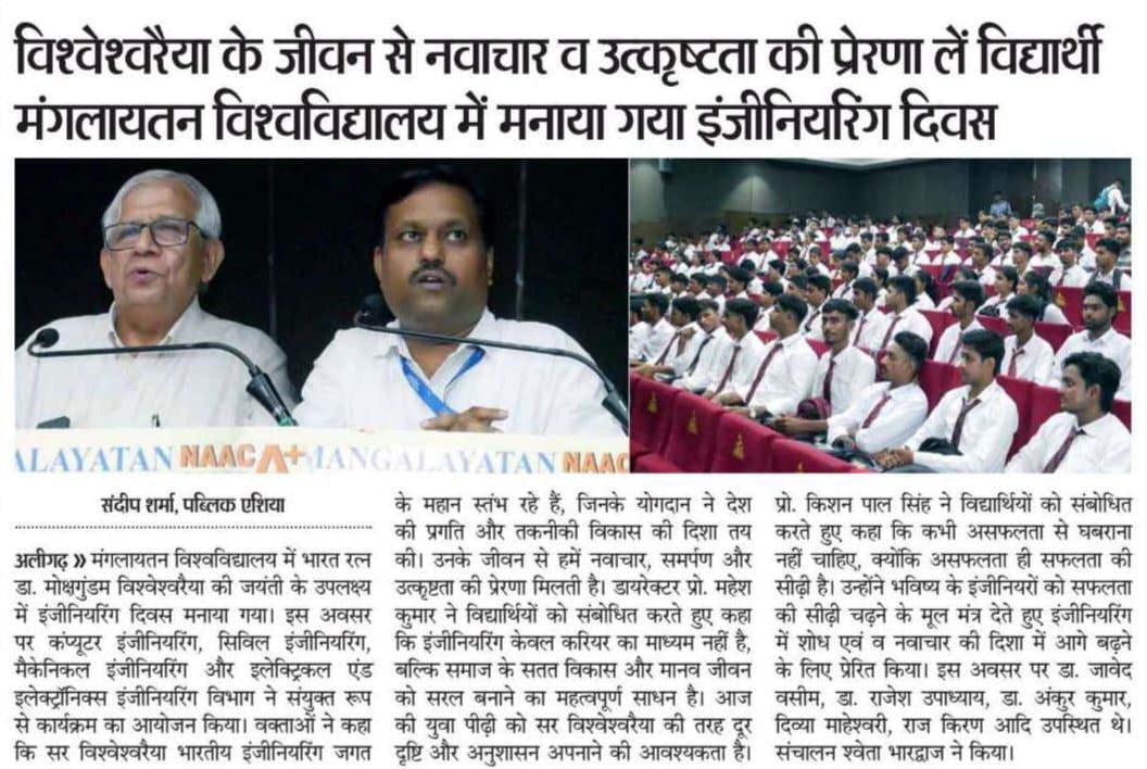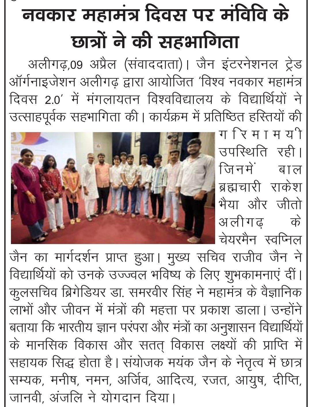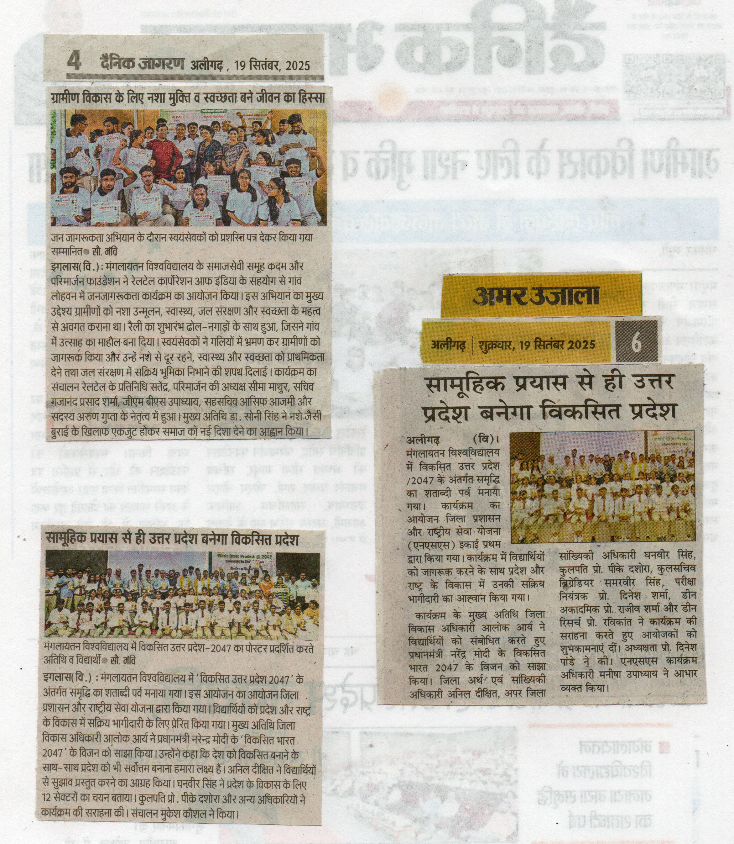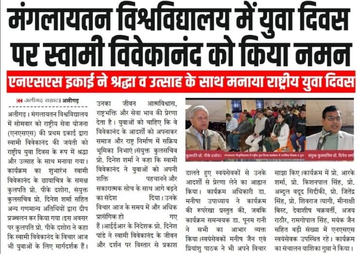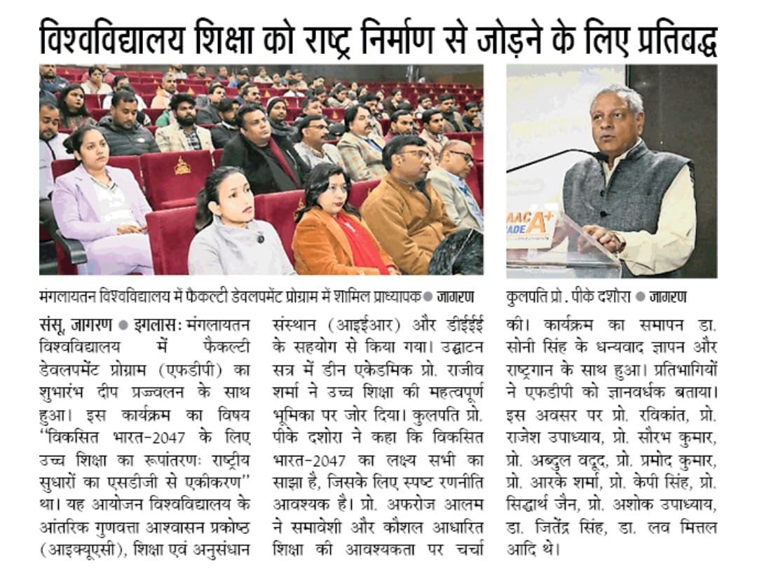 Mangalayatan University garnered significant attention in media with a feature highlighting departmental programs, community initiatives and activities. The article praised the university's commitment to academic excellence and its role in empowering academic units and their students through various skill development workshops and internships. Notably, the piece discussed the institution's efforts in promoting sustainable practices on campus, including eco-friendly initiatives that resonate with the university's mission to foster responsible citizens.This press clipping not only reflects the university's achievements but also its dedication to creating a vibrant learning environment, positioning Mangalayatan University as a cornerstone of educational development in the region. The coverage has sparked interest among prospective students and parents alike.