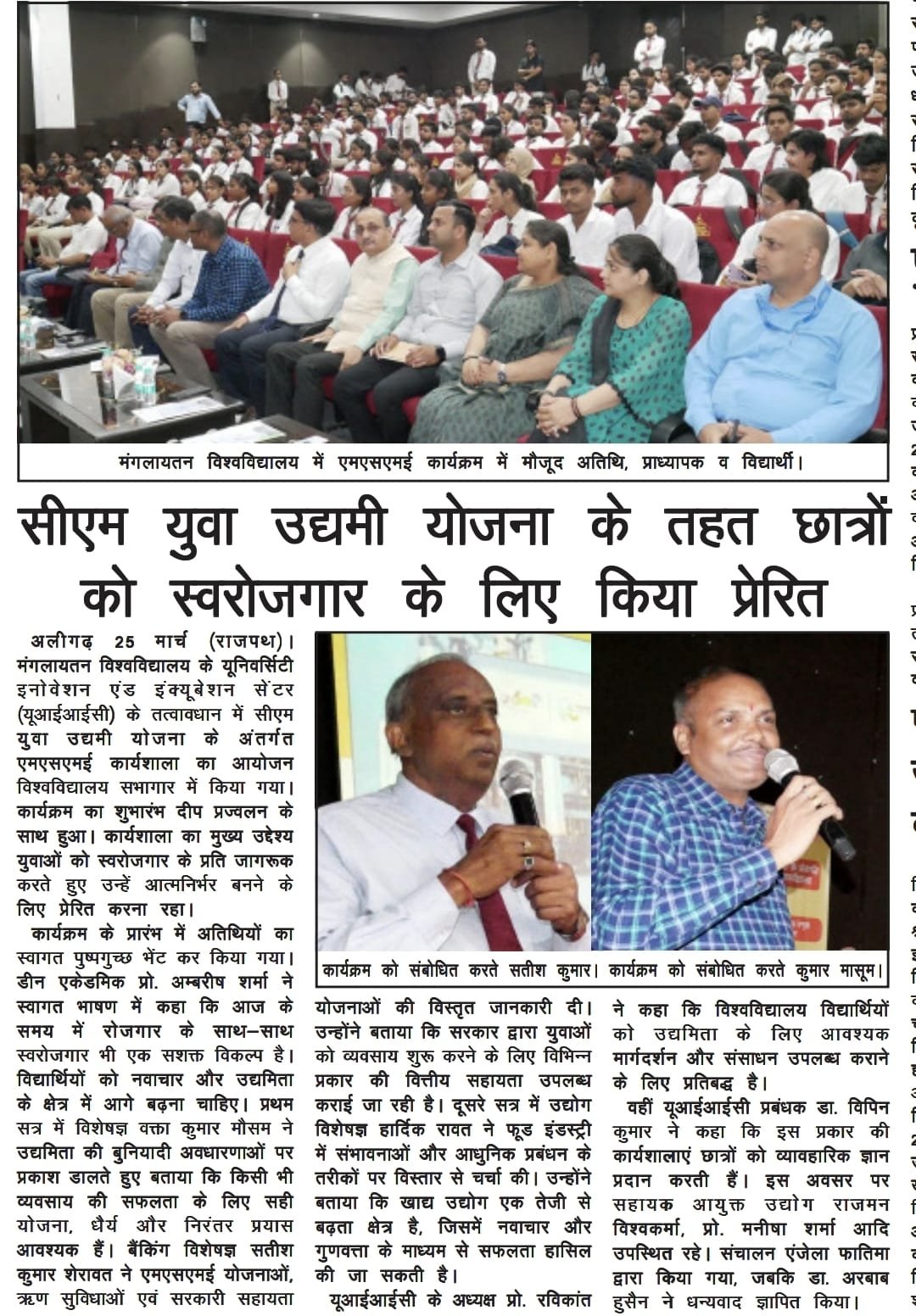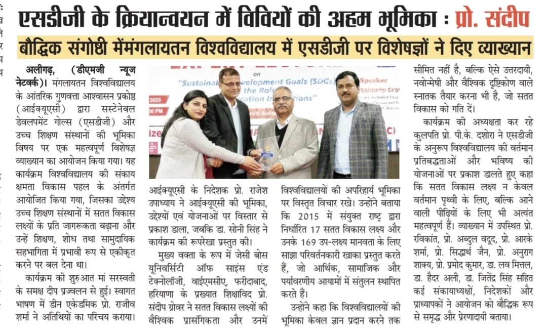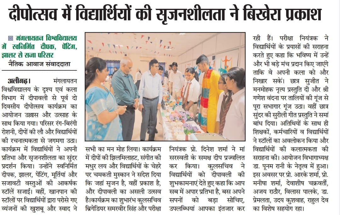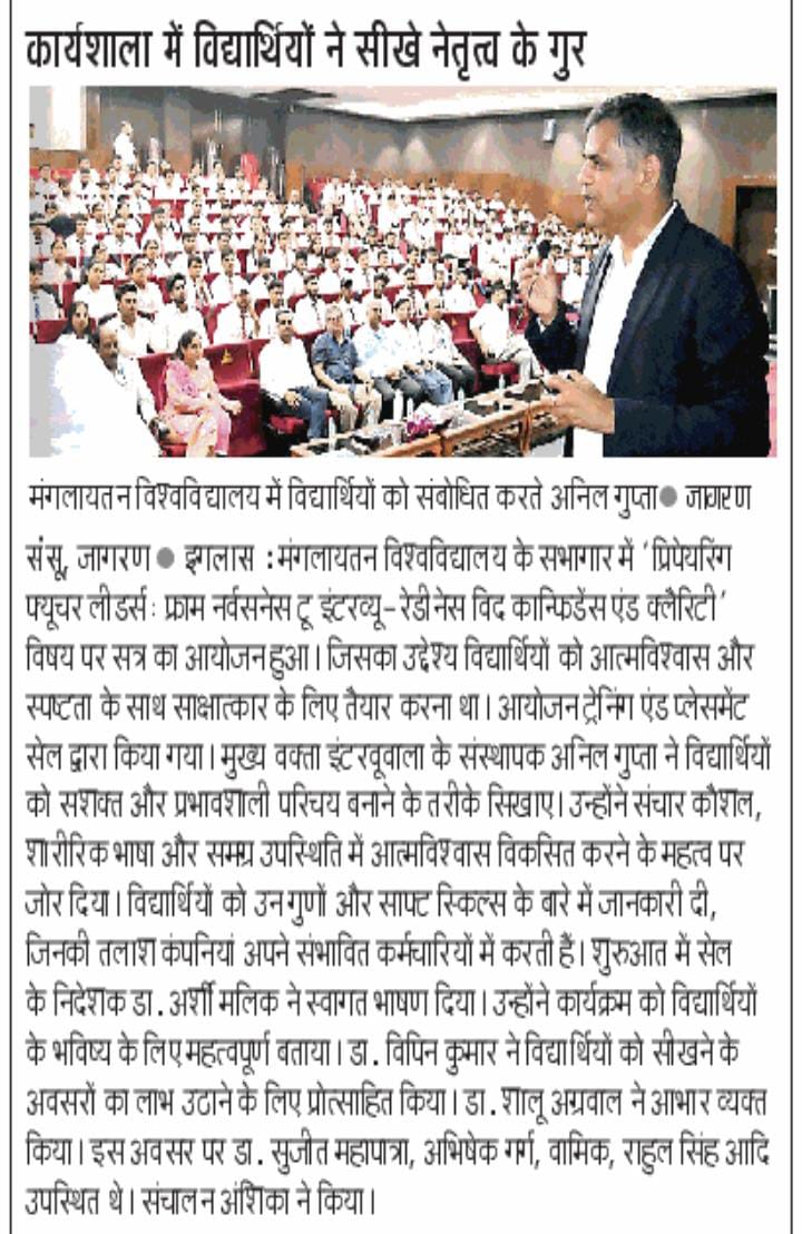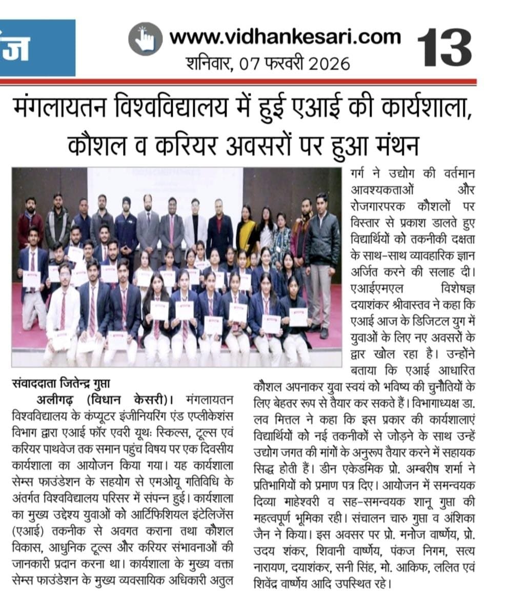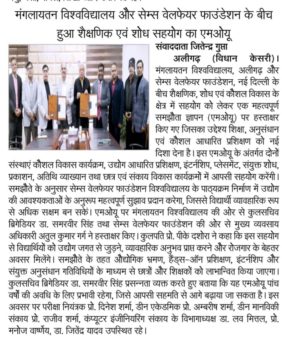 Mangalayatan University garnered significant attention in media with a feature highlighting departmental programs, community initiatives and activities. The article praised the university's commitment to academic excellence and its role in empowering academic units and their students through various skill development workshops and internships. Notably, the piece discussed the institution's efforts in promoting sustainable practices on campus, including eco-friendly initiatives that resonate with the university's mission to foster responsible citizens.This press clipping not only reflects the university's achievements but also its dedication to creating a vibrant learning environment, positioning Mangalayatan University as a cornerstone of educational development in the region. The coverage has sparked interest among prospective students and parents alike.