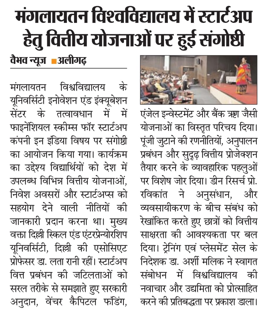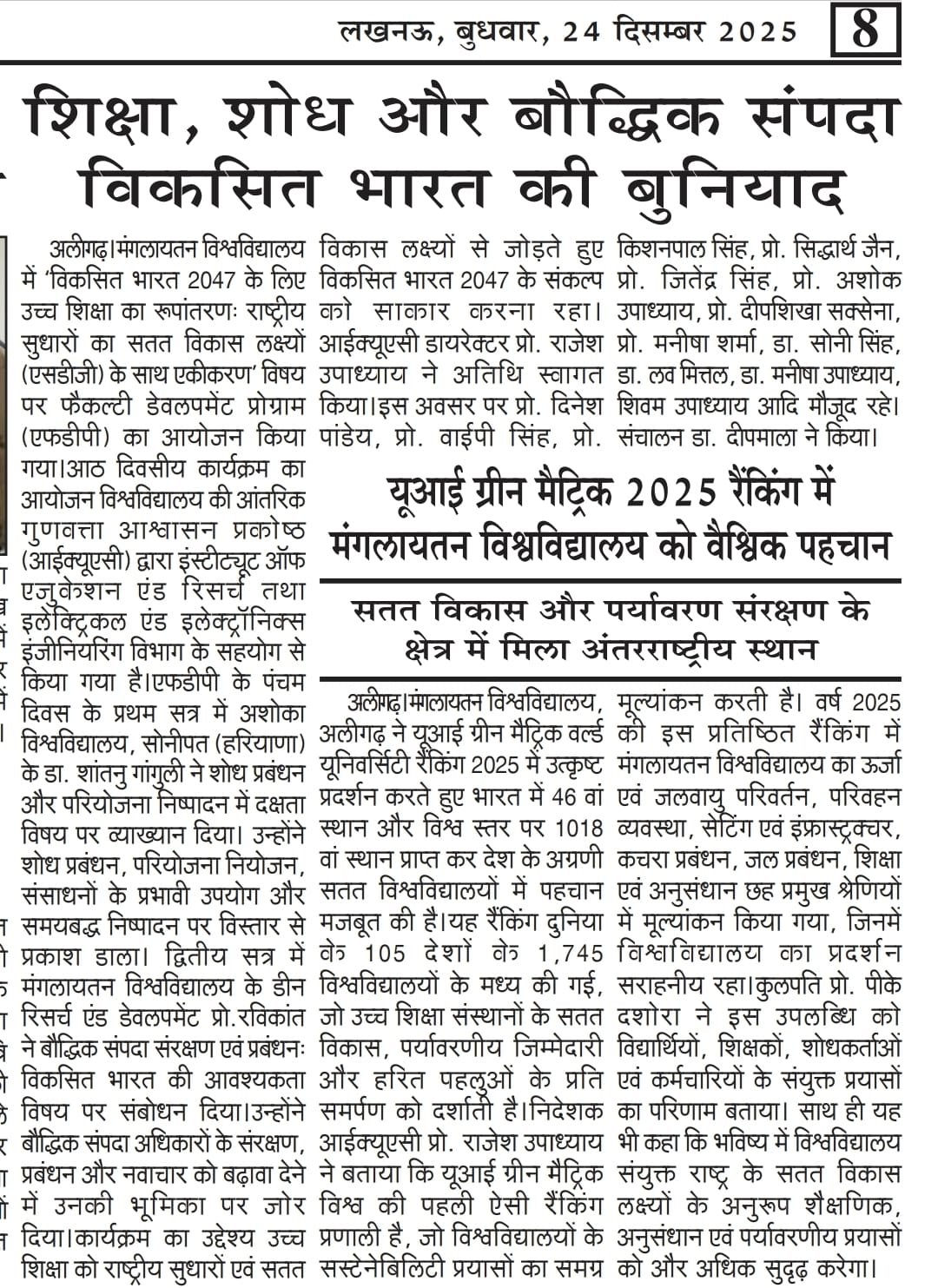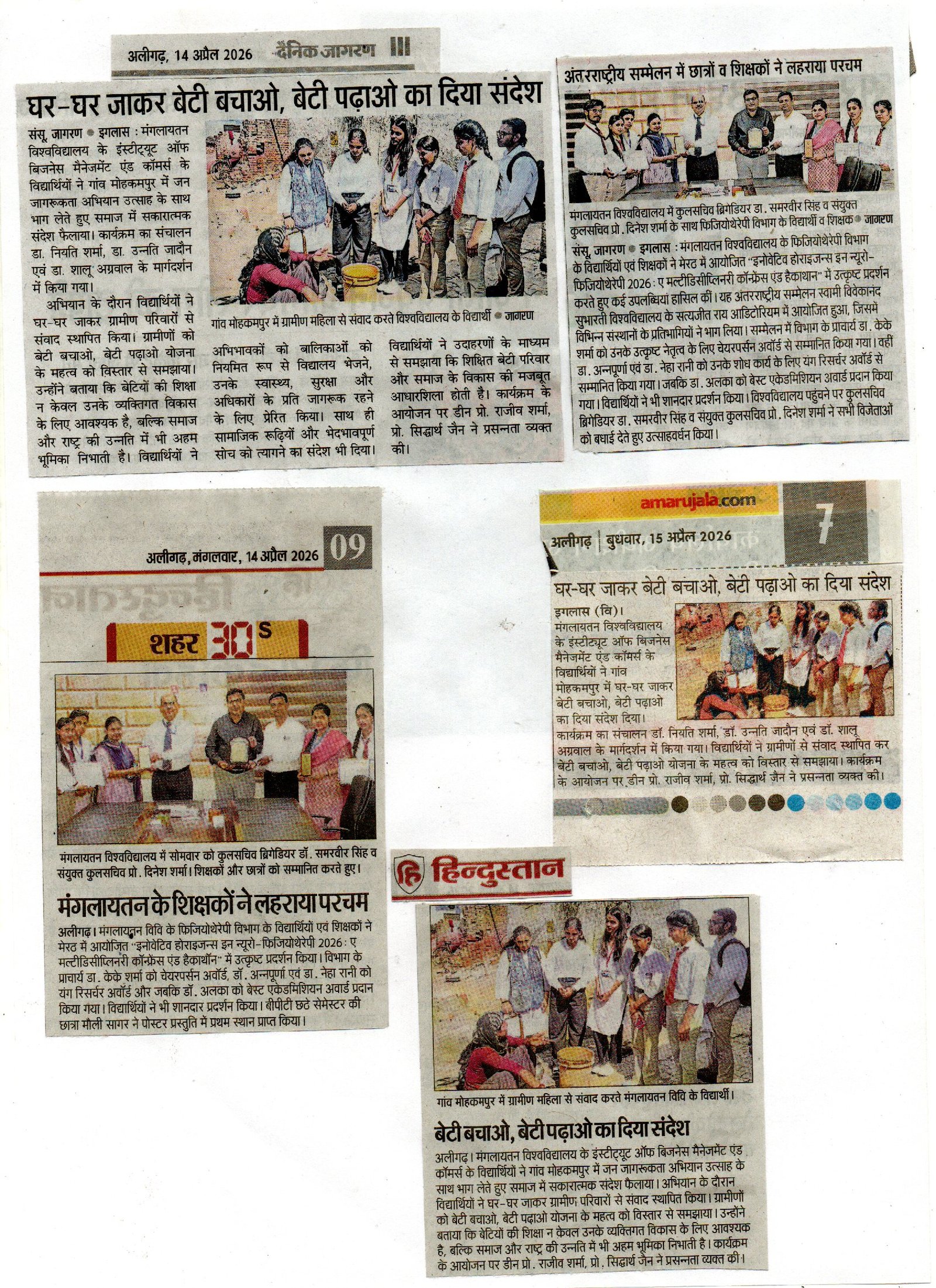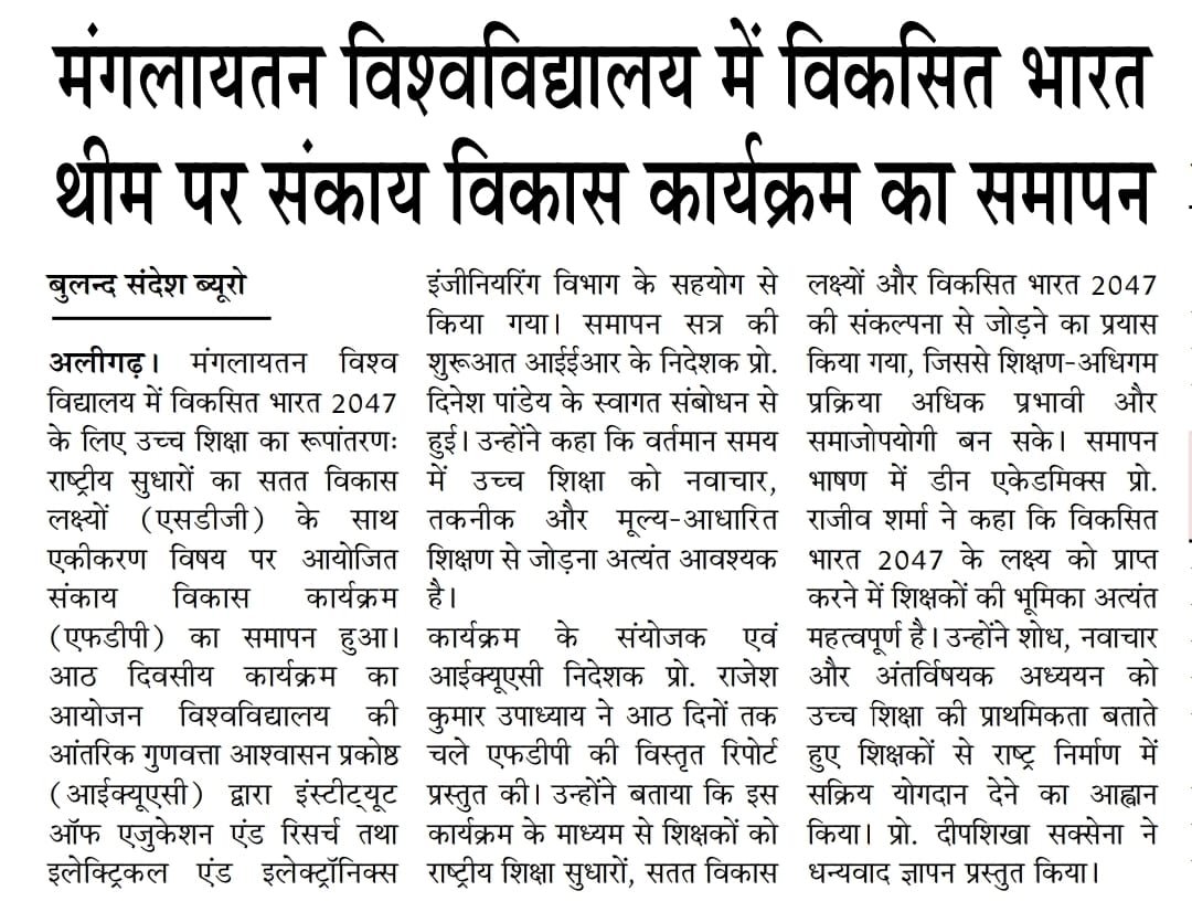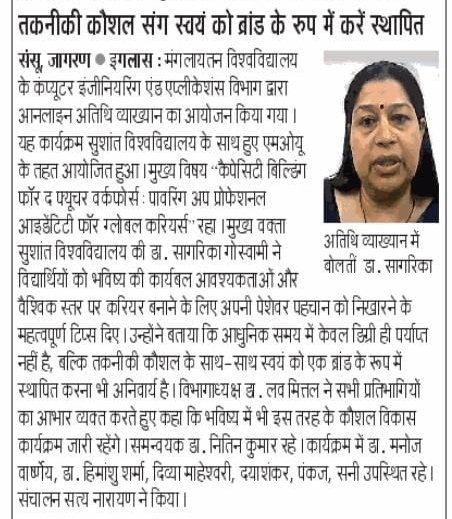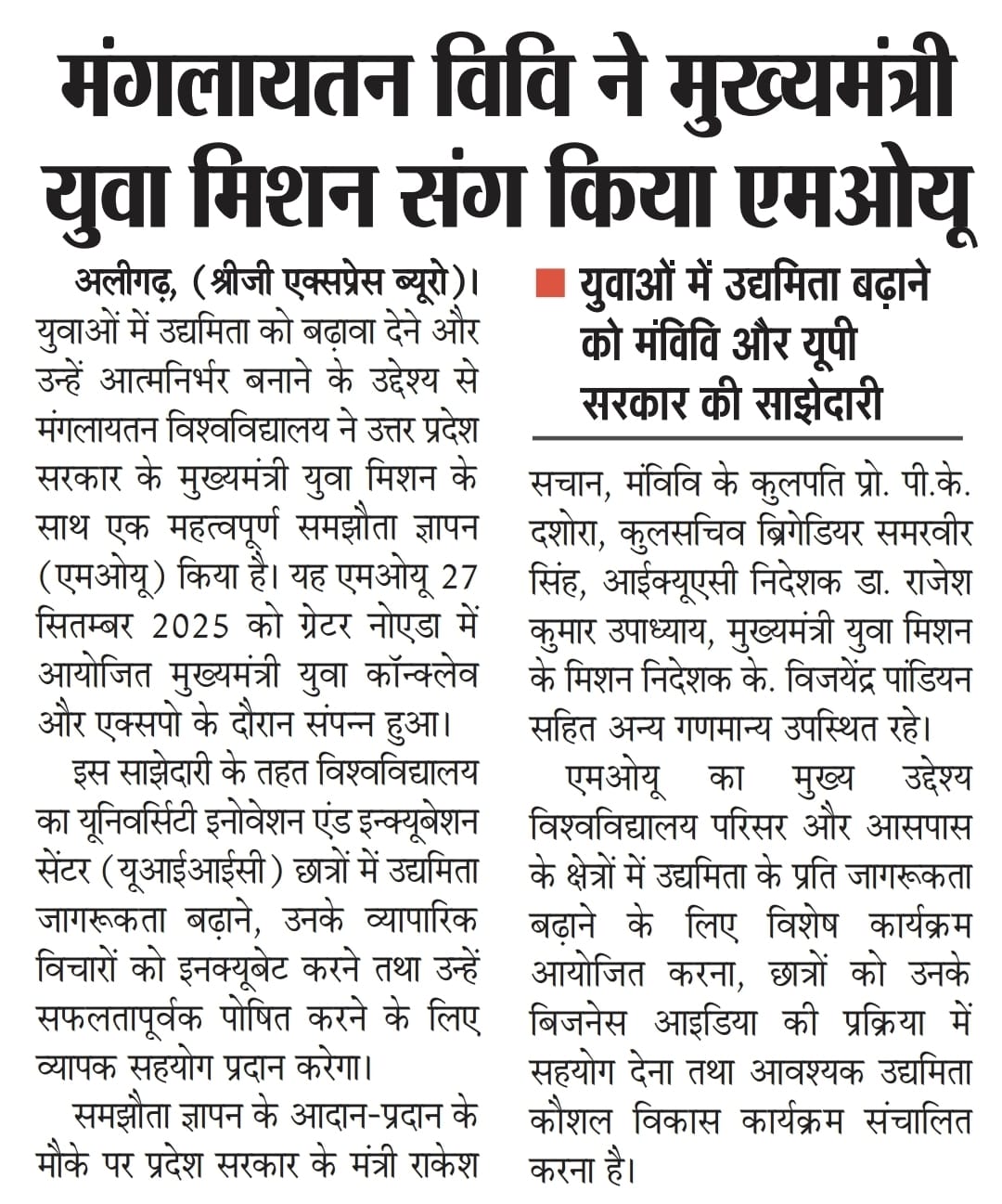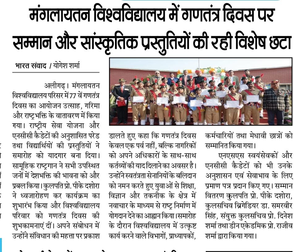 Mangalayatan University garnered significant attention in media with a feature highlighting departmental programs, community initiatives and activities. The article praised the university's commitment to academic excellence and its role in empowering academic units and their students through various skill development workshops and internships. Notably, the piece discussed the institution's efforts in promoting sustainable practices on campus, including eco-friendly initiatives that resonate with the university's mission to foster responsible citizens.This press clipping not only reflects the university's achievements but also its dedication to creating a vibrant learning environment, positioning Mangalayatan University as a cornerstone of educational development in the region. The coverage has sparked interest among prospective students and parents alike.