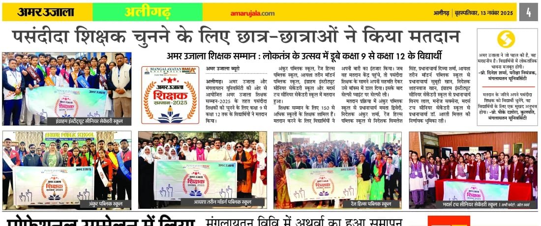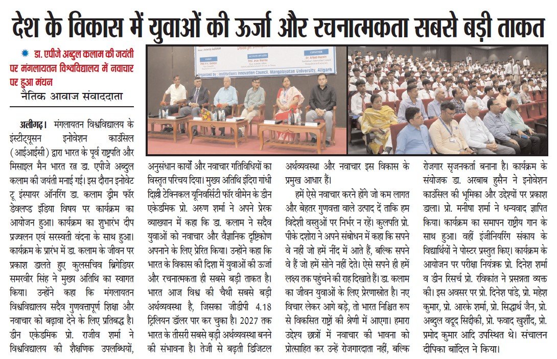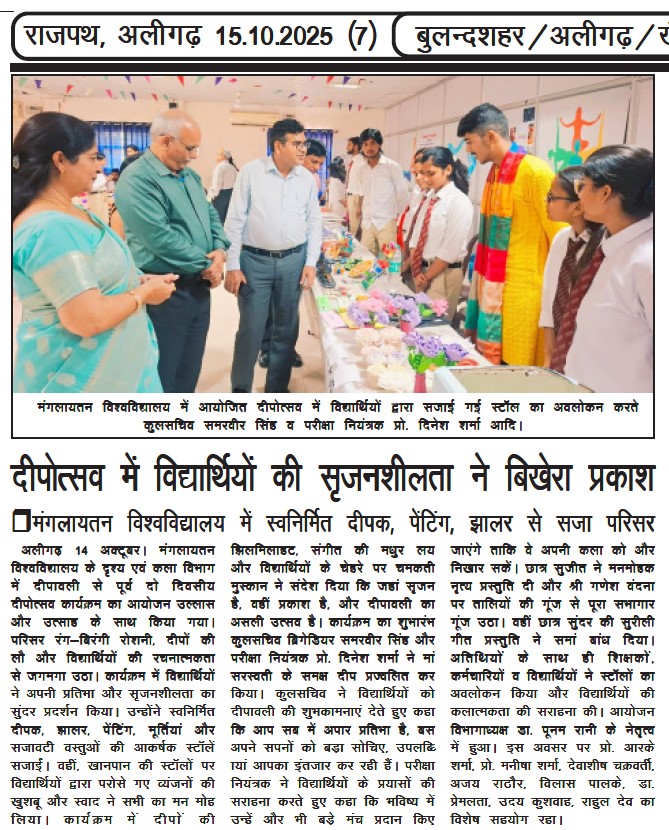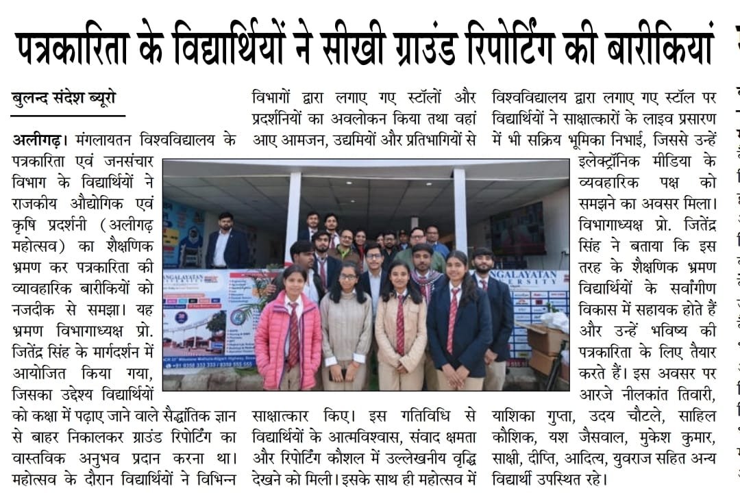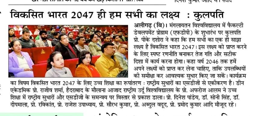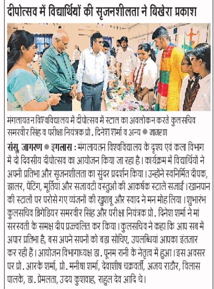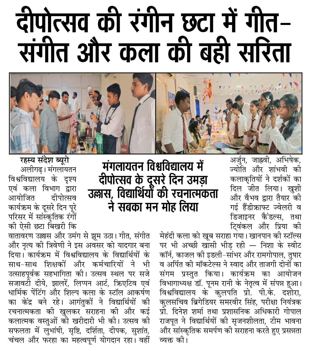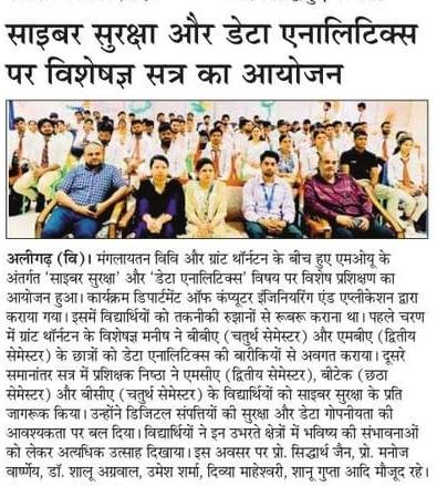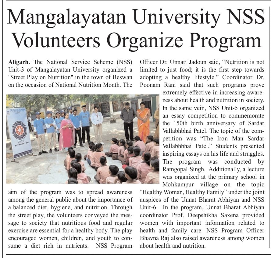 Mangalayatan University garnered significant attention in media with a feature highlighting departmental programs, community initiatives and activities. The article praised the university's commitment to academic excellence and its role in empowering academic units and their students through various skill development workshops and internships. Notably, the piece discussed the institution's efforts in promoting sustainable practices on campus, including eco-friendly initiatives that resonate with the university's mission to foster responsible citizens.This press clipping not only reflects the university's achievements but also its dedication to creating a vibrant learning environment, positioning Mangalayatan University as a cornerstone of educational development in the region. The coverage has sparked interest among prospective students and parents alike.