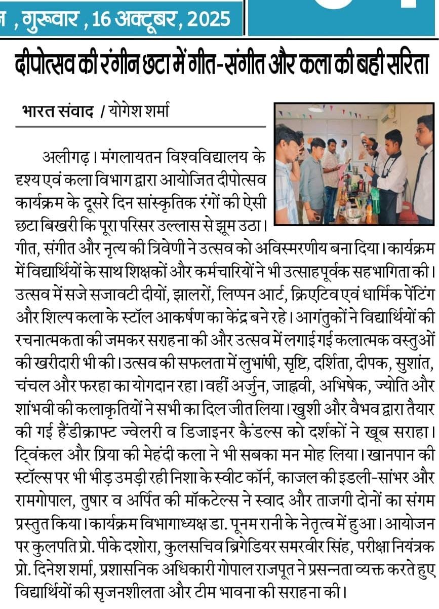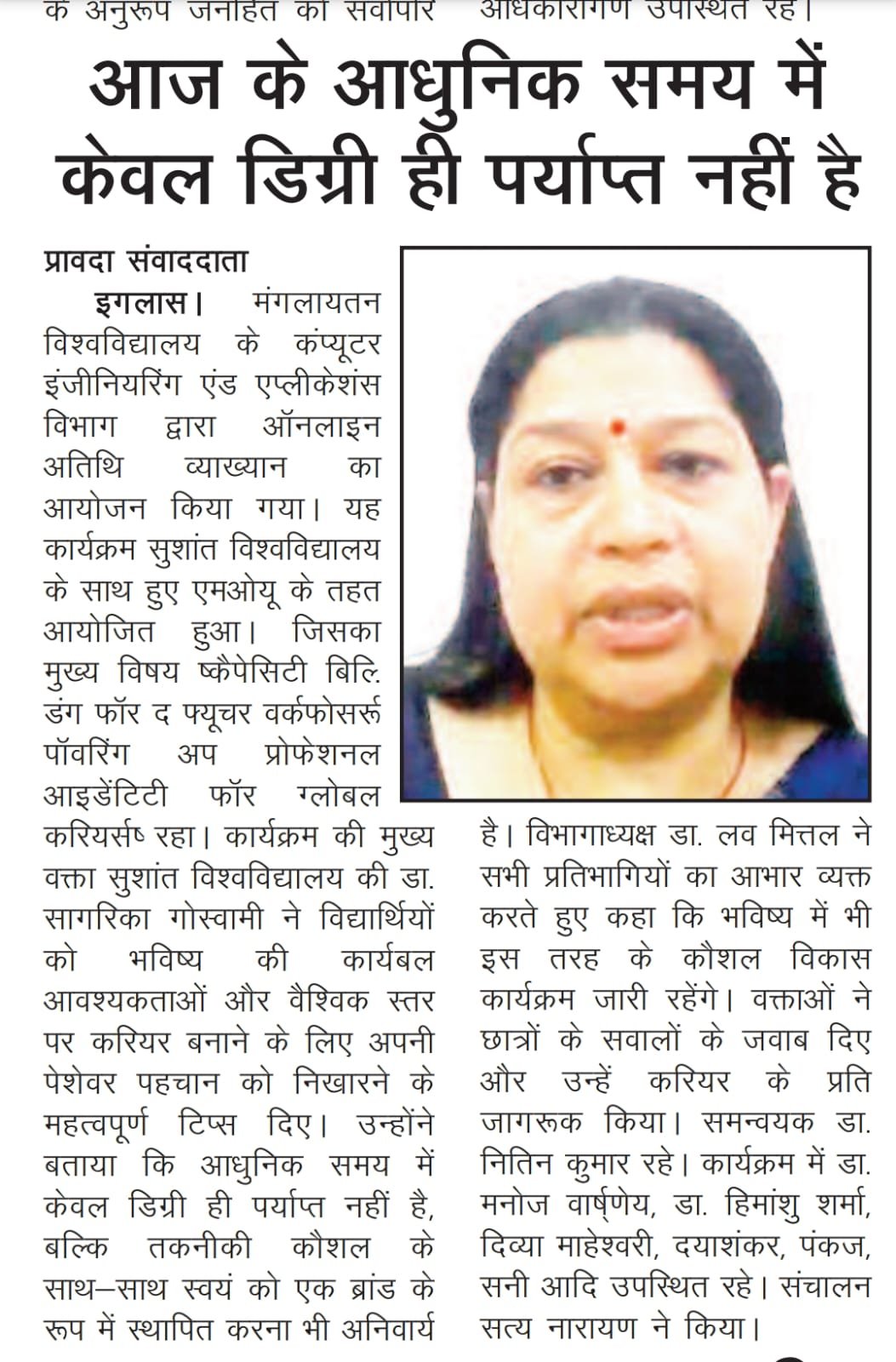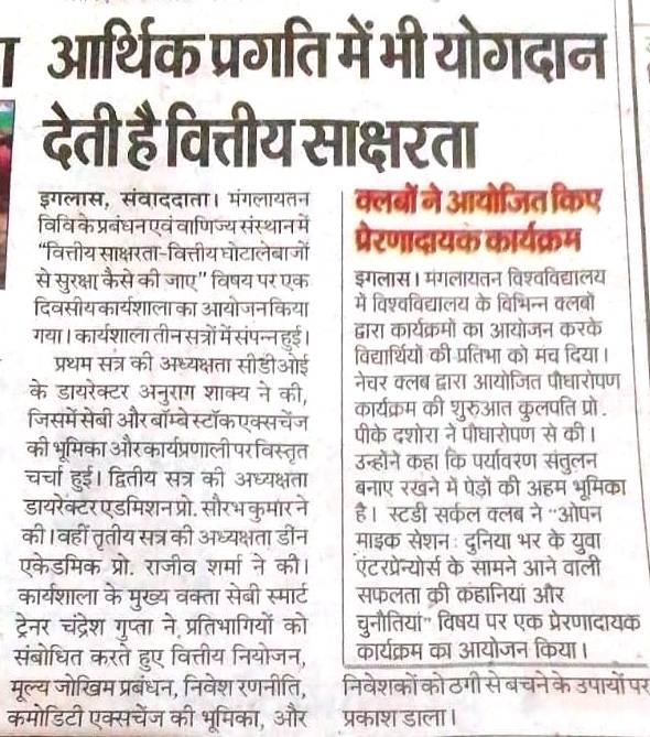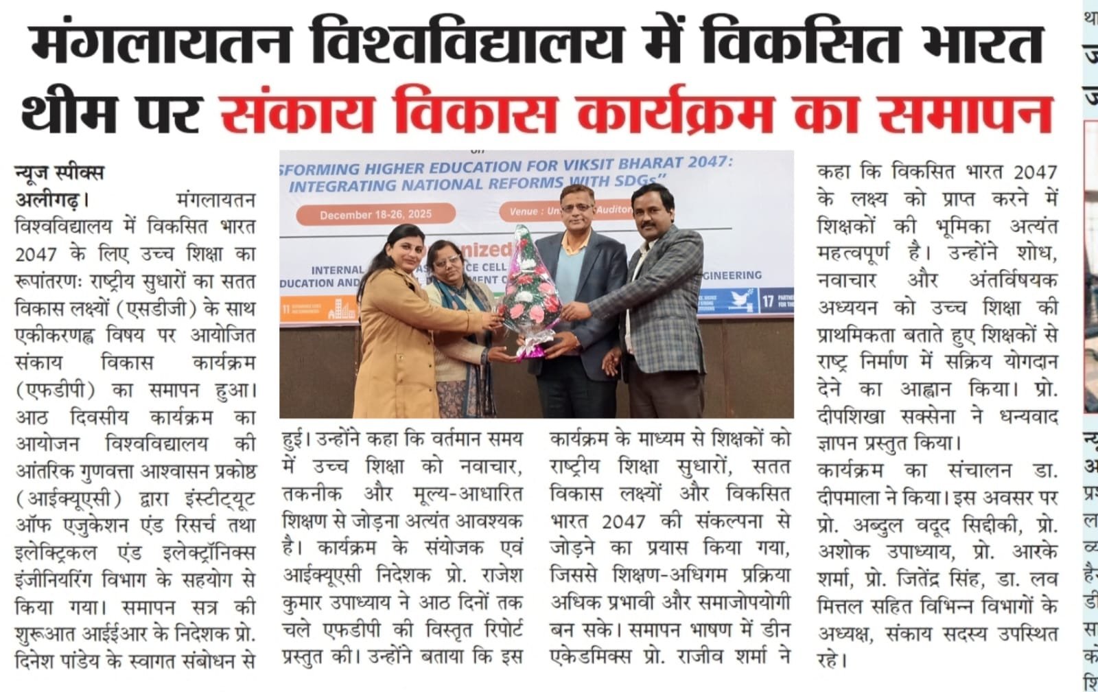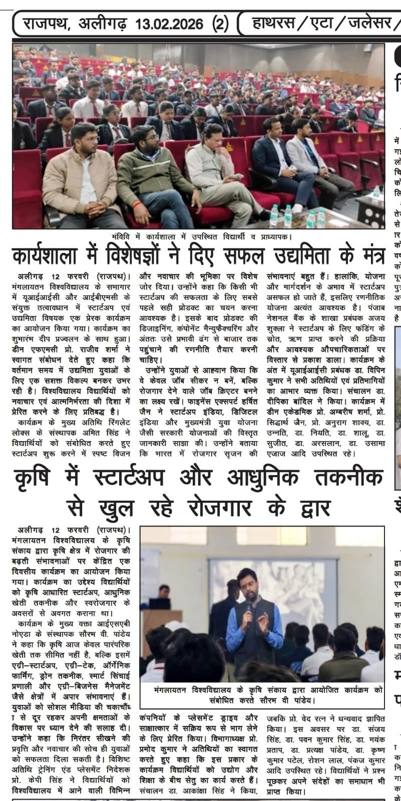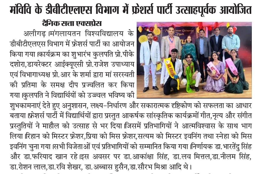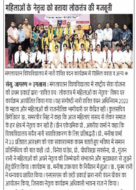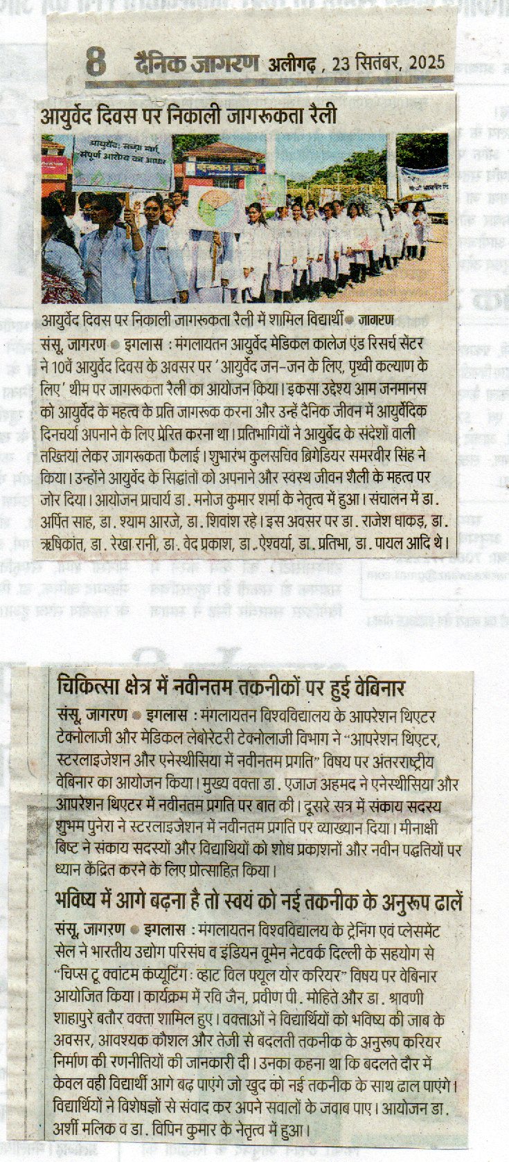 Mangalayatan University garnered significant attention in media with a feature highlighting departmental programs, community initiatives and activities. The article praised the university's commitment to academic excellence and its role in empowering academic units and their students through various skill development workshops and internships. Notably, the piece discussed the institution's efforts in promoting sustainable practices on campus, including eco-friendly initiatives that resonate with the university's mission to foster responsible citizens.This press clipping not only reflects the university's achievements but also its dedication to creating a vibrant learning environment, positioning Mangalayatan University as a cornerstone of educational development in the region. The coverage has sparked interest among prospective students and parents alike.