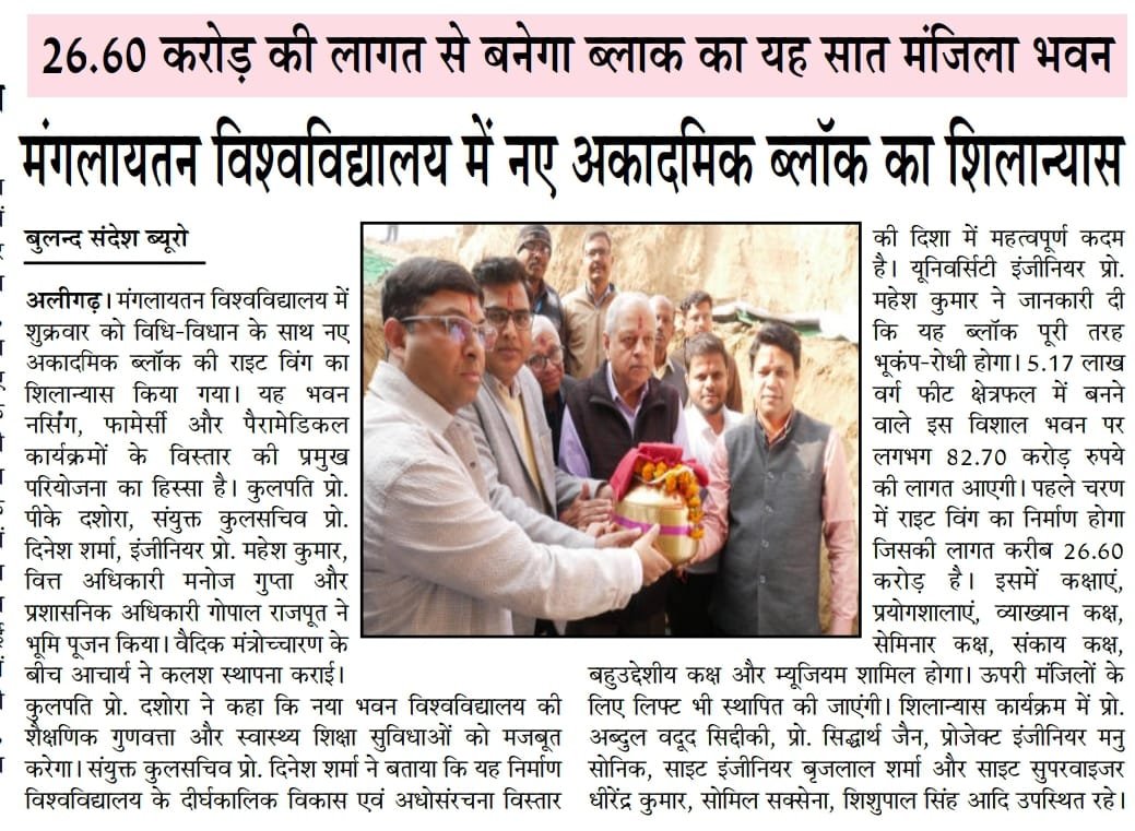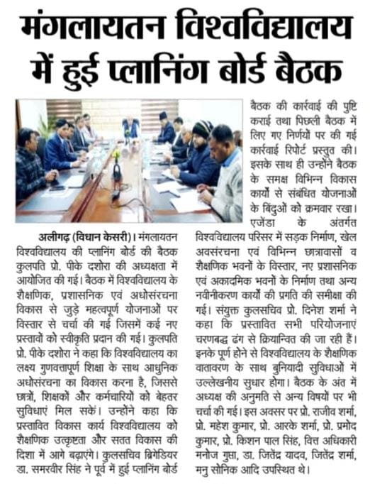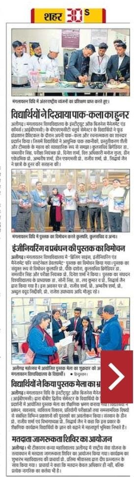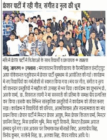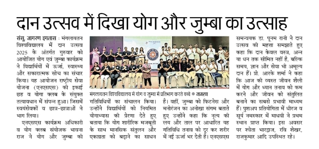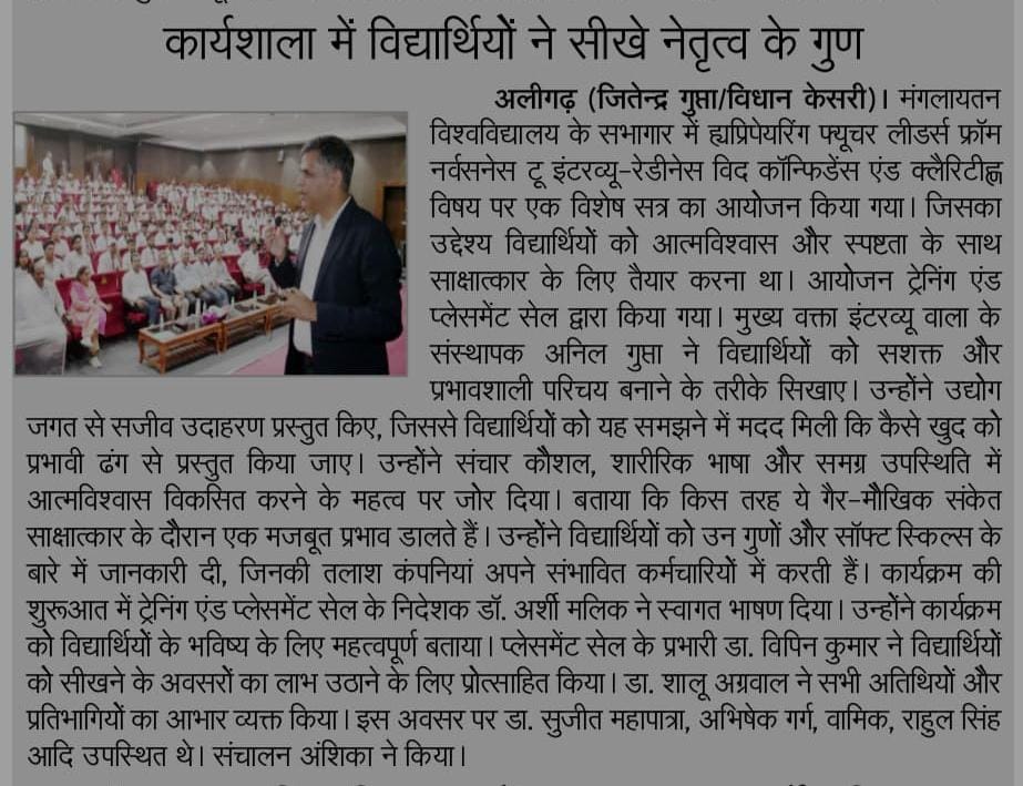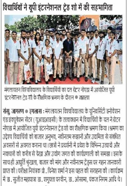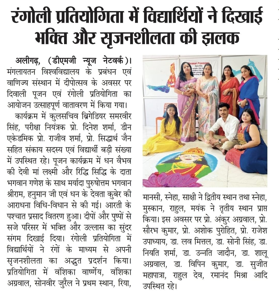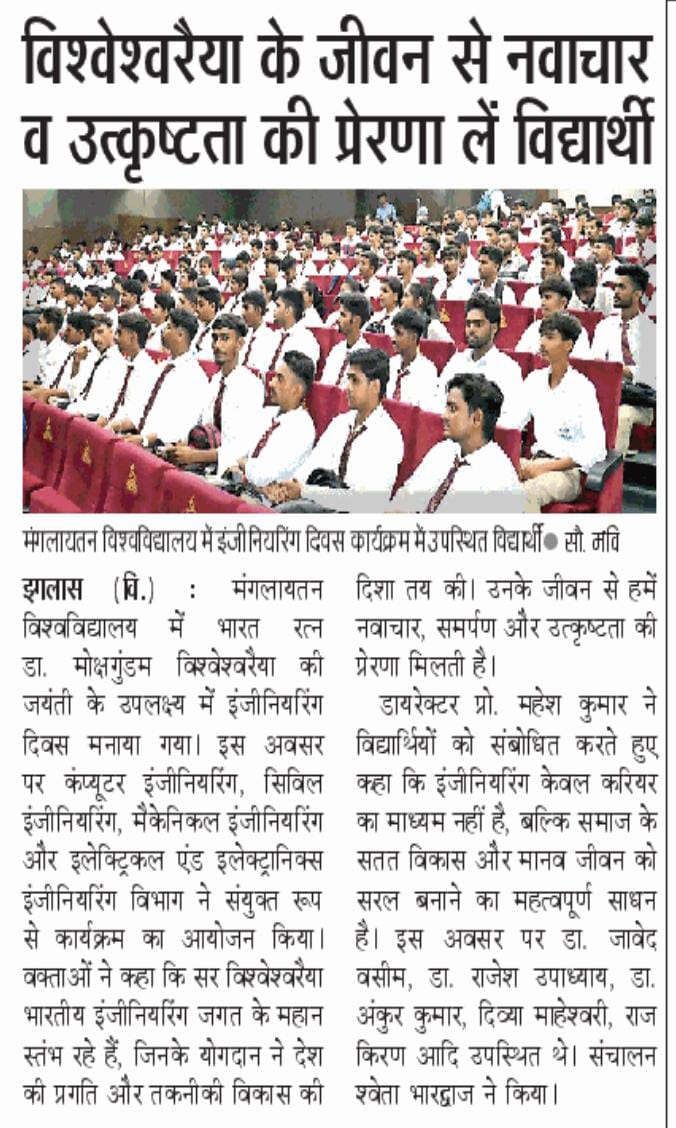 Mangalayatan University garnered significant attention in media with a feature highlighting departmental programs, community initiatives and activities. The article praised the university's commitment to academic excellence and its role in empowering academic units and their students through various skill development workshops and internships. Notably, the piece discussed the institution's efforts in promoting sustainable practices on campus, including eco-friendly initiatives that resonate with the university's mission to foster responsible citizens.This press clipping not only reflects the university's achievements but also its dedication to creating a vibrant learning environment, positioning Mangalayatan University as a cornerstone of educational development in the region. The coverage has sparked interest among prospective students and parents alike.