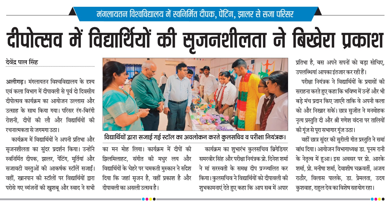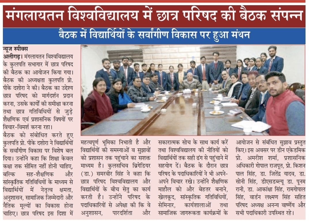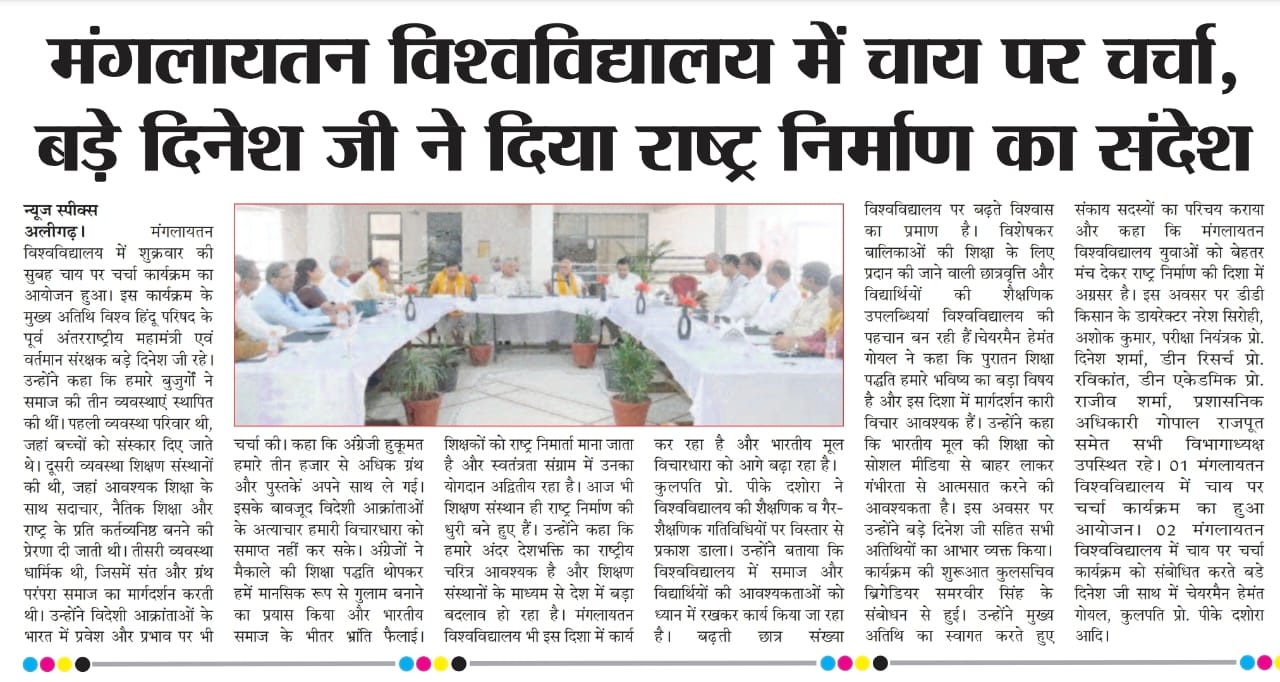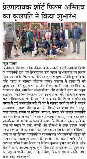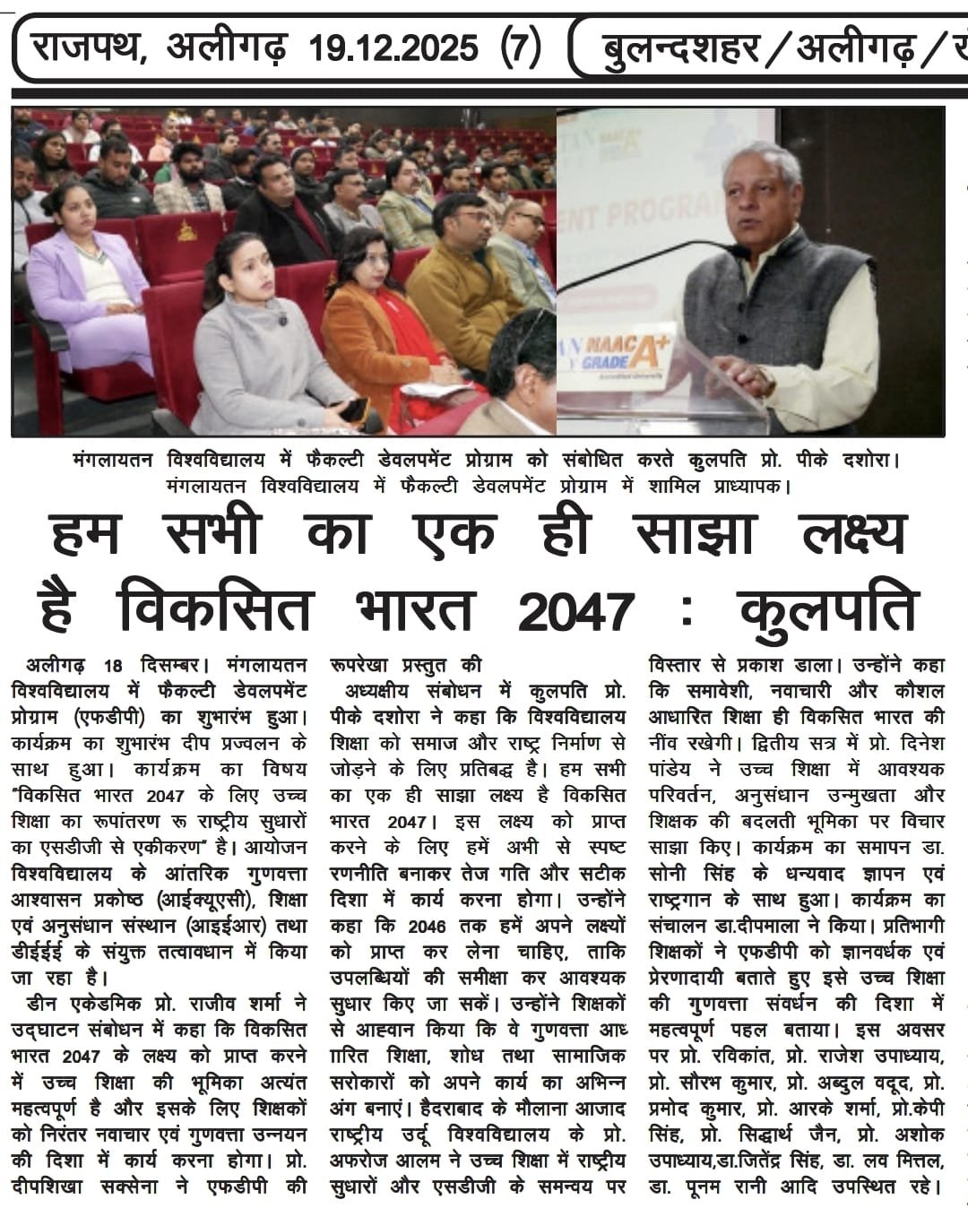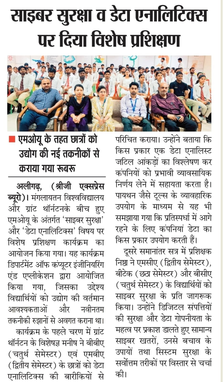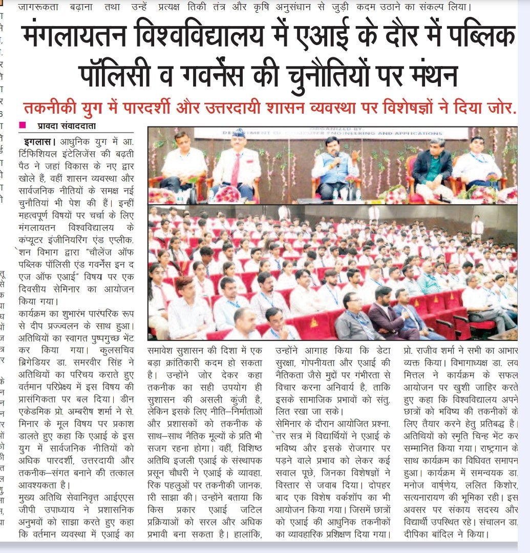 Mangalayatan University garnered significant attention in media with a feature highlighting departmental programs, community initiatives and activities. The article praised the university's commitment to academic excellence and its role in empowering academic units and their students through various skill development workshops and internships. Notably, the piece discussed the institution's efforts in promoting sustainable practices on campus, including eco-friendly initiatives that resonate with the university's mission to foster responsible citizens.This press clipping not only reflects the university's achievements but also its dedication to creating a vibrant learning environment, positioning Mangalayatan University as a cornerstone of educational development in the region. The coverage has sparked interest among prospective students and parents alike.
