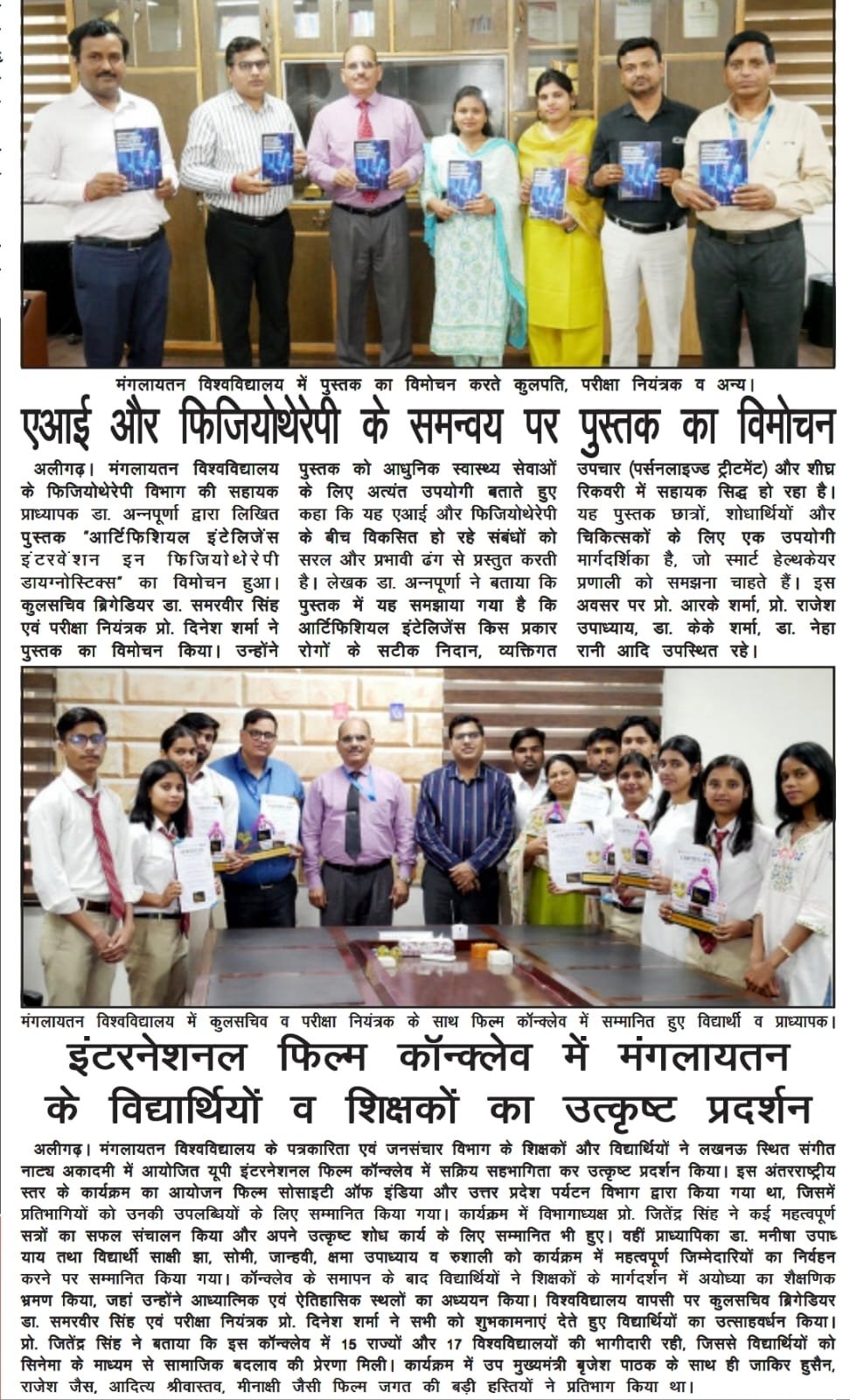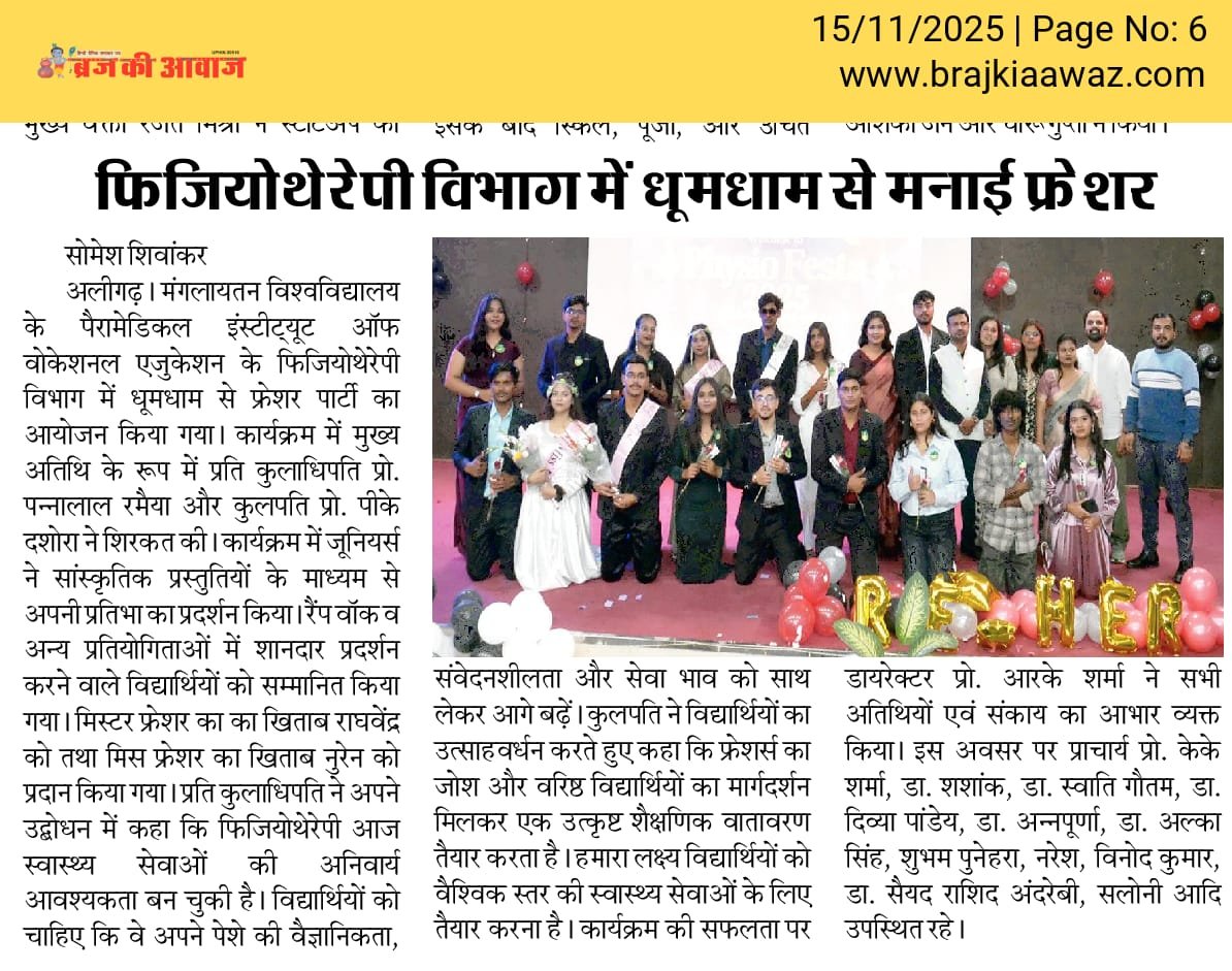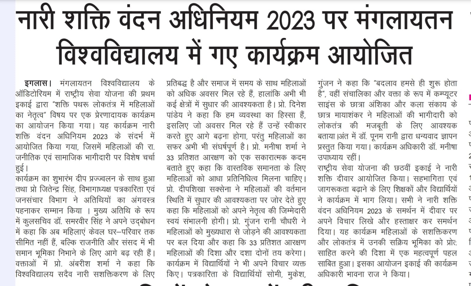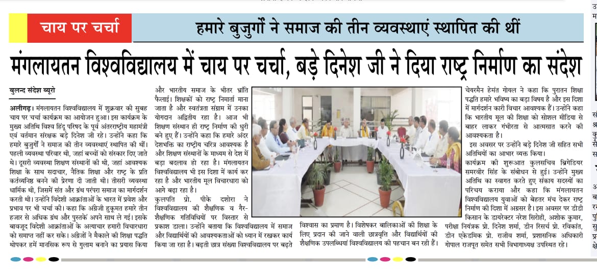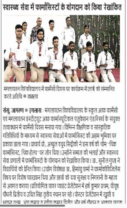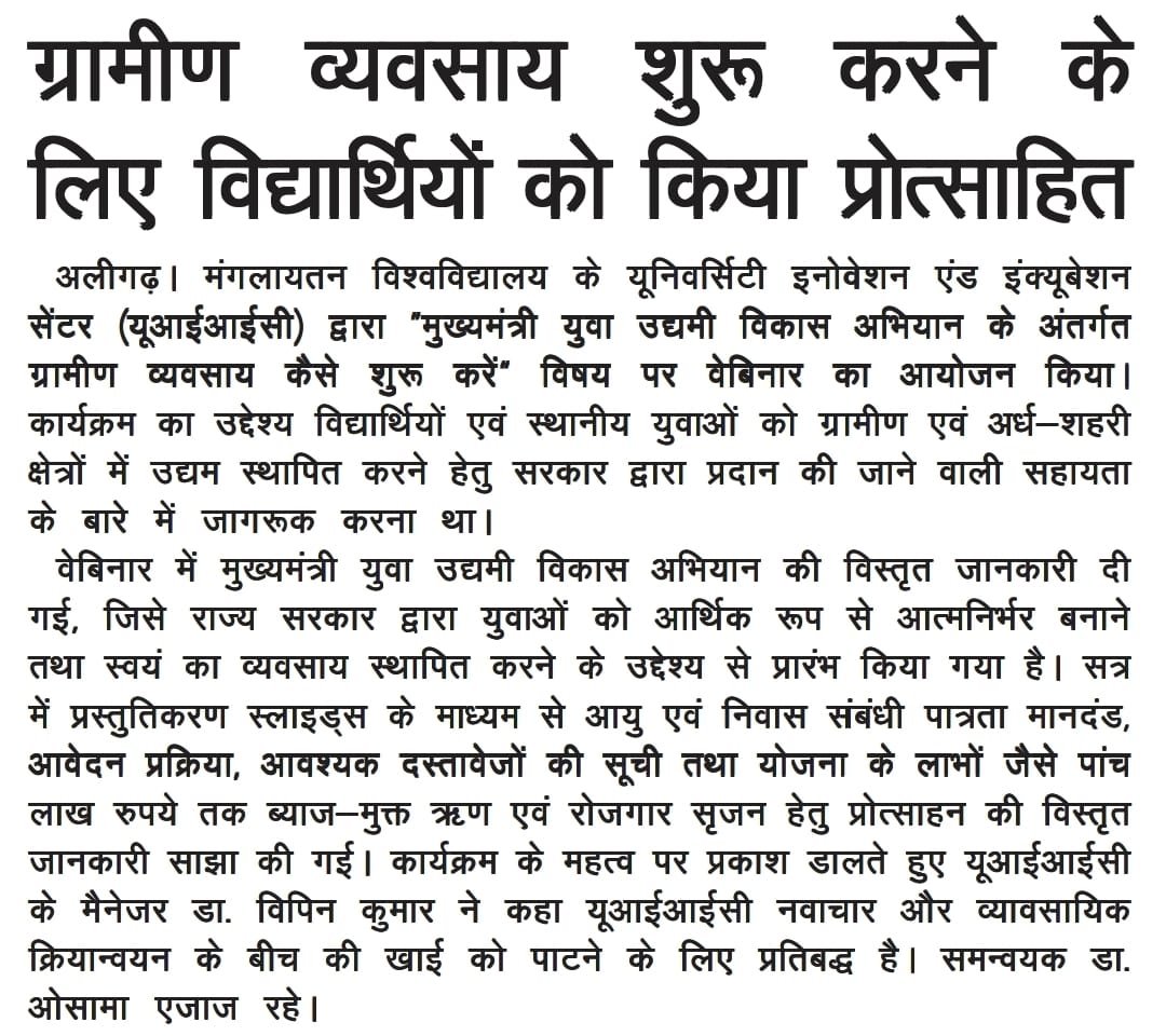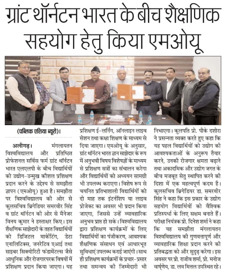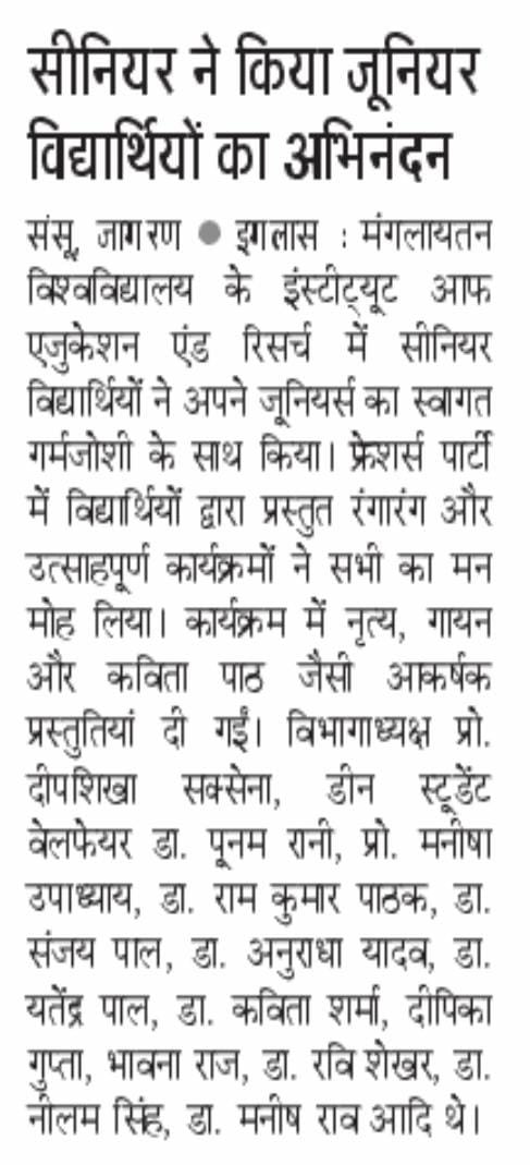 Mangalayatan University garnered significant attention in media with a feature highlighting departmental programs, community initiatives and activities. The article praised the university's commitment to academic excellence and its role in empowering academic units and their students through various skill development workshops and internships. Notably, the piece discussed the institution's efforts in promoting sustainable practices on campus, including eco-friendly initiatives that resonate with the university's mission to foster responsible citizens.This press clipping not only reflects the university's achievements but also its dedication to creating a vibrant learning environment, positioning Mangalayatan University as a cornerstone of educational development in the region. The coverage has sparked interest among prospective students and parents alike.