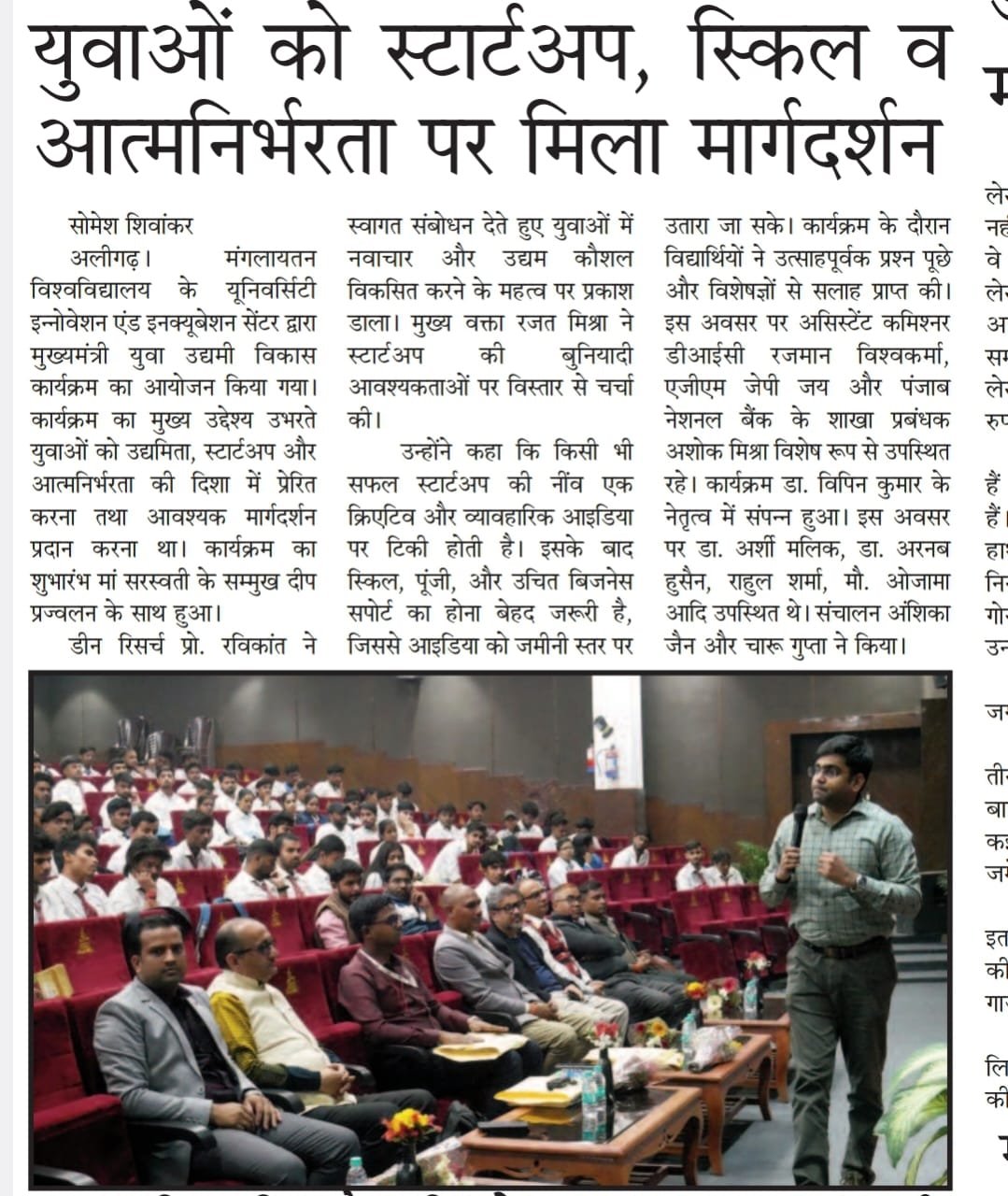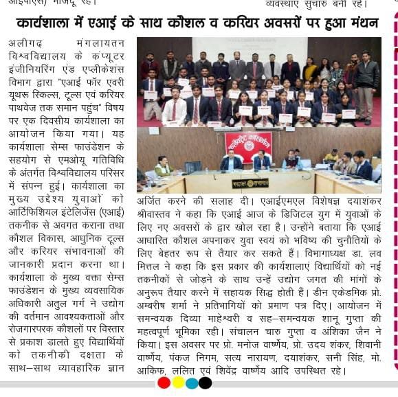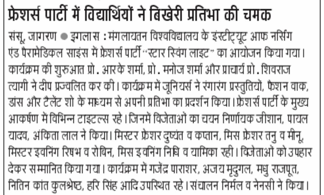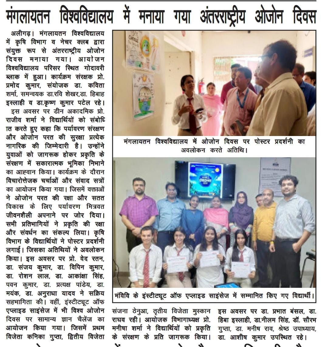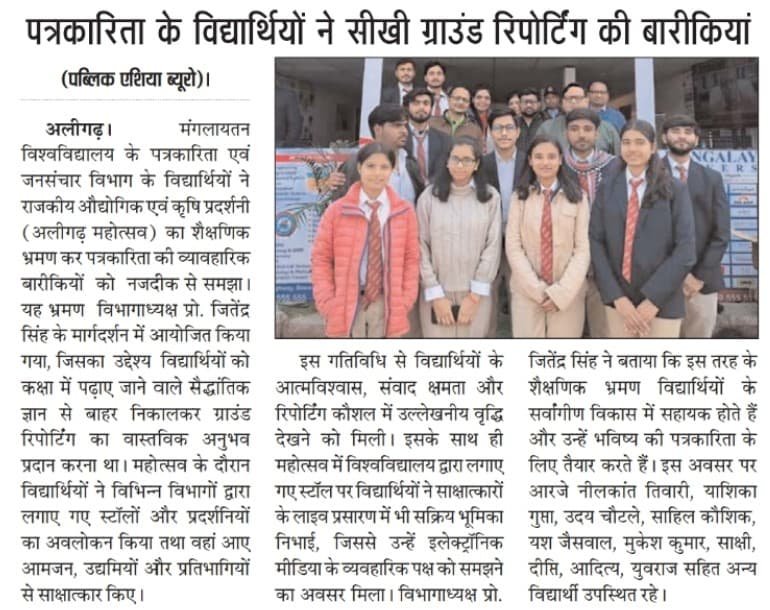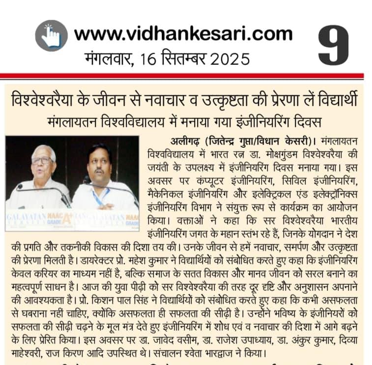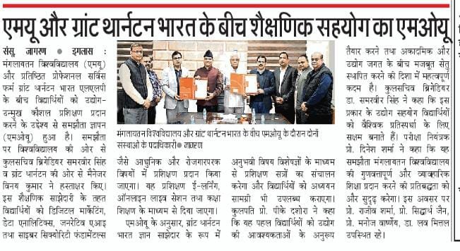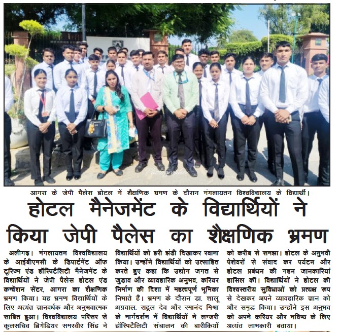 Mangalayatan University garnered significant attention in media with a feature highlighting departmental programs, community initiatives and activities. The article praised the university's commitment to academic excellence and its role in empowering academic units and their students through various skill development workshops and internships. Notably, the piece discussed the institution's efforts in promoting sustainable practices on campus, including eco-friendly initiatives that resonate with the university's mission to foster responsible citizens.This press clipping not only reflects the university's achievements but also its dedication to creating a vibrant learning environment, positioning Mangalayatan University as a cornerstone of educational development in the region. The coverage has sparked interest among prospective students and parents alike.