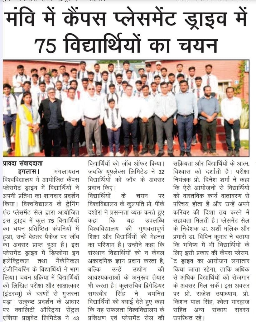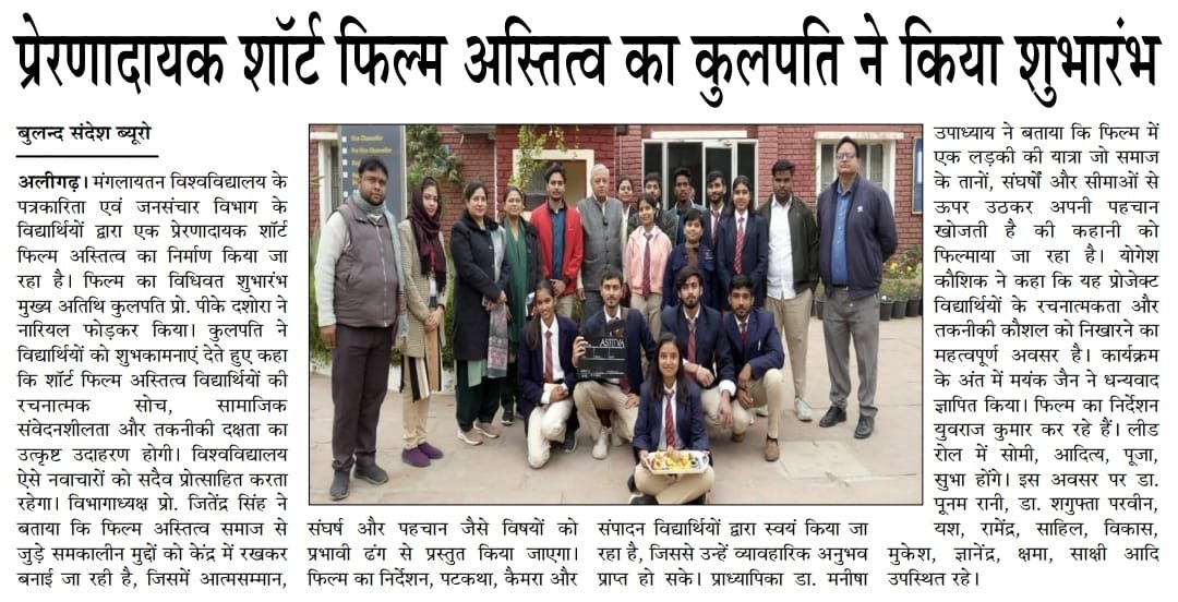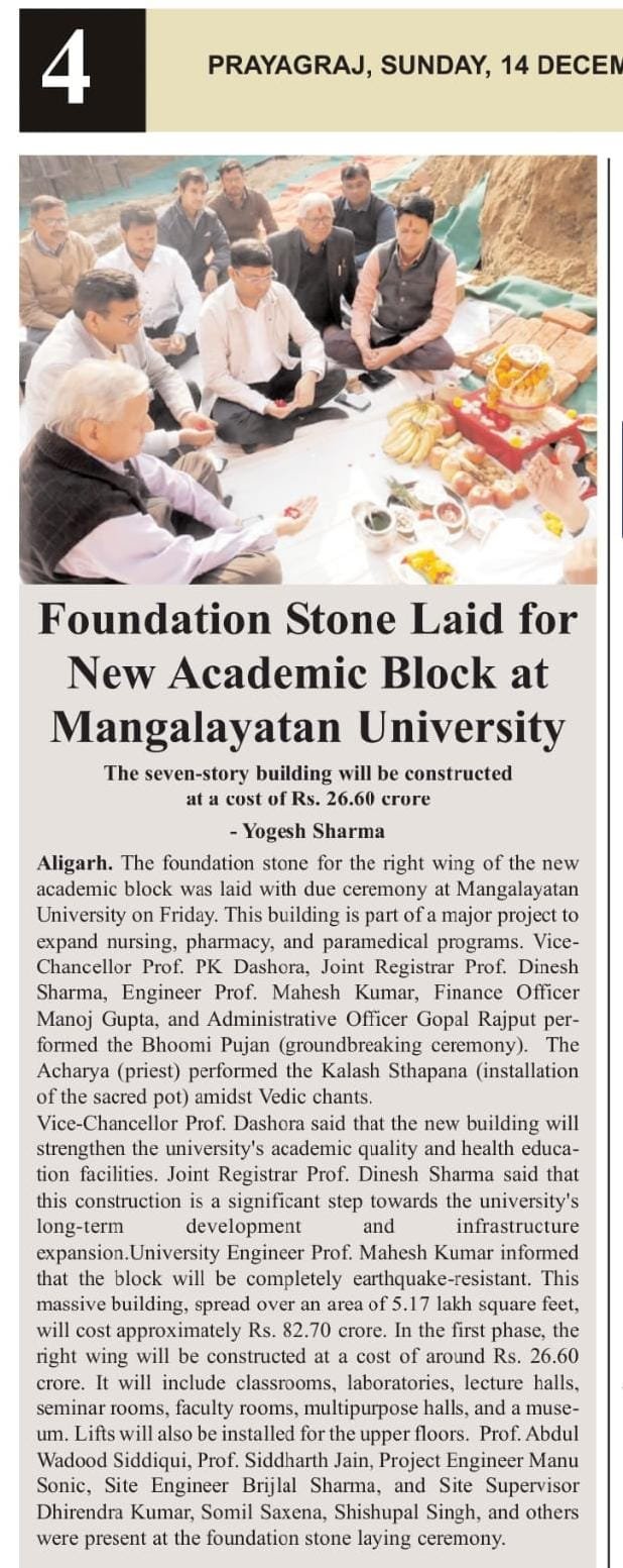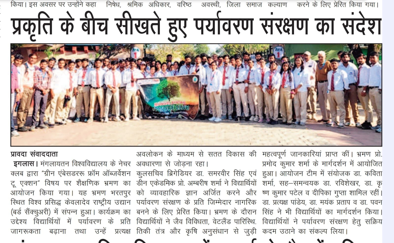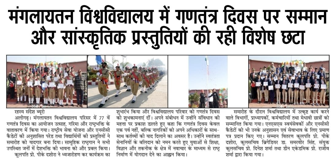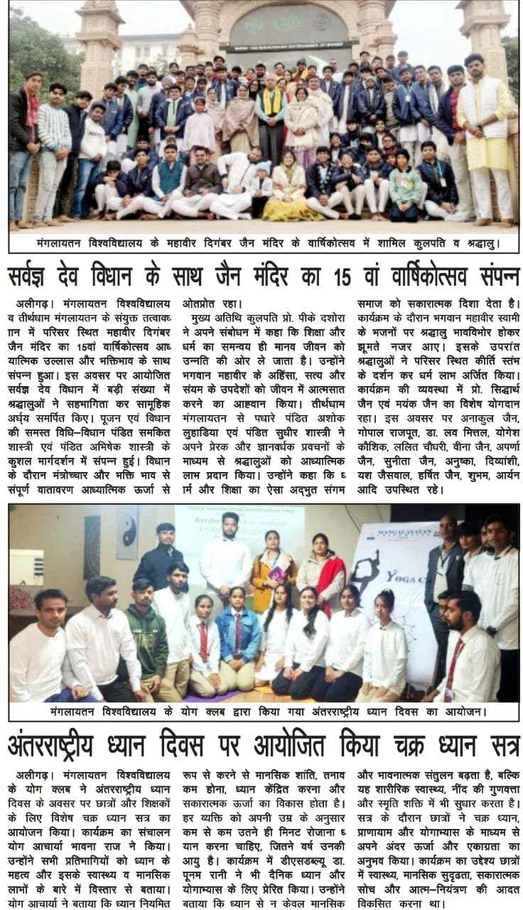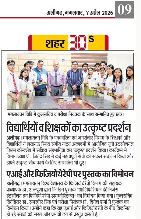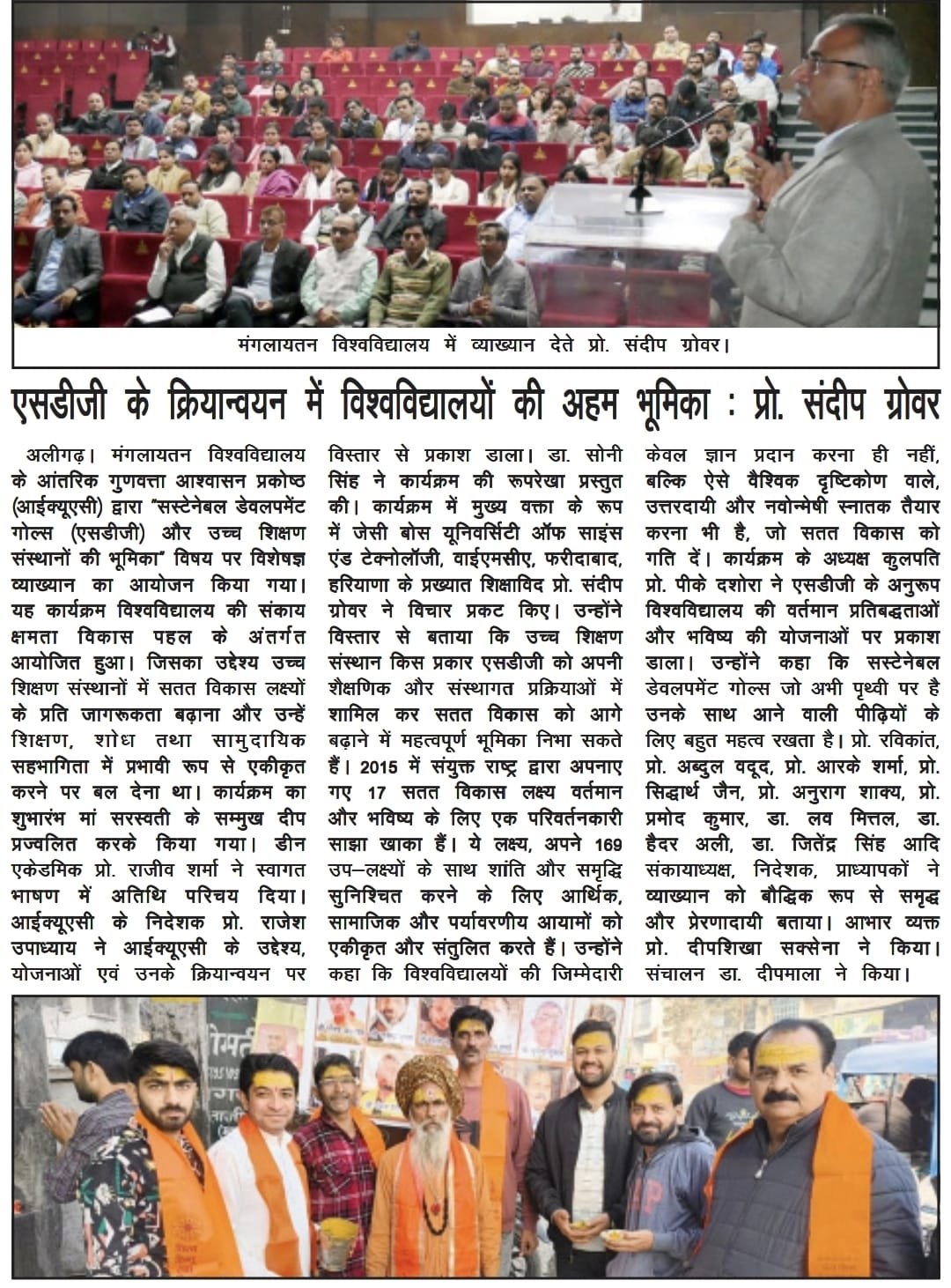 Mangalayatan University garnered significant attention in media with a feature highlighting departmental programs, community initiatives and activities. The article praised the university's commitment to academic excellence and its role in empowering academic units and their students through various skill development workshops and internships. Notably, the piece discussed the institution's efforts in promoting sustainable practices on campus, including eco-friendly initiatives that resonate with the university's mission to foster responsible citizens.This press clipping not only reflects the university's achievements but also its dedication to creating a vibrant learning environment, positioning Mangalayatan University as a cornerstone of educational development in the region. The coverage has sparked interest among prospective students and parents alike.