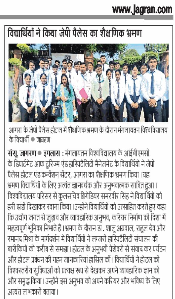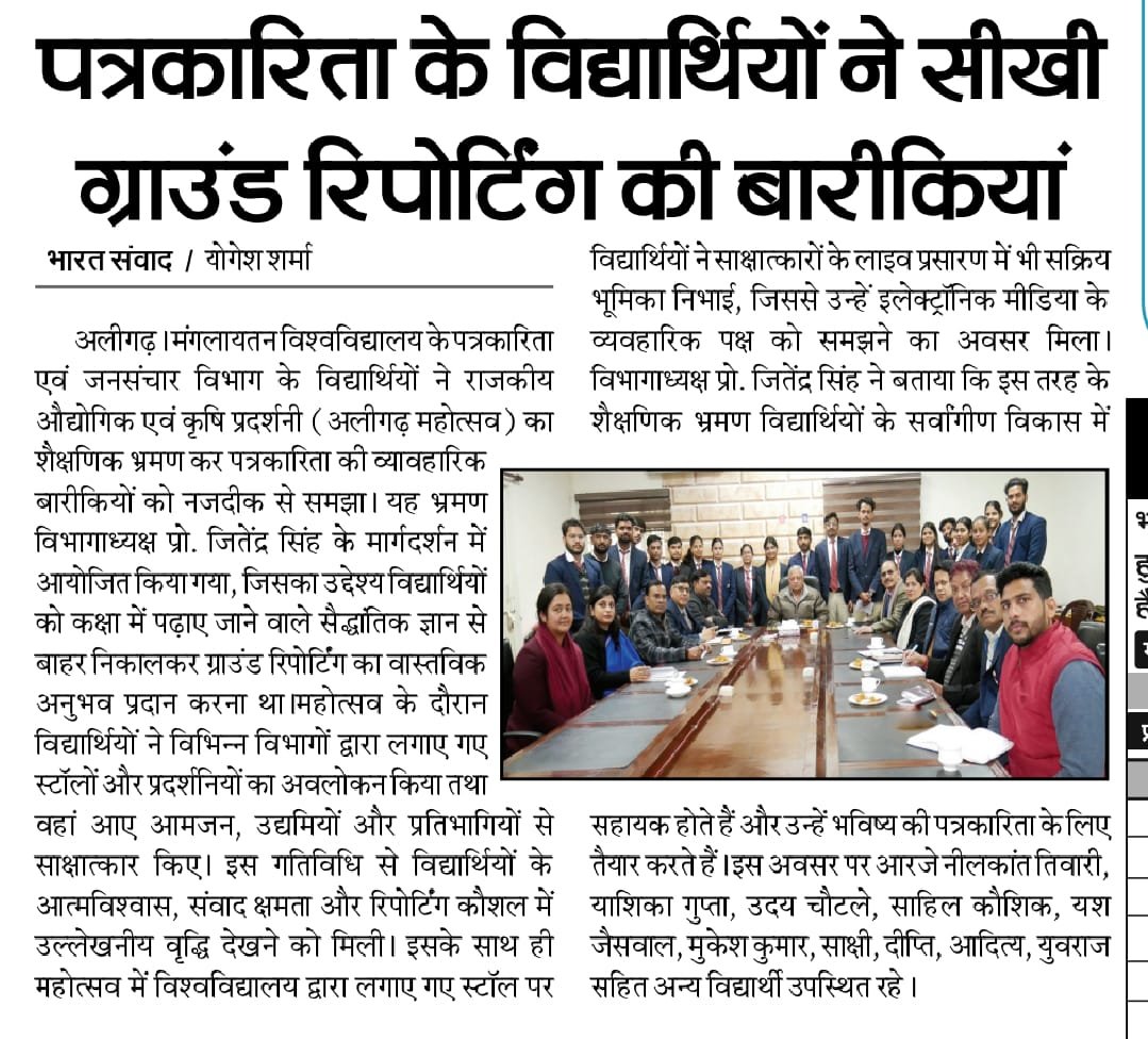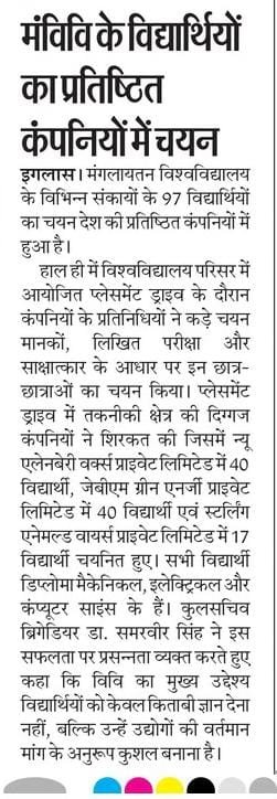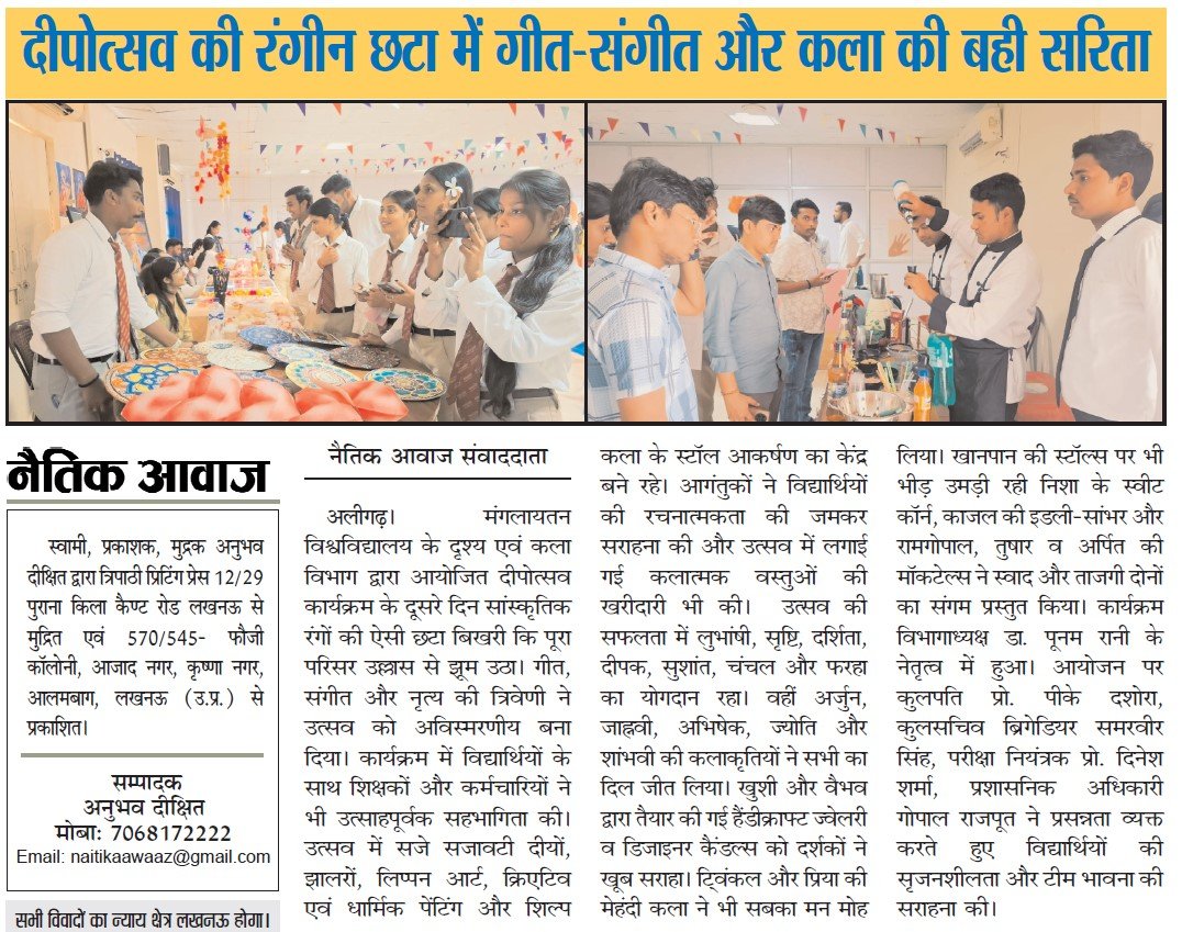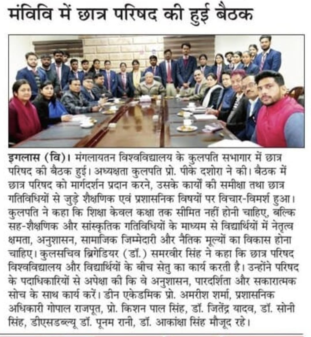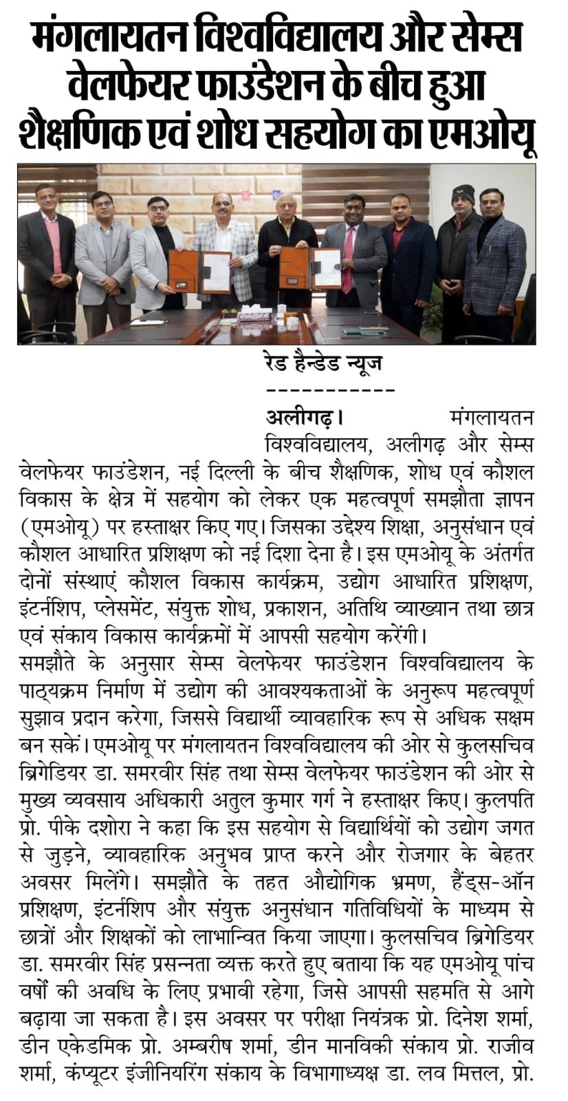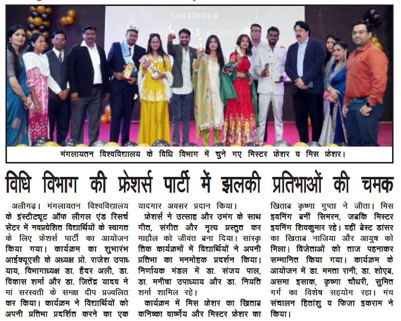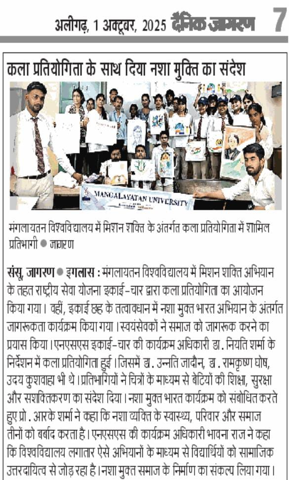 Mangalayatan University garnered significant attention in media with a feature highlighting departmental programs, community initiatives and activities. The article praised the university's commitment to academic excellence and its role in empowering academic units and their students through various skill development workshops and internships. Notably, the piece discussed the institution's efforts in promoting sustainable practices on campus, including eco-friendly initiatives that resonate with the university's mission to foster responsible citizens.This press clipping not only reflects the university's achievements but also its dedication to creating a vibrant learning environment, positioning Mangalayatan University as a cornerstone of educational development in the region. The coverage has sparked interest among prospective students and parents alike.