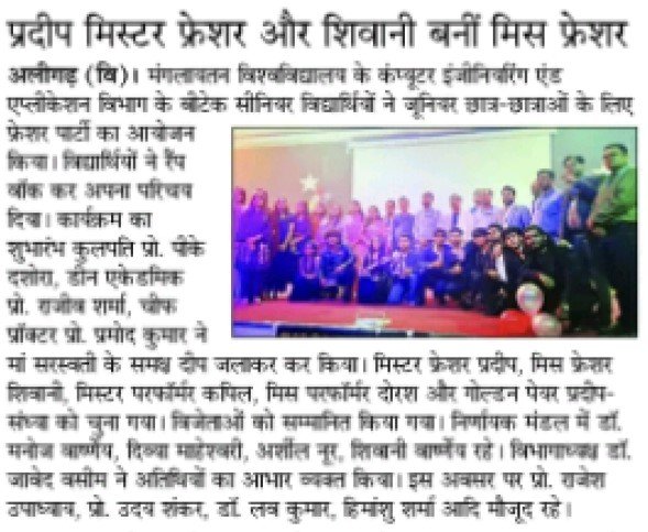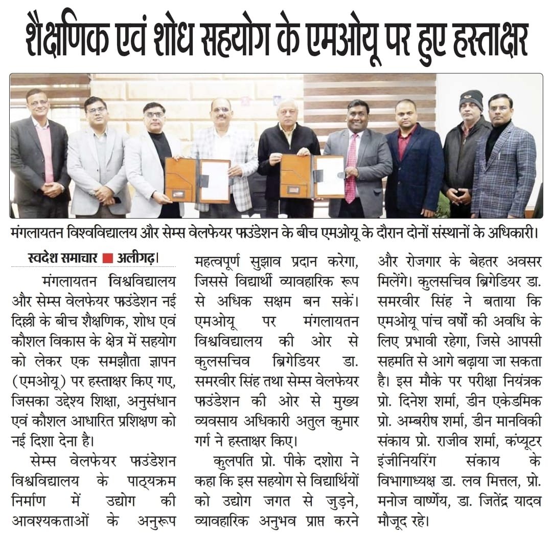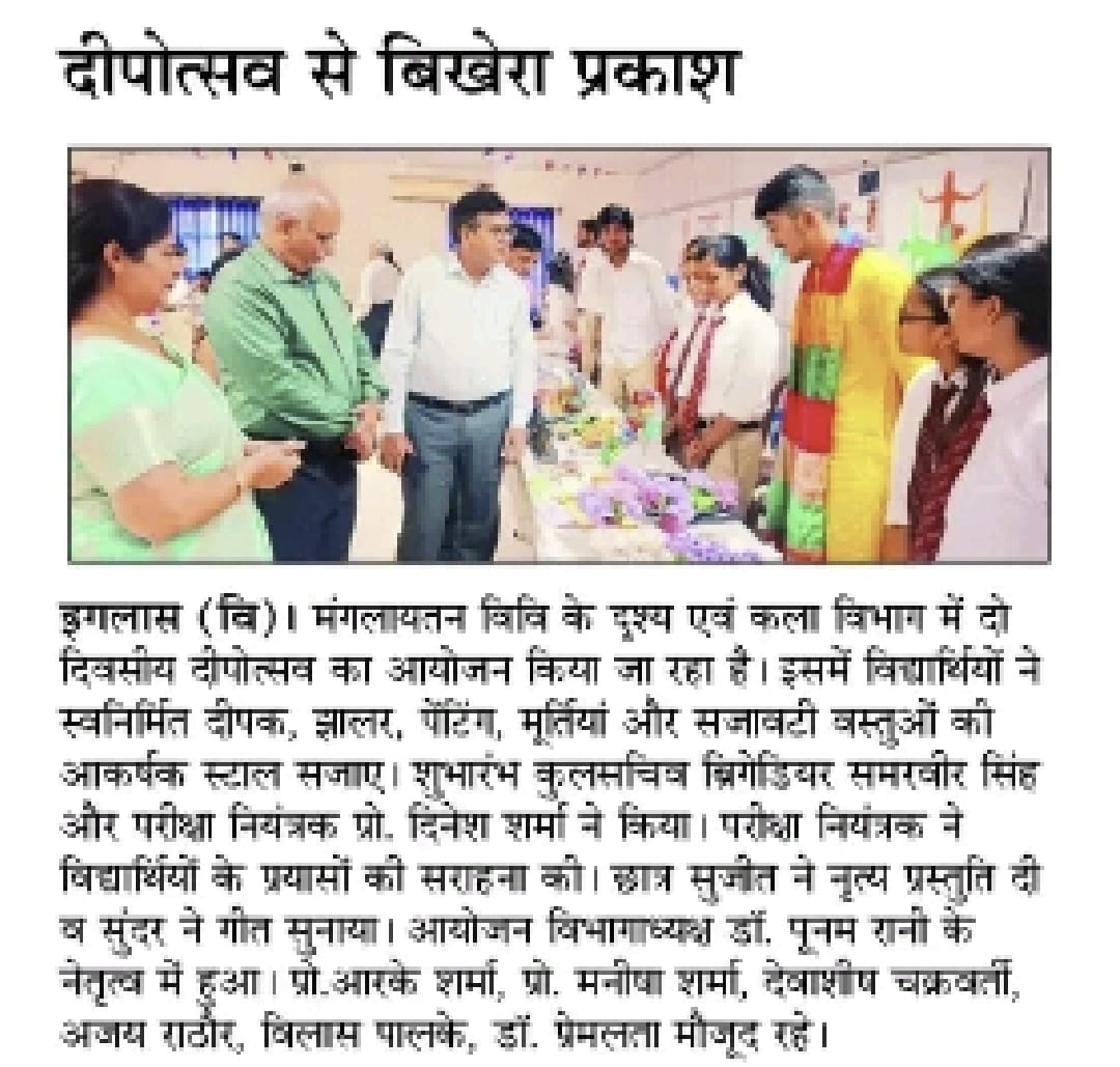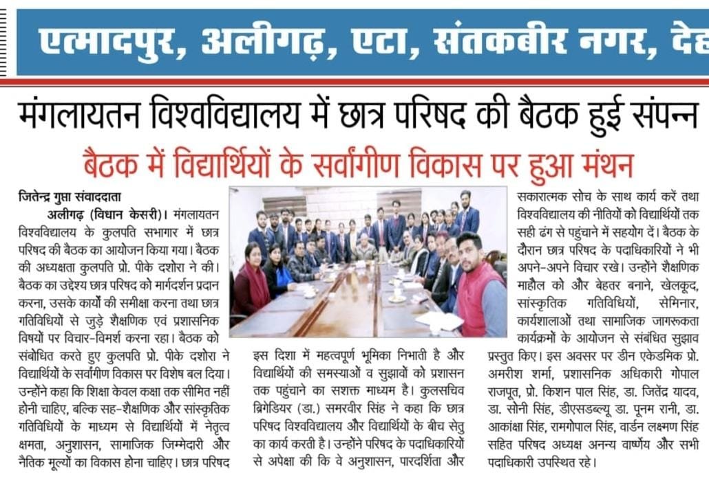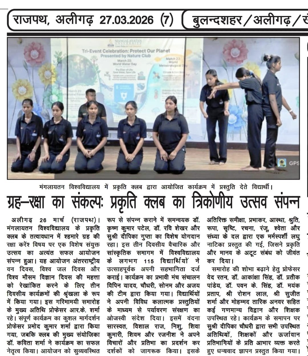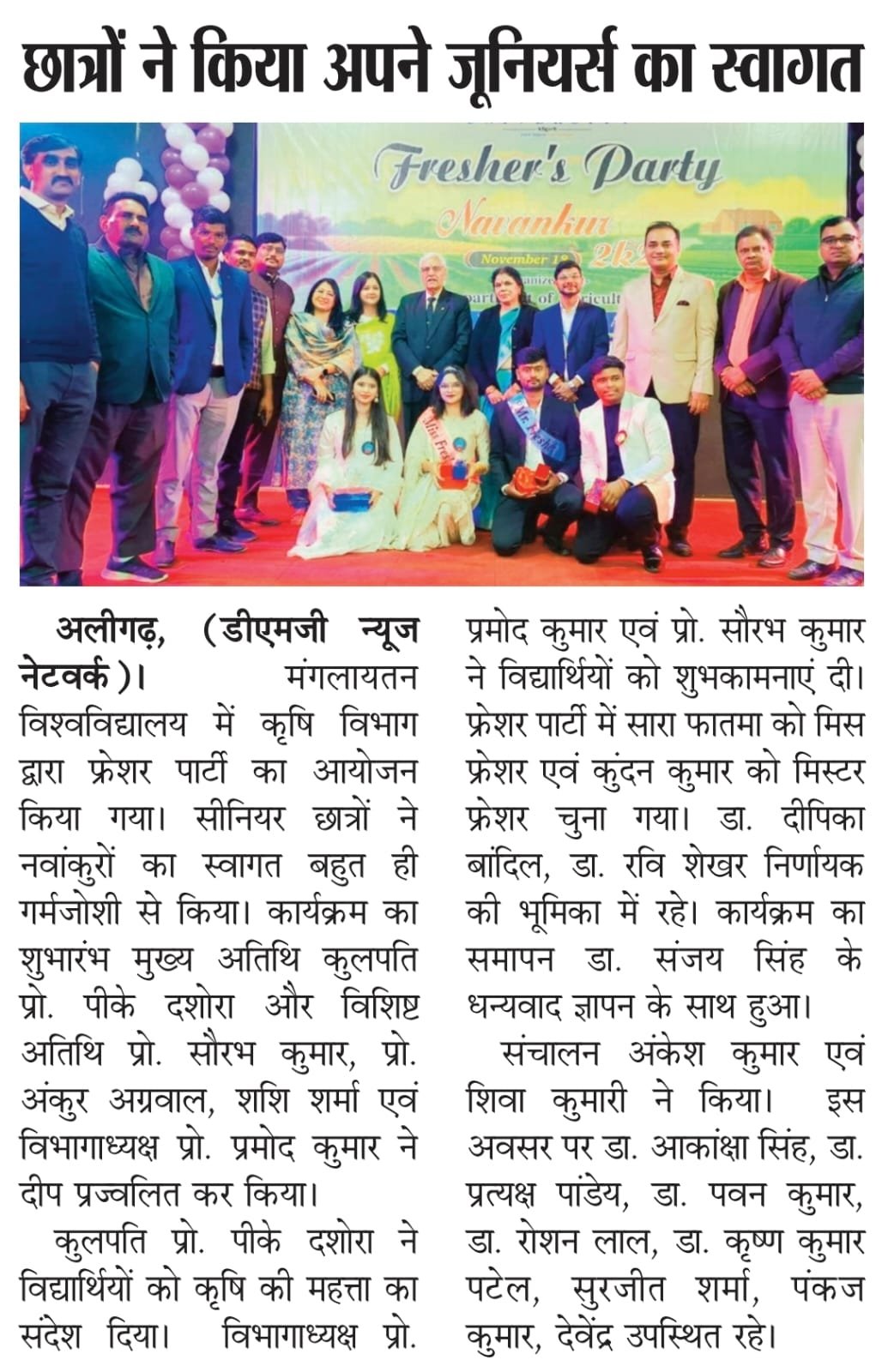 Mangalayatan University garnered significant attention in media with a feature highlighting departmental programs, community initiatives and activities. The article praised the university's commitment to academic excellence and its role in empowering academic units and their students through various skill development workshops and internships. Notably, the piece discussed the institution's efforts in promoting sustainable practices on campus, including eco-friendly initiatives that resonate with the university's mission to foster responsible citizens.This press clipping not only reflects the university's achievements but also its dedication to creating a vibrant learning environment, positioning Mangalayatan University as a cornerstone of educational development in the region. The coverage has sparked interest among prospective students and parents alike.