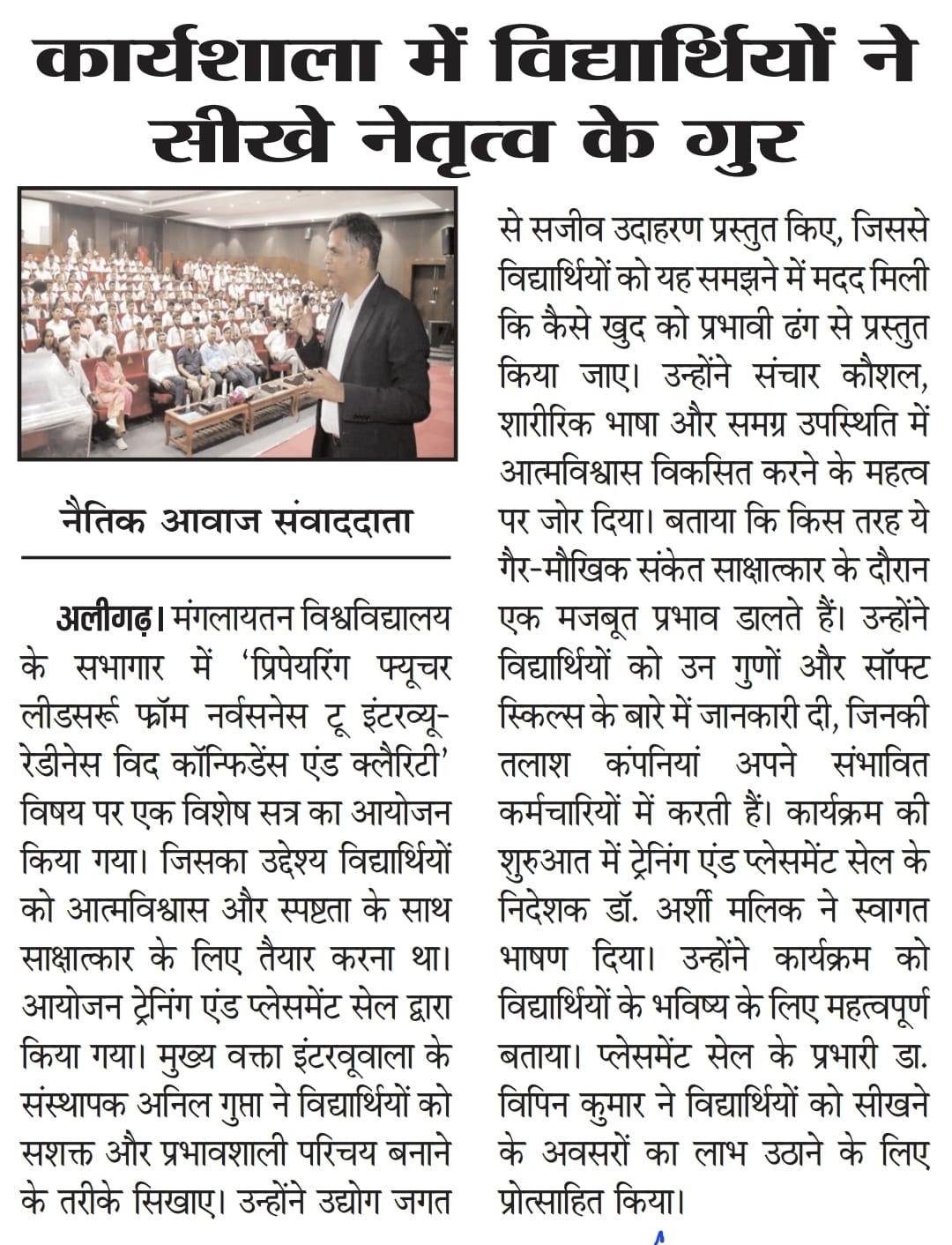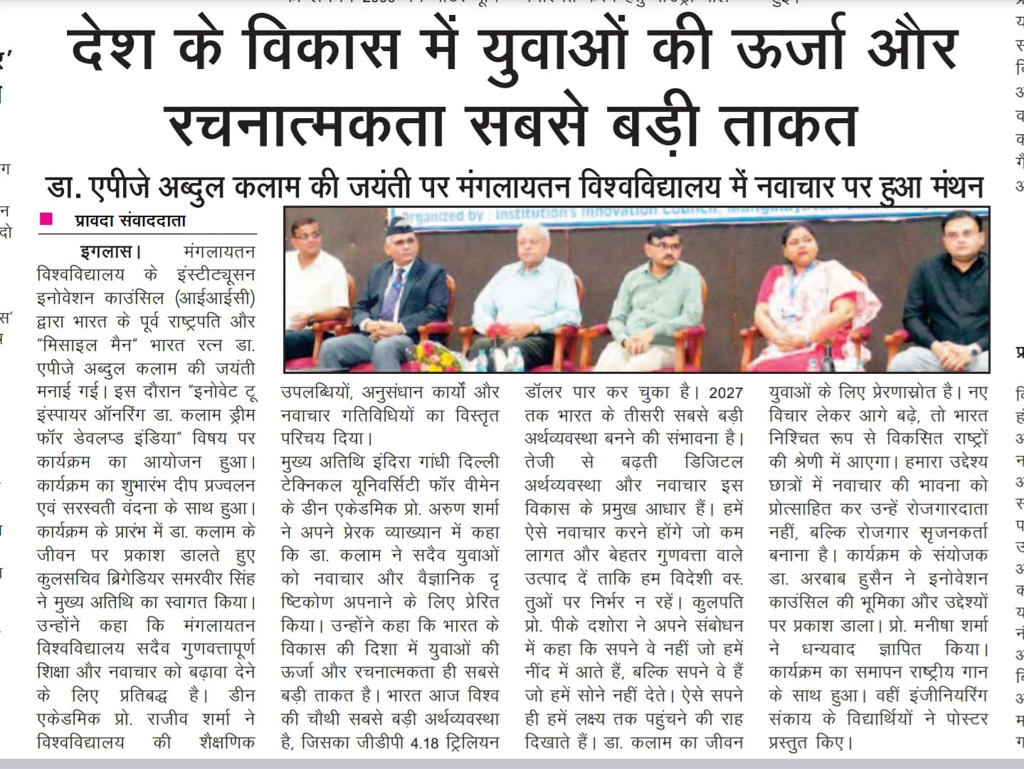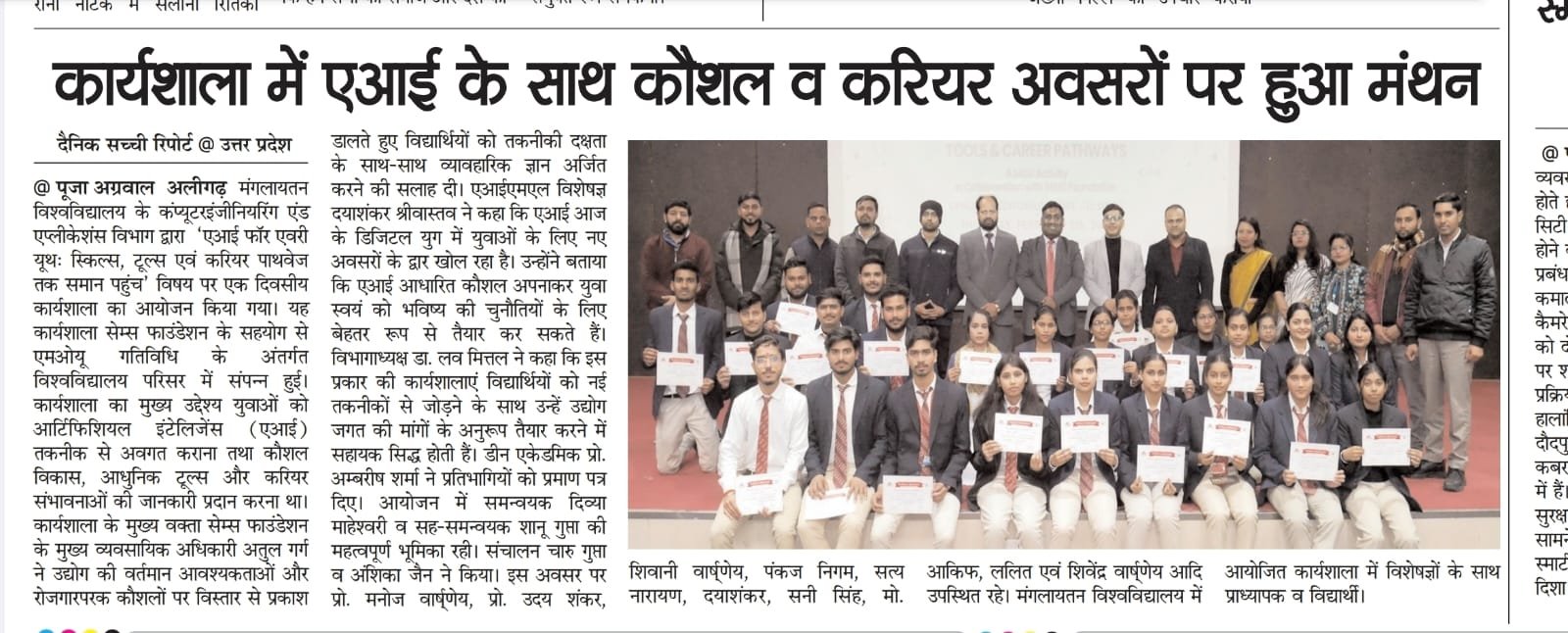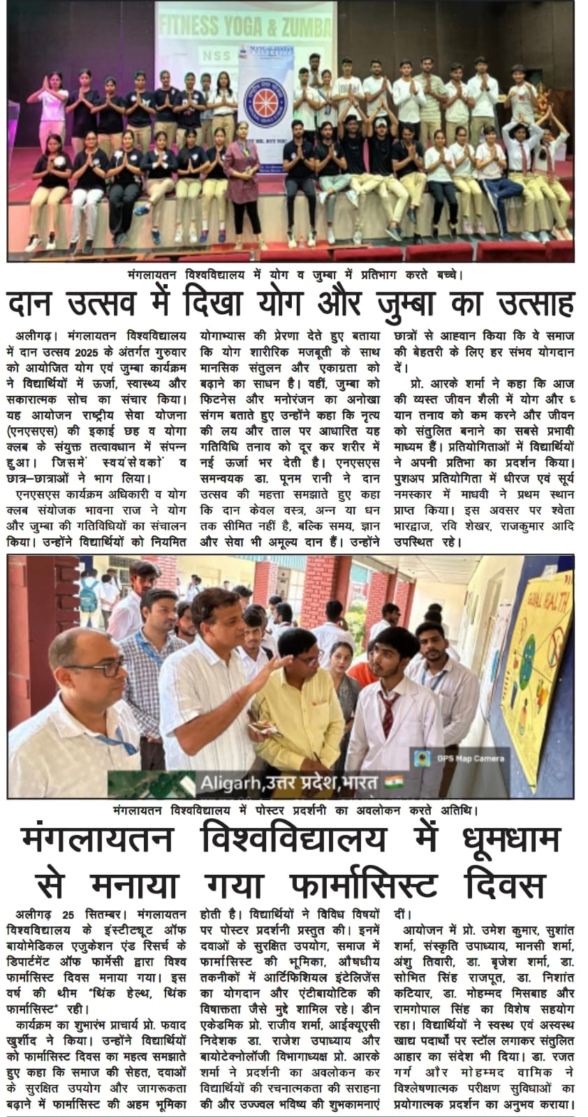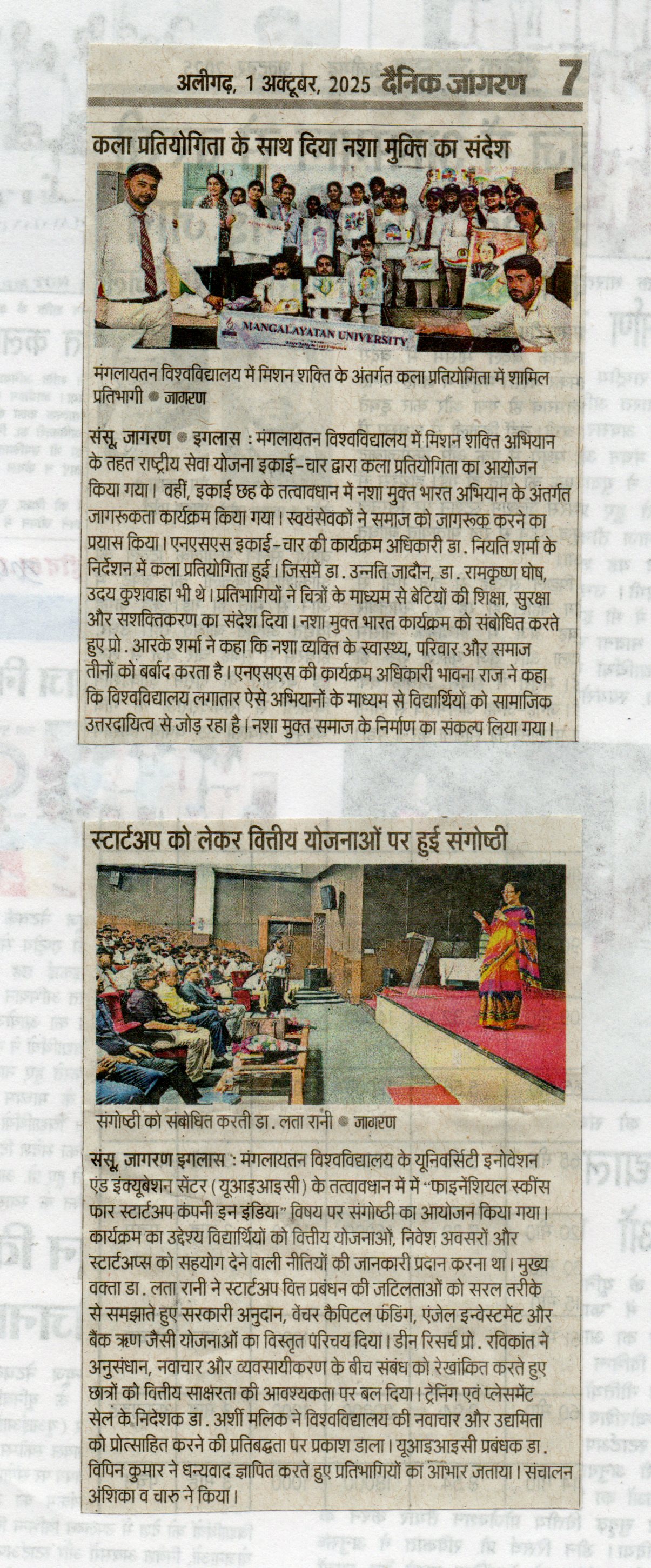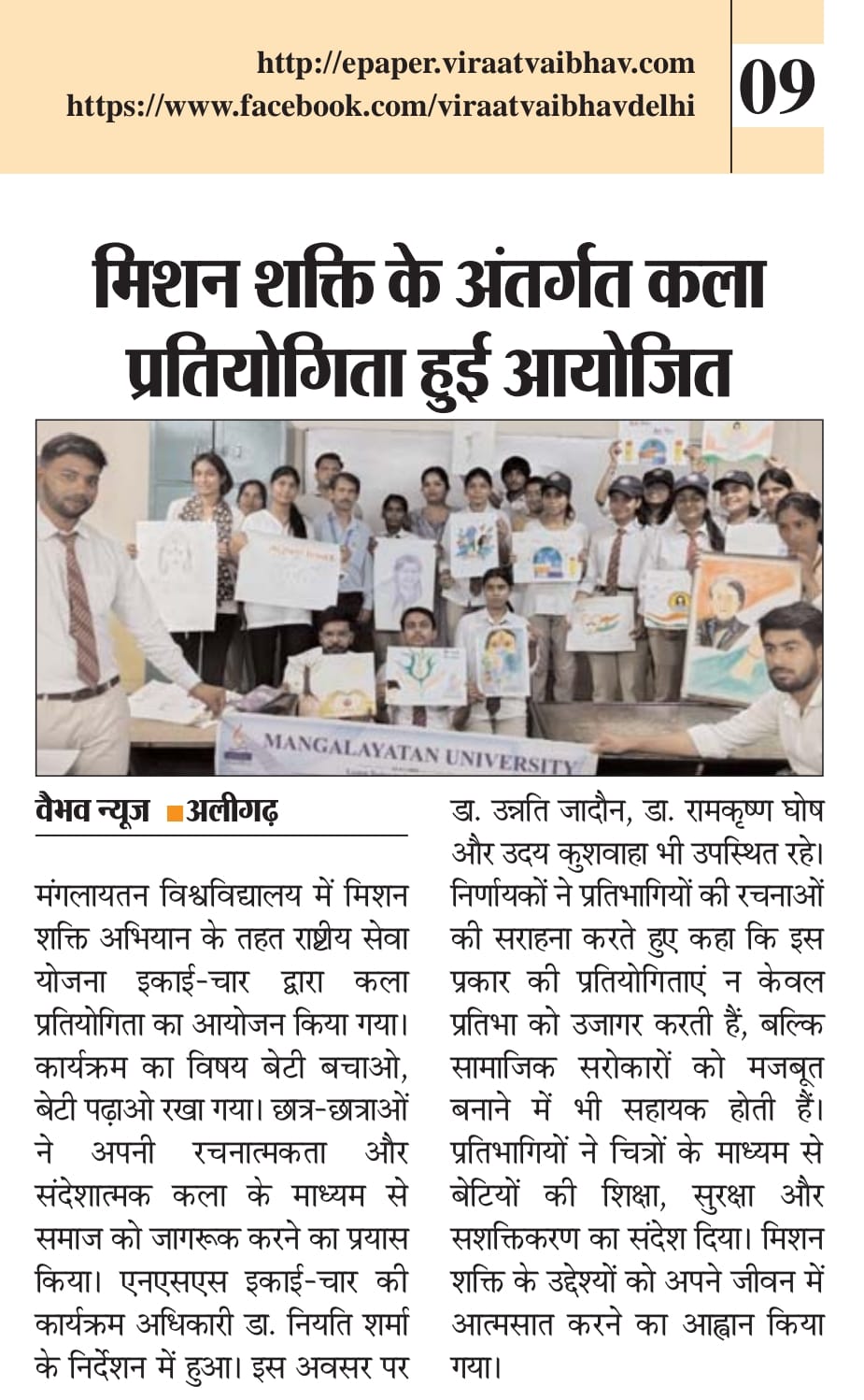 Mangalayatan University garnered significant attention in media with a feature highlighting departmental programs, community initiatives and activities. The article praised the university's commitment to academic excellence and its role in empowering academic units and their students through various skill development workshops and internships. Notably, the piece discussed the institution's efforts in promoting sustainable practices on campus, including eco-friendly initiatives that resonate with the university's mission to foster responsible citizens.This press clipping not only reflects the university's achievements but also its dedication to creating a vibrant learning environment, positioning Mangalayatan University as a cornerstone of educational development in the region. The coverage has sparked interest among prospective students and parents alike.