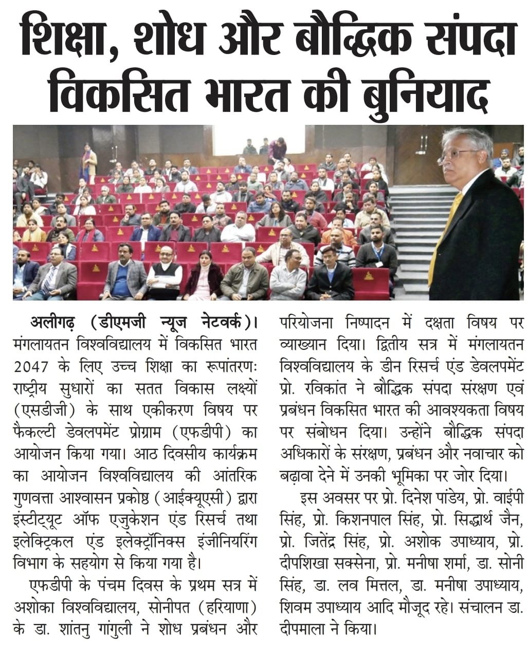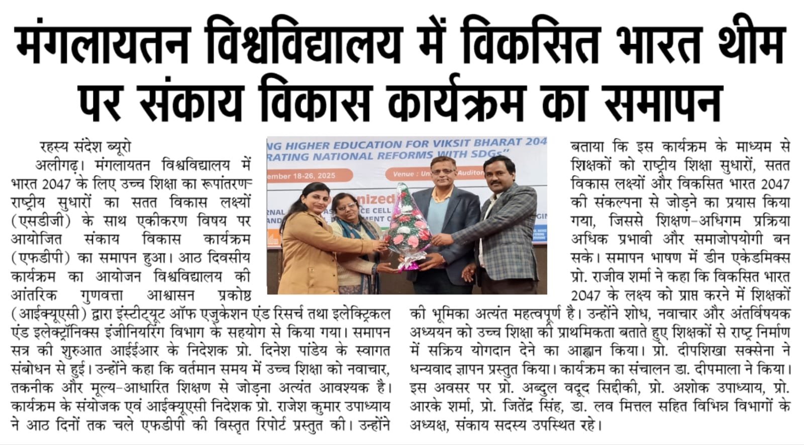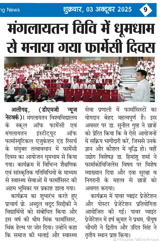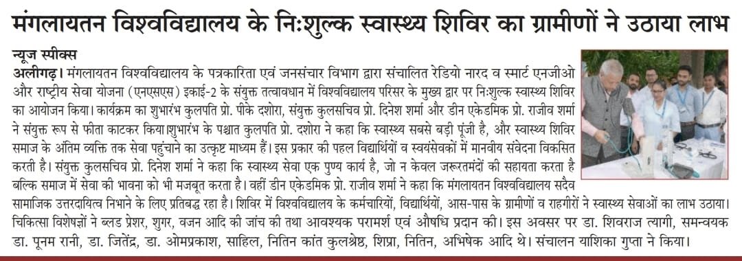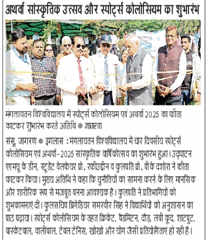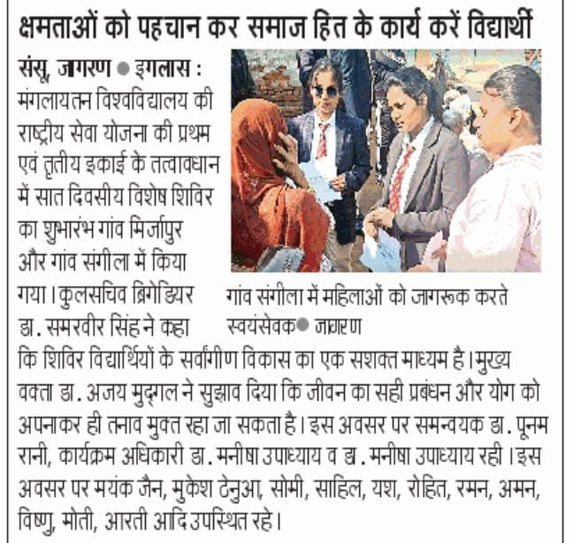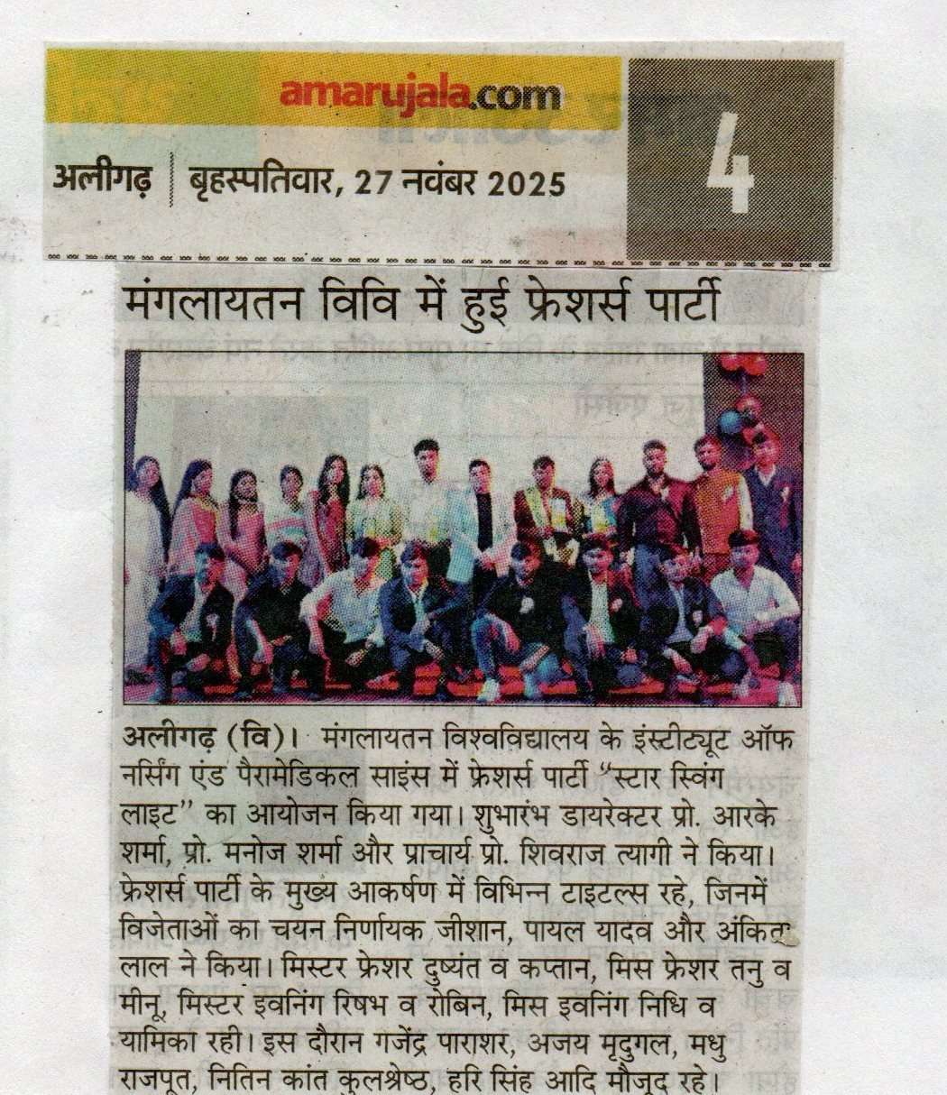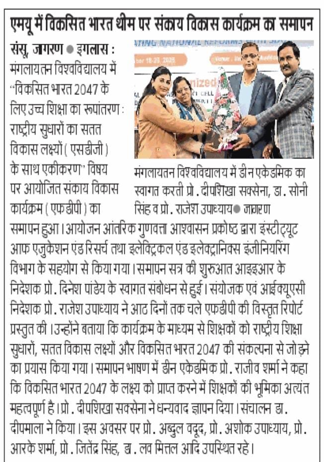 Mangalayatan University garnered significant attention in media with a feature highlighting departmental programs, community initiatives and activities. The article praised the university's commitment to academic excellence and its role in empowering academic units and their students through various skill development workshops and internships. Notably, the piece discussed the institution's efforts in promoting sustainable practices on campus, including eco-friendly initiatives that resonate with the university's mission to foster responsible citizens.This press clipping not only reflects the university's achievements but also its dedication to creating a vibrant learning environment, positioning Mangalayatan University as a cornerstone of educational development in the region. The coverage has sparked interest among prospective students and parents alike.