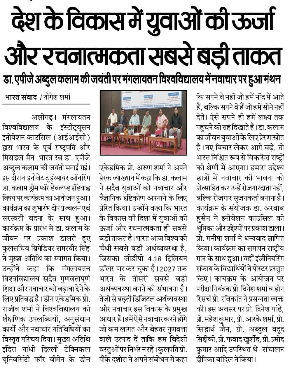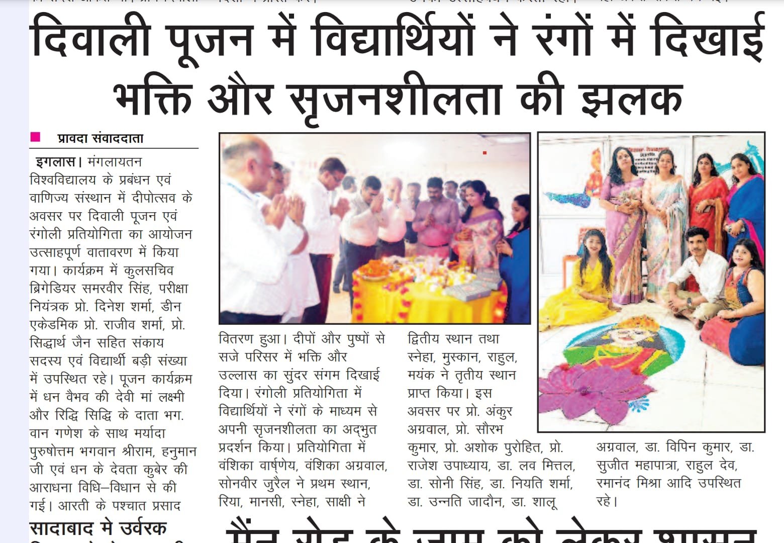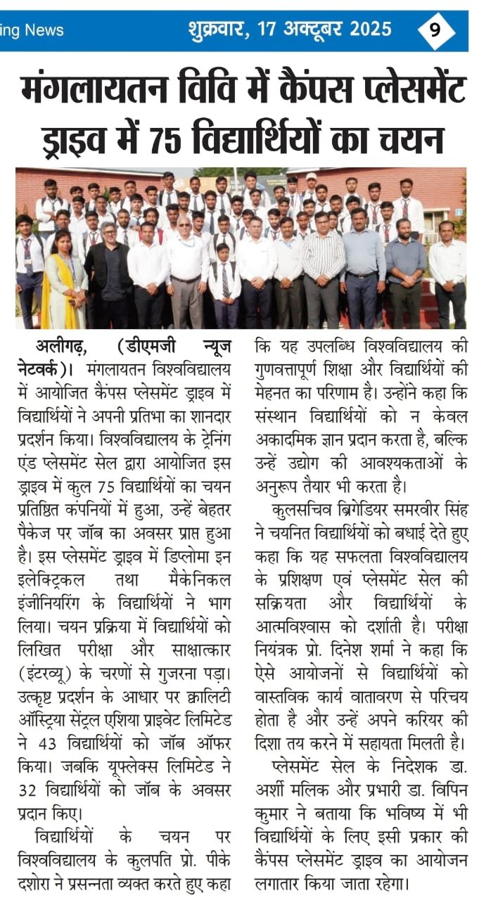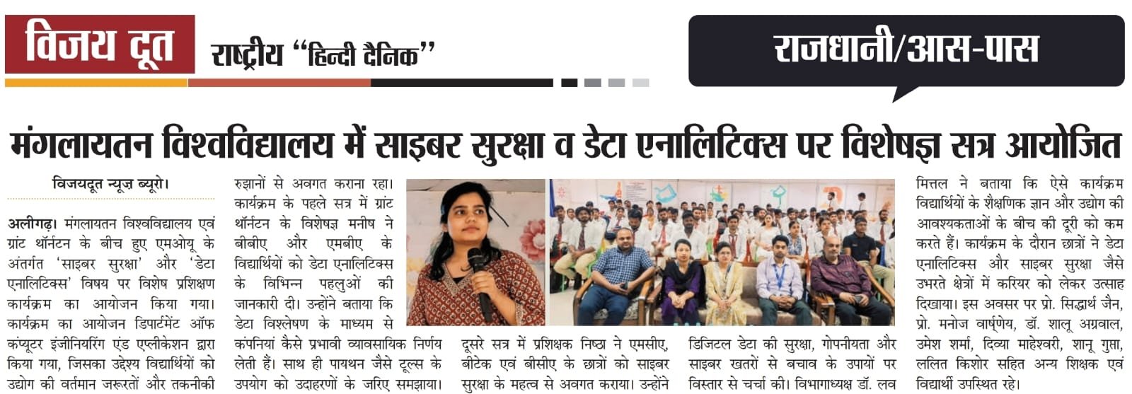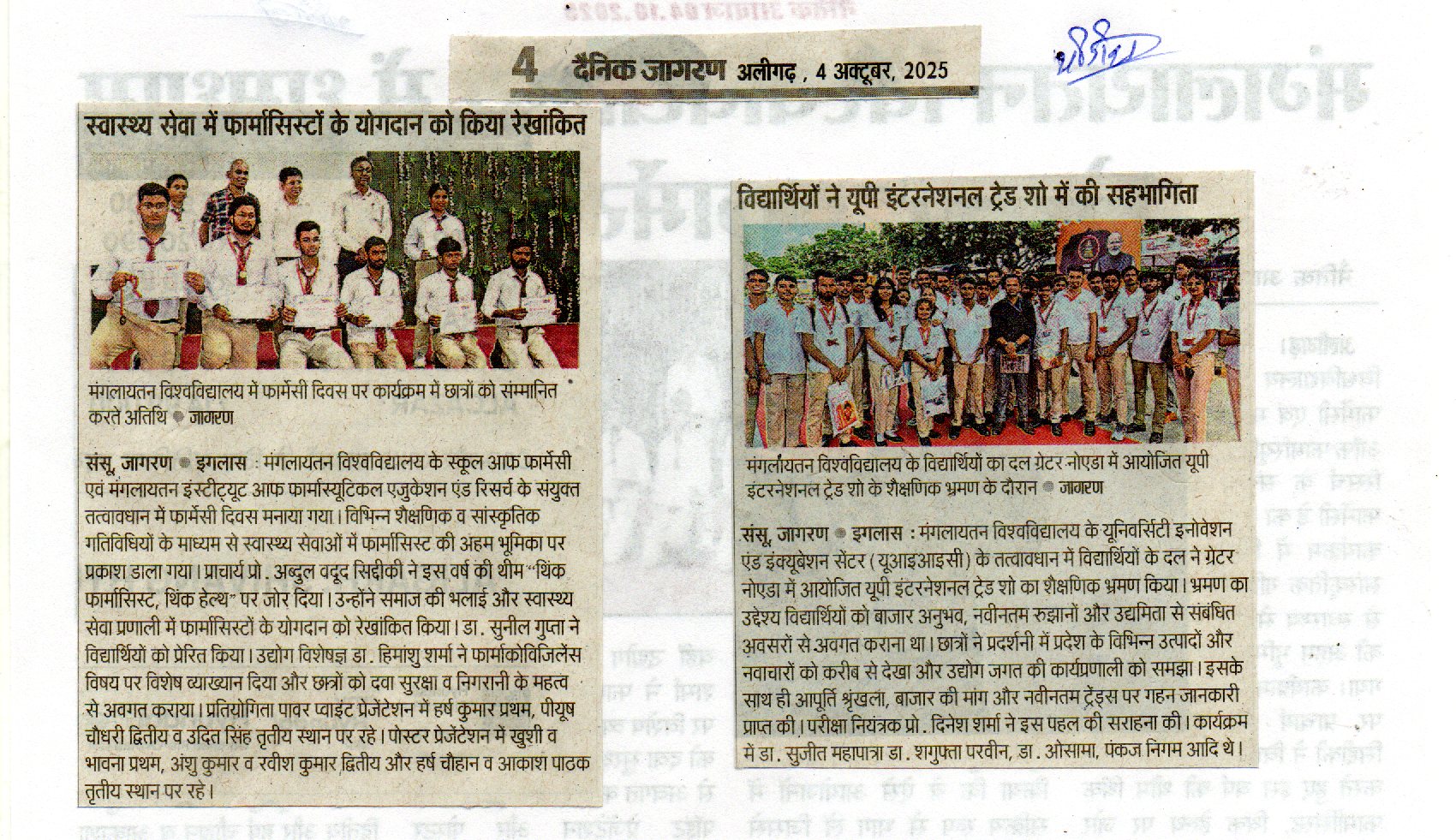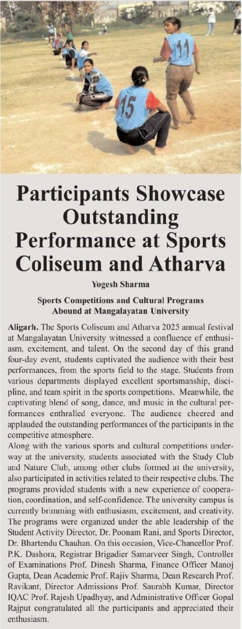 Mangalayatan University garnered significant attention in media with a feature highlighting departmental programs, community initiatives and activities. The article praised the university's commitment to academic excellence and its role in empowering academic units and their students through various skill development workshops and internships. Notably, the piece discussed the institution's efforts in promoting sustainable practices on campus, including eco-friendly initiatives that resonate with the university's mission to foster responsible citizens.This press clipping not only reflects the university's achievements but also its dedication to creating a vibrant learning environment, positioning Mangalayatan University as a cornerstone of educational development in the region. The coverage has sparked interest among prospective students and parents alike.