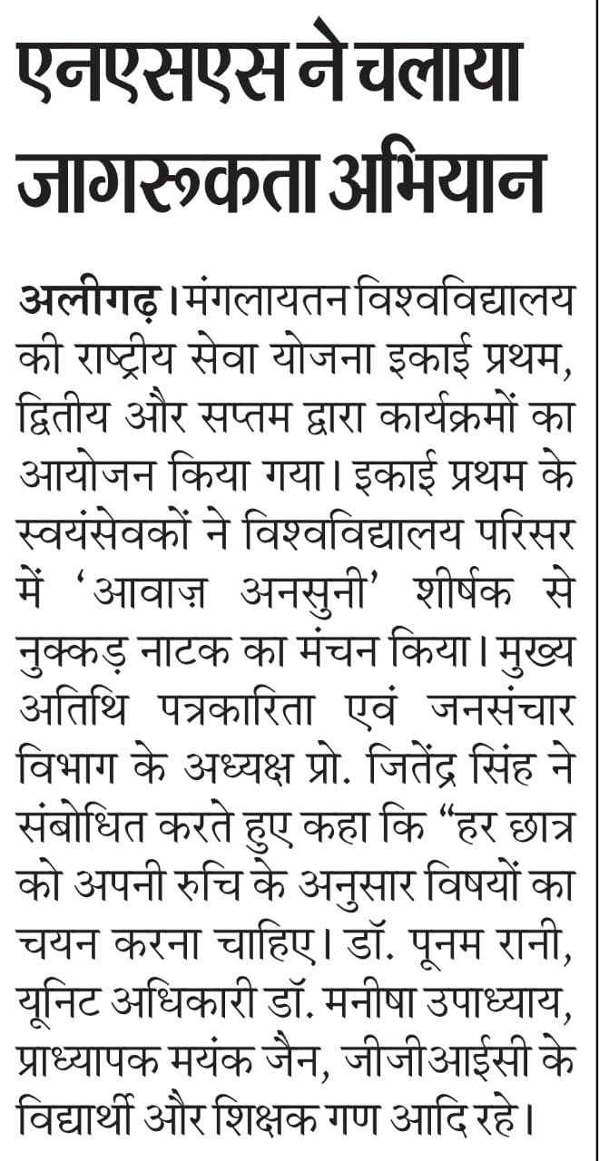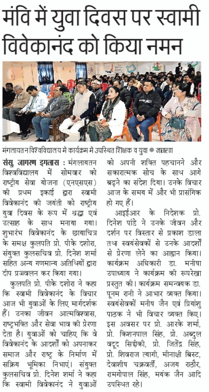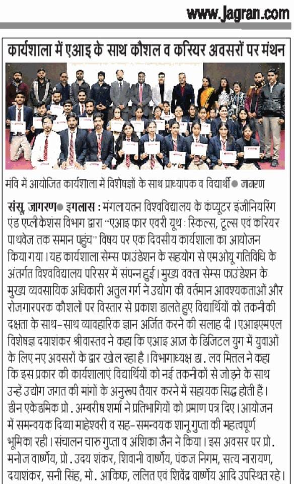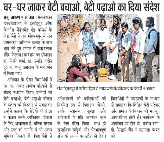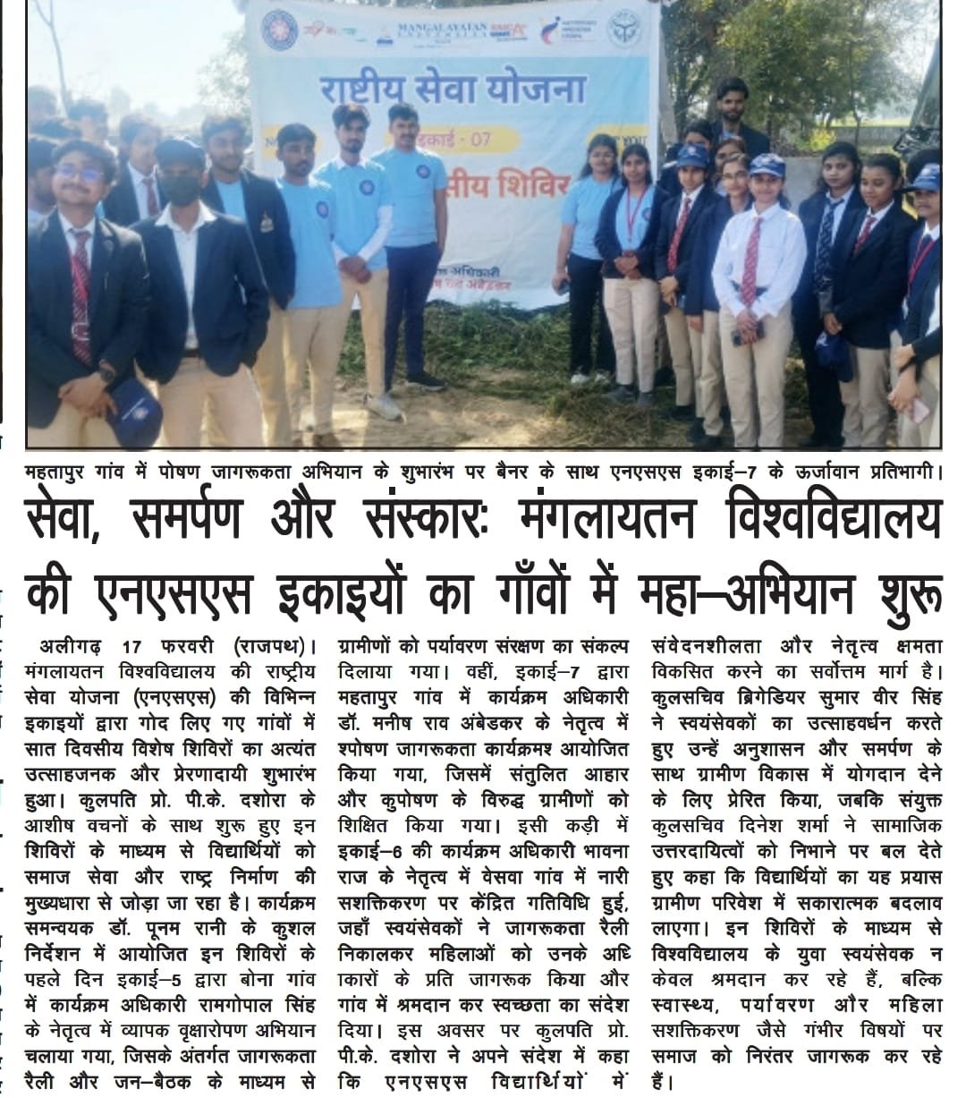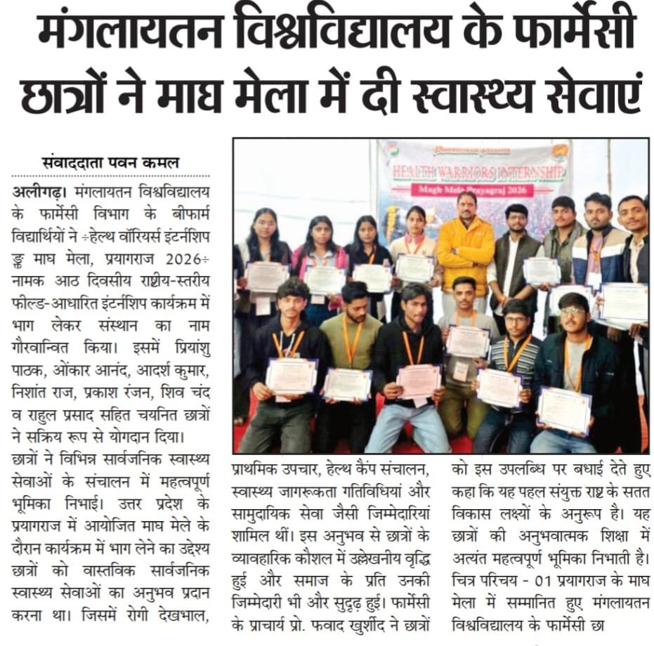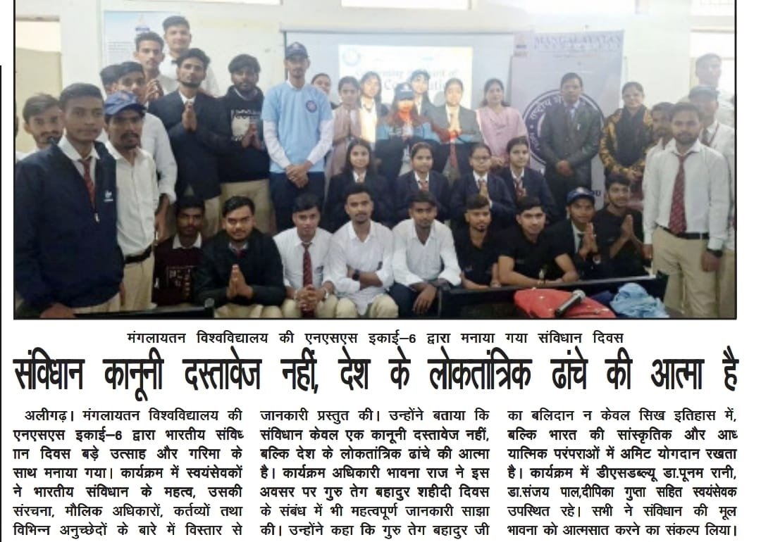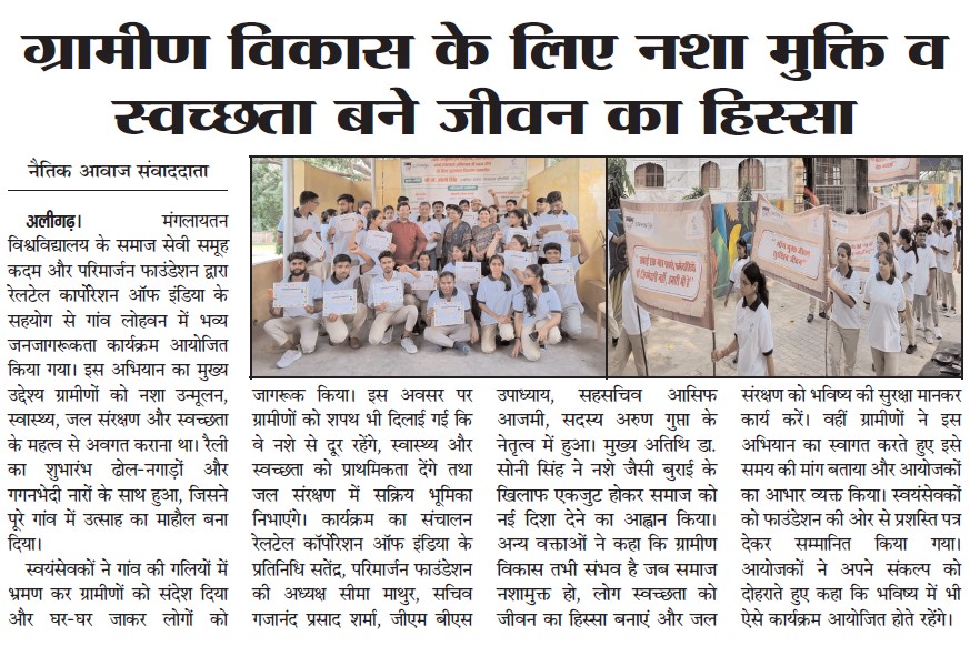 Mangalayatan University garnered significant attention in media with a feature highlighting departmental programs, community initiatives and activities. The article praised the university's commitment to academic excellence and its role in empowering academic units and their students through various skill development workshops and internships. Notably, the piece discussed the institution's efforts in promoting sustainable practices on campus, including eco-friendly initiatives that resonate with the university's mission to foster responsible citizens.This press clipping not only reflects the university's achievements but also its dedication to creating a vibrant learning environment, positioning Mangalayatan University as a cornerstone of educational development in the region. The coverage has sparked interest among prospective students and parents alike.