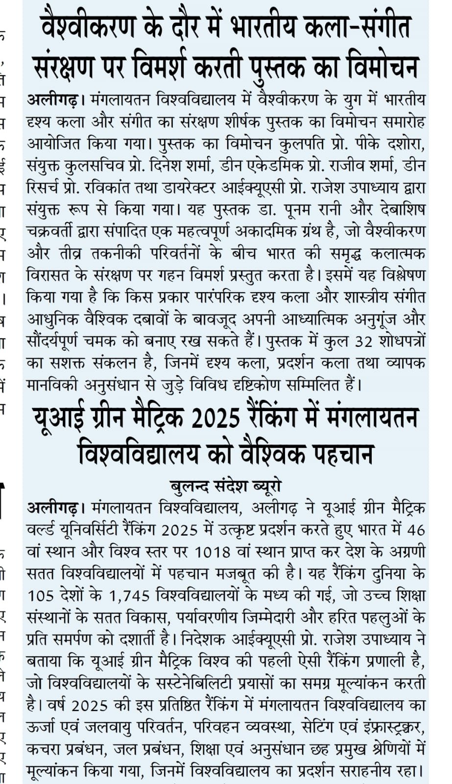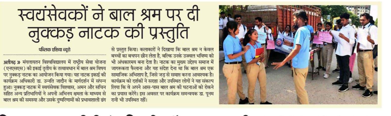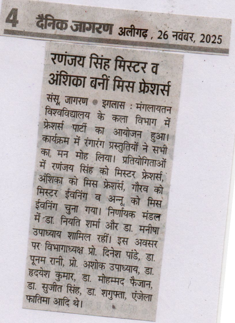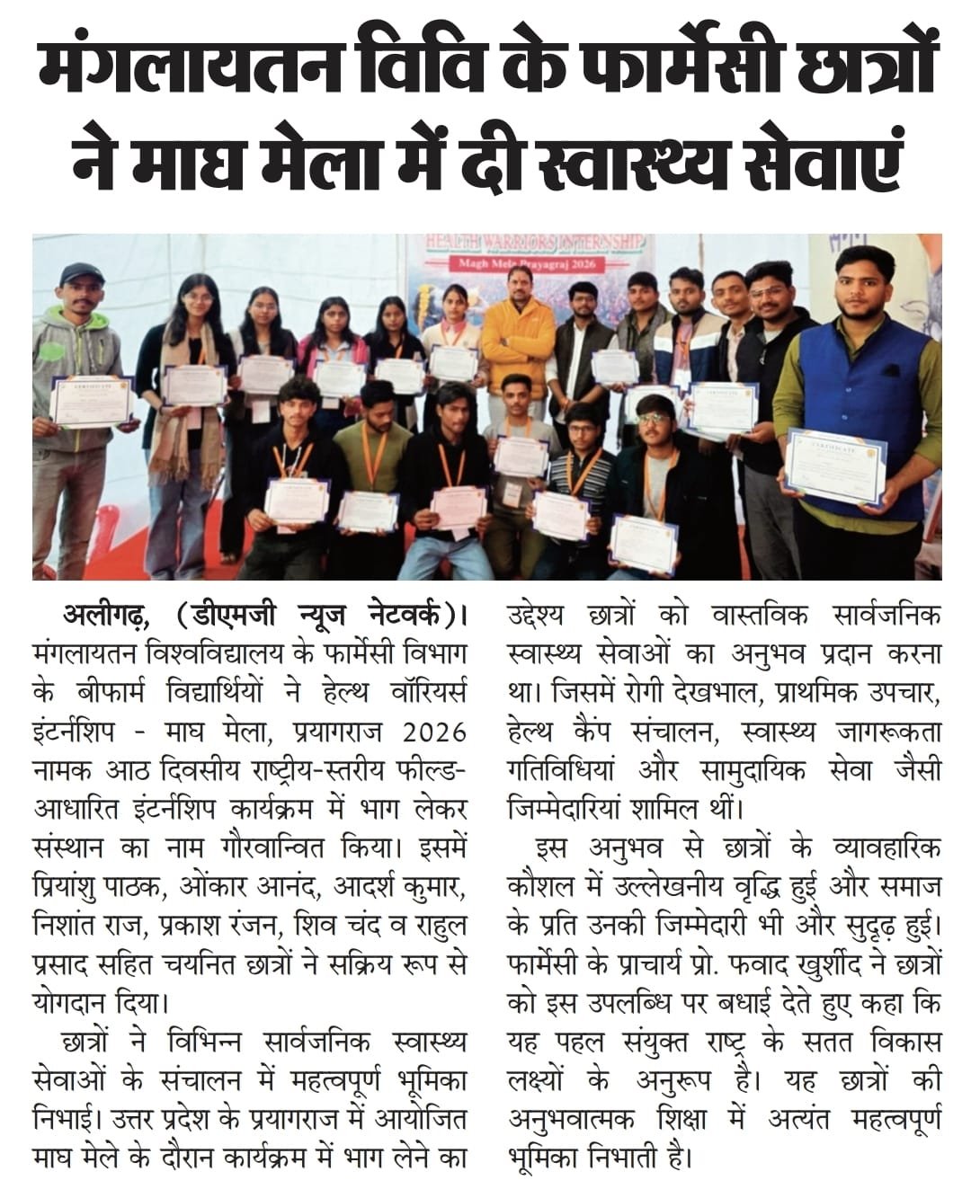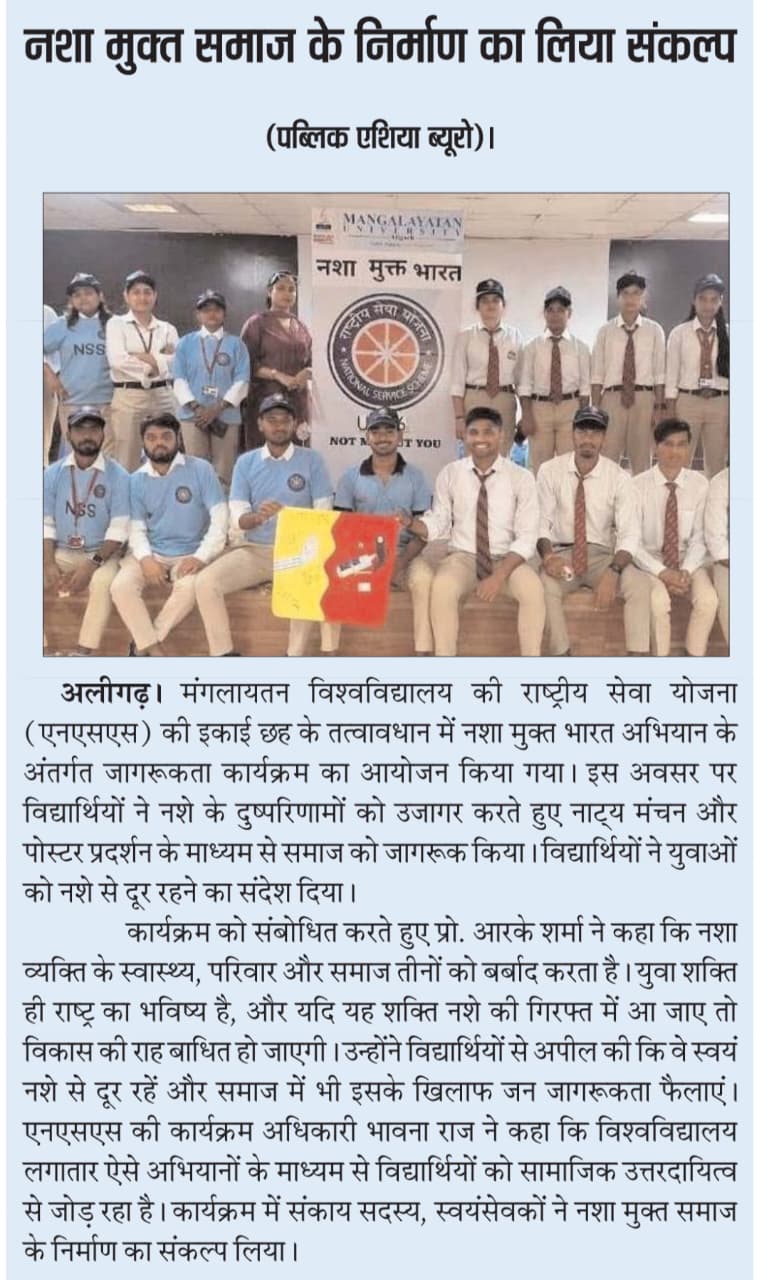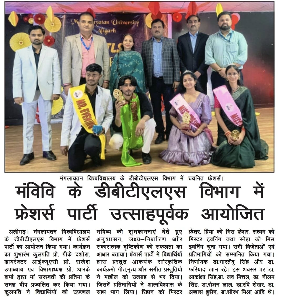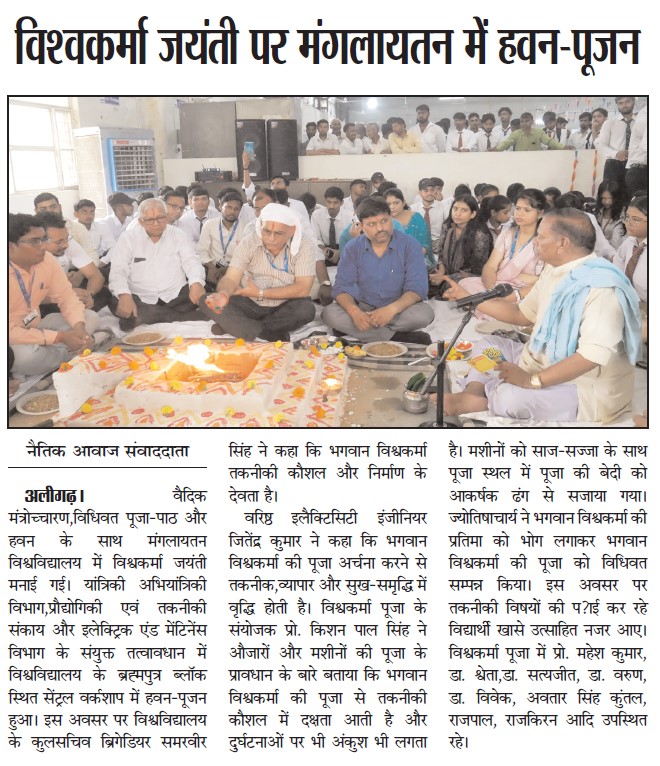 Mangalayatan University garnered significant attention in media with a feature highlighting departmental programs, community initiatives and activities. The article praised the university's commitment to academic excellence and its role in empowering academic units and their students through various skill development workshops and internships. Notably, the piece discussed the institution's efforts in promoting sustainable practices on campus, including eco-friendly initiatives that resonate with the university's mission to foster responsible citizens.This press clipping not only reflects the university's achievements but also its dedication to creating a vibrant learning environment, positioning Mangalayatan University as a cornerstone of educational development in the region. The coverage has sparked interest among prospective students and parents alike.