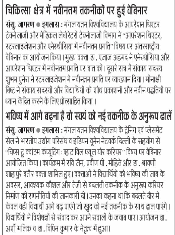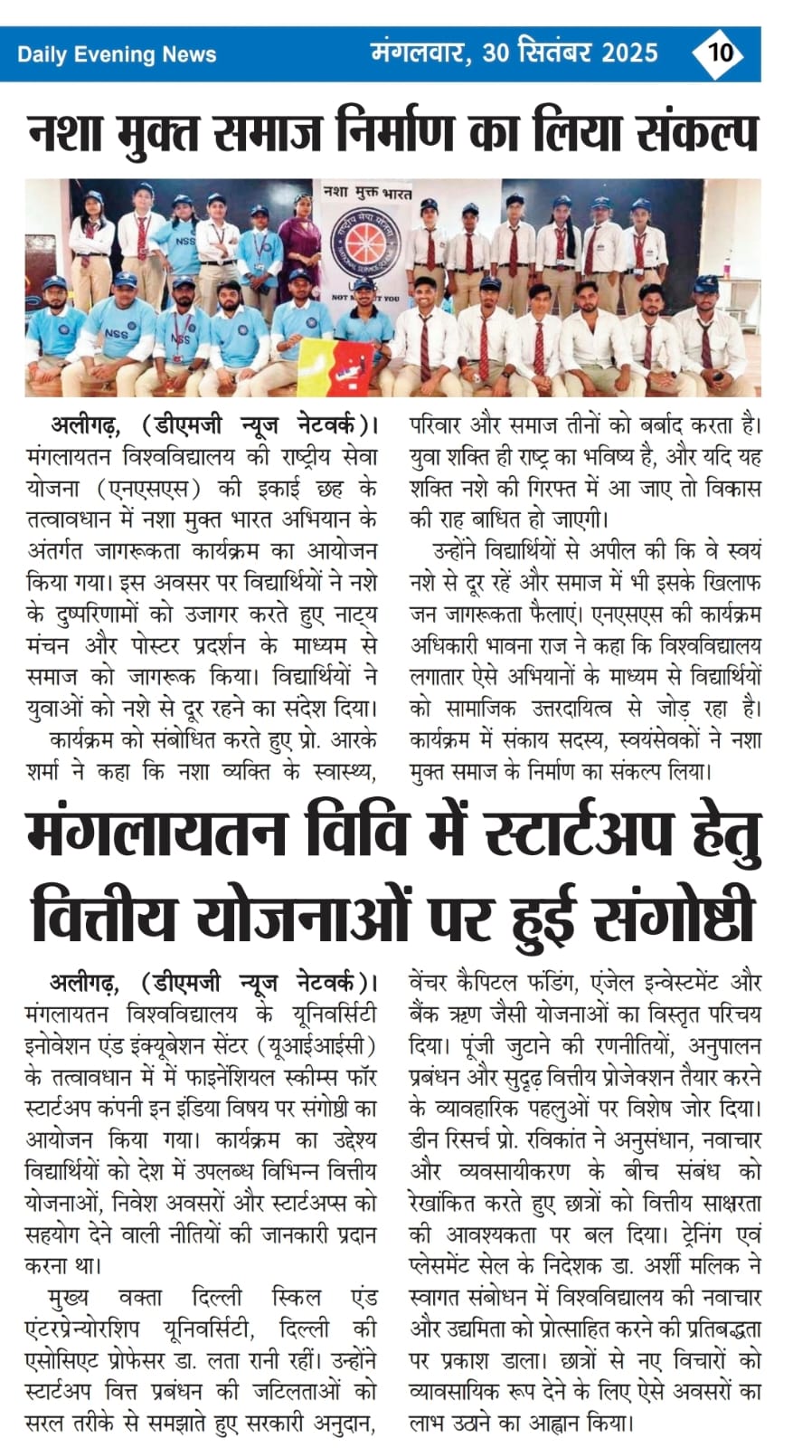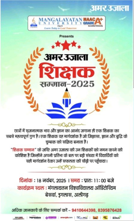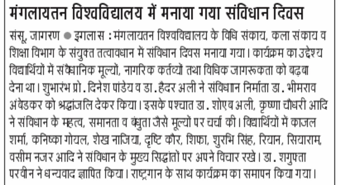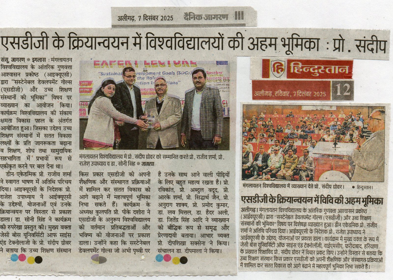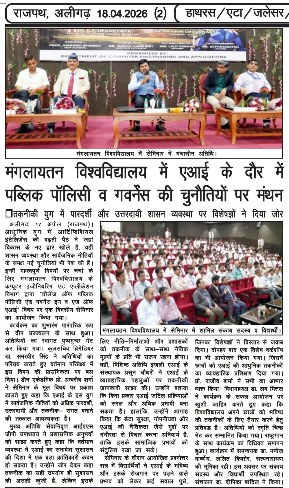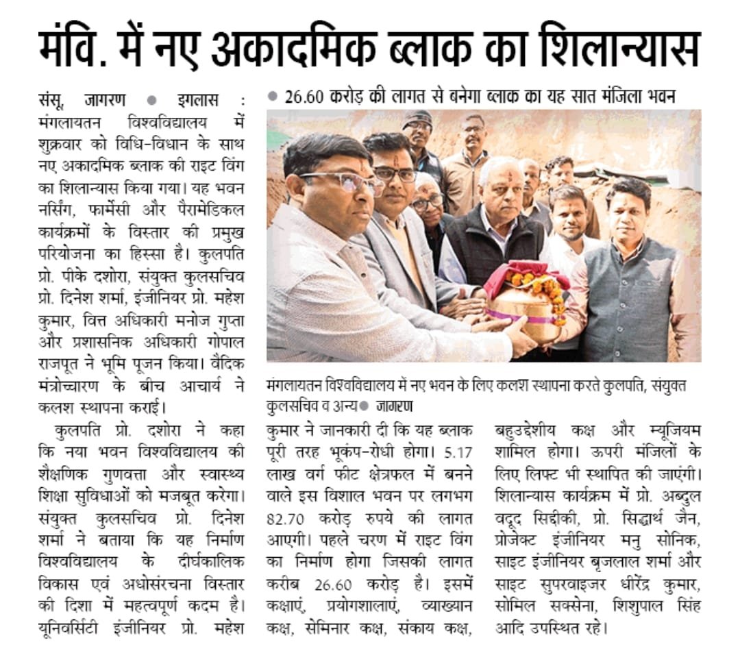 Mangalayatan University garnered significant attention in media with a feature highlighting departmental programs, community initiatives and activities. The article praised the university's commitment to academic excellence and its role in empowering academic units and their students through various skill development workshops and internships. Notably, the piece discussed the institution's efforts in promoting sustainable practices on campus, including eco-friendly initiatives that resonate with the university's mission to foster responsible citizens.This press clipping not only reflects the university's achievements but also its dedication to creating a vibrant learning environment, positioning Mangalayatan University as a cornerstone of educational development in the region. The coverage has sparked interest among prospective students and parents alike.