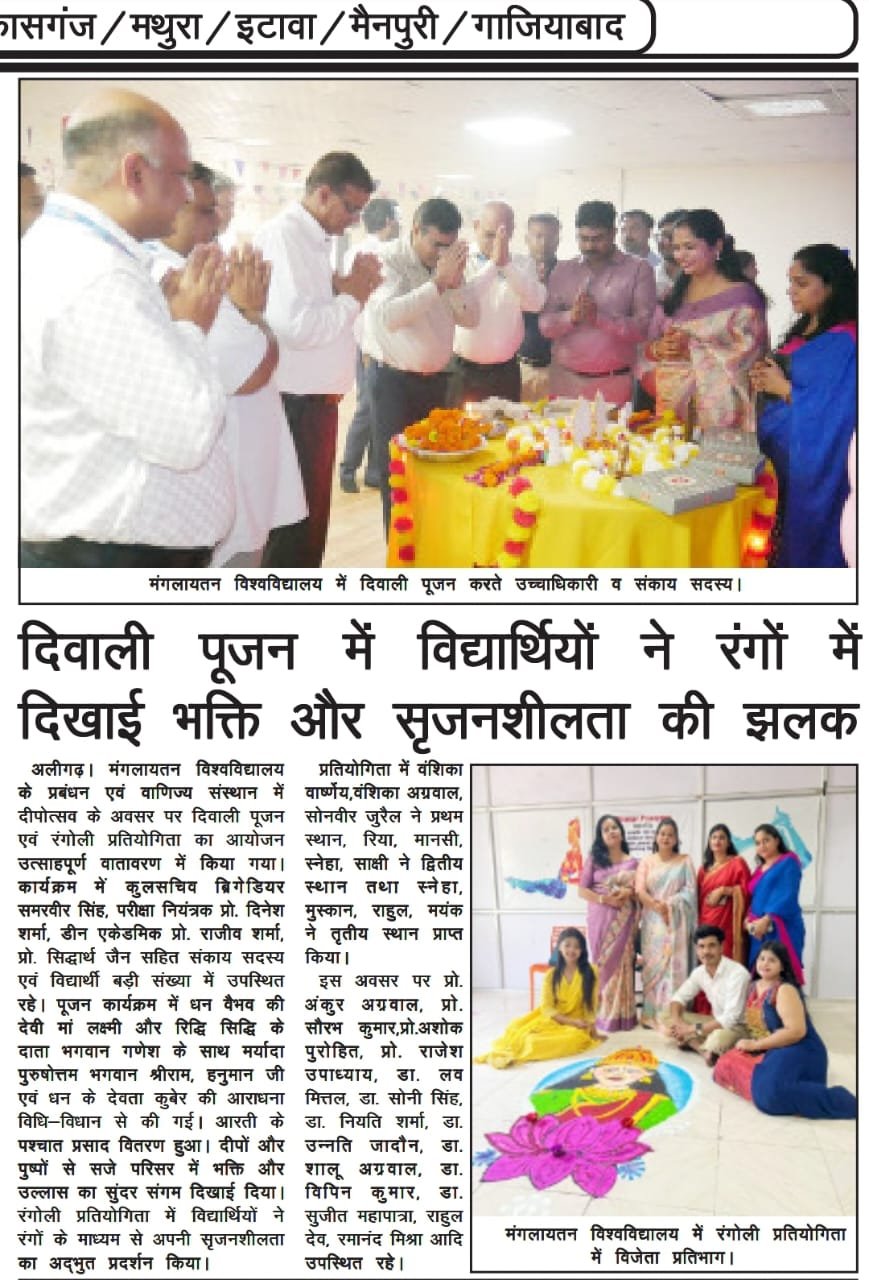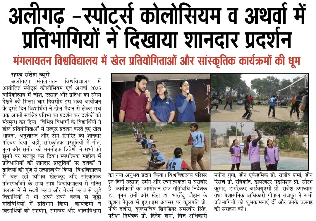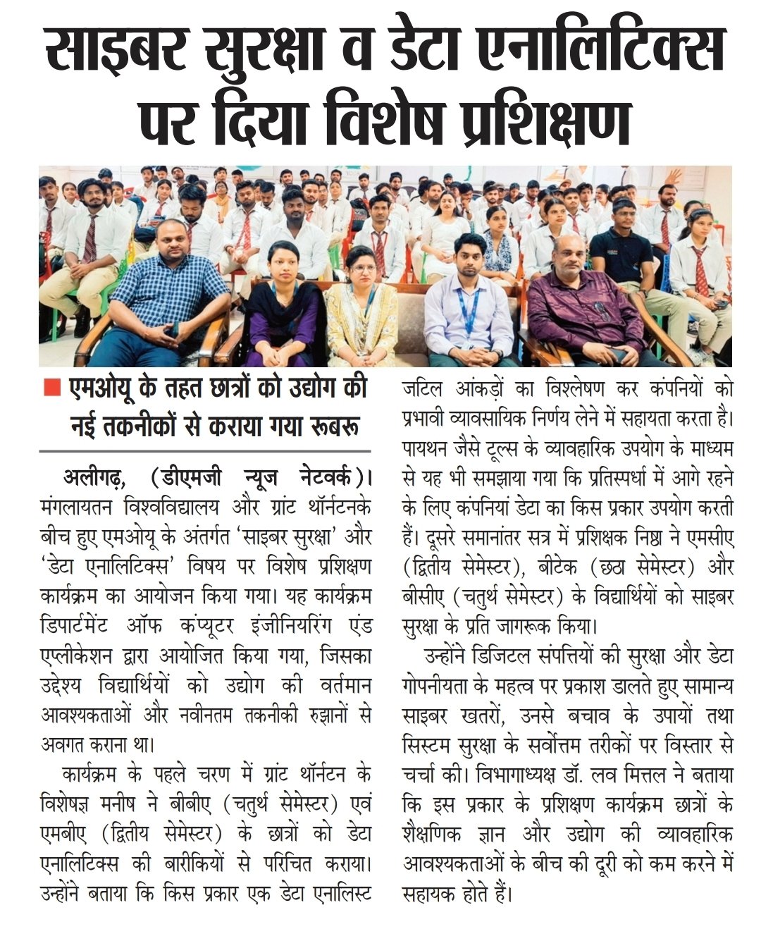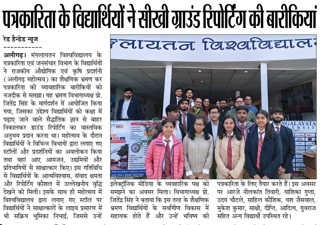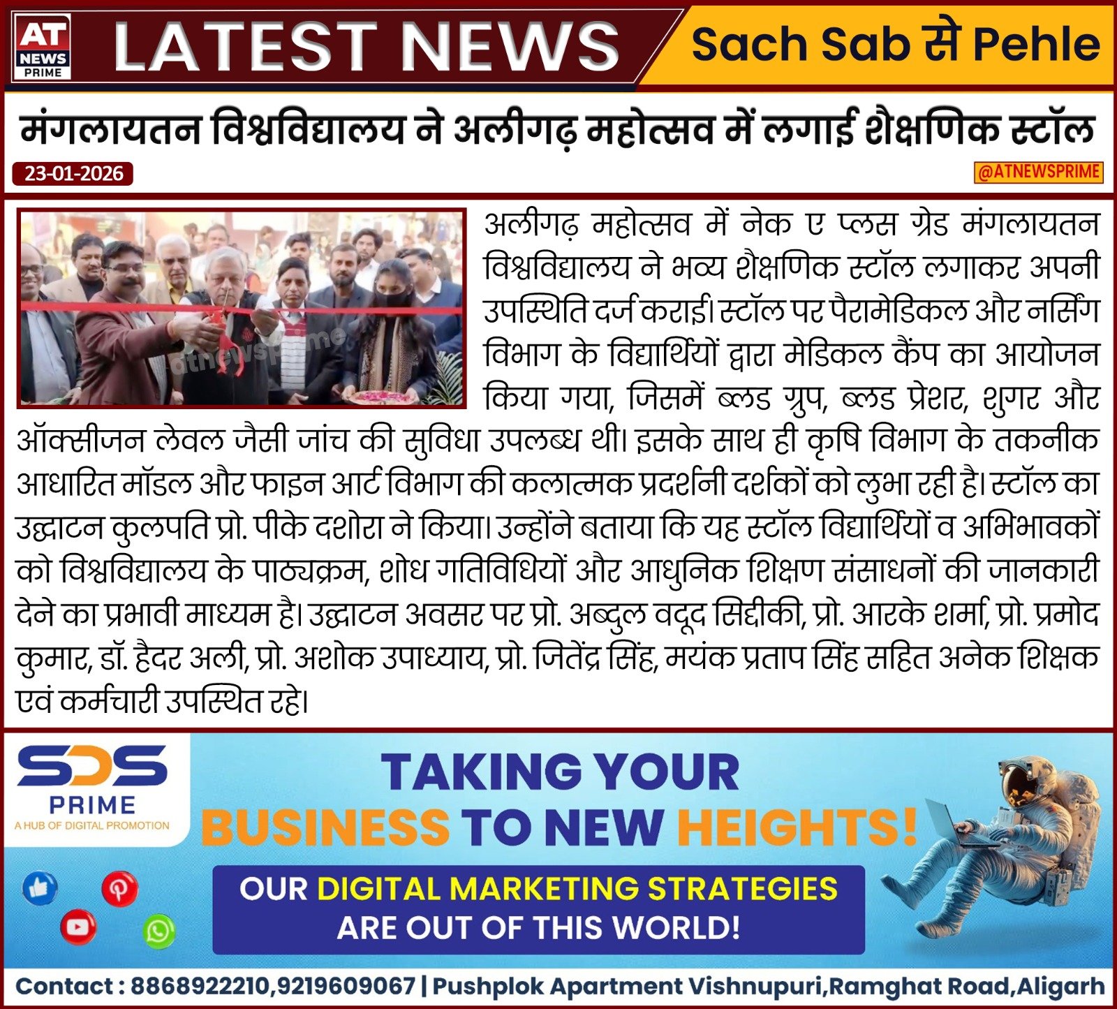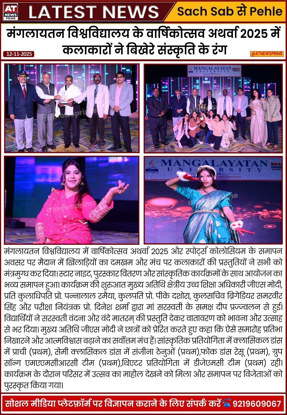 Mangalayatan University garnered significant attention in media with a feature highlighting departmental programs, community initiatives and activities. The article praised the university's commitment to academic excellence and its role in empowering academic units and their students through various skill development workshops and internships. Notably, the piece discussed the institution's efforts in promoting sustainable practices on campus, including eco-friendly initiatives that resonate with the university's mission to foster responsible citizens.This press clipping not only reflects the university's achievements but also its dedication to creating a vibrant learning environment, positioning Mangalayatan University as a cornerstone of educational development in the region. The coverage has sparked interest among prospective students and parents alike.