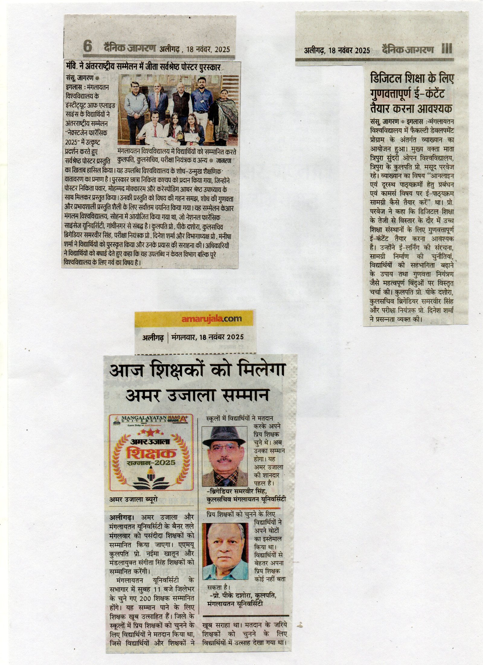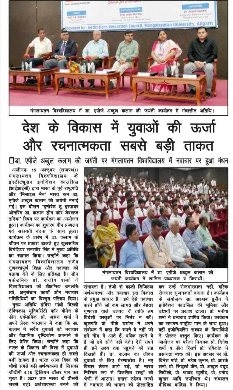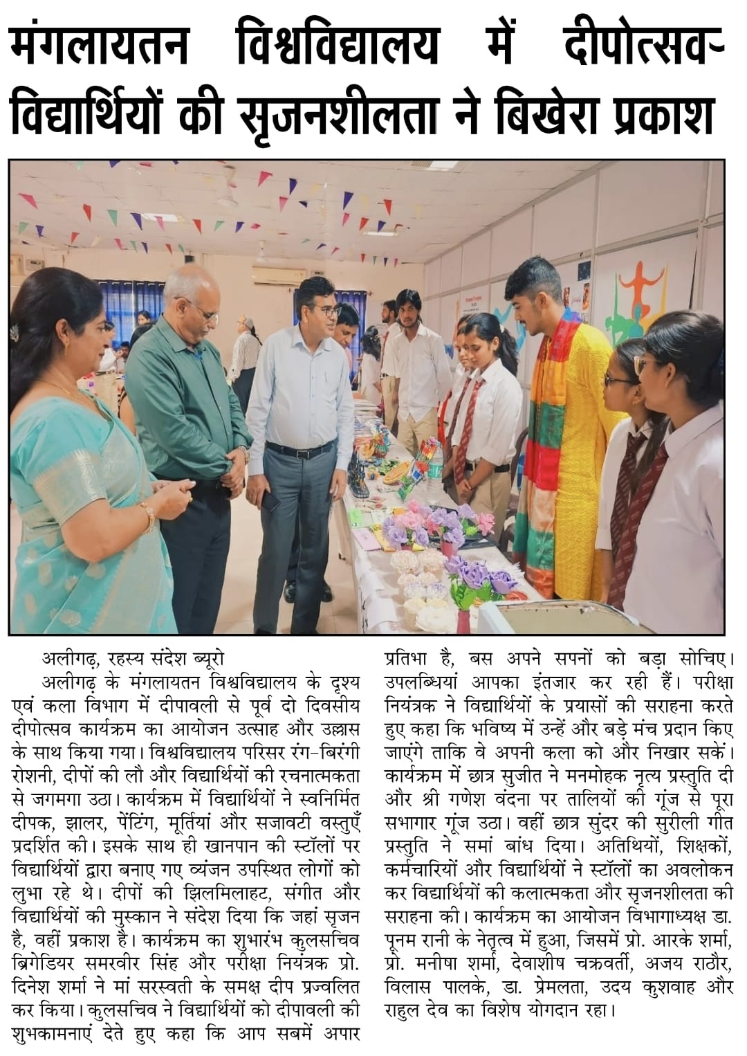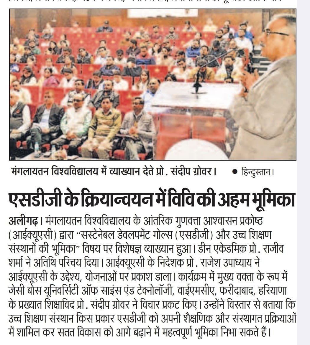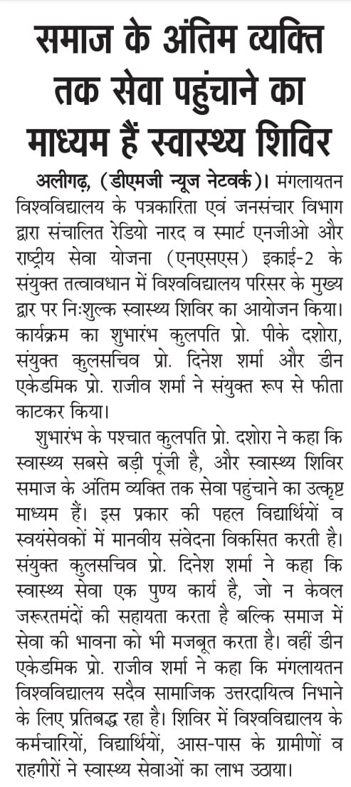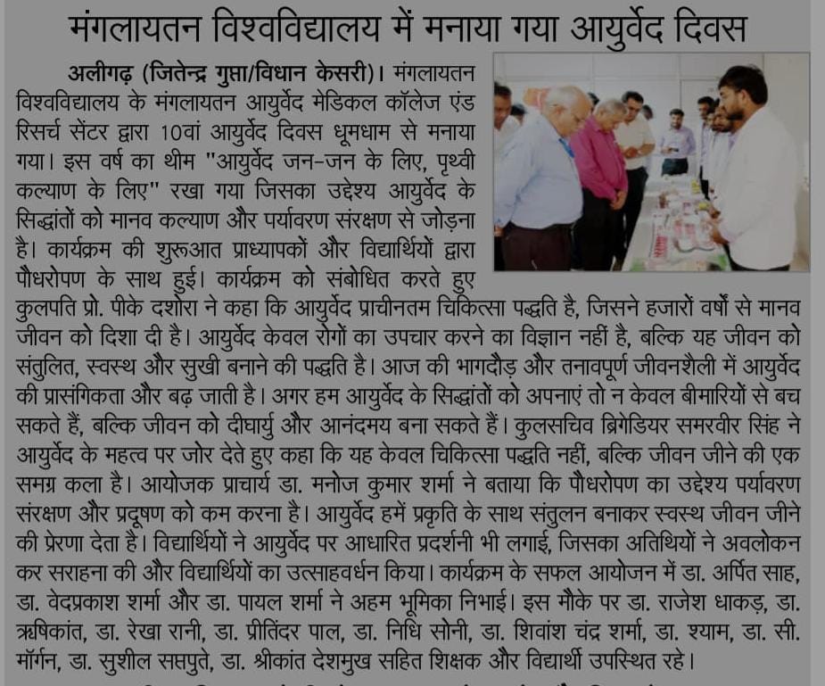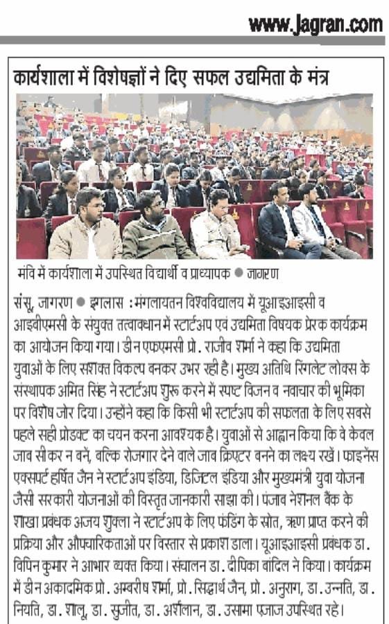 Mangalayatan University garnered significant attention in media with a feature highlighting departmental programs, community initiatives and activities. The article praised the university's commitment to academic excellence and its role in empowering academic units and their students through various skill development workshops and internships. Notably, the piece discussed the institution's efforts in promoting sustainable practices on campus, including eco-friendly initiatives that resonate with the university's mission to foster responsible citizens.This press clipping not only reflects the university's achievements but also its dedication to creating a vibrant learning environment, positioning Mangalayatan University as a cornerstone of educational development in the region. The coverage has sparked interest among prospective students and parents alike.
