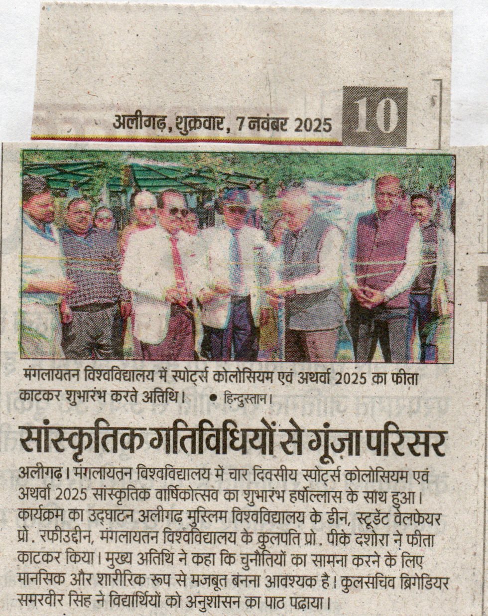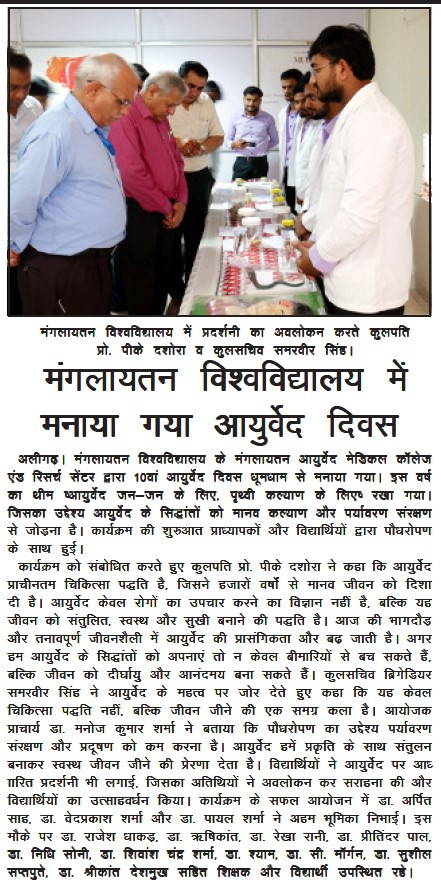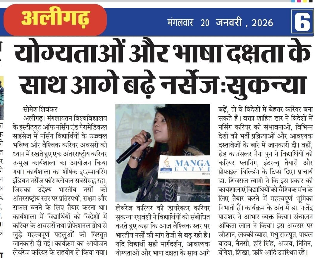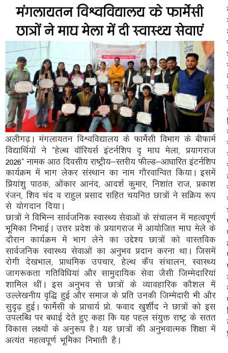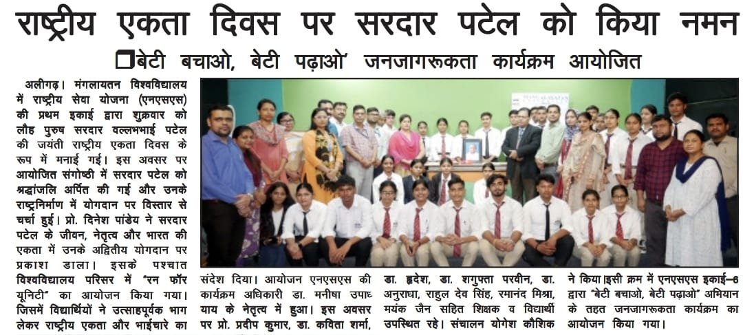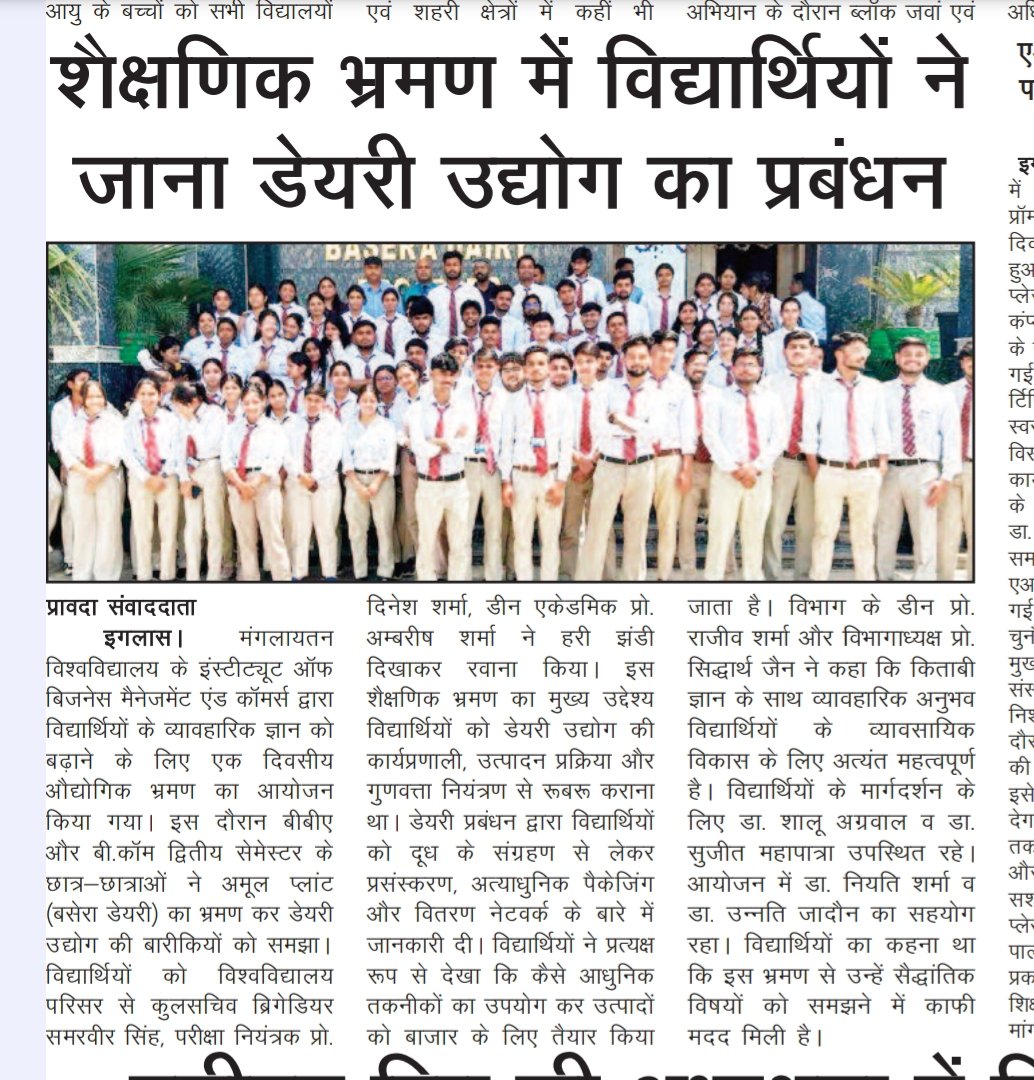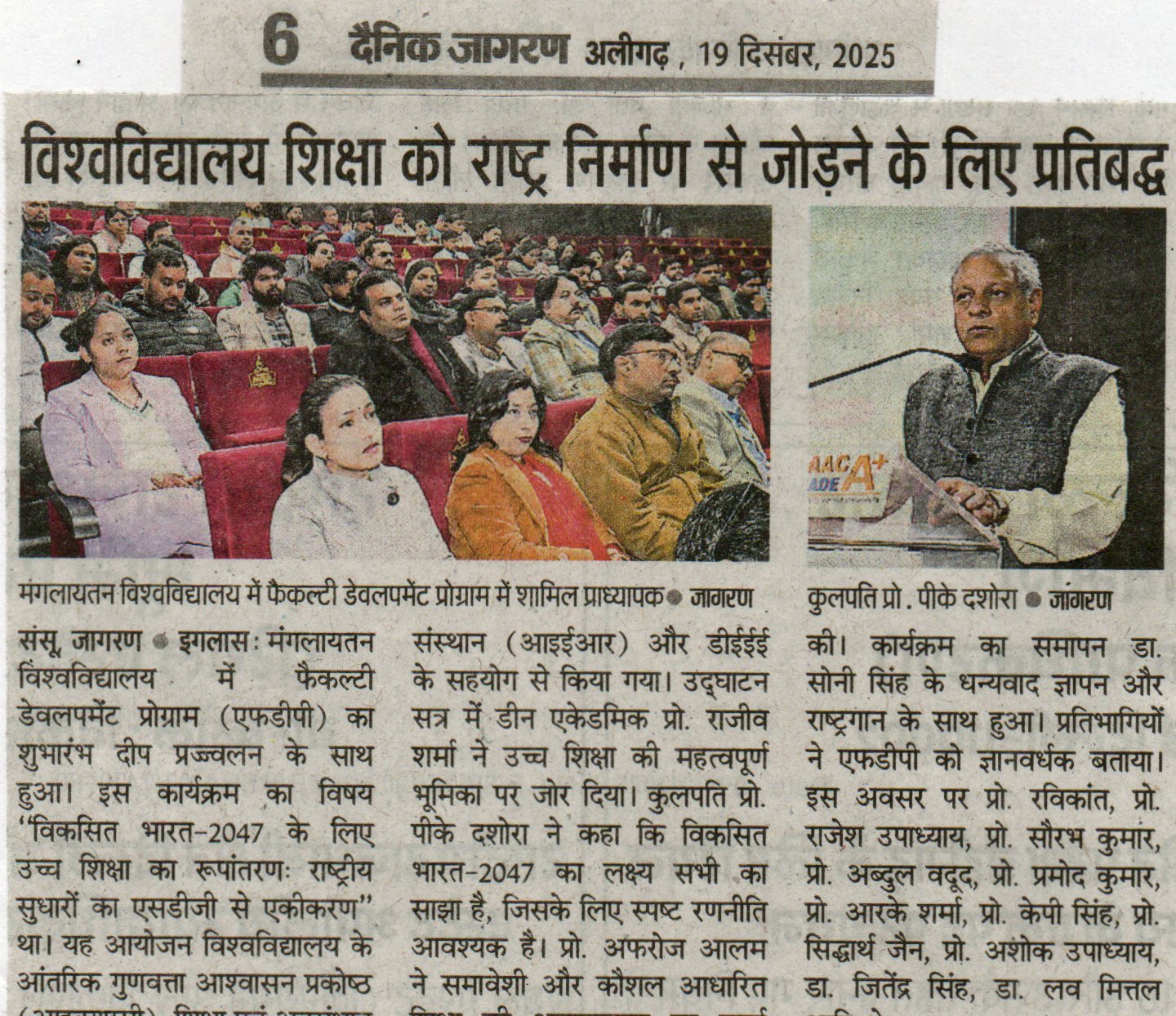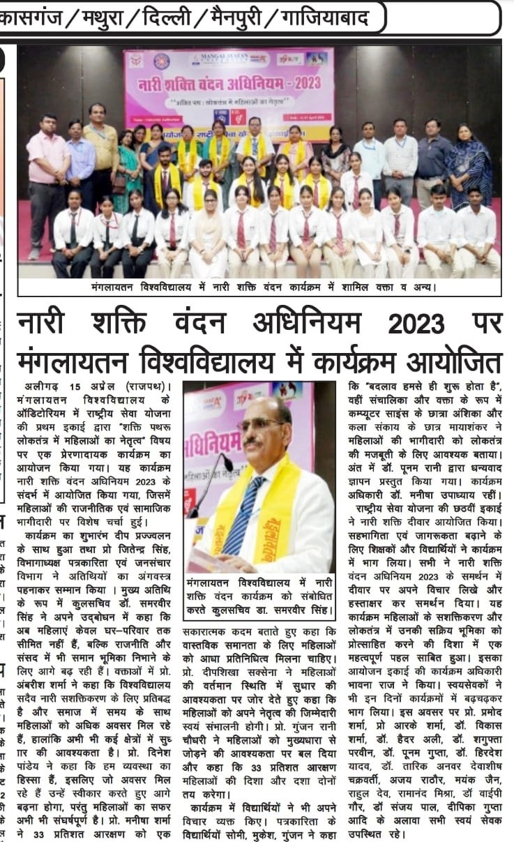 Mangalayatan University garnered significant attention in media with a feature highlighting departmental programs, community initiatives and activities. The article praised the university's commitment to academic excellence and its role in empowering academic units and their students through various skill development workshops and internships. Notably, the piece discussed the institution's efforts in promoting sustainable practices on campus, including eco-friendly initiatives that resonate with the university's mission to foster responsible citizens.This press clipping not only reflects the university's achievements but also its dedication to creating a vibrant learning environment, positioning Mangalayatan University as a cornerstone of educational development in the region. The coverage has sparked interest among prospective students and parents alike.