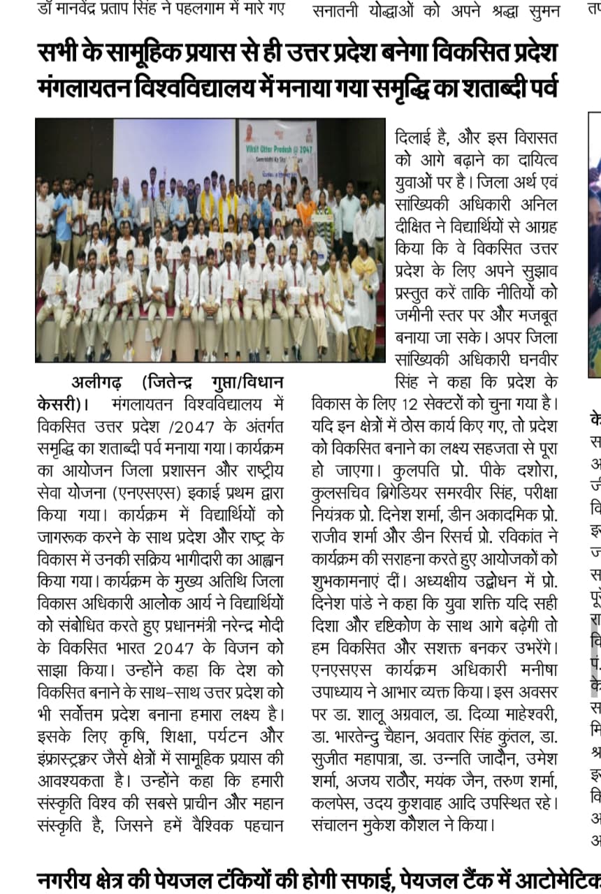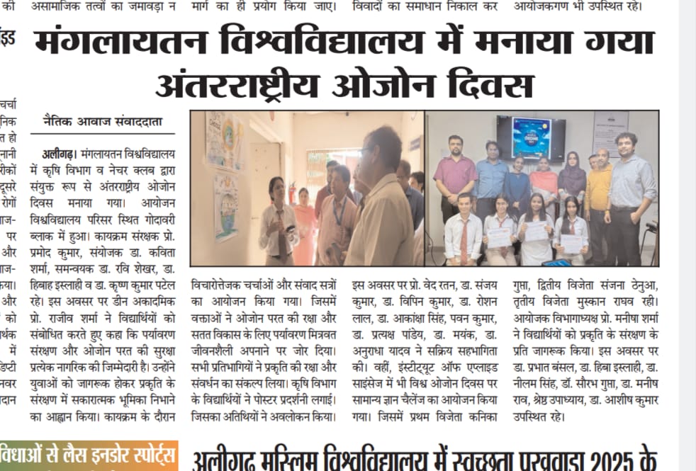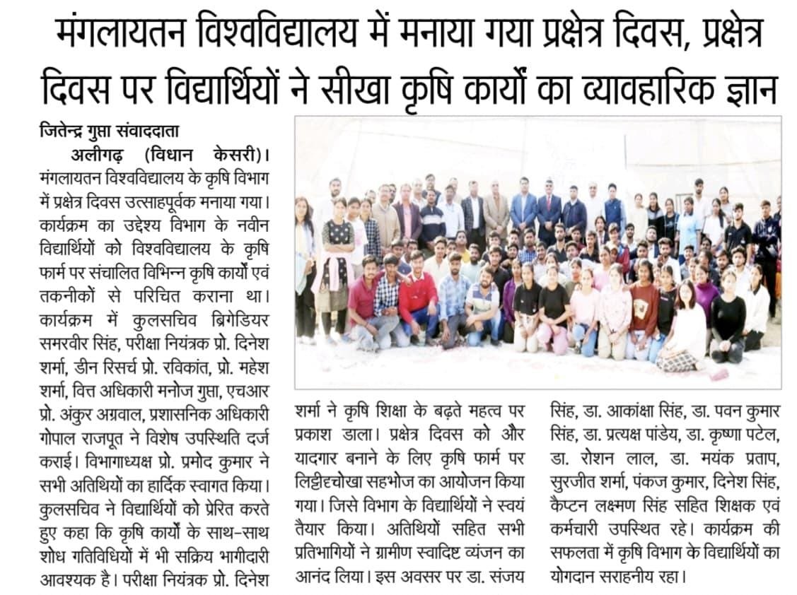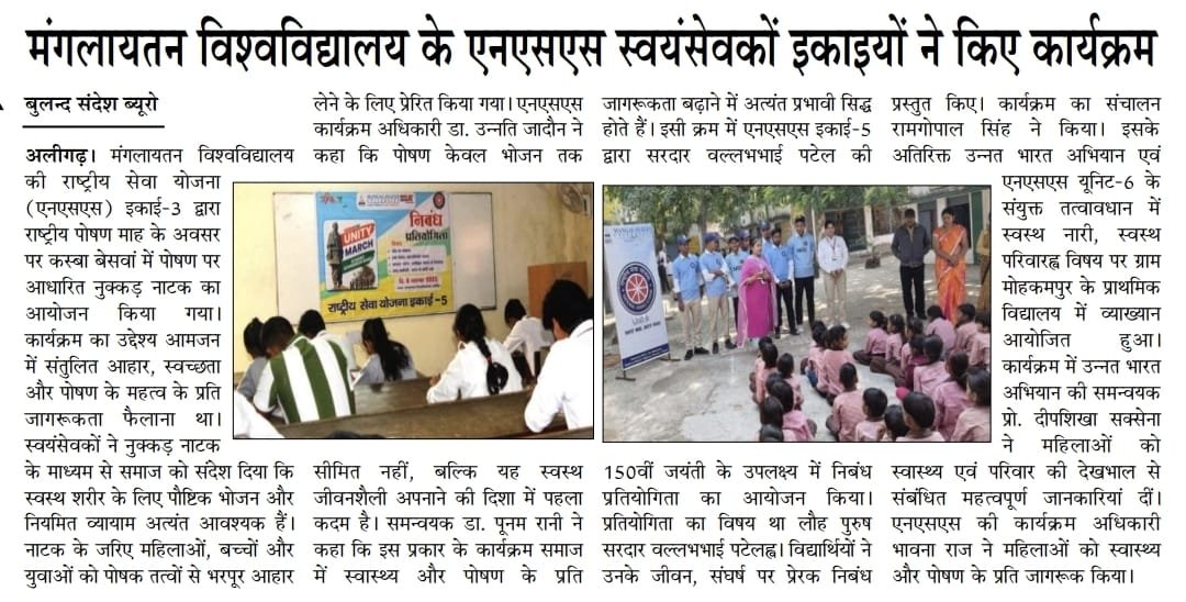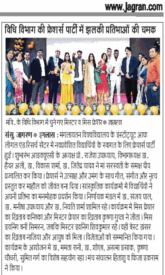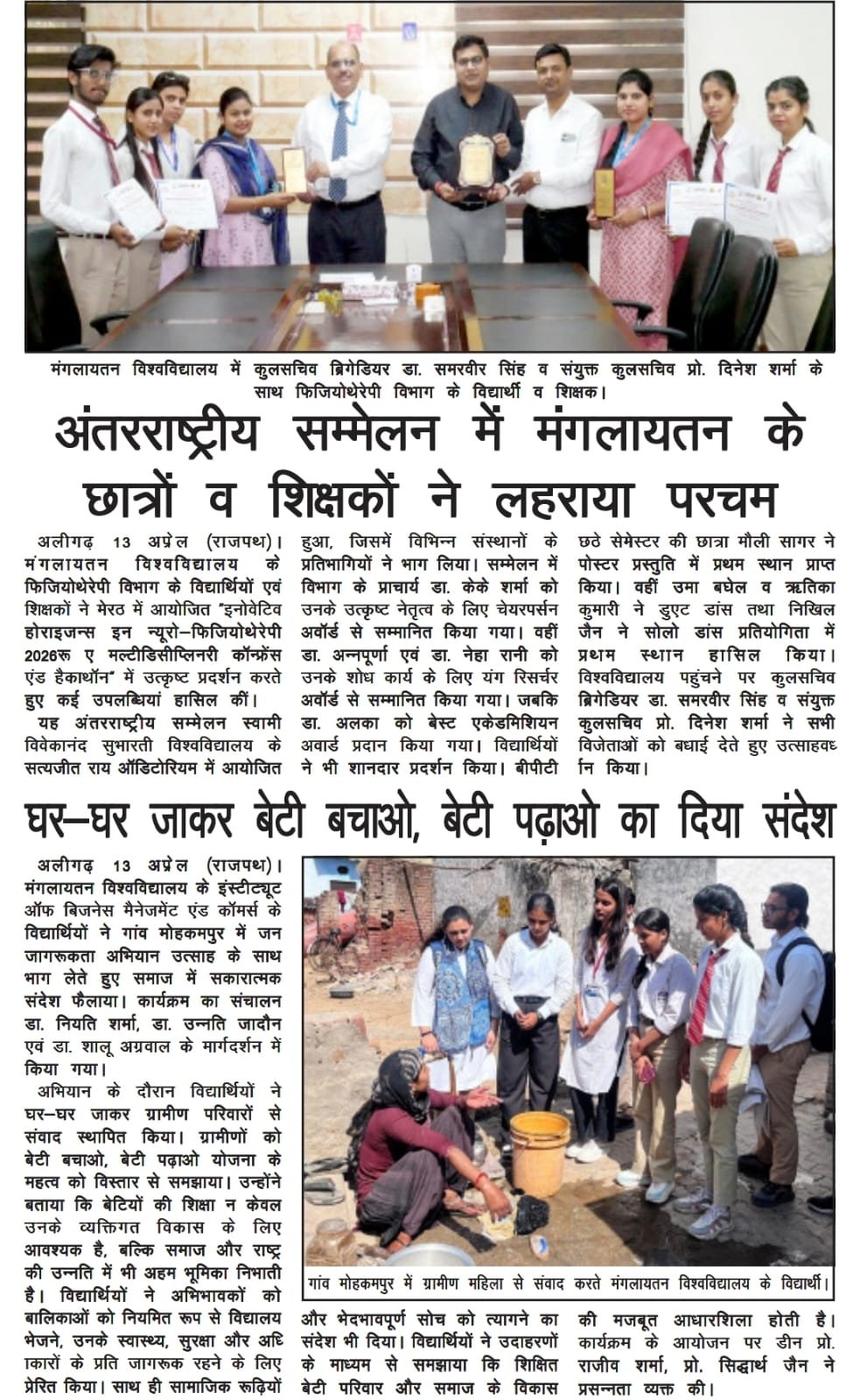 Mangalayatan University garnered significant attention in media with a feature highlighting departmental programs, community initiatives and activities. The article praised the university's commitment to academic excellence and its role in empowering academic units and their students through various skill development workshops and internships. Notably, the piece discussed the institution's efforts in promoting sustainable practices on campus, including eco-friendly initiatives that resonate with the university's mission to foster responsible citizens.This press clipping not only reflects the university's achievements but also its dedication to creating a vibrant learning environment, positioning Mangalayatan University as a cornerstone of educational development in the region. The coverage has sparked interest among prospective students and parents alike.