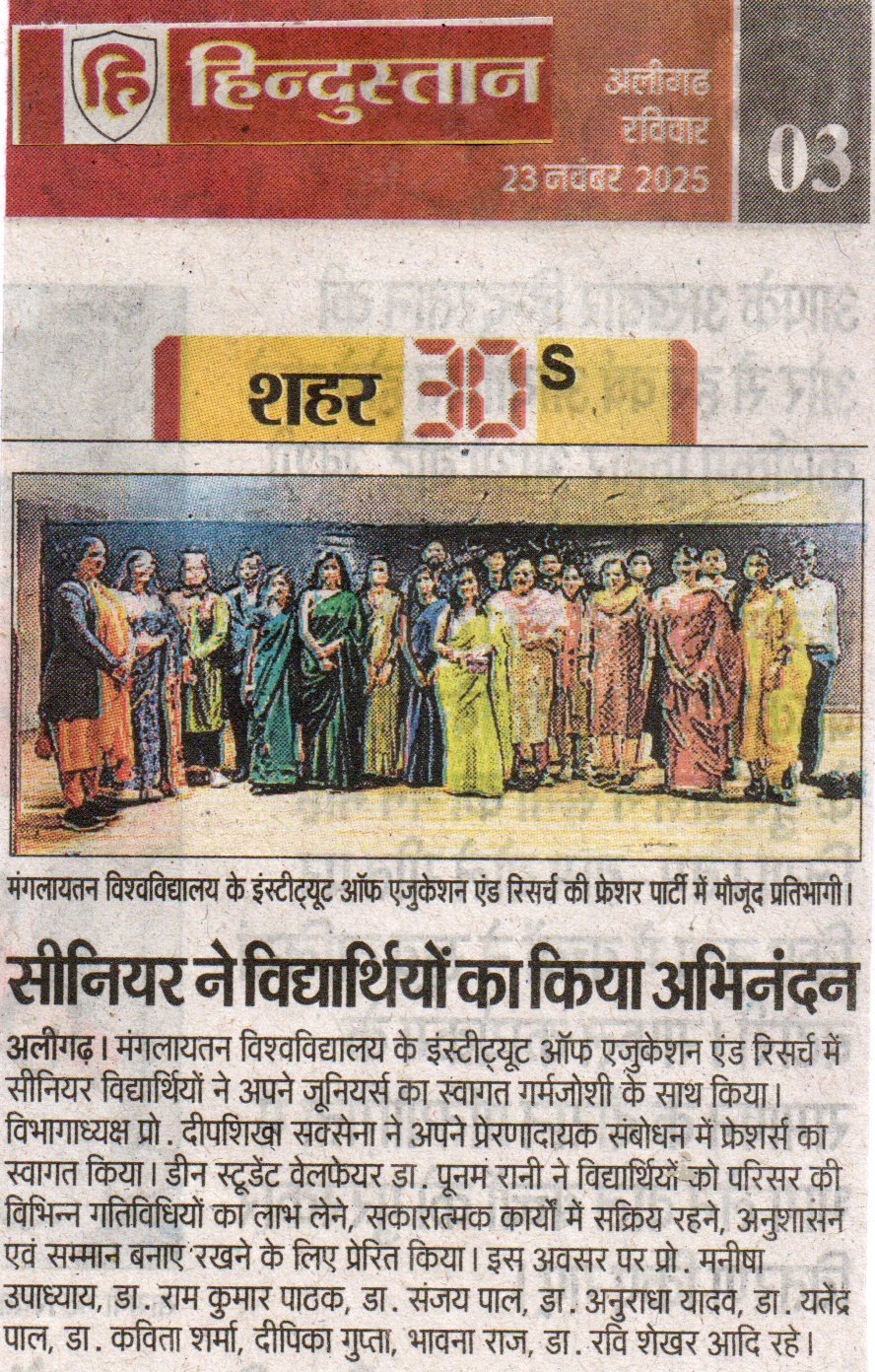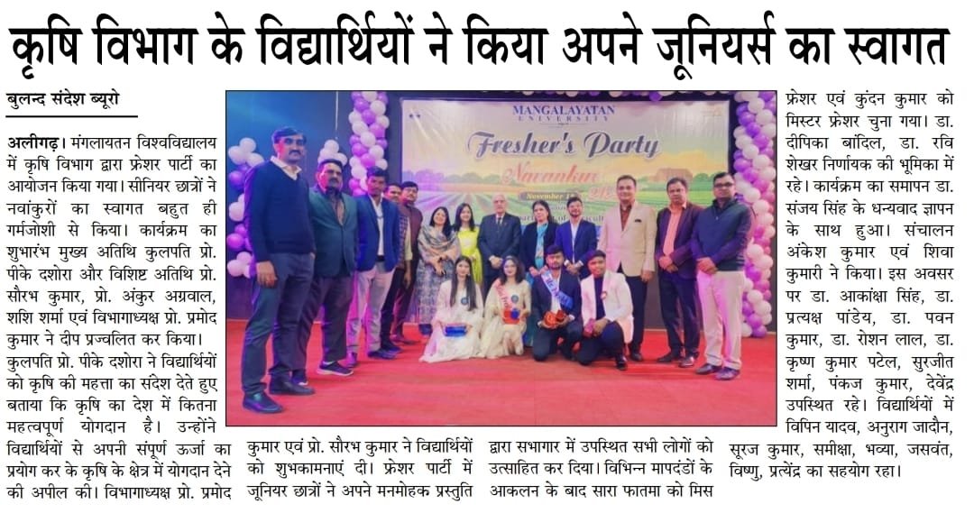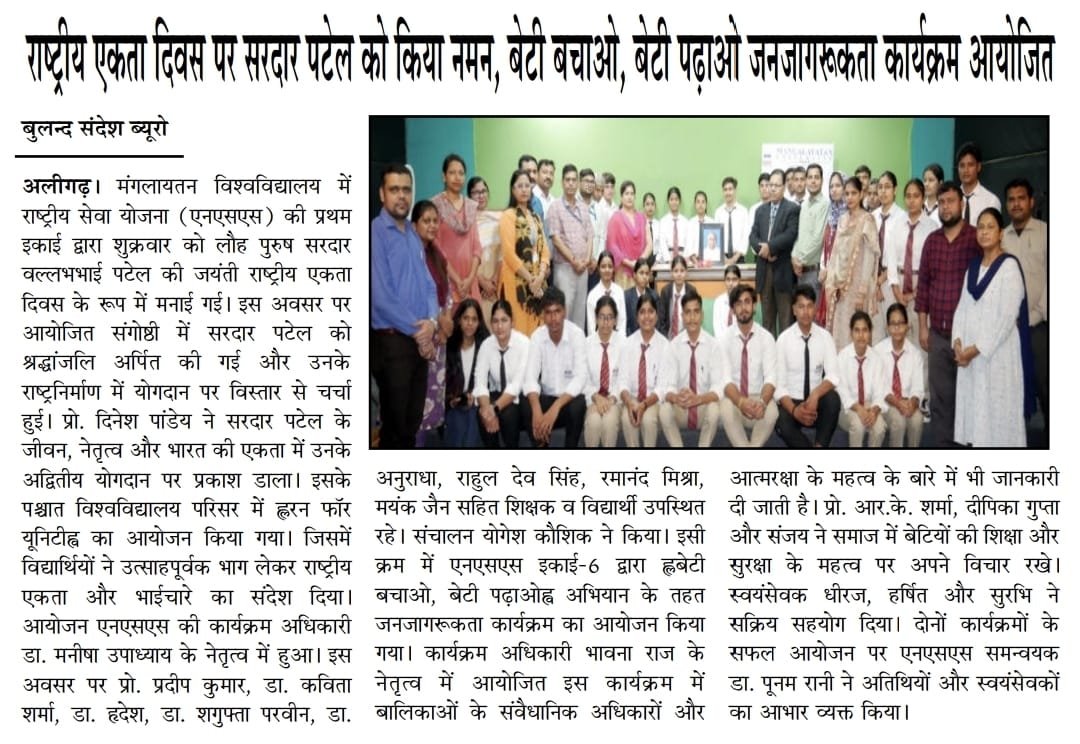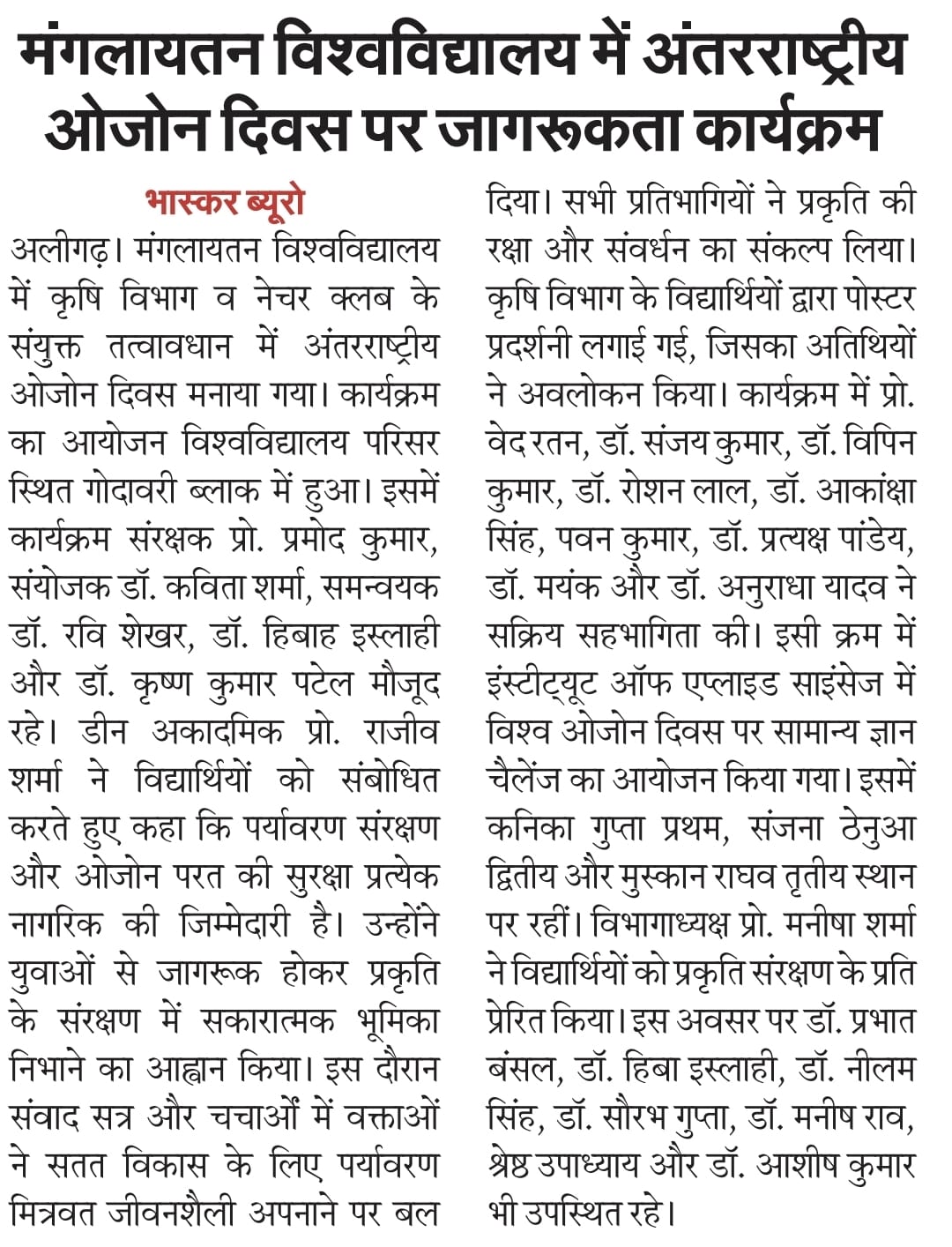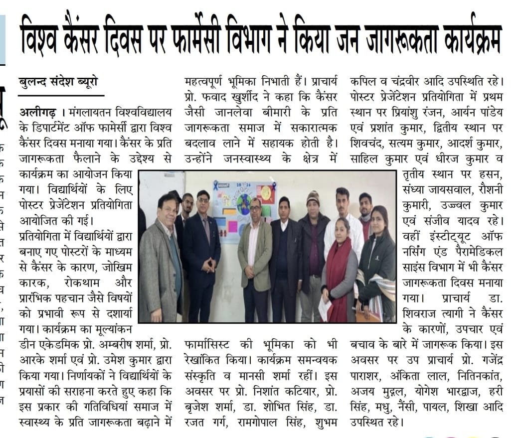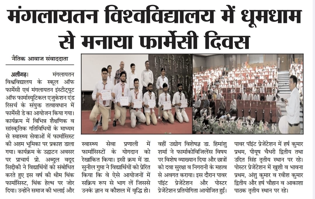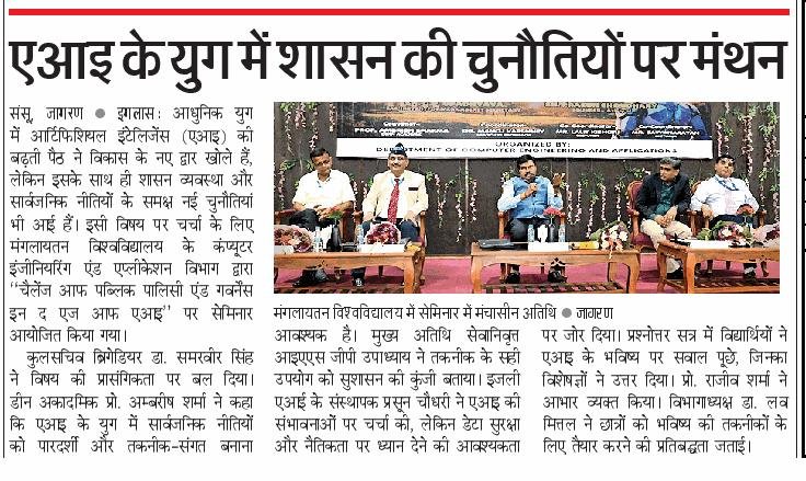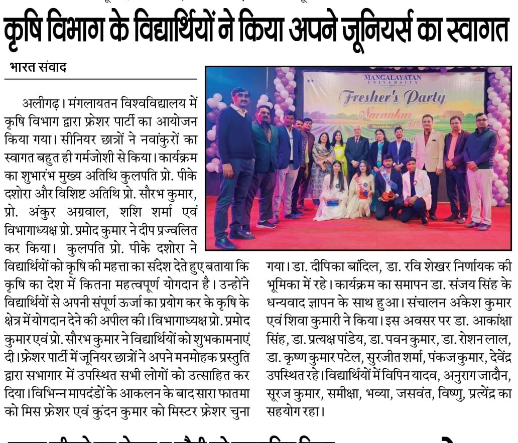 Mangalayatan University garnered significant attention in media with a feature highlighting departmental programs, community initiatives and activities. The article praised the university's commitment to academic excellence and its role in empowering academic units and their students through various skill development workshops and internships. Notably, the piece discussed the institution's efforts in promoting sustainable practices on campus, including eco-friendly initiatives that resonate with the university's mission to foster responsible citizens.This press clipping not only reflects the university's achievements but also its dedication to creating a vibrant learning environment, positioning Mangalayatan University as a cornerstone of educational development in the region. The coverage has sparked interest among prospective students and parents alike.