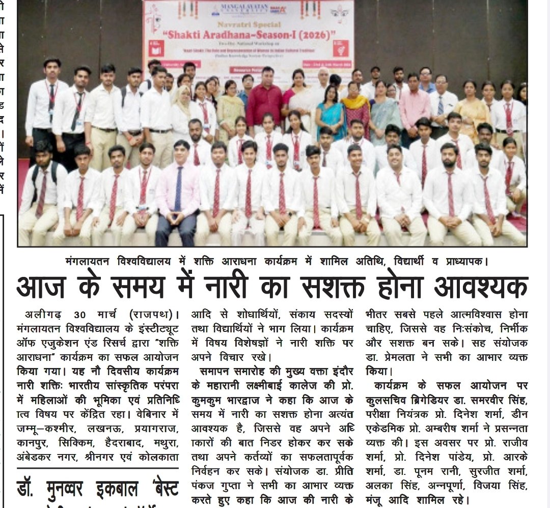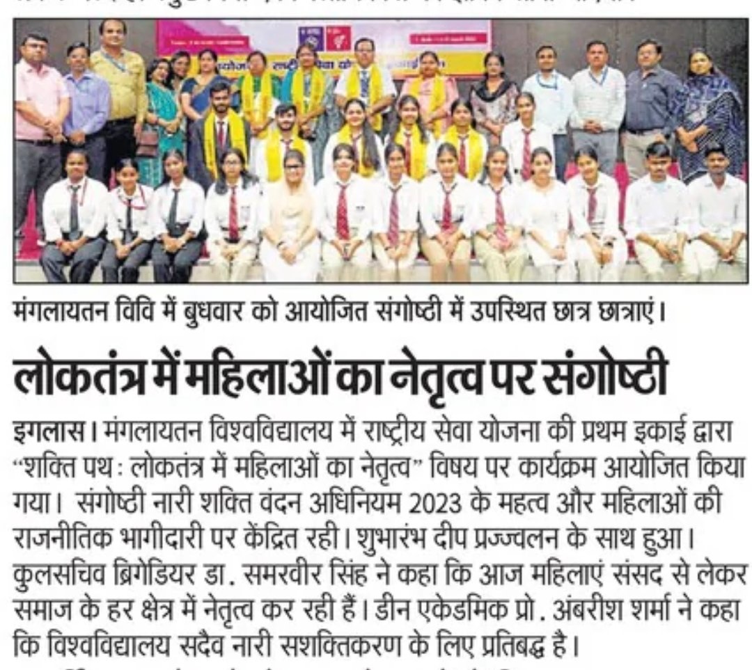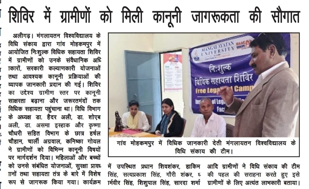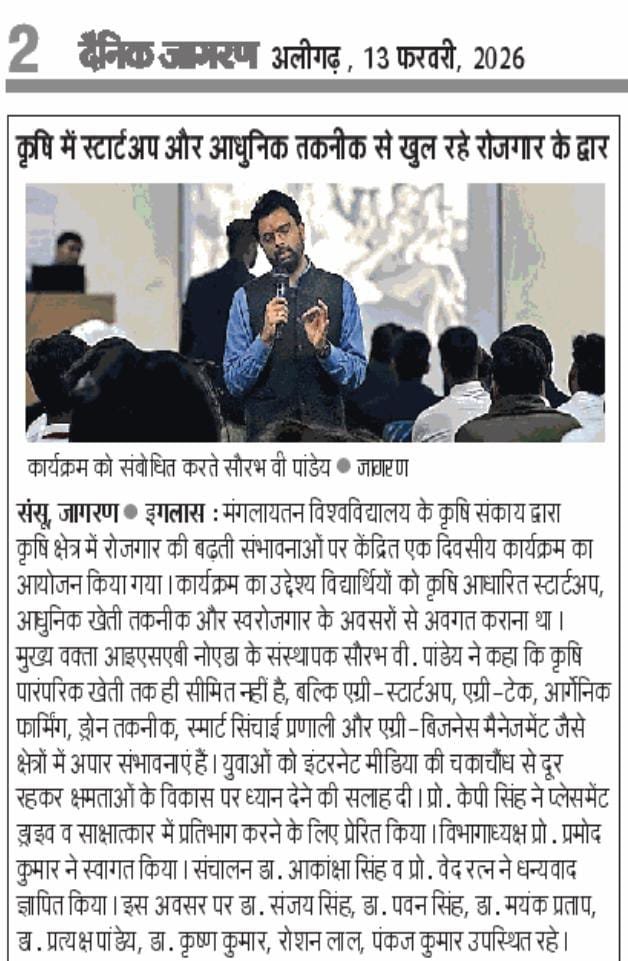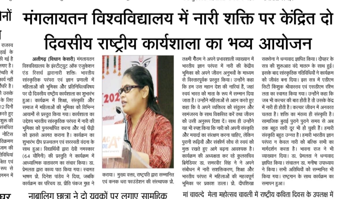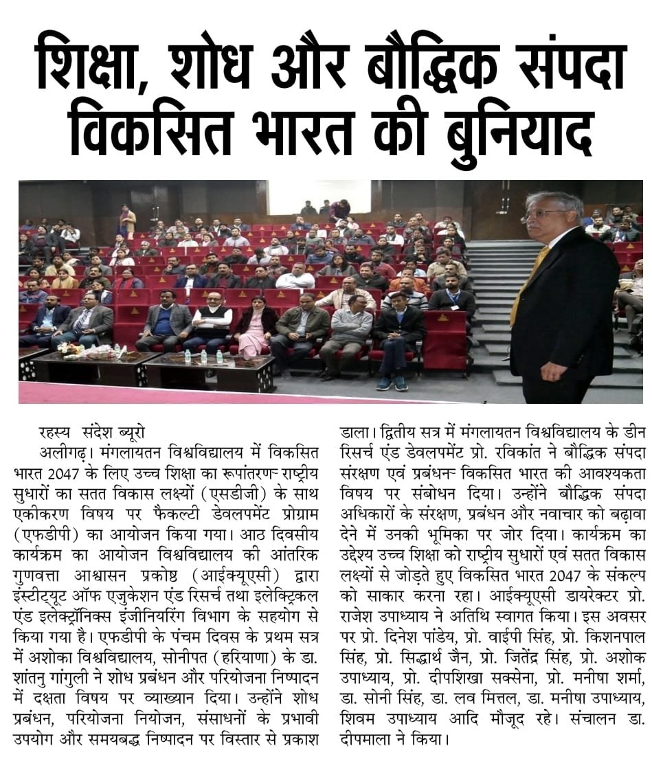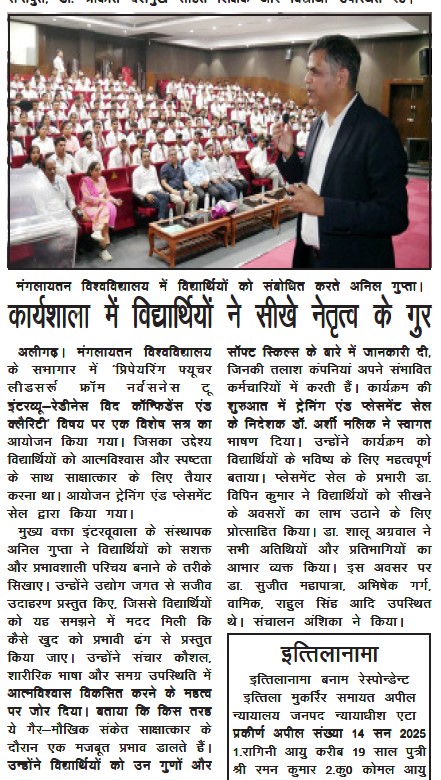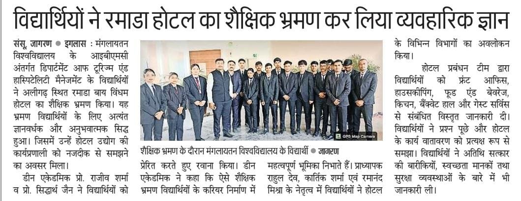 Mangalayatan University garnered significant attention in media with a feature highlighting departmental programs, community initiatives and activities. The article praised the university's commitment to academic excellence and its role in empowering academic units and their students through various skill development workshops and internships. Notably, the piece discussed the institution's efforts in promoting sustainable practices on campus, including eco-friendly initiatives that resonate with the university's mission to foster responsible citizens.This press clipping not only reflects the university's achievements but also its dedication to creating a vibrant learning environment, positioning Mangalayatan University as a cornerstone of educational development in the region. The coverage has sparked interest among prospective students and parents alike.
