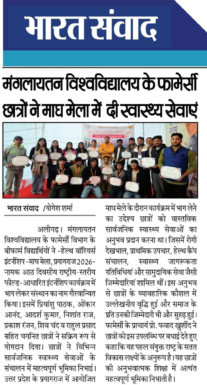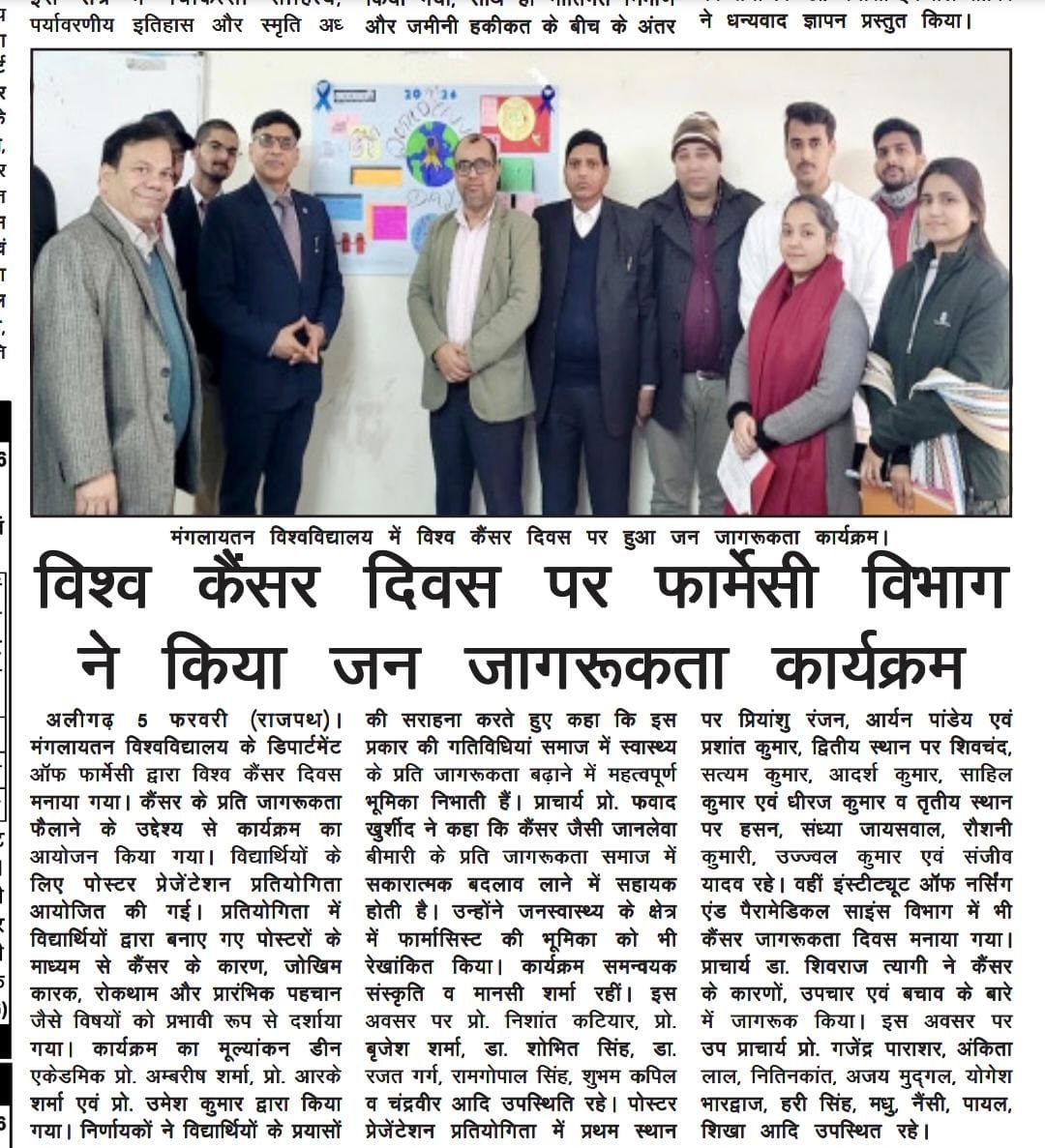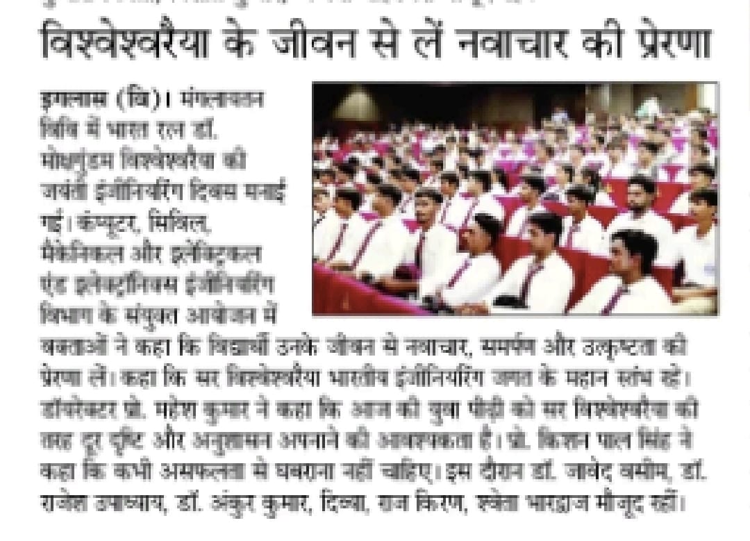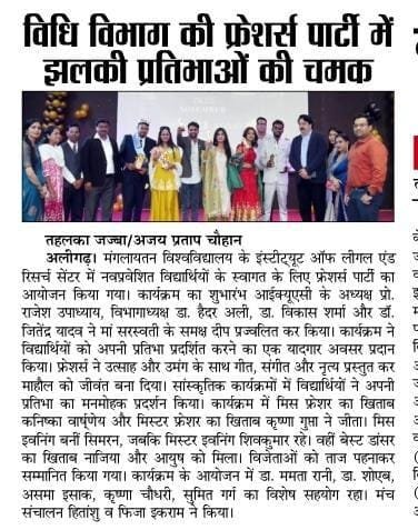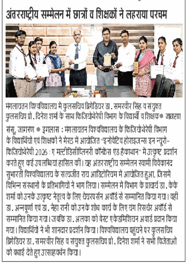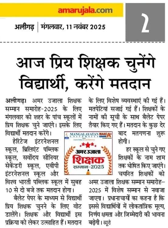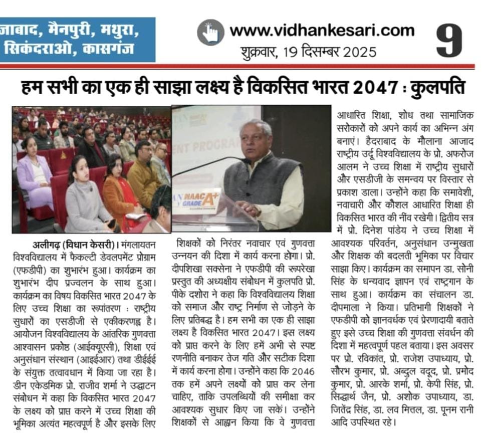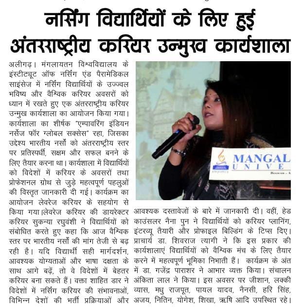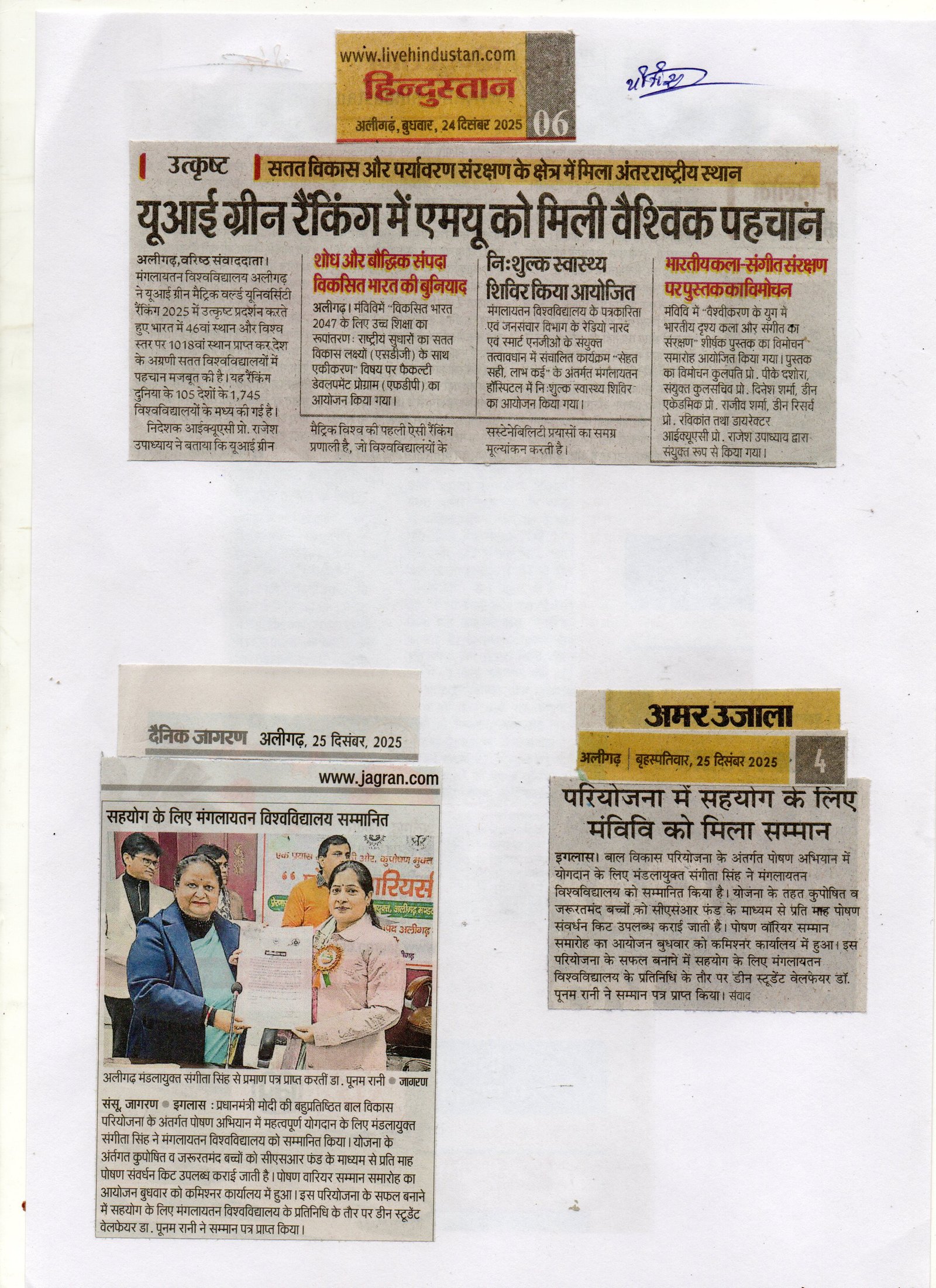 Mangalayatan University garnered significant attention in media with a feature highlighting departmental programs, community initiatives and activities. The article praised the university's commitment to academic excellence and its role in empowering academic units and their students through various skill development workshops and internships. Notably, the piece discussed the institution's efforts in promoting sustainable practices on campus, including eco-friendly initiatives that resonate with the university's mission to foster responsible citizens.This press clipping not only reflects the university's achievements but also its dedication to creating a vibrant learning environment, positioning Mangalayatan University as a cornerstone of educational development in the region. The coverage has sparked interest among prospective students and parents alike.