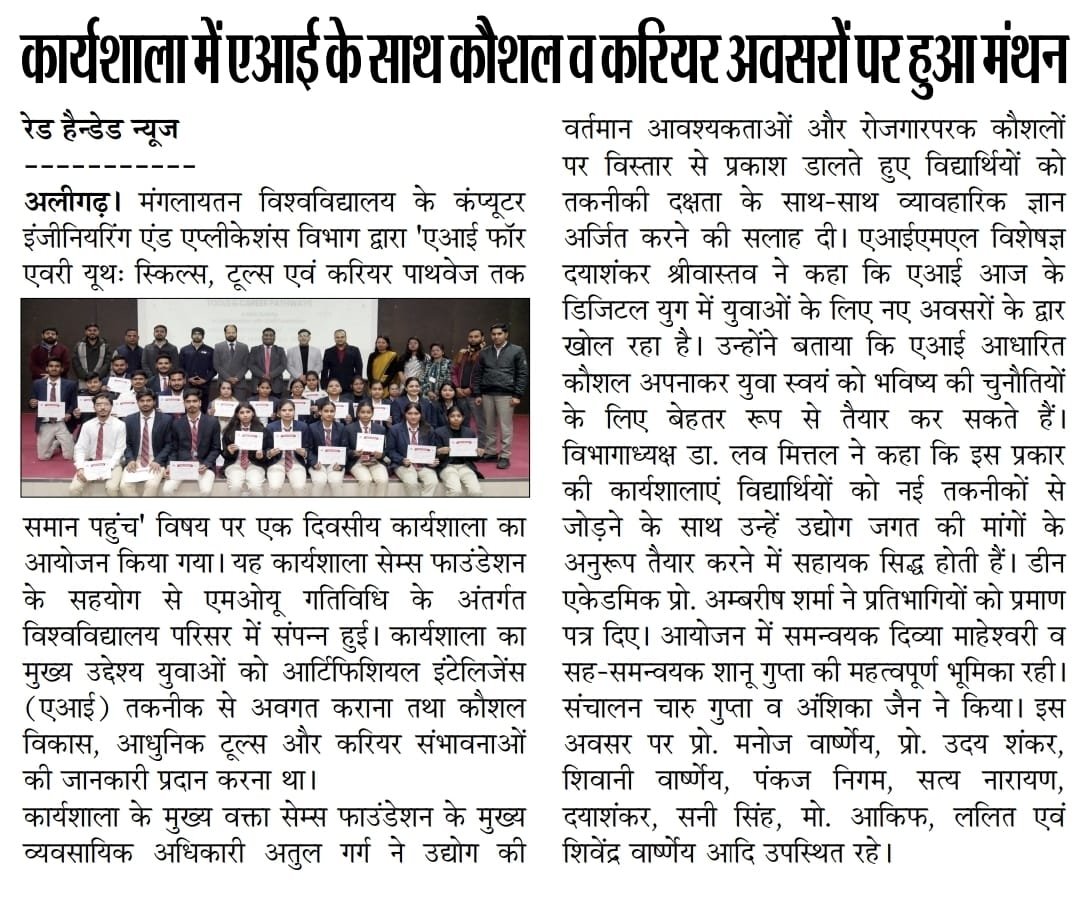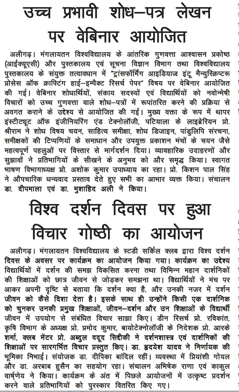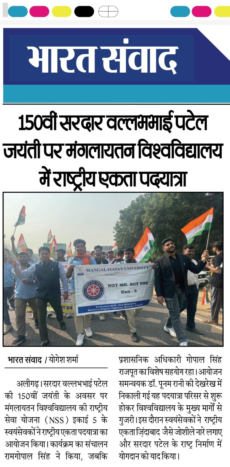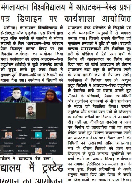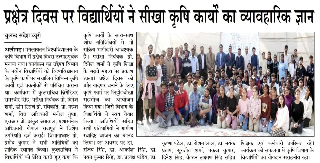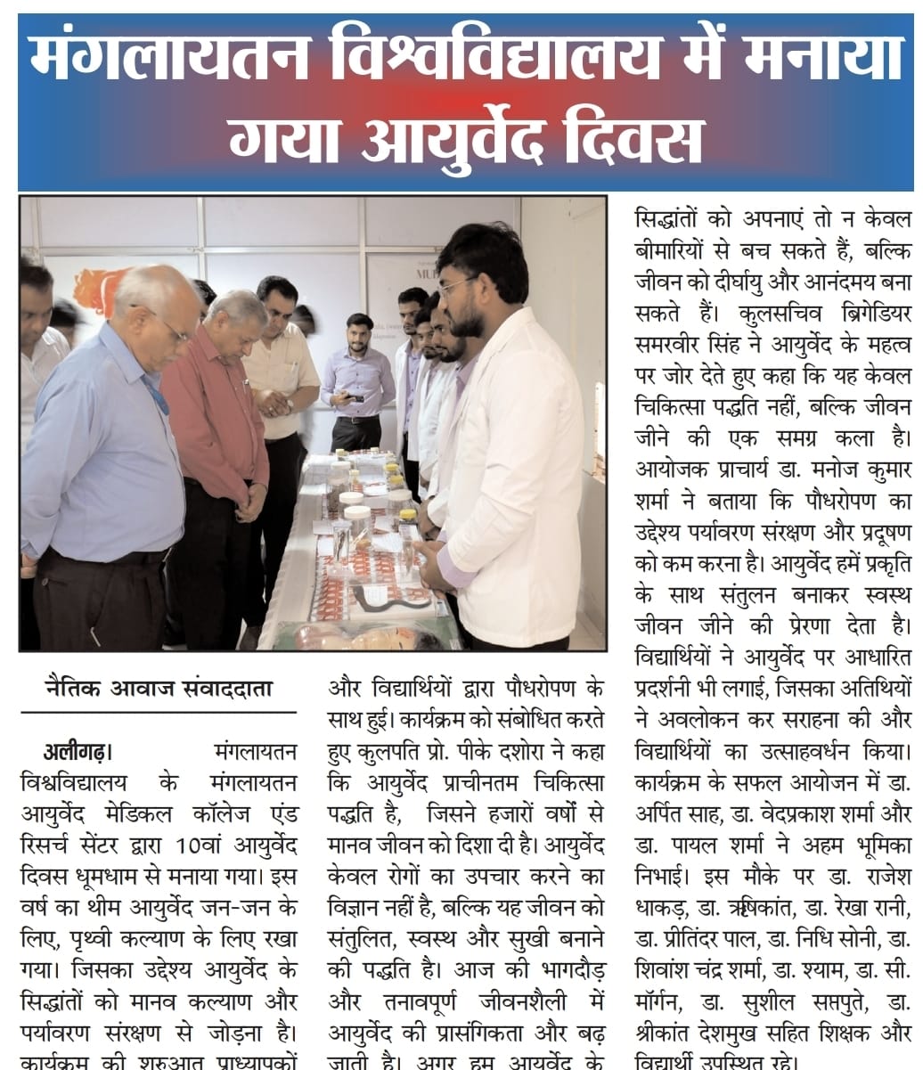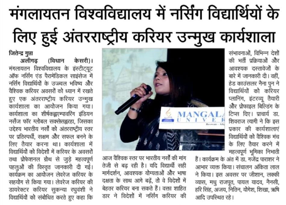 Mangalayatan University garnered significant attention in media with a feature highlighting departmental programs, community initiatives and activities. The article praised the university's commitment to academic excellence and its role in empowering academic units and their students through various skill development workshops and internships. Notably, the piece discussed the institution's efforts in promoting sustainable practices on campus, including eco-friendly initiatives that resonate with the university's mission to foster responsible citizens.This press clipping not only reflects the university's achievements but also its dedication to creating a vibrant learning environment, positioning Mangalayatan University as a cornerstone of educational development in the region. The coverage has sparked interest among prospective students and parents alike.