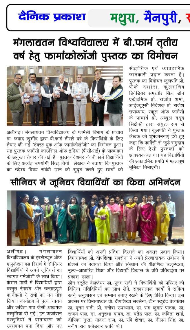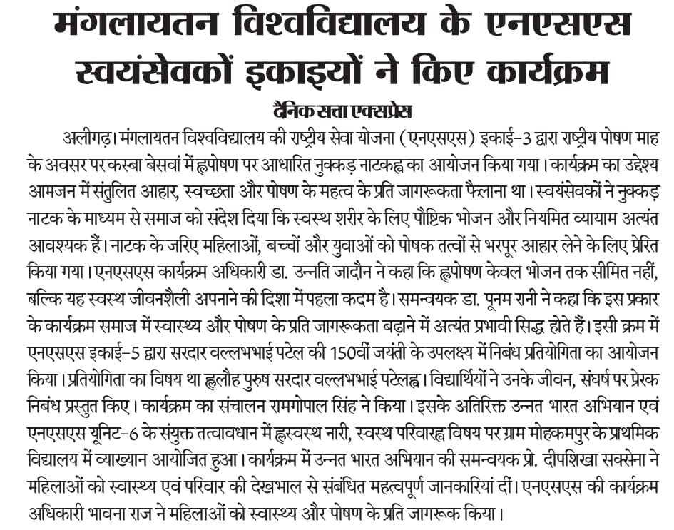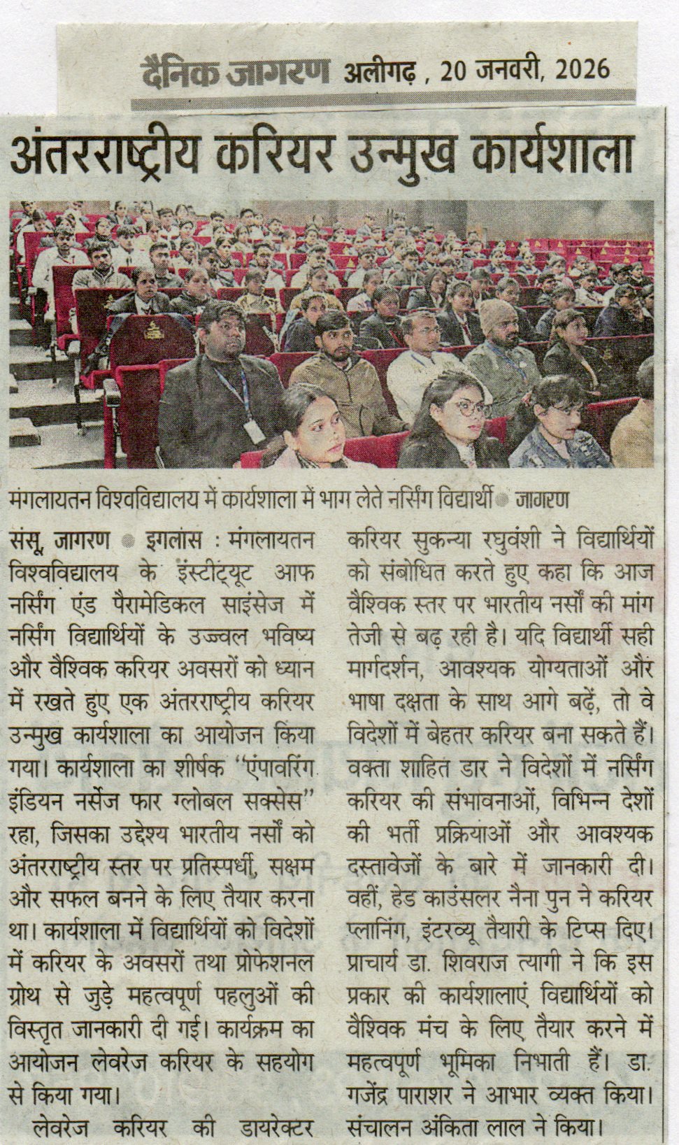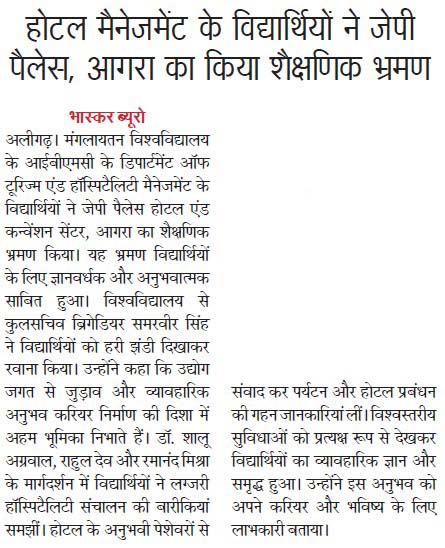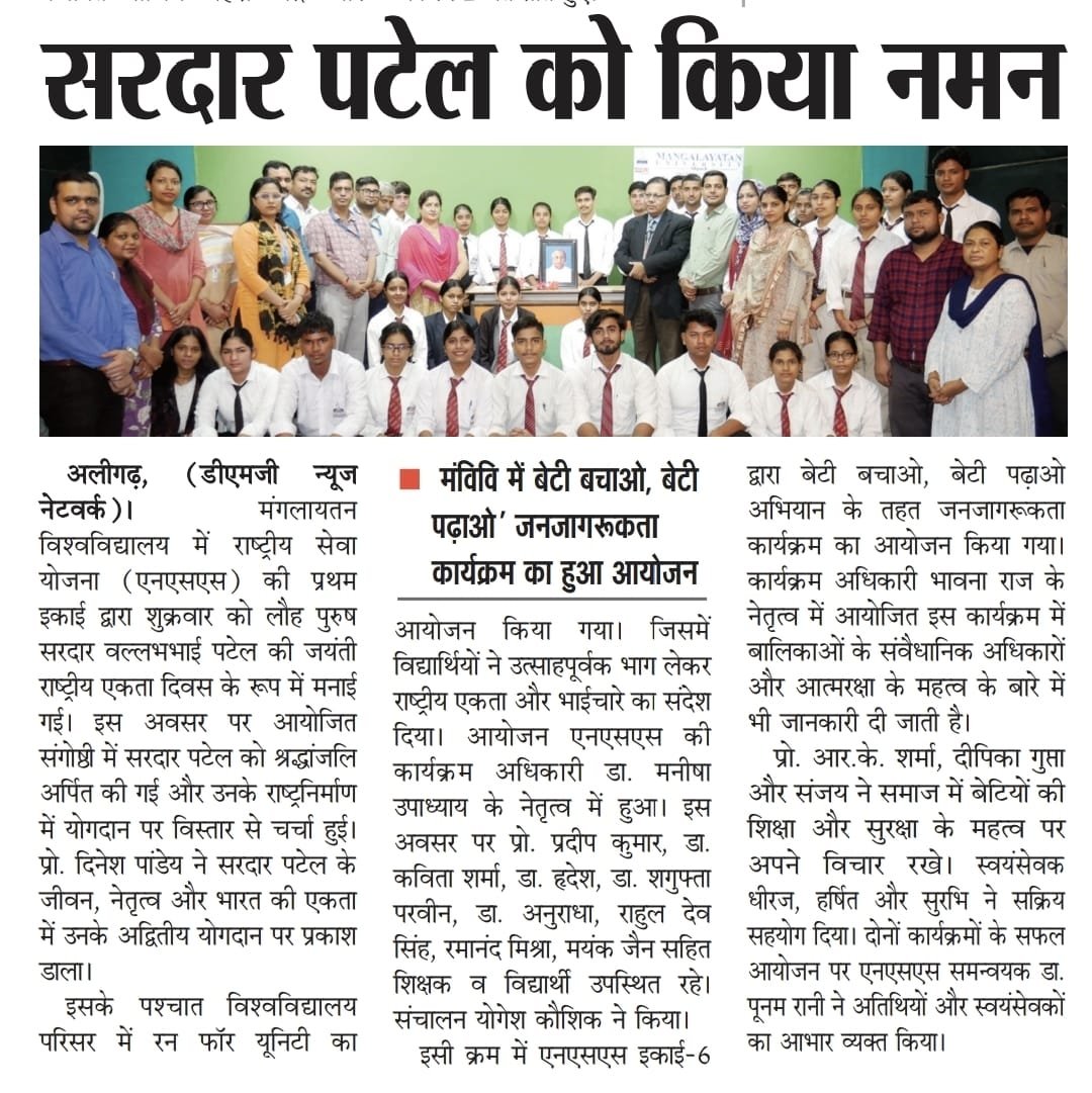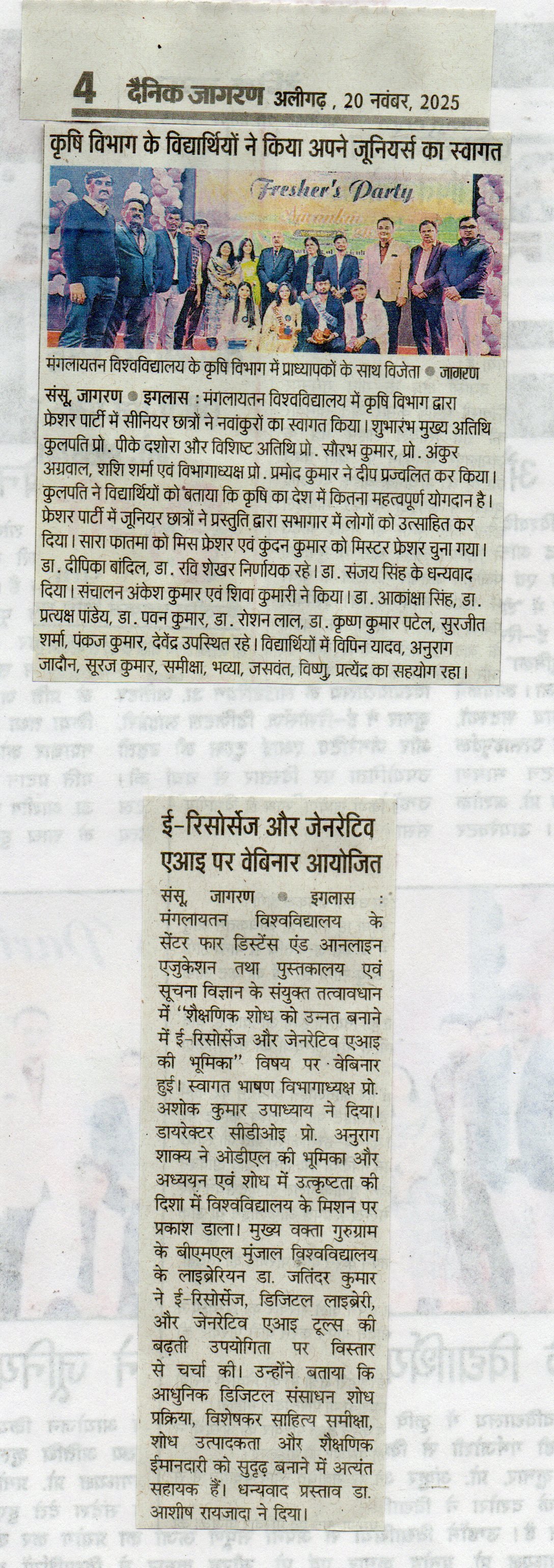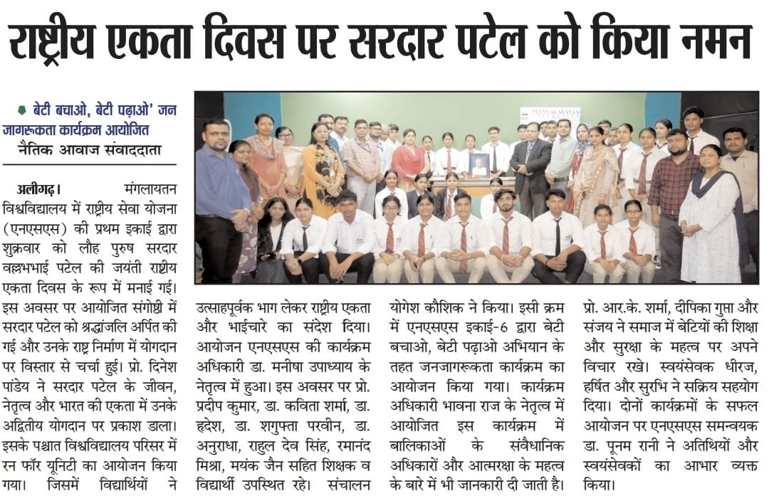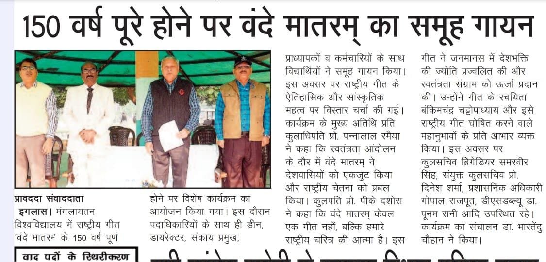 Mangalayatan University garnered significant attention in media with a feature highlighting departmental programs, community initiatives and activities. The article praised the university's commitment to academic excellence and its role in empowering academic units and their students through various skill development workshops and internships. Notably, the piece discussed the institution's efforts in promoting sustainable practices on campus, including eco-friendly initiatives that resonate with the university's mission to foster responsible citizens.This press clipping not only reflects the university's achievements but also its dedication to creating a vibrant learning environment, positioning Mangalayatan University as a cornerstone of educational development in the region. The coverage has sparked interest among prospective students and parents alike.