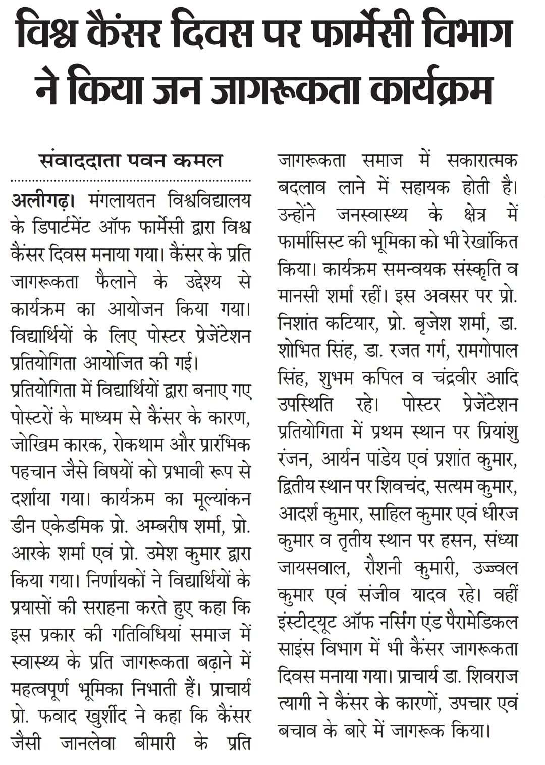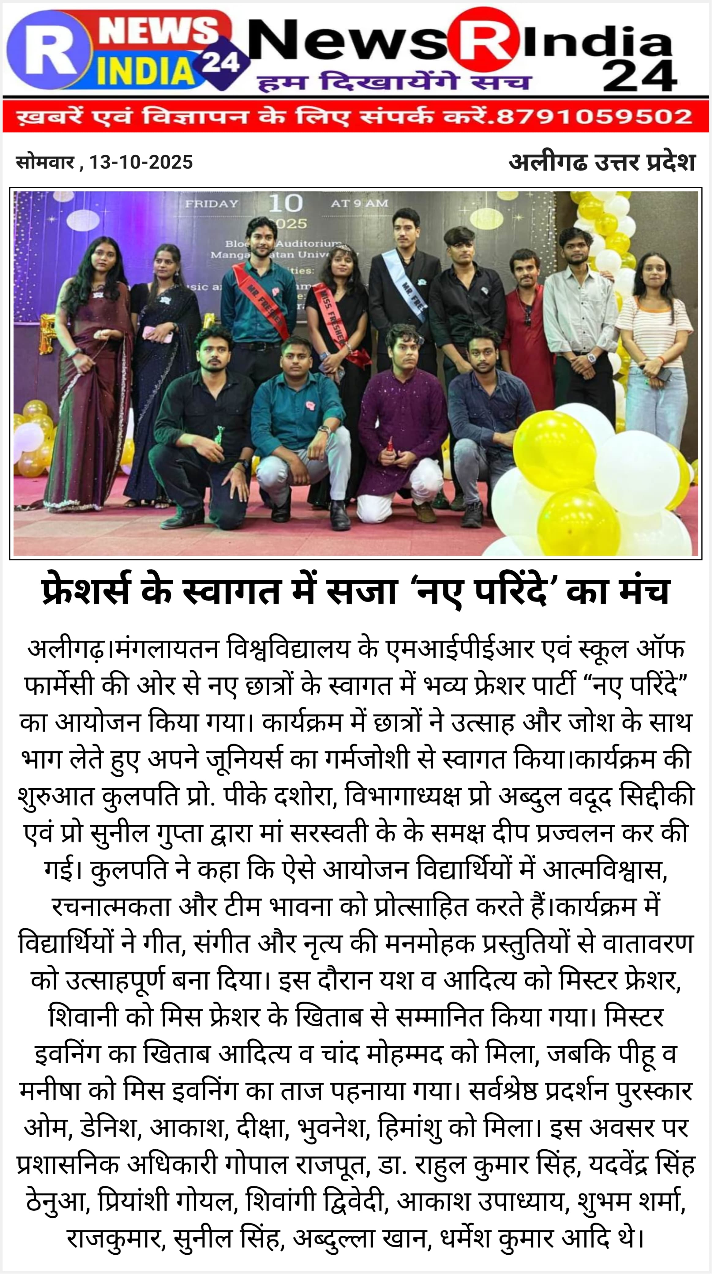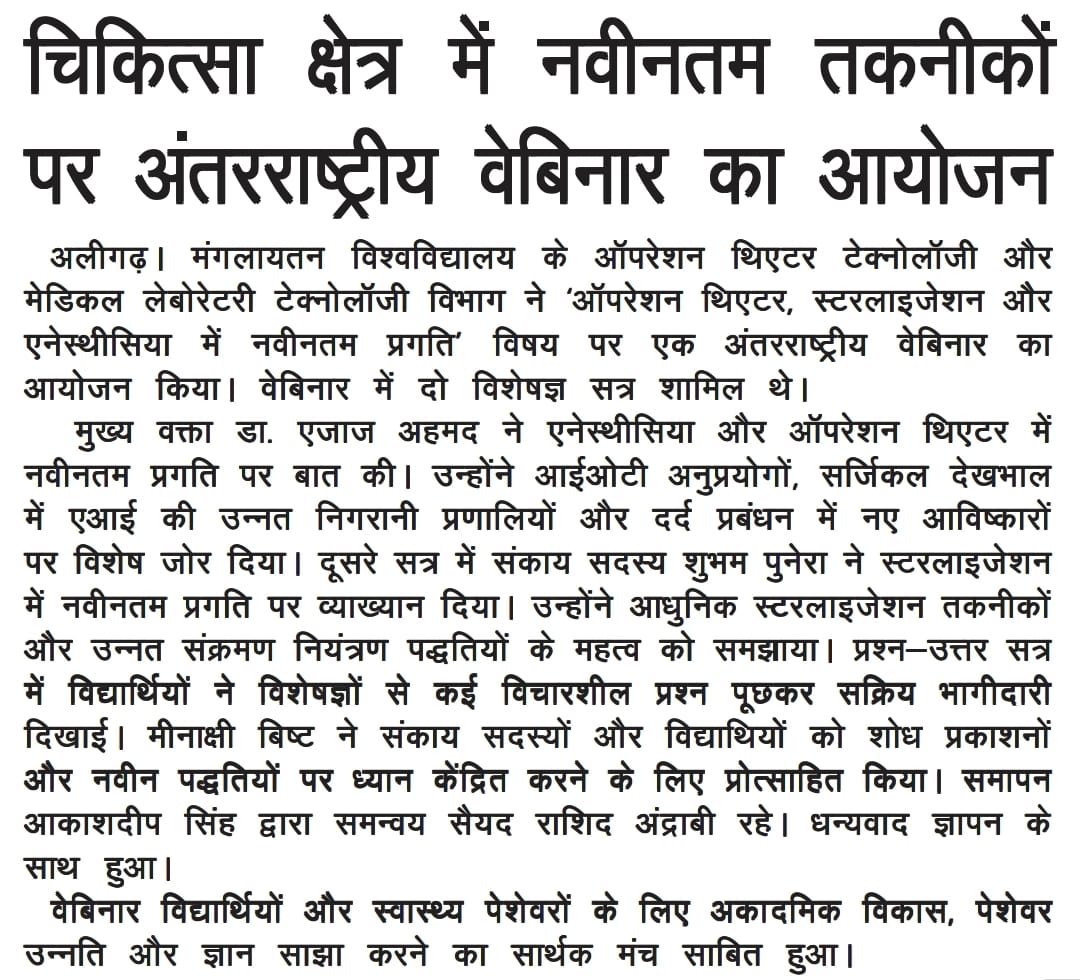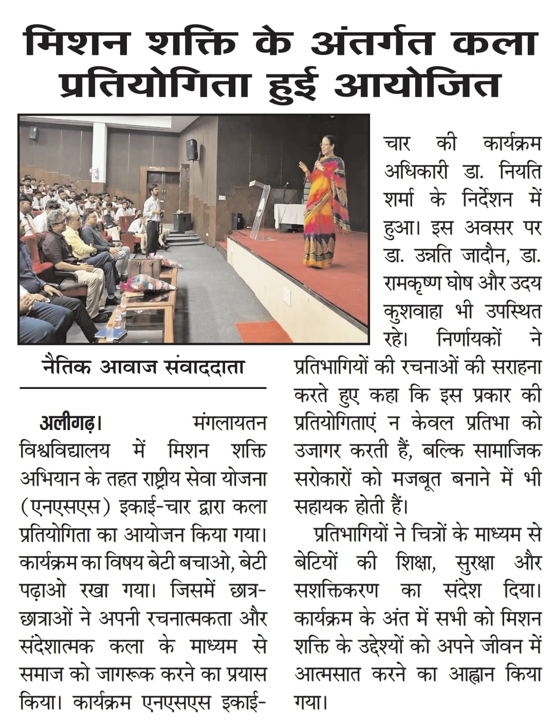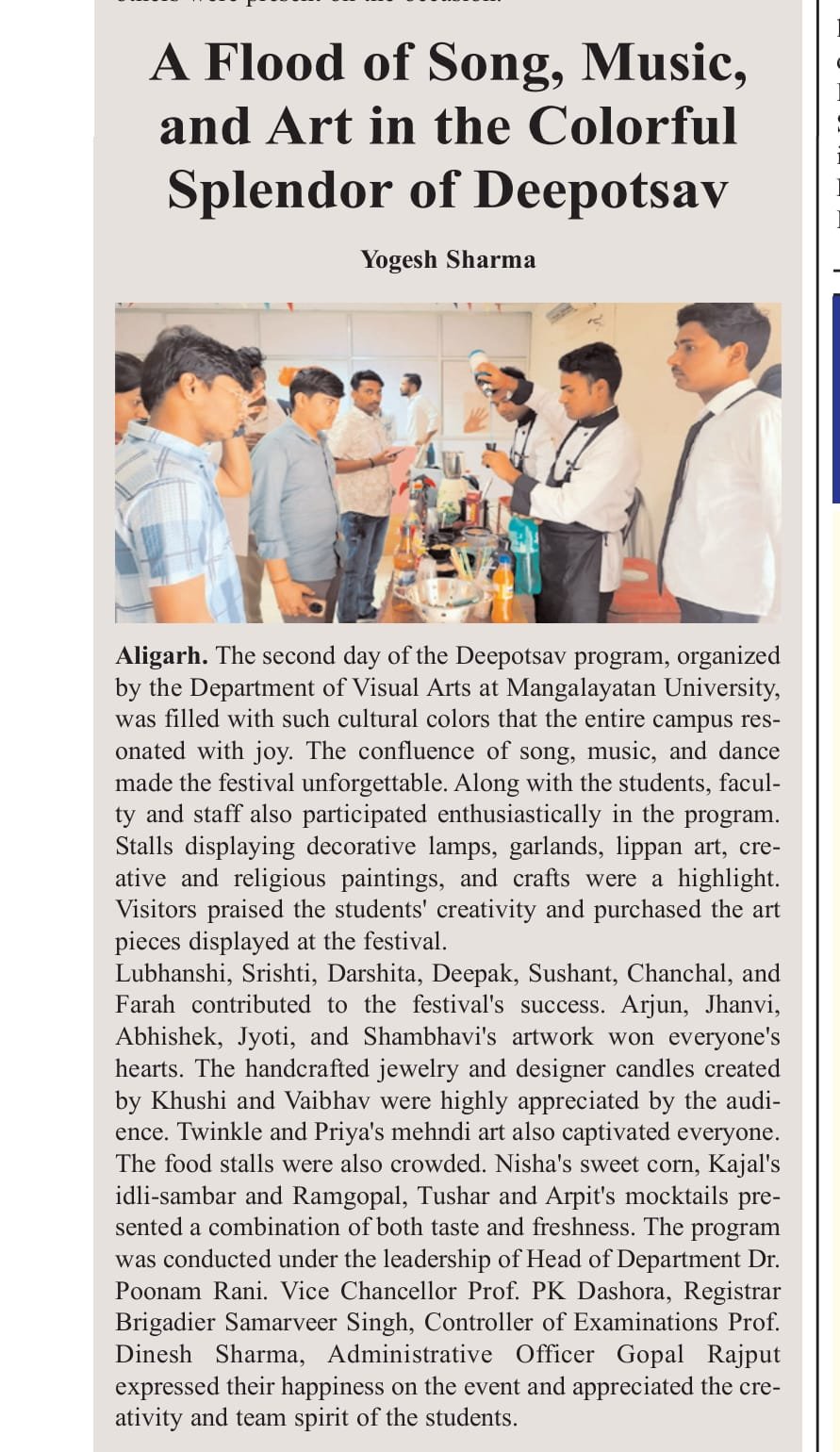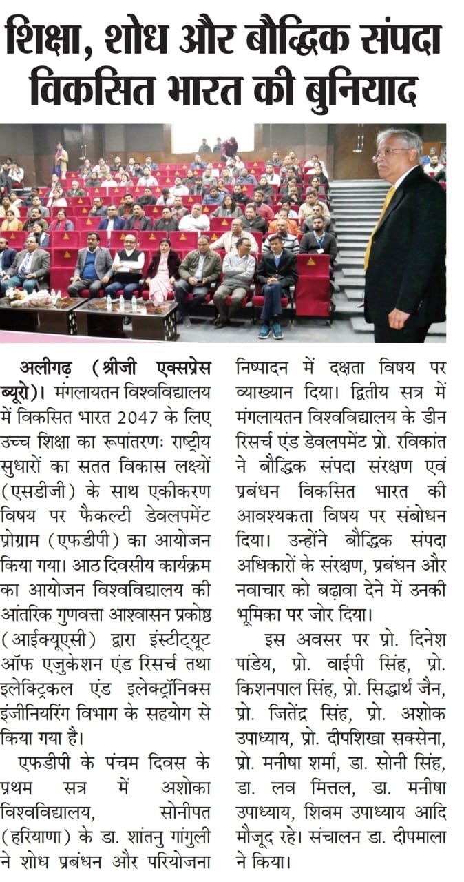 Mangalayatan University garnered significant attention in media with a feature highlighting departmental programs, community initiatives and activities. The article praised the university's commitment to academic excellence and its role in empowering academic units and their students through various skill development workshops and internships. Notably, the piece discussed the institution's efforts in promoting sustainable practices on campus, including eco-friendly initiatives that resonate with the university's mission to foster responsible citizens.This press clipping not only reflects the university's achievements but also its dedication to creating a vibrant learning environment, positioning Mangalayatan University as a cornerstone of educational development in the region. The coverage has sparked interest among prospective students and parents alike.