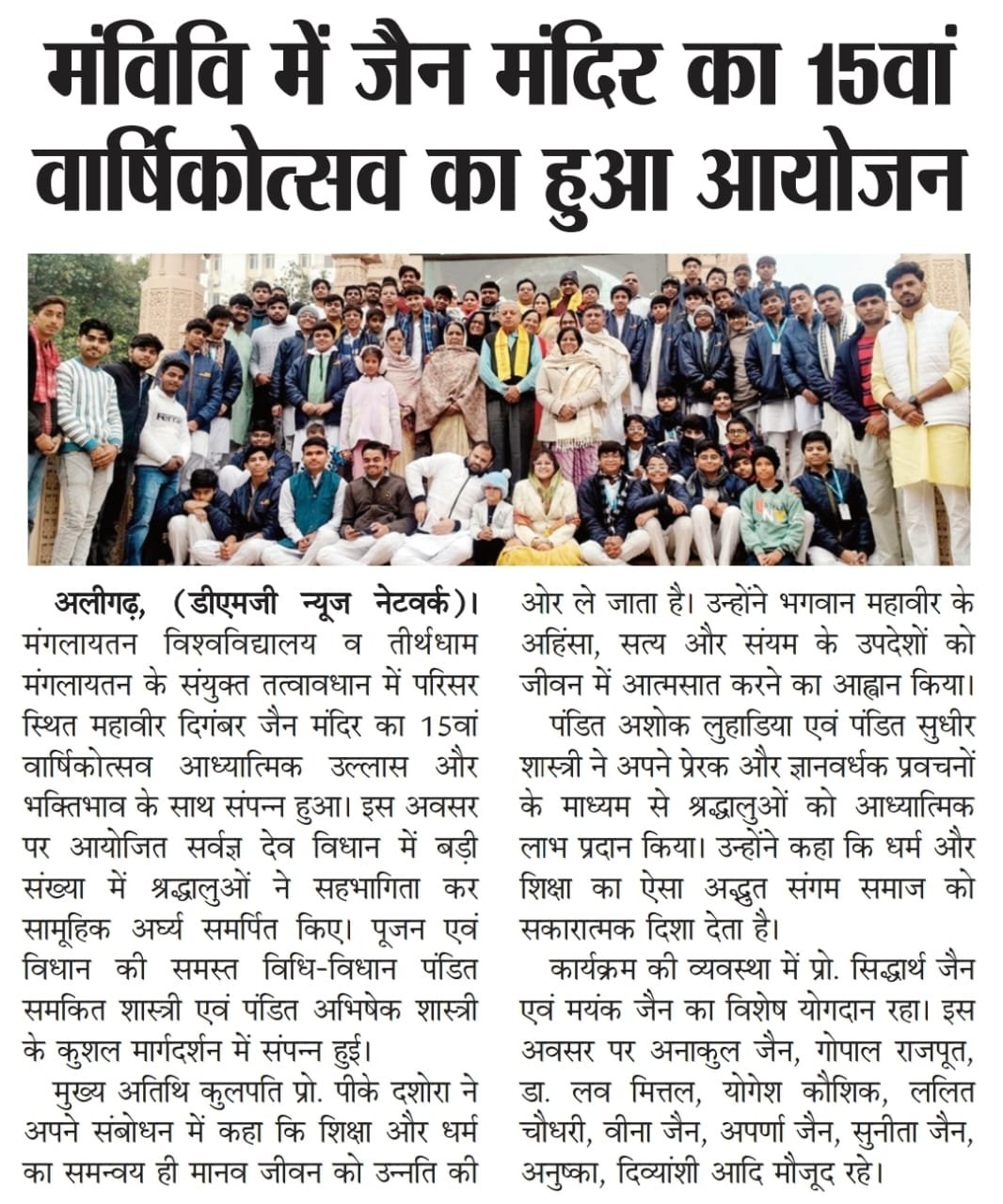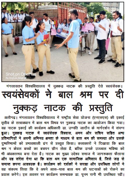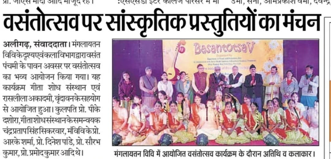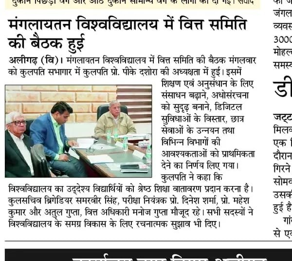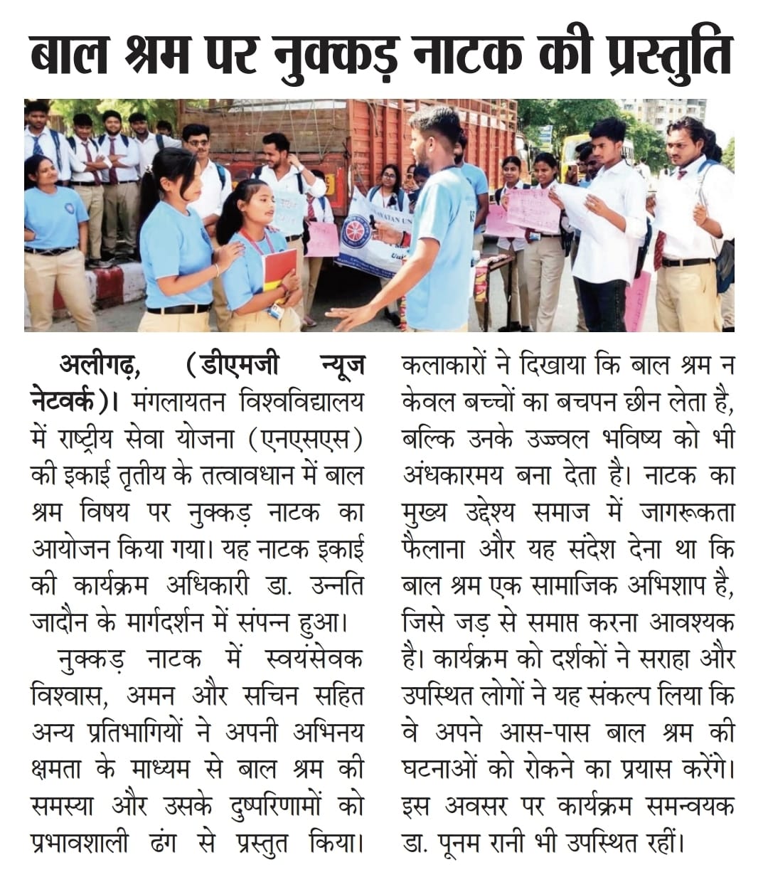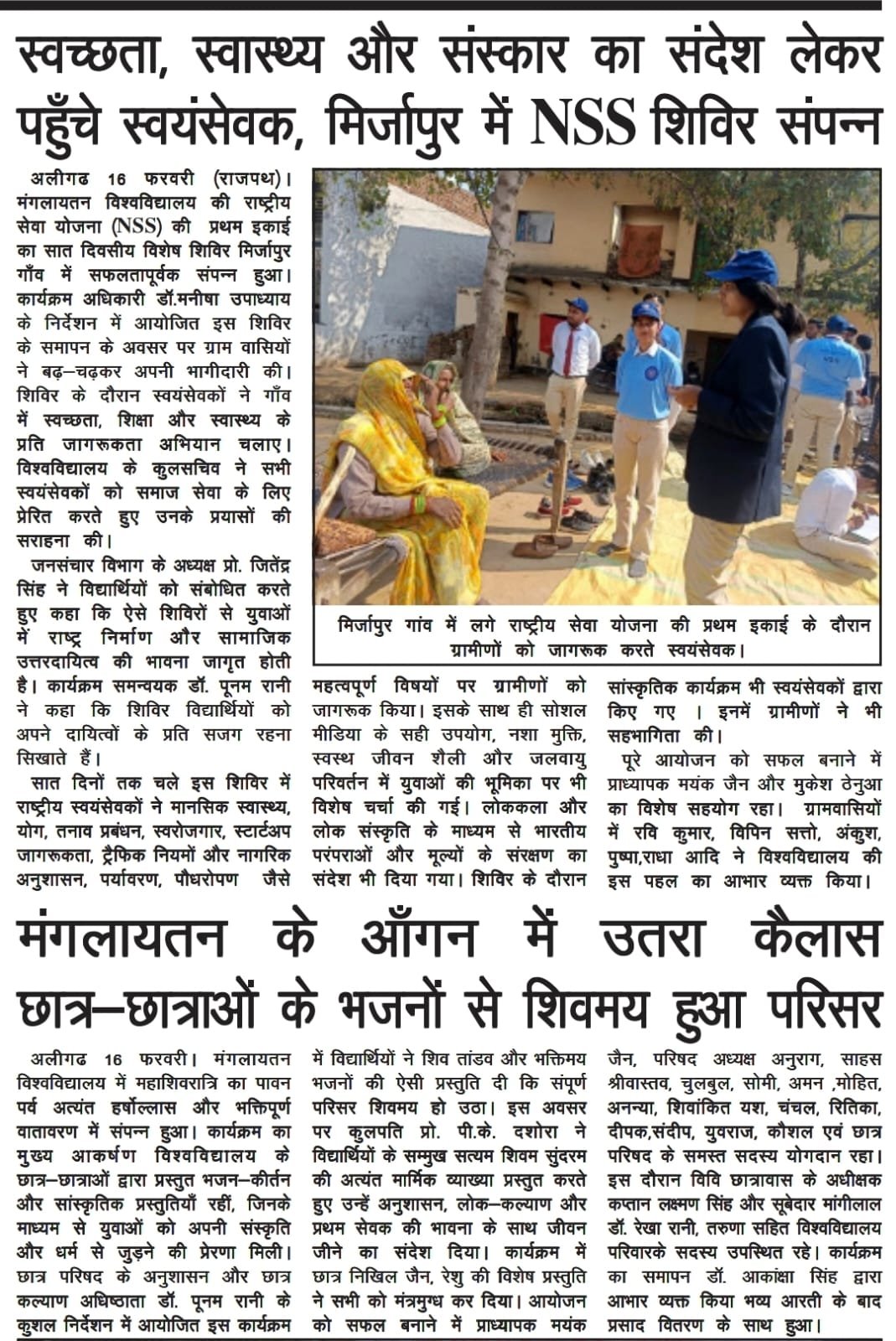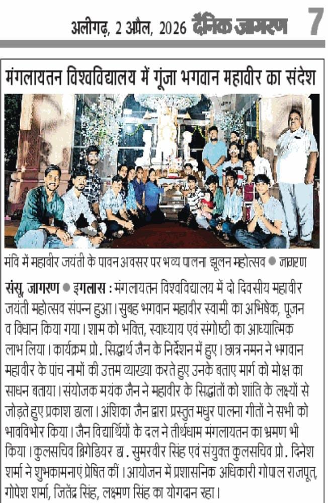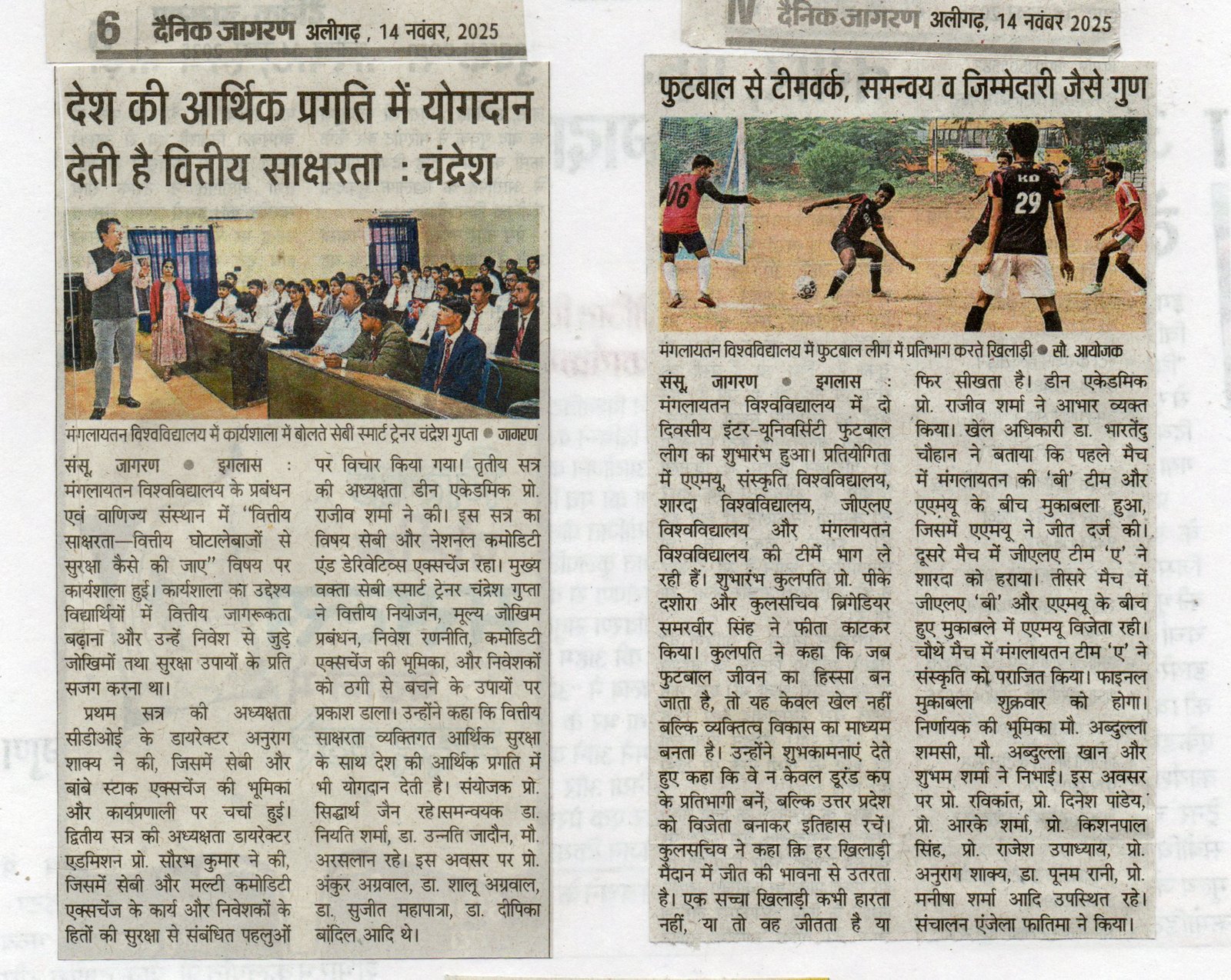Mangalayatan University garnered significant attention in media with a feature highlighting departmental programs, community initiatives and activities. The article praised the university's commitment to academic excellence and its role in empowering academic units and their students through various skill development workshops and internships. Notably, the piece discussed the institution's efforts in promoting sustainable practices on campus, including eco-friendly initiatives that resonate with the university's mission to foster responsible citizens.This press clipping not only reflects the university's achievements but also its dedication to creating a vibrant learning environment, positioning Mangalayatan University as a cornerstone of educational development in the region. The coverage has sparked interest among prospective students and parents alike.