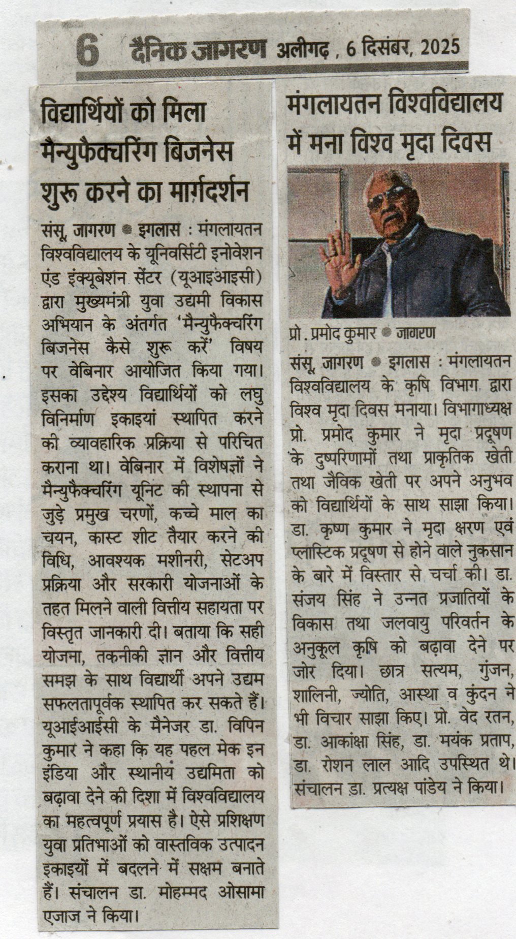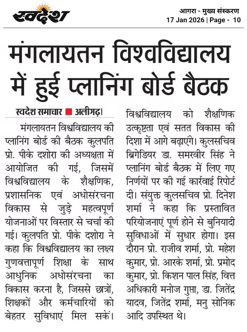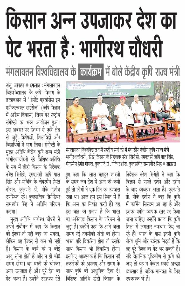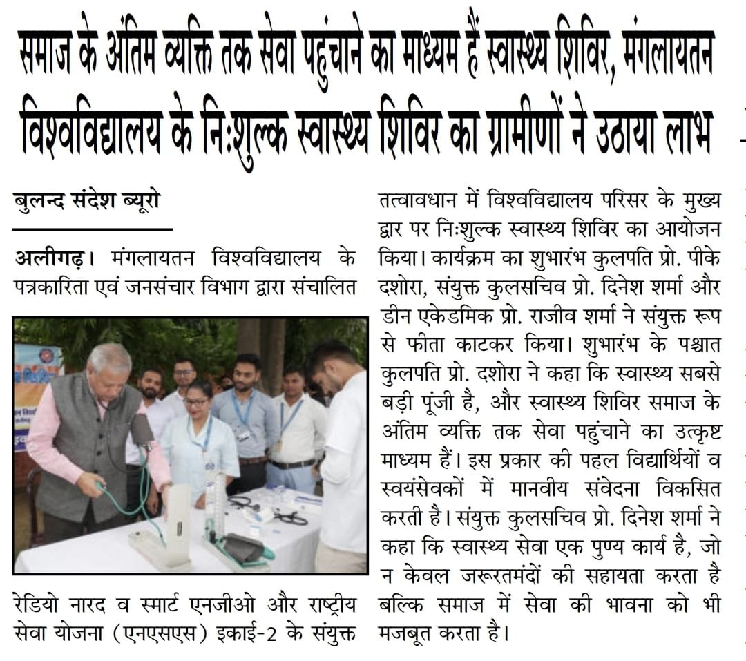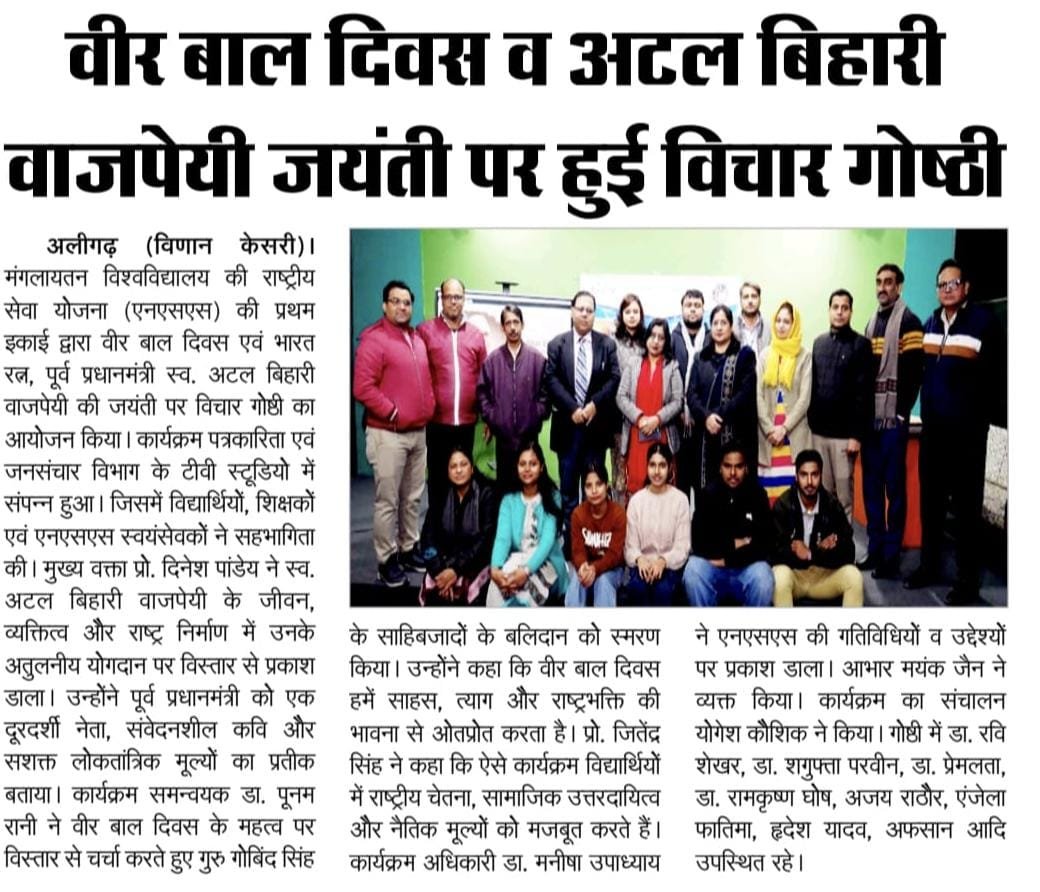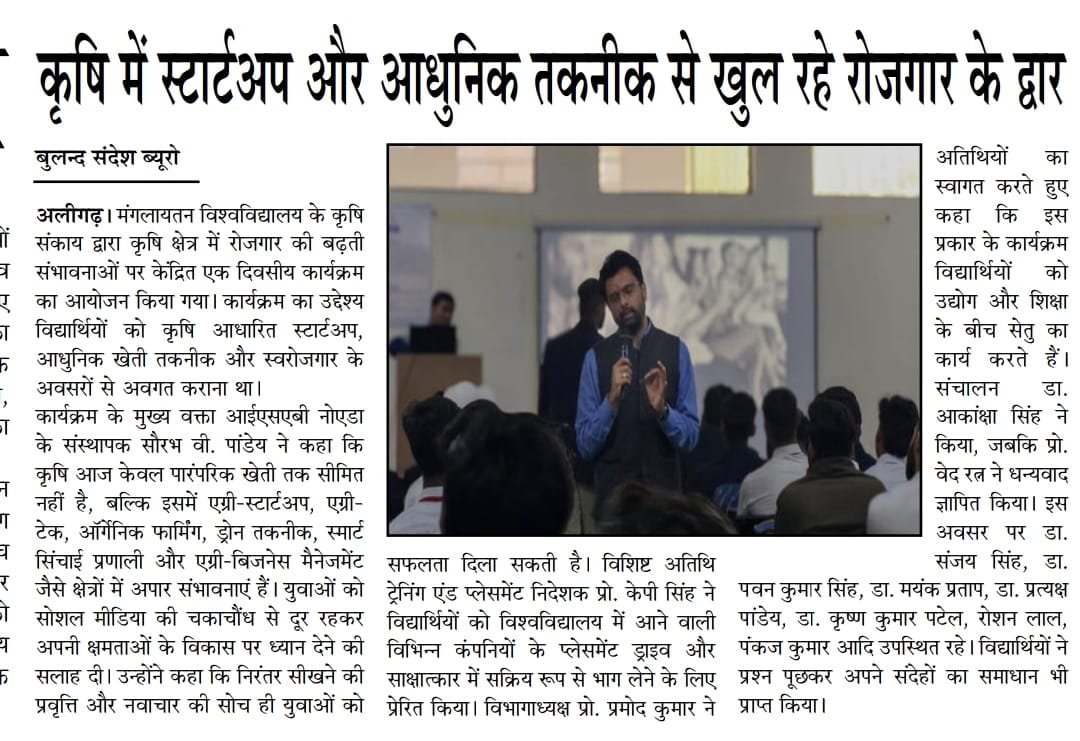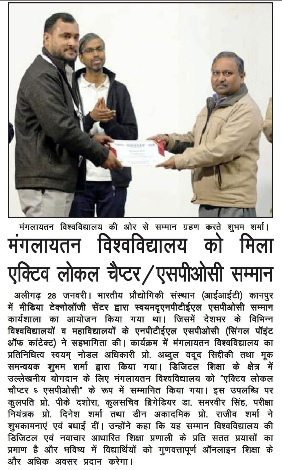 Mangalayatan University garnered significant attention in media with a feature highlighting departmental programs, community initiatives and activities. The article praised the university's commitment to academic excellence and its role in empowering academic units and their students through various skill development workshops and internships. Notably, the piece discussed the institution's efforts in promoting sustainable practices on campus, including eco-friendly initiatives that resonate with the university's mission to foster responsible citizens.This press clipping not only reflects the university's achievements but also its dedication to creating a vibrant learning environment, positioning Mangalayatan University as a cornerstone of educational development in the region. The coverage has sparked interest among prospective students and parents alike.