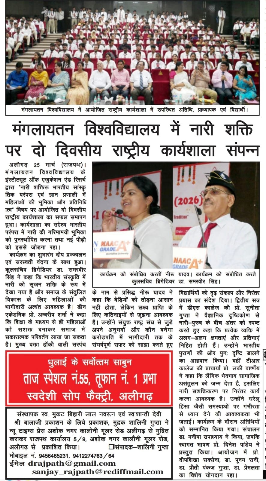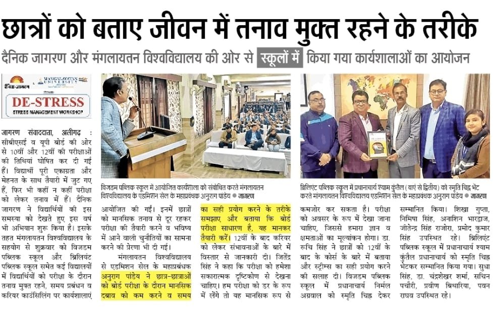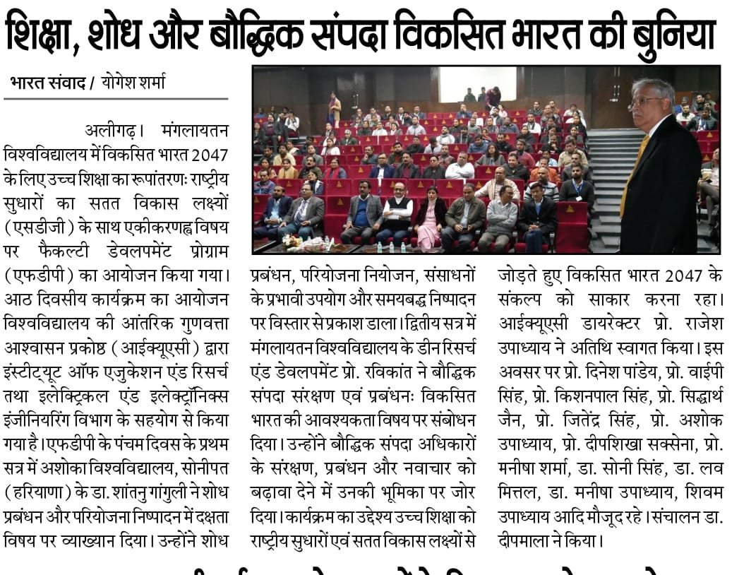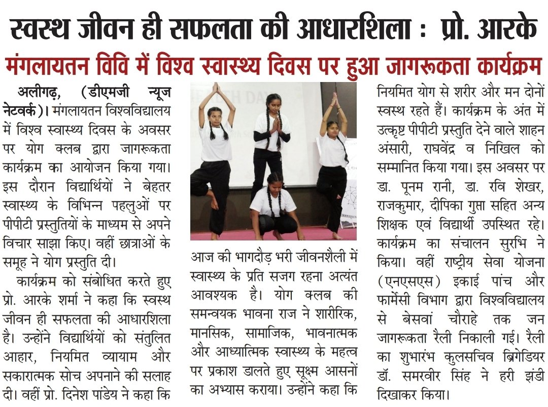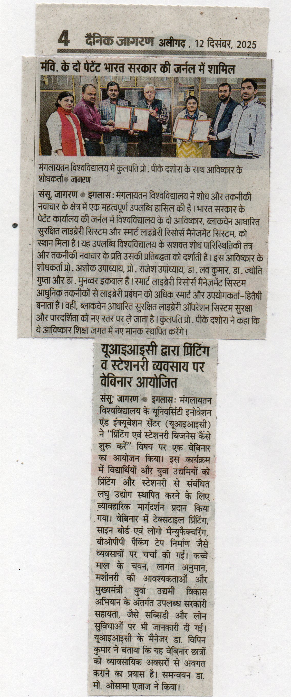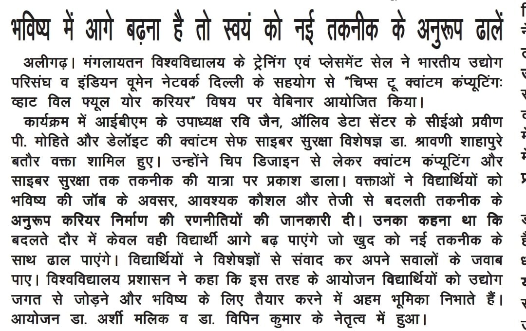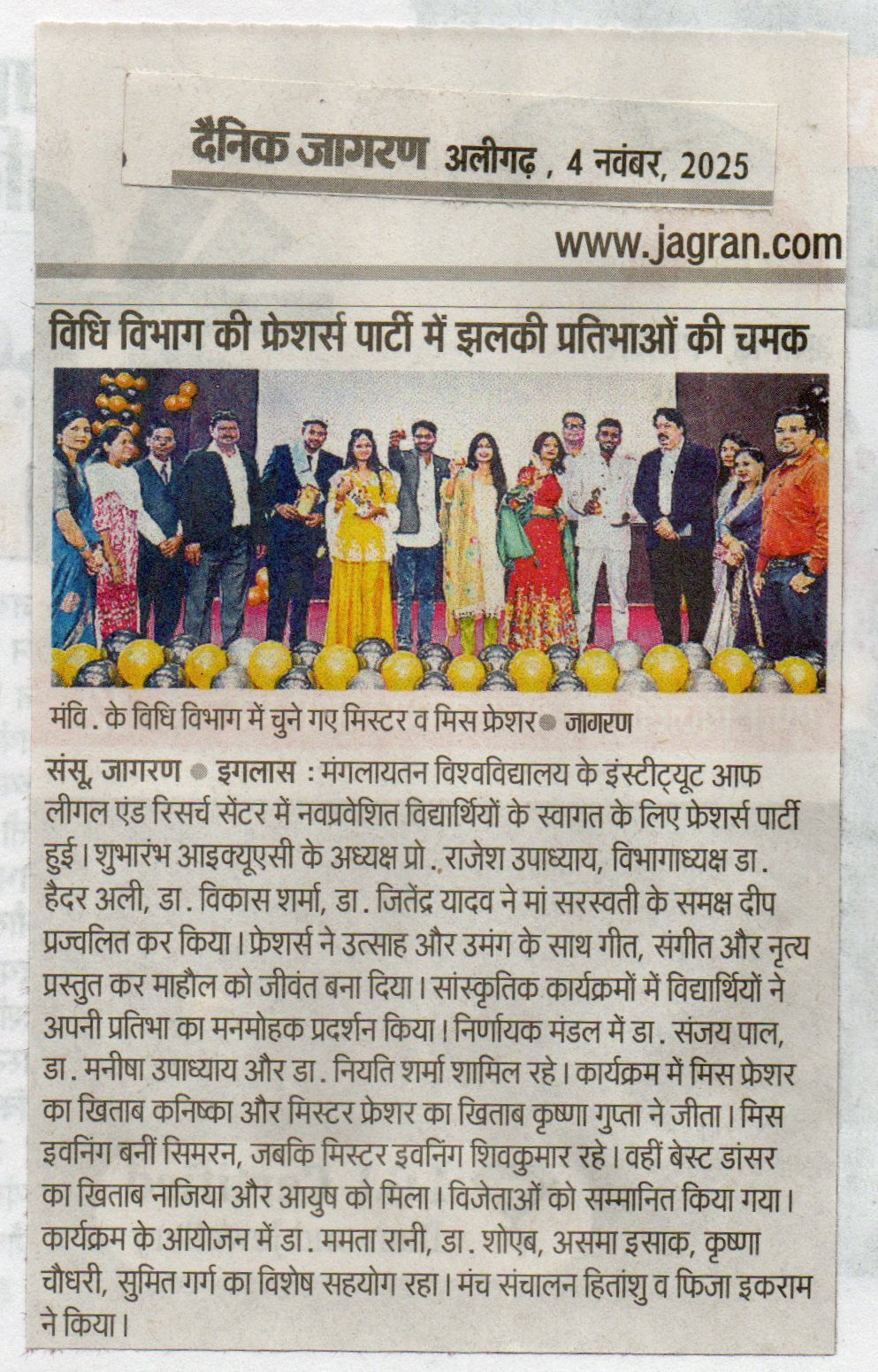 Mangalayatan University garnered significant attention in media with a feature highlighting departmental programs, community initiatives and activities. The article praised the university's commitment to academic excellence and its role in empowering academic units and their students through various skill development workshops and internships. Notably, the piece discussed the institution's efforts in promoting sustainable practices on campus, including eco-friendly initiatives that resonate with the university's mission to foster responsible citizens.This press clipping not only reflects the university's achievements but also its dedication to creating a vibrant learning environment, positioning Mangalayatan University as a cornerstone of educational development in the region. The coverage has sparked interest among prospective students and parents alike.